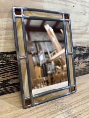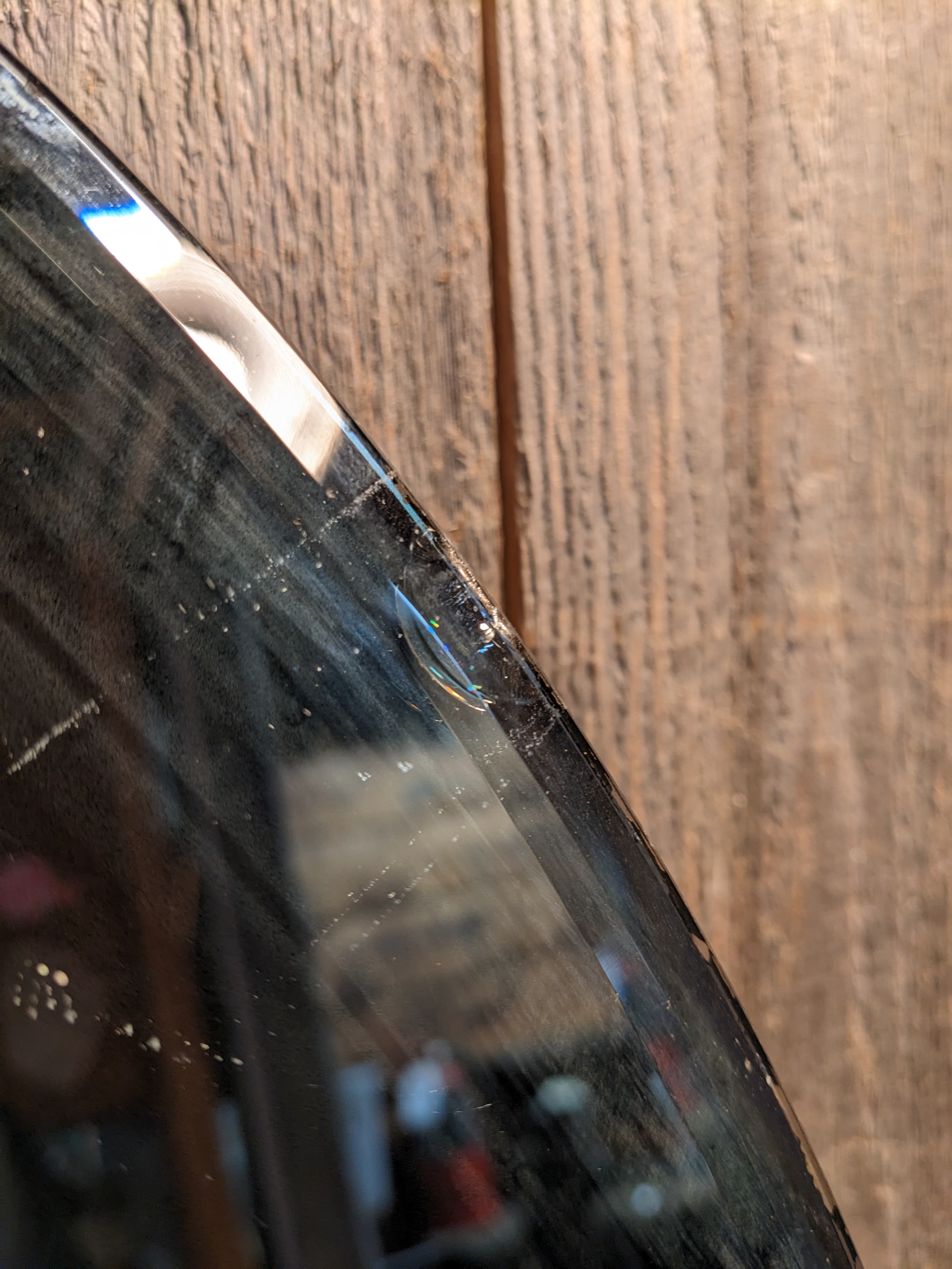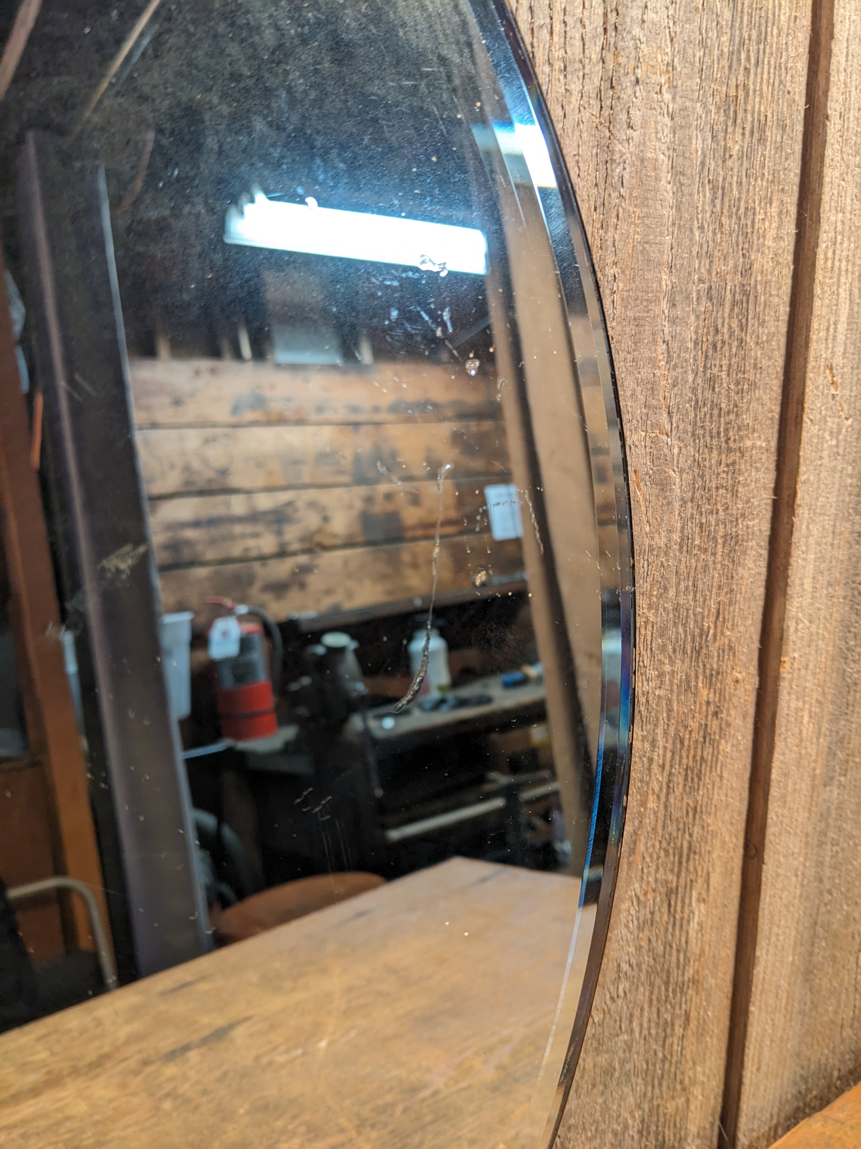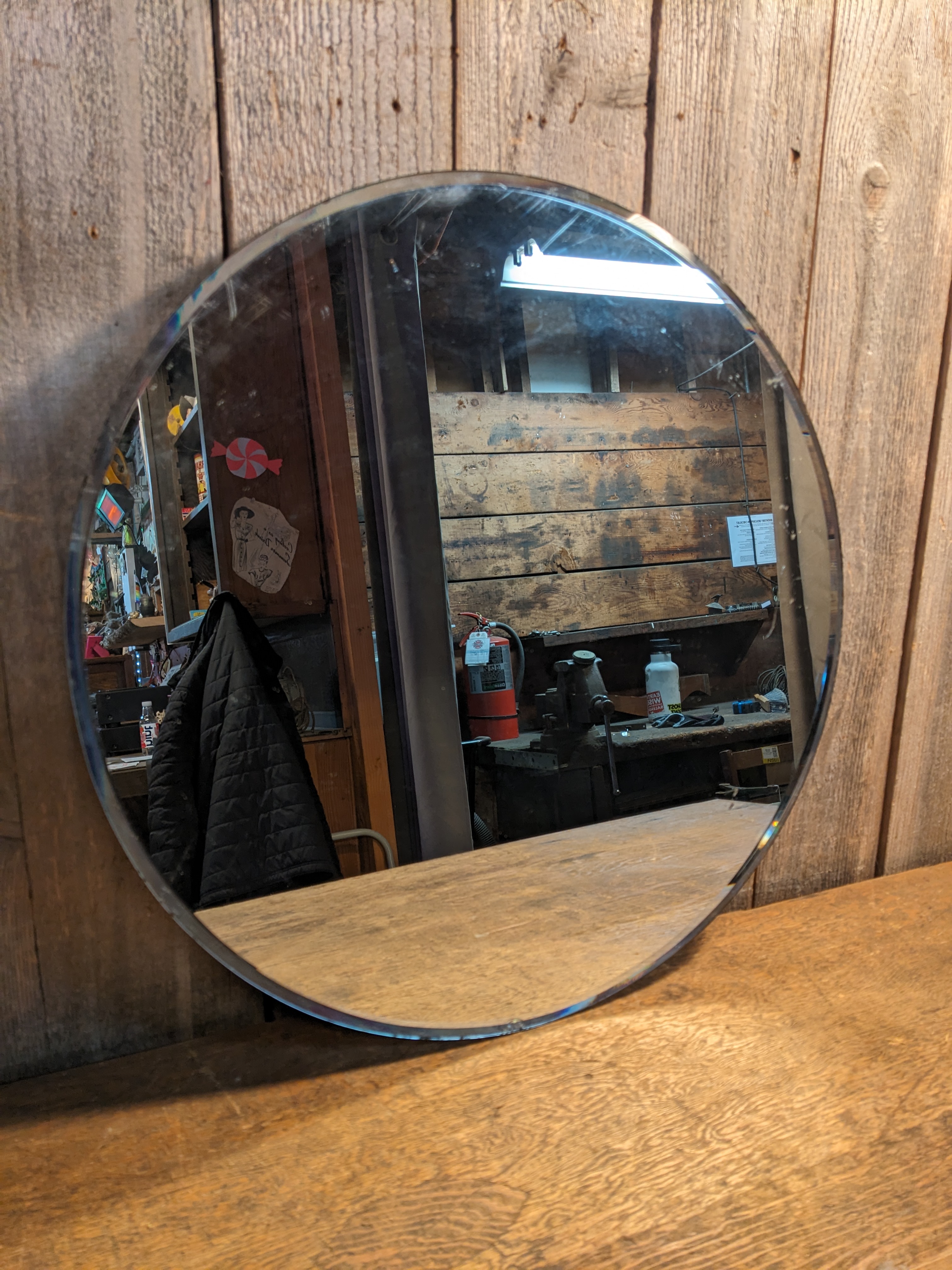 A round mirror with beveled edges. It's in good condition with some scratches and a small chip. It measures 19.75 inches across.