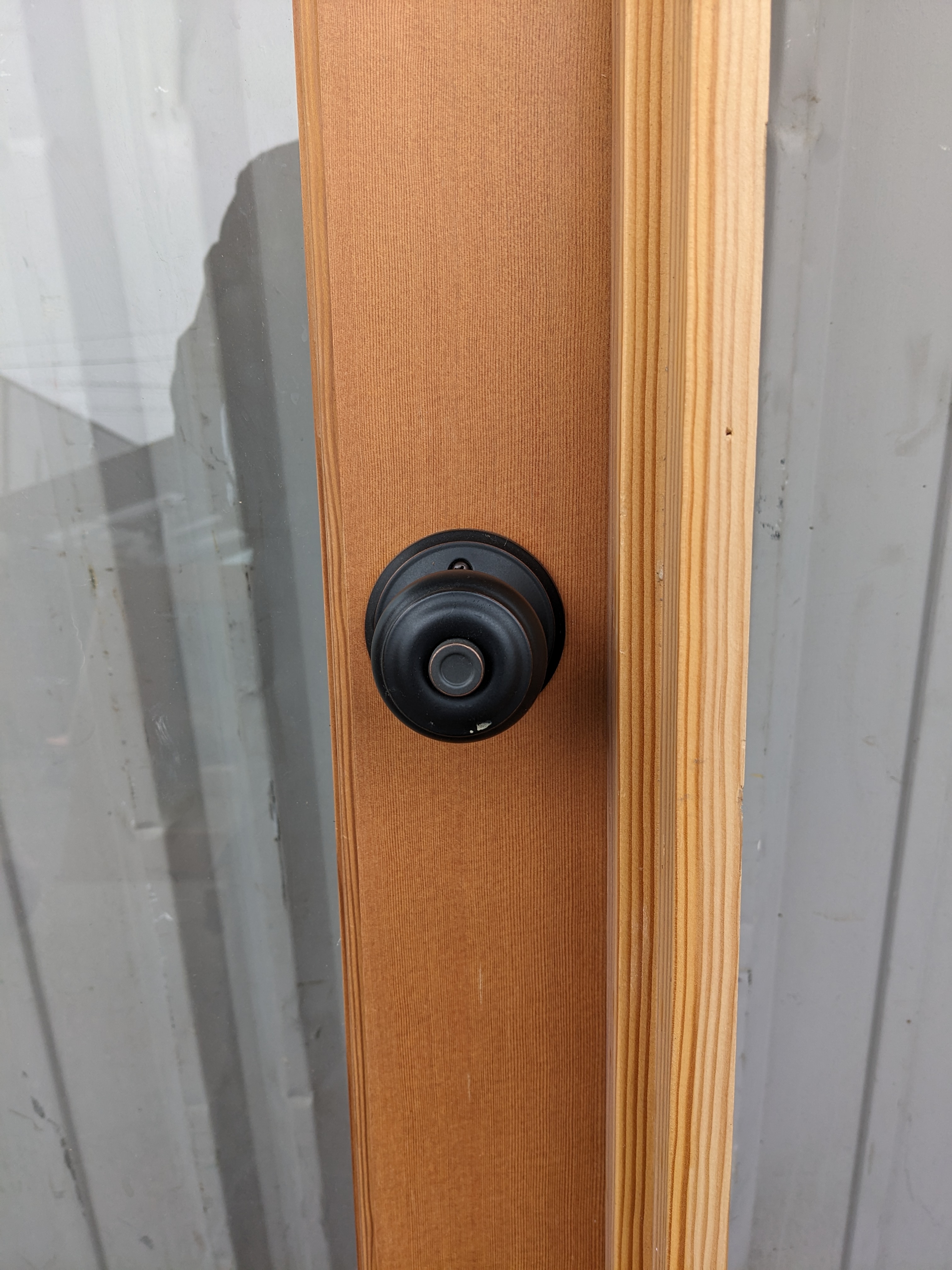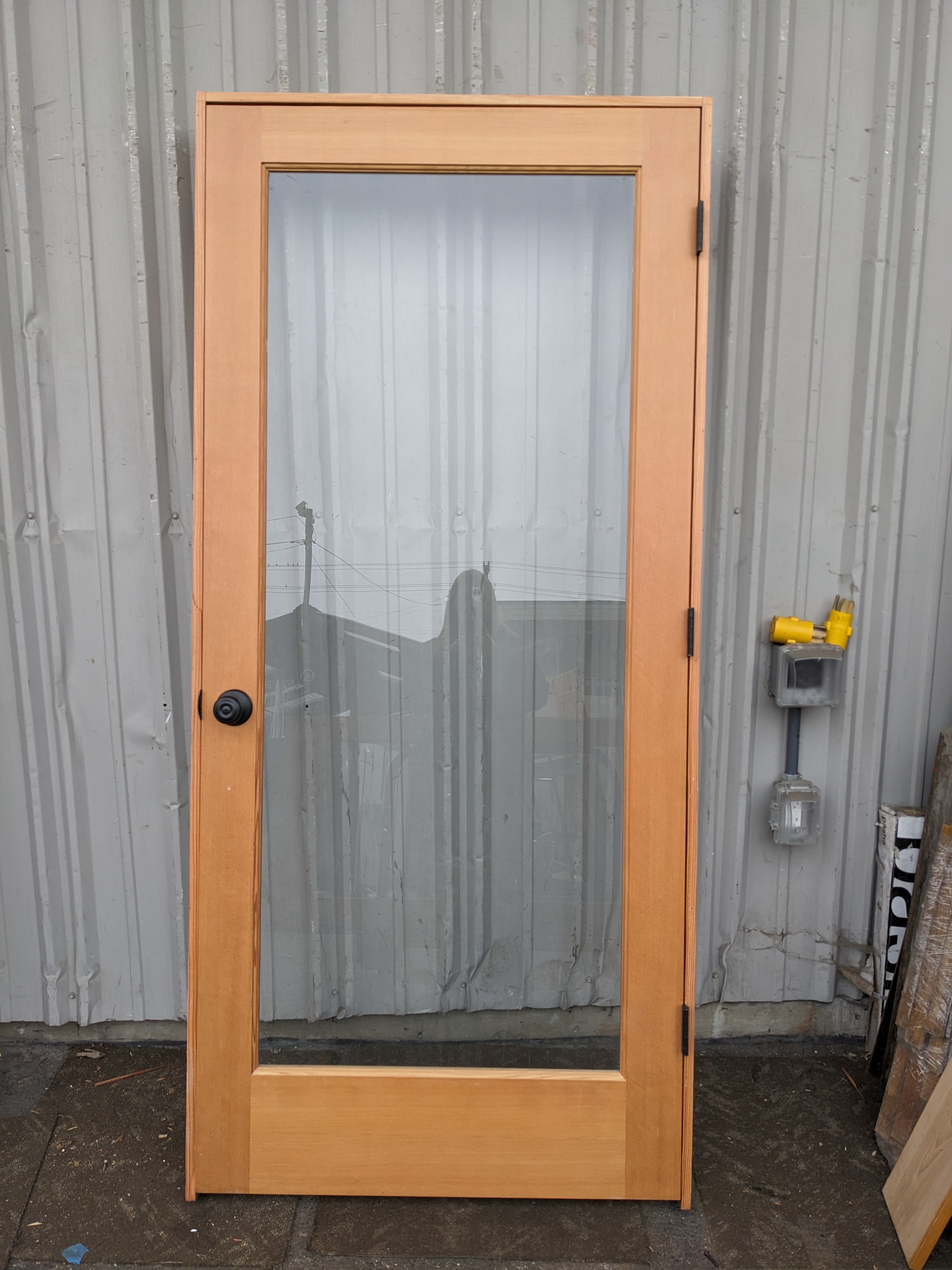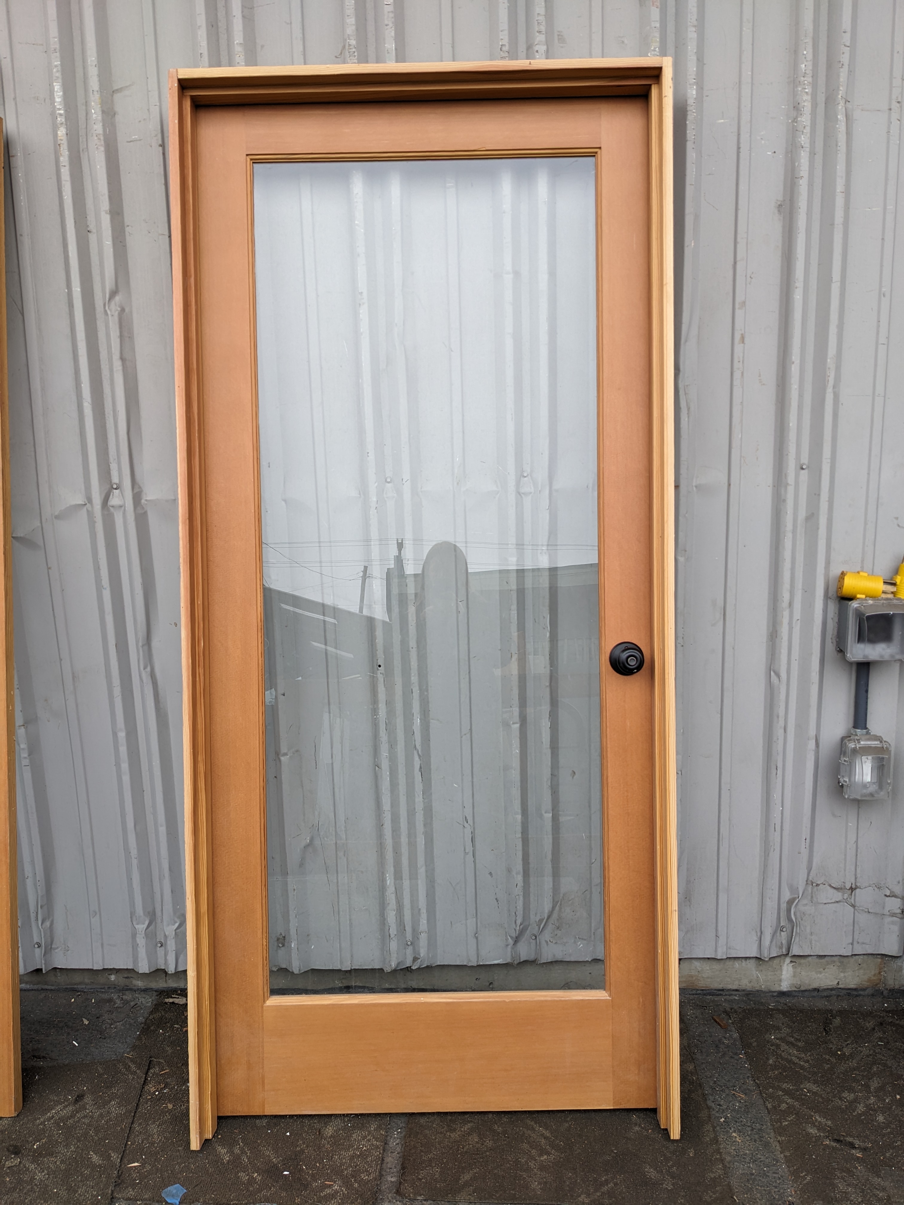 Beautiful full light door in jamb with great CVG exposure. Wood is solid, stylish, and sealed with a clear varnish. Matte black hardware in great condition. Left open.