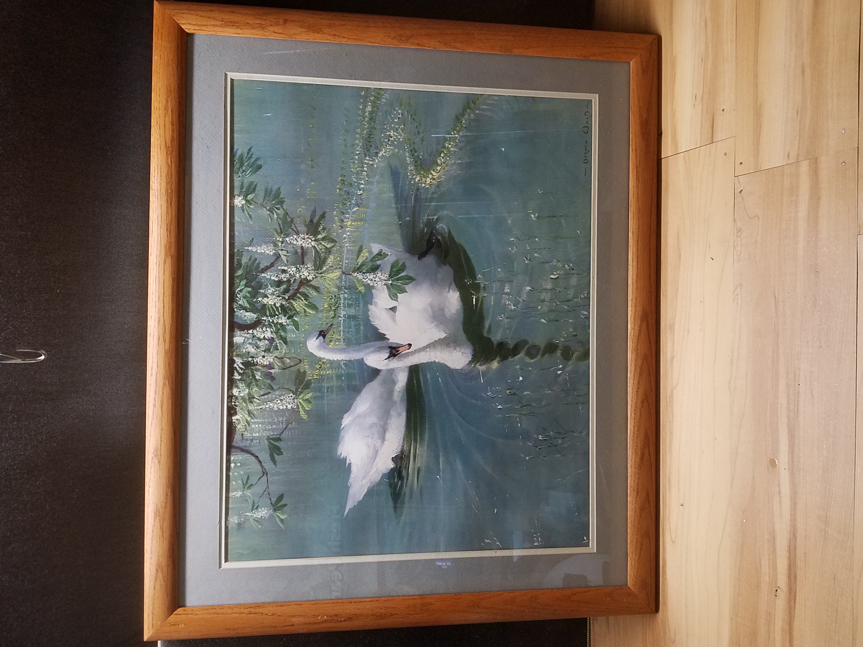 A classic print from this important British artist shows a pair of majestic swans calmly swimming through glassy water.