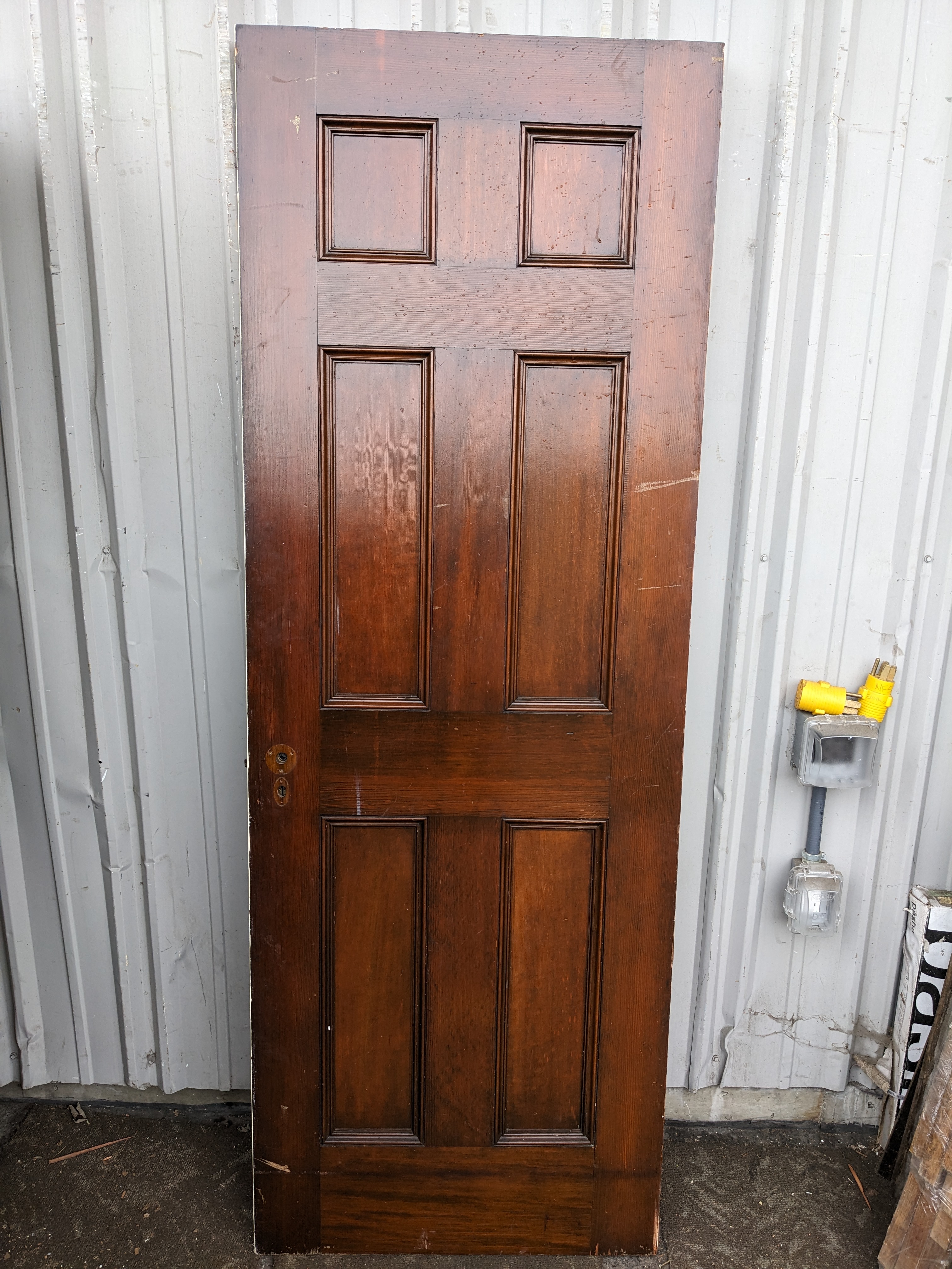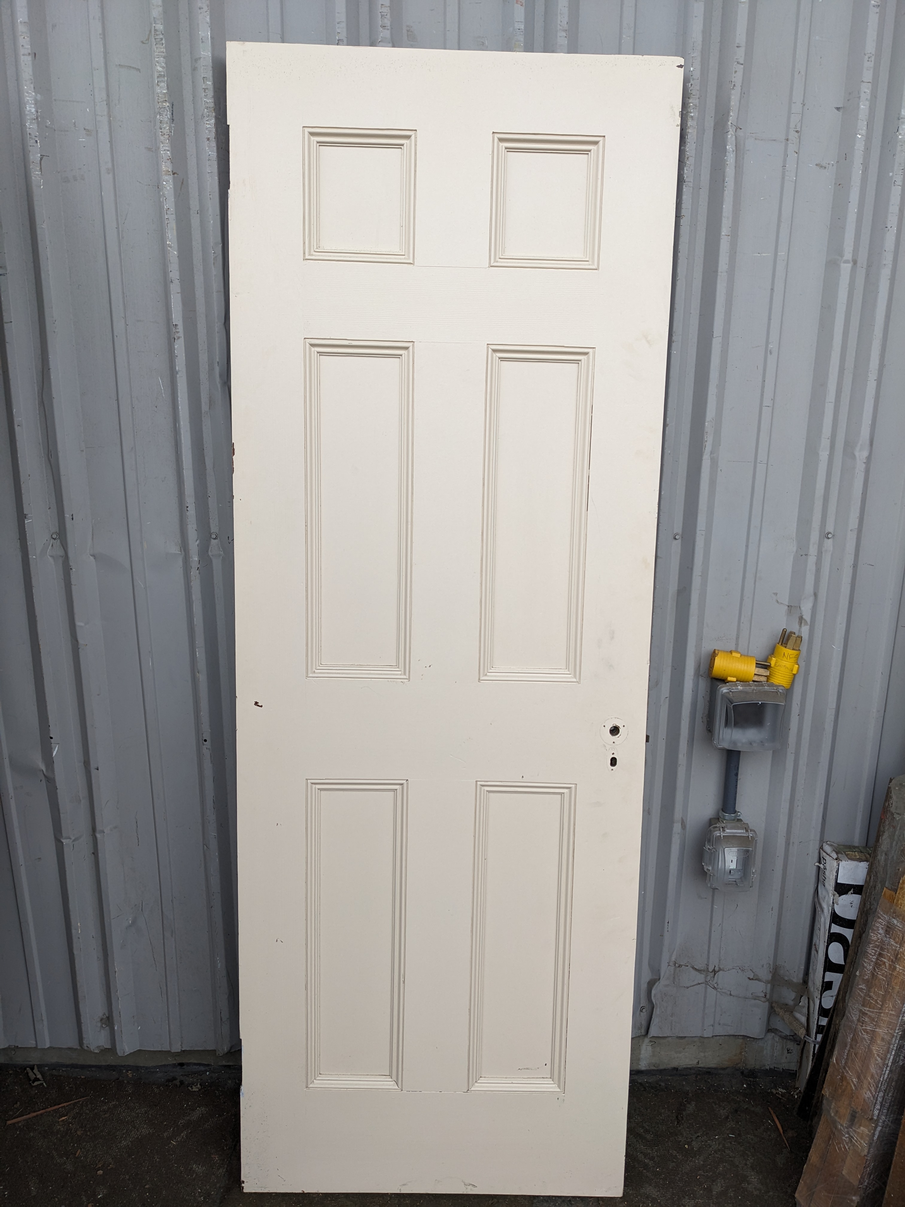 This 6 panel interior right swing door is in great shape! Painted white on one side and left its original wood color on the other (coated with a clear varnish). A few scratches and some checking is present but overall is in decent shape. Right swing.