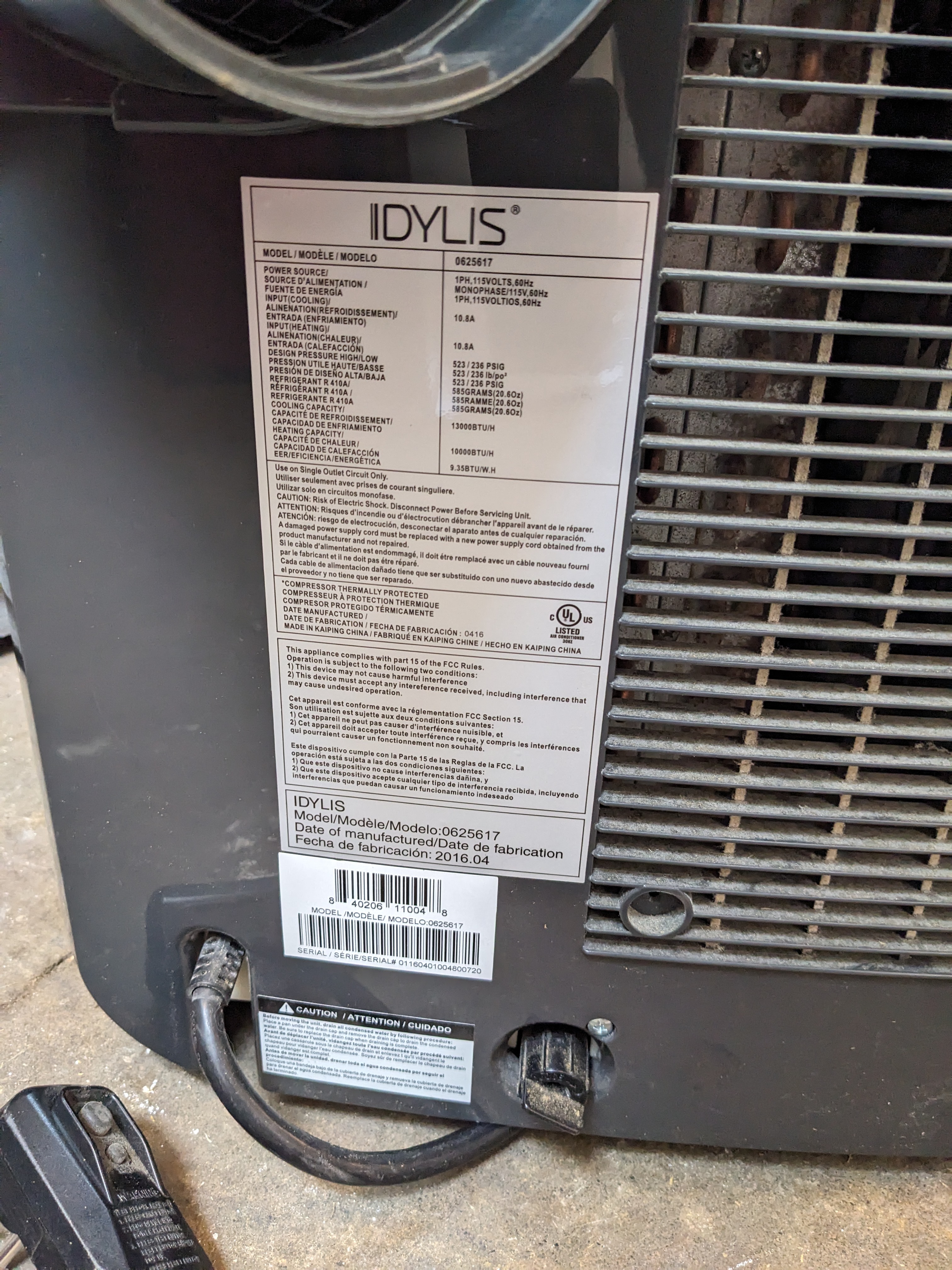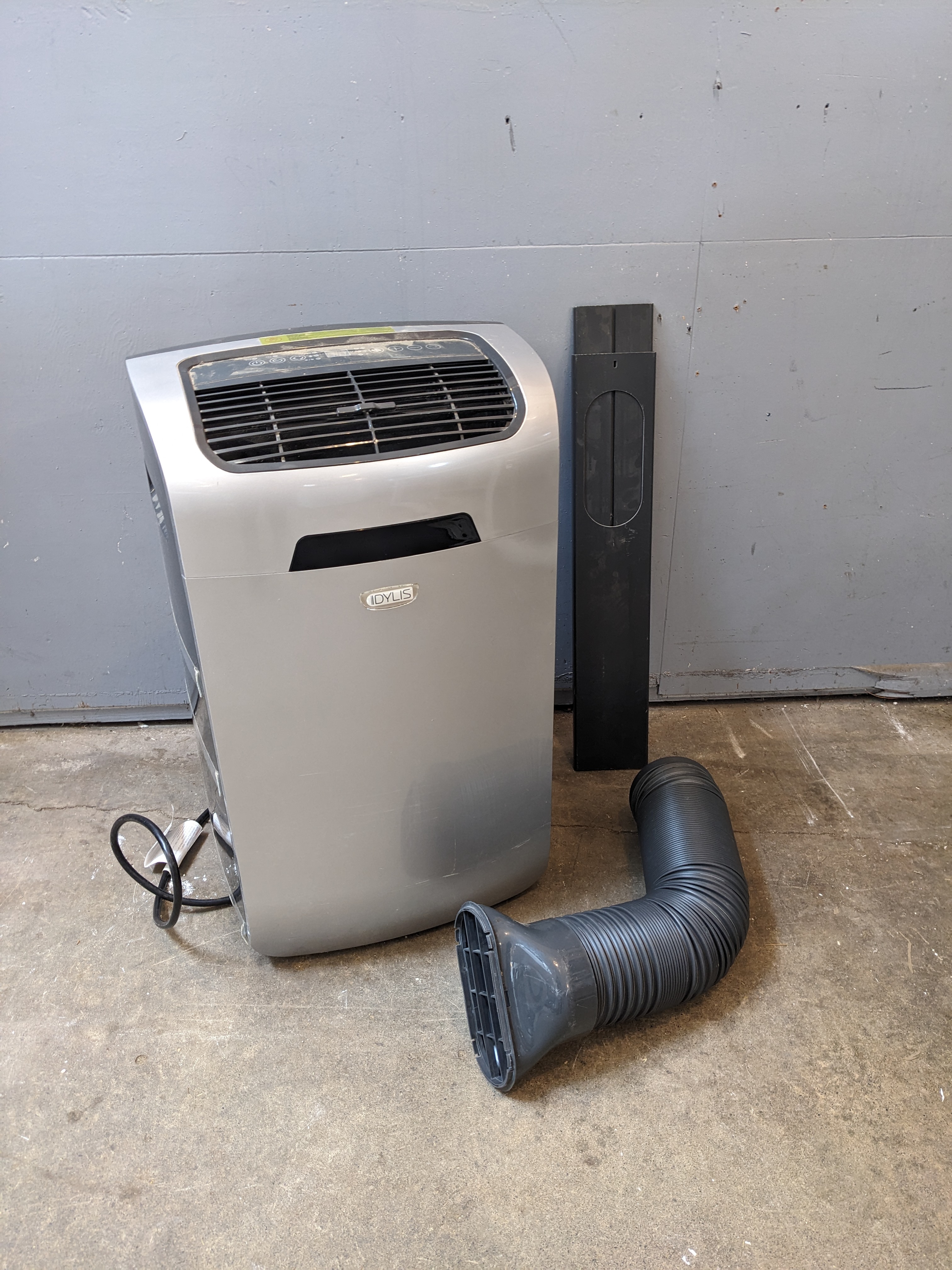 We have an Idylis model 0625617 portable air conditioner from 2016. This portable air conditioner is 13000 BTU and complete with remote, hose (no cracks), and hose window assembly. This cooling beast is in good used condition and will need to have the filter cleaned.