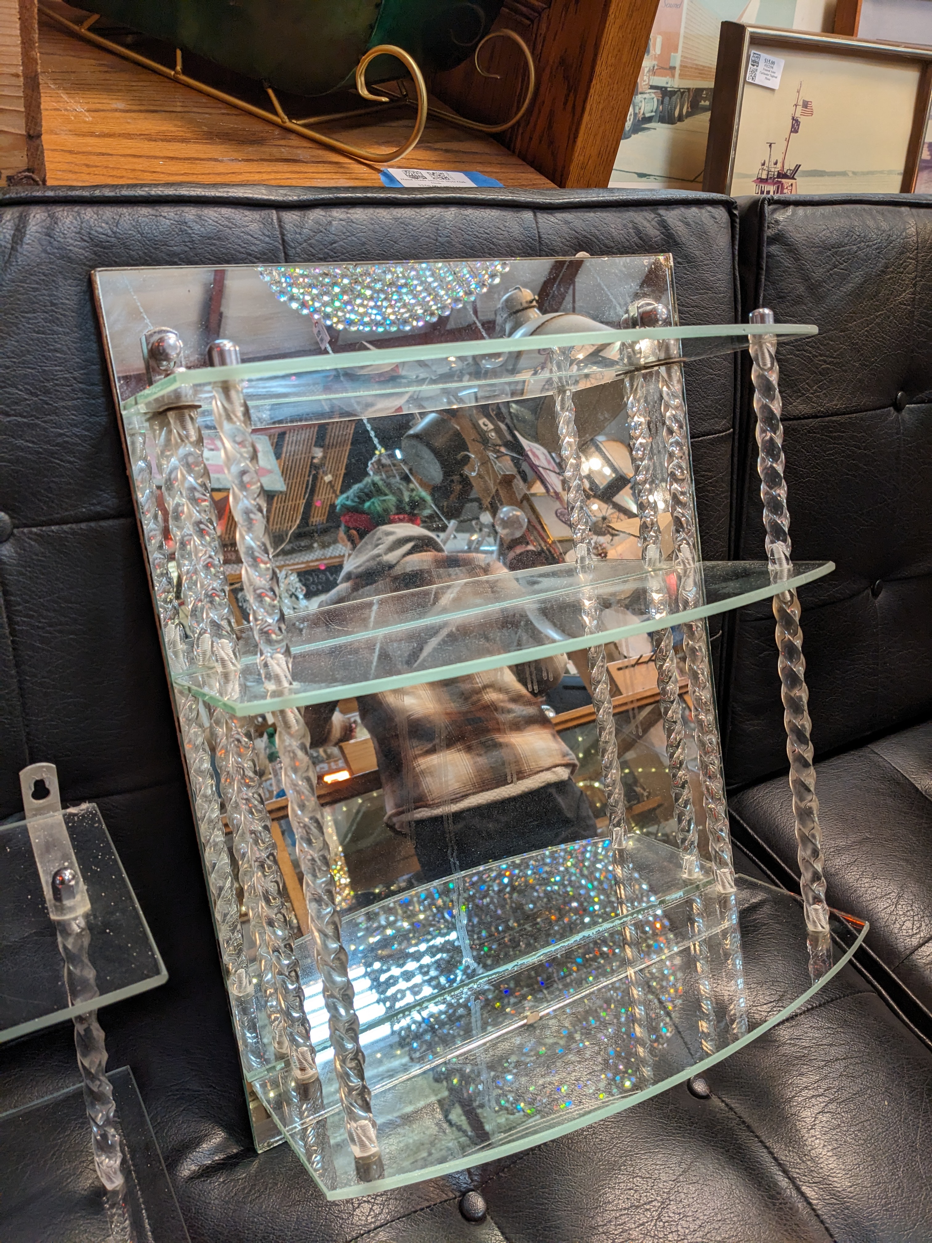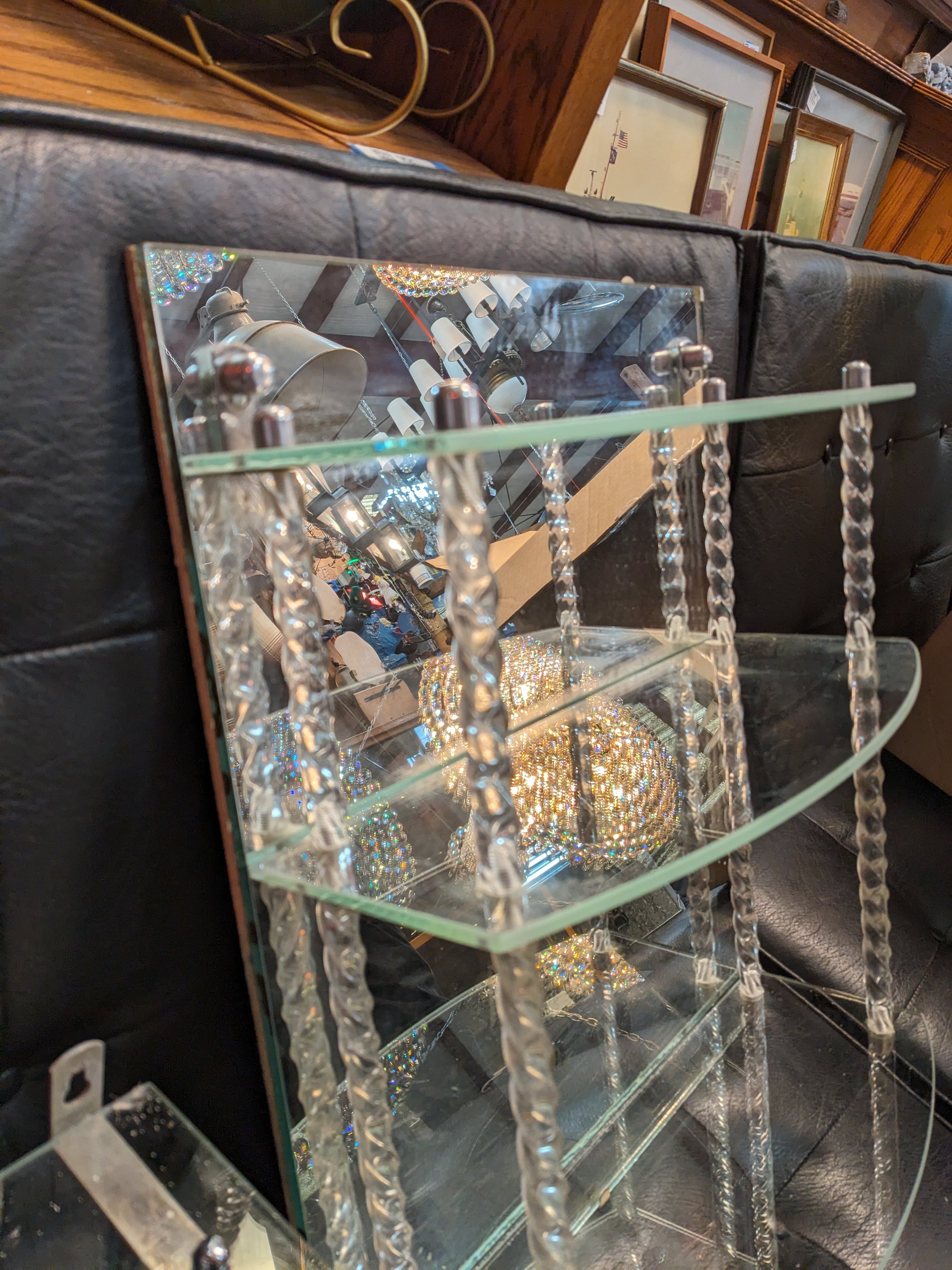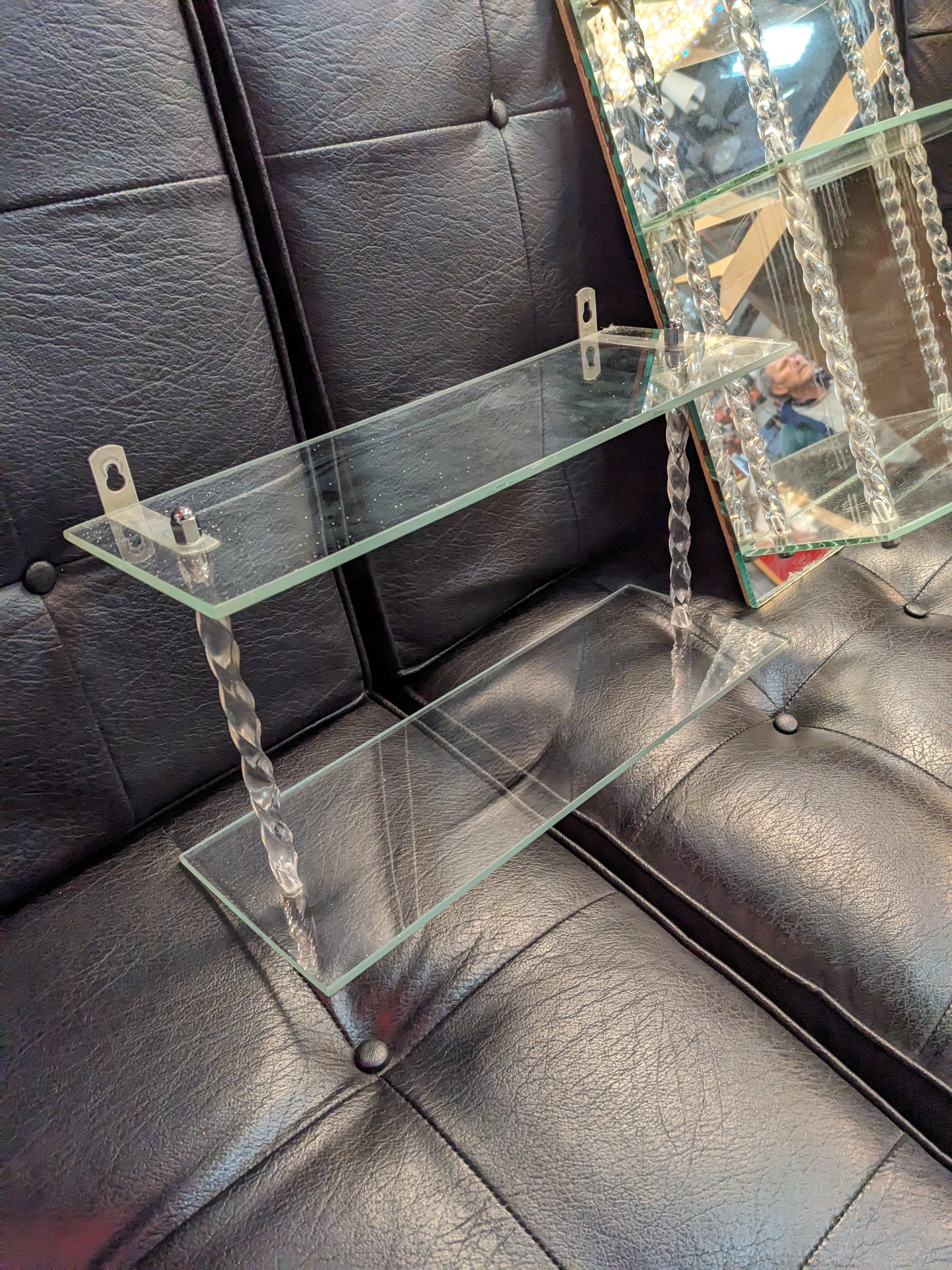 This gorgeous shelf pair features a 3 shelf mirrored back piece (14 x18 x 4.5) and a 2 shelf piece with no mirrored back (14 x 8.5 x 5). These pieces are gorgeous and in great condition with glass shelves suspended with Lucite bars.