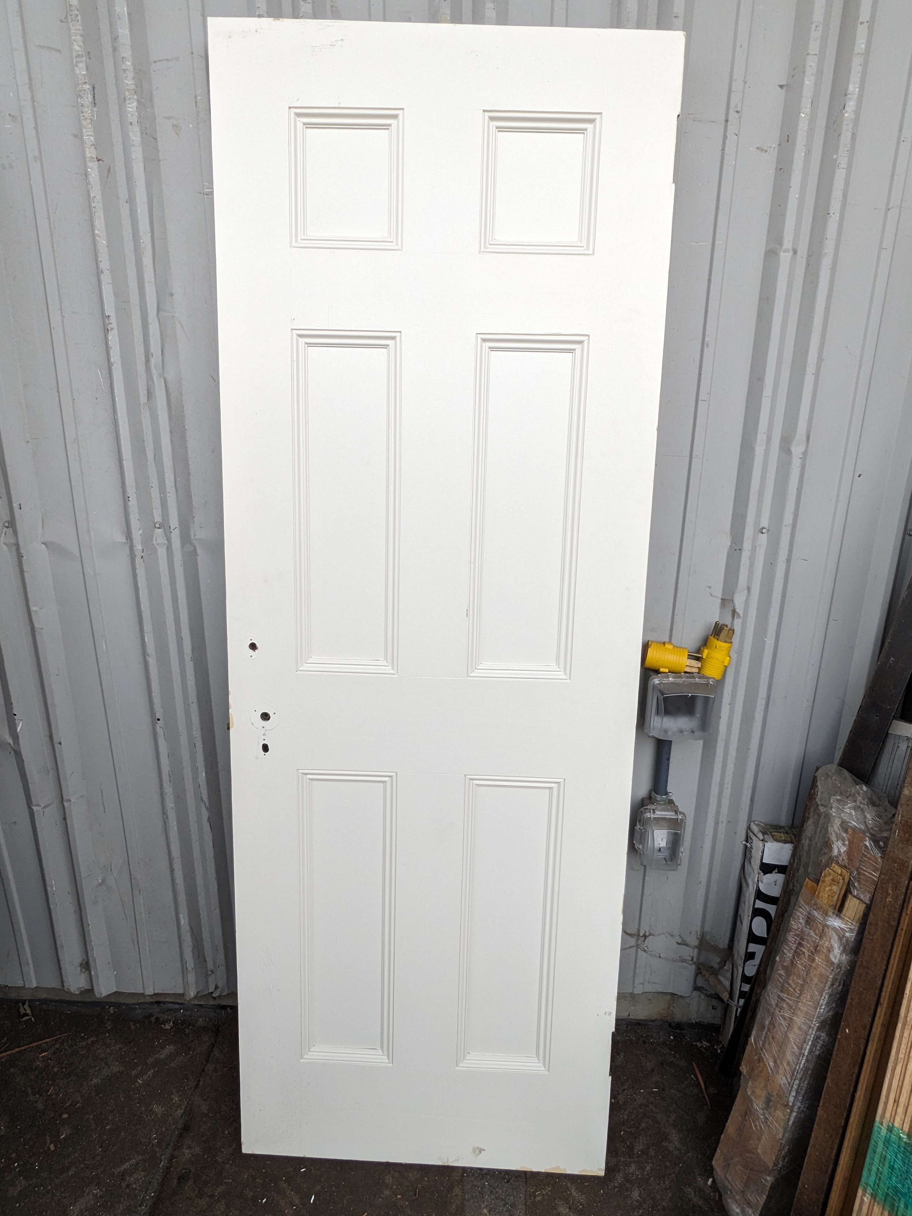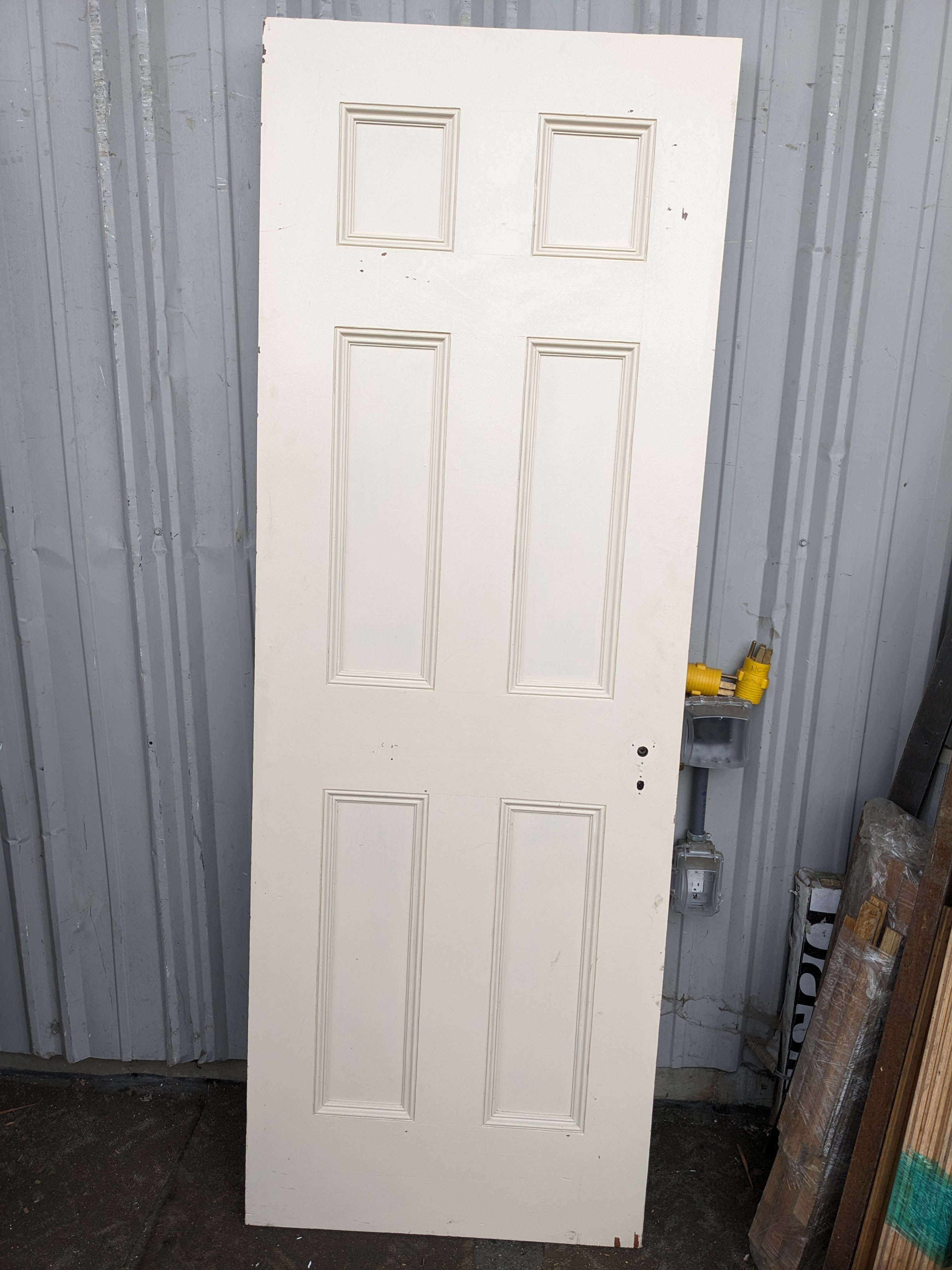This 6 panel interior left swing door is painted white on both sides. Please note that some checking, dings and scratches are present on this piece.