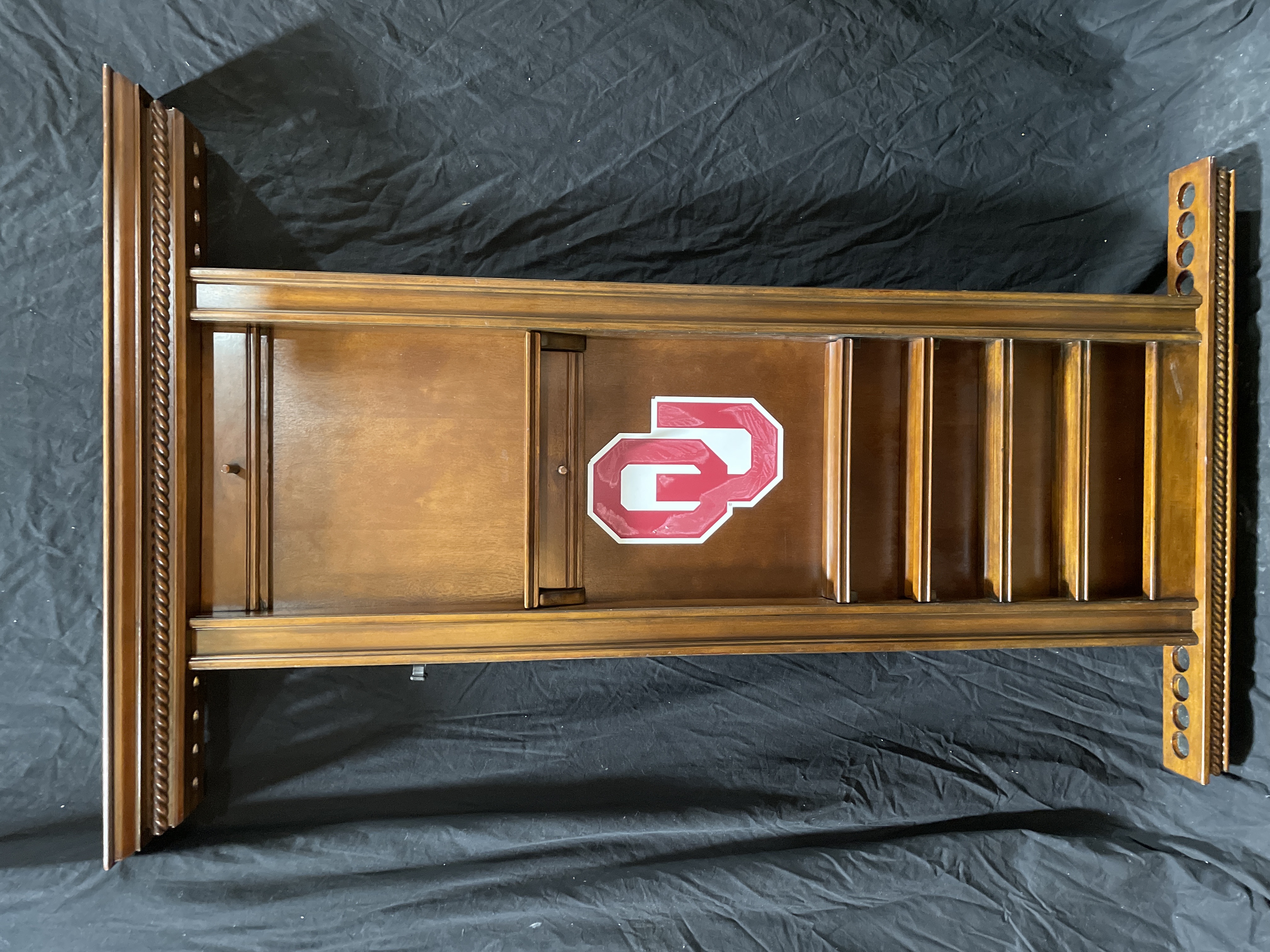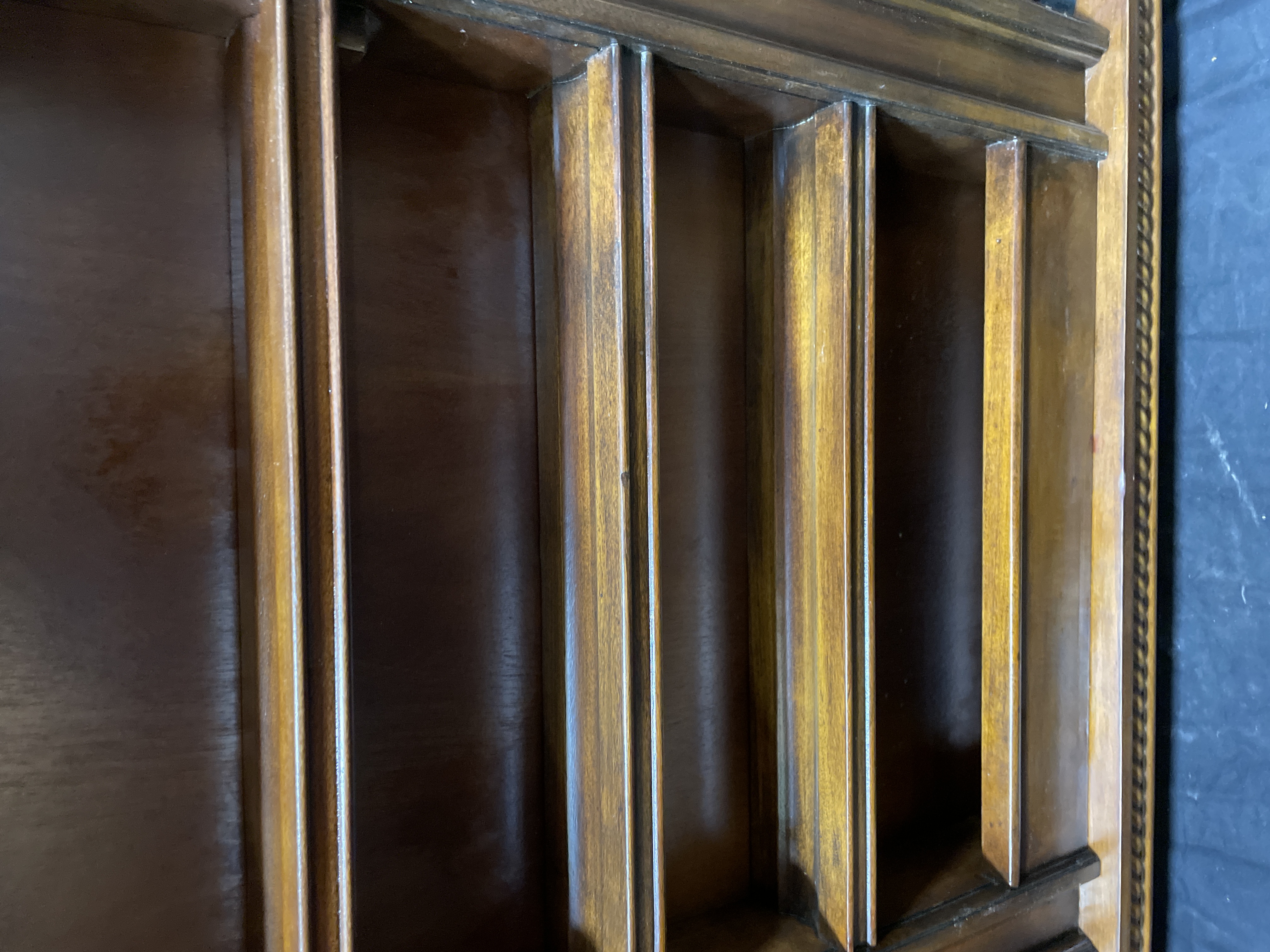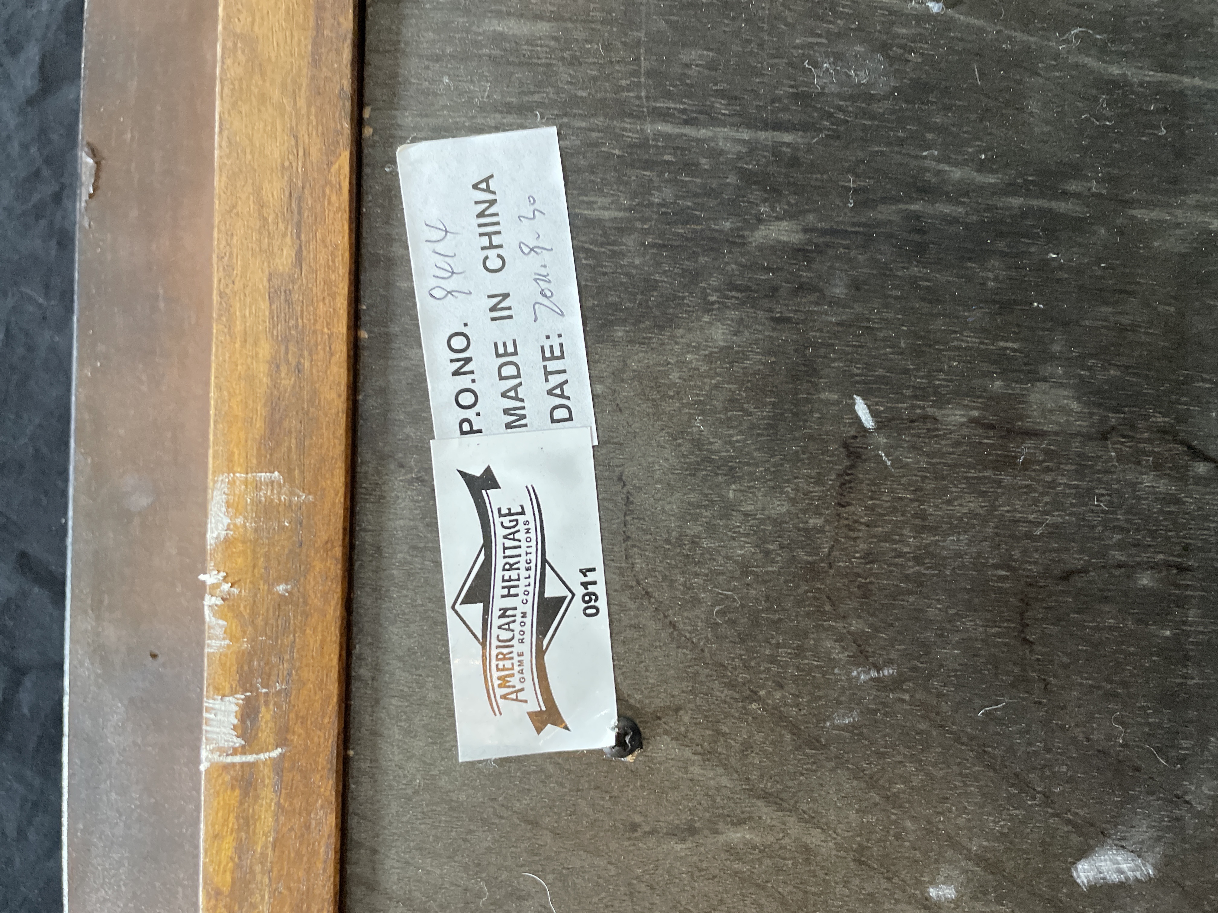 Venice Wall Rack by American Heritage. Holds 8 pool cues vertically in suede holders. Shelves for billiard balls and 2 pegs for holding ball racks. Decorative crown molding on top and bottom. Designed to hang on wall. One wall clap for pool cue is missing. Sticker could be removed. In good condition.