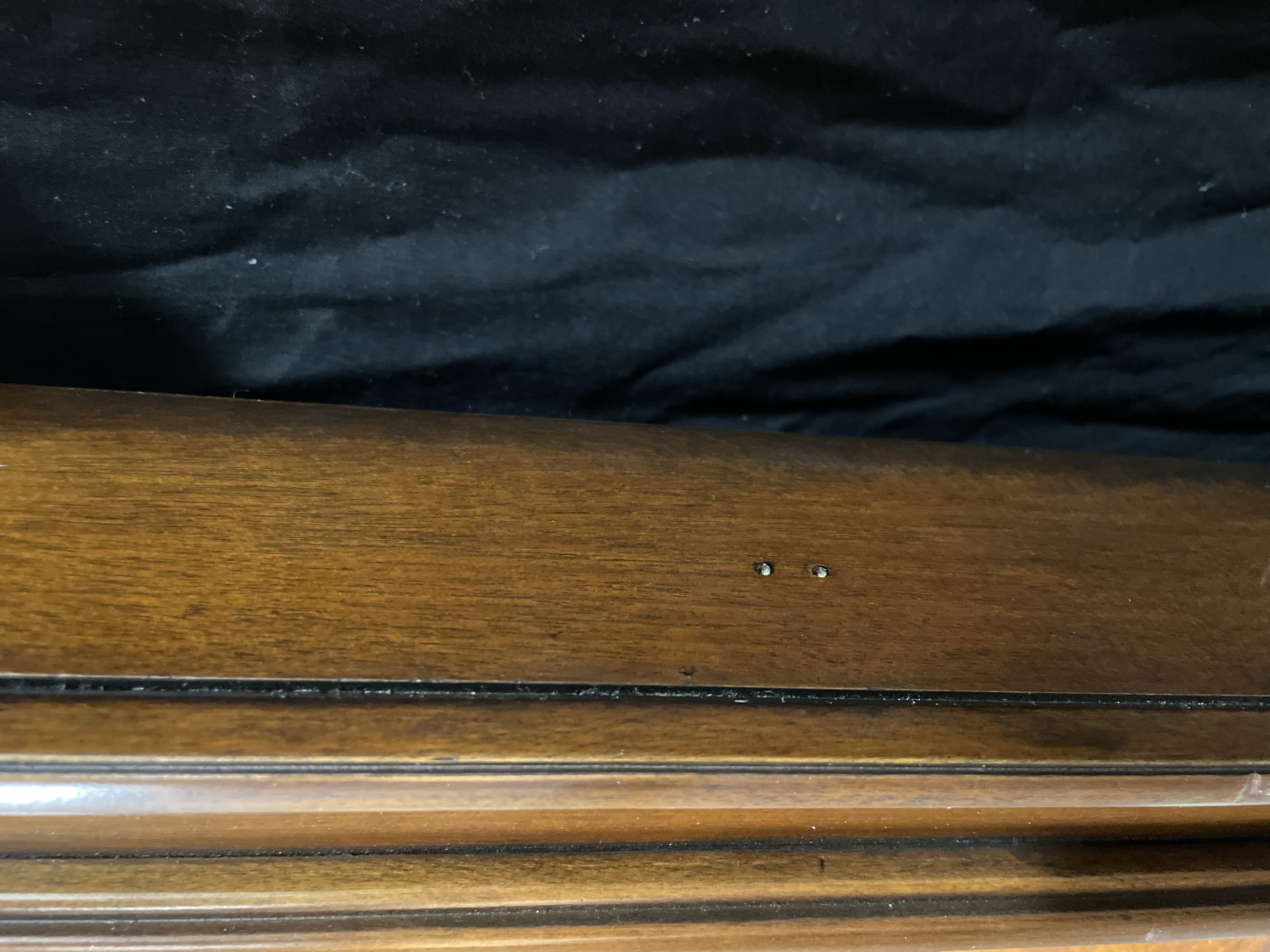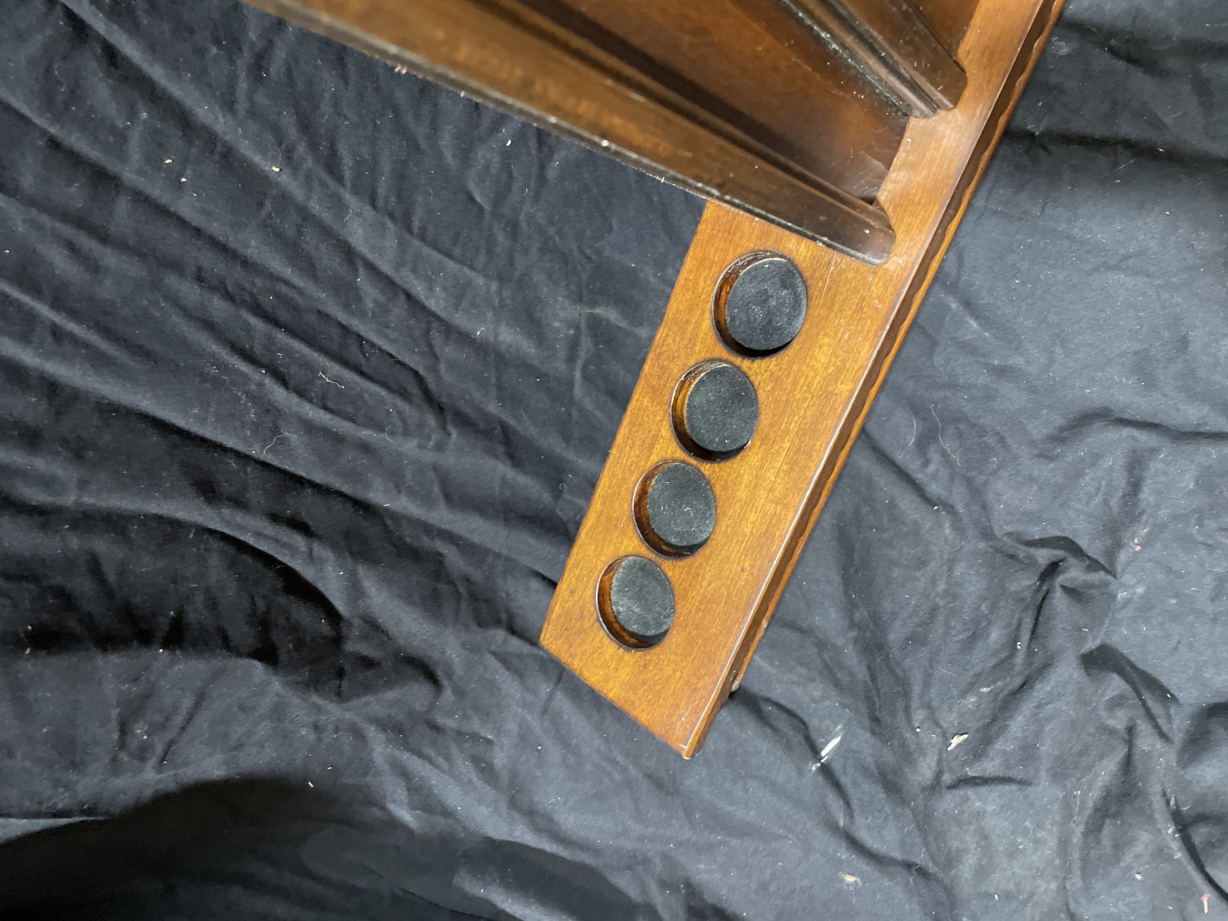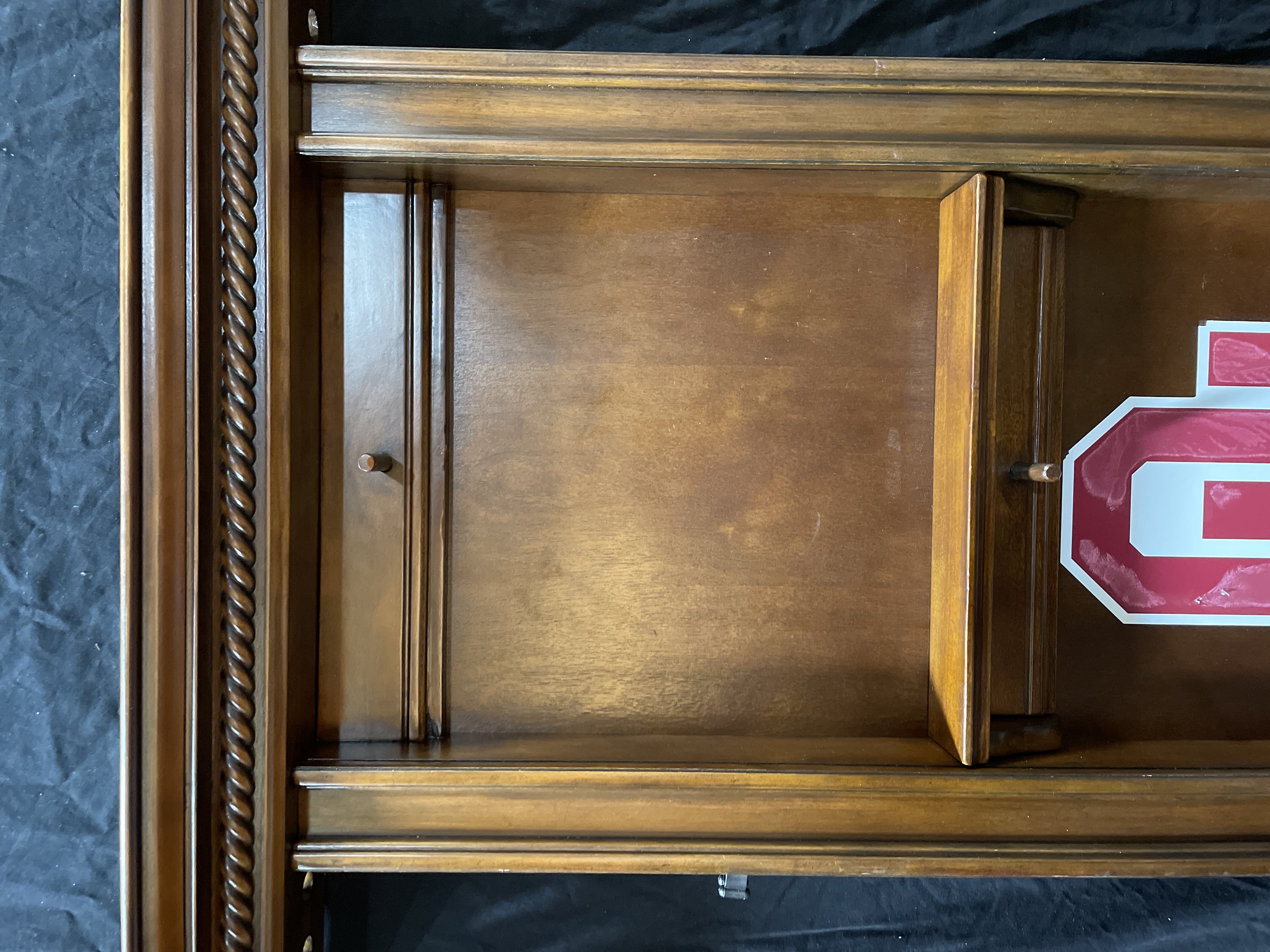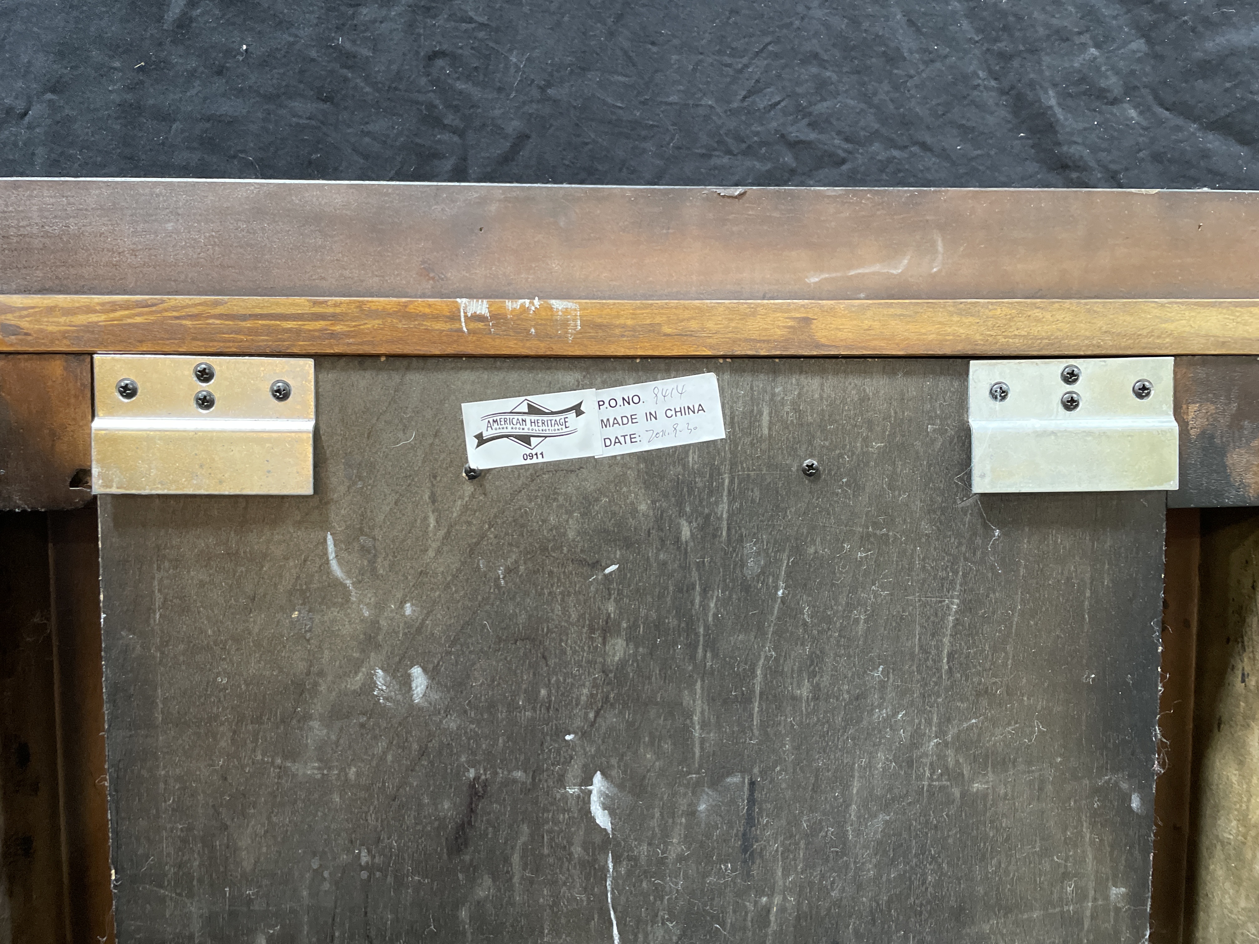 Venice Wall Rack by American Heritage. Holds 8 pool cues vertically in suede holders. Shelves for billiard balls and 2 pegs for holding ball racks. Decorative crown molding on top and bottom. Designed to hang on wall. One wall clap for pool cue is missing. Sticker could be removed. In good condition.