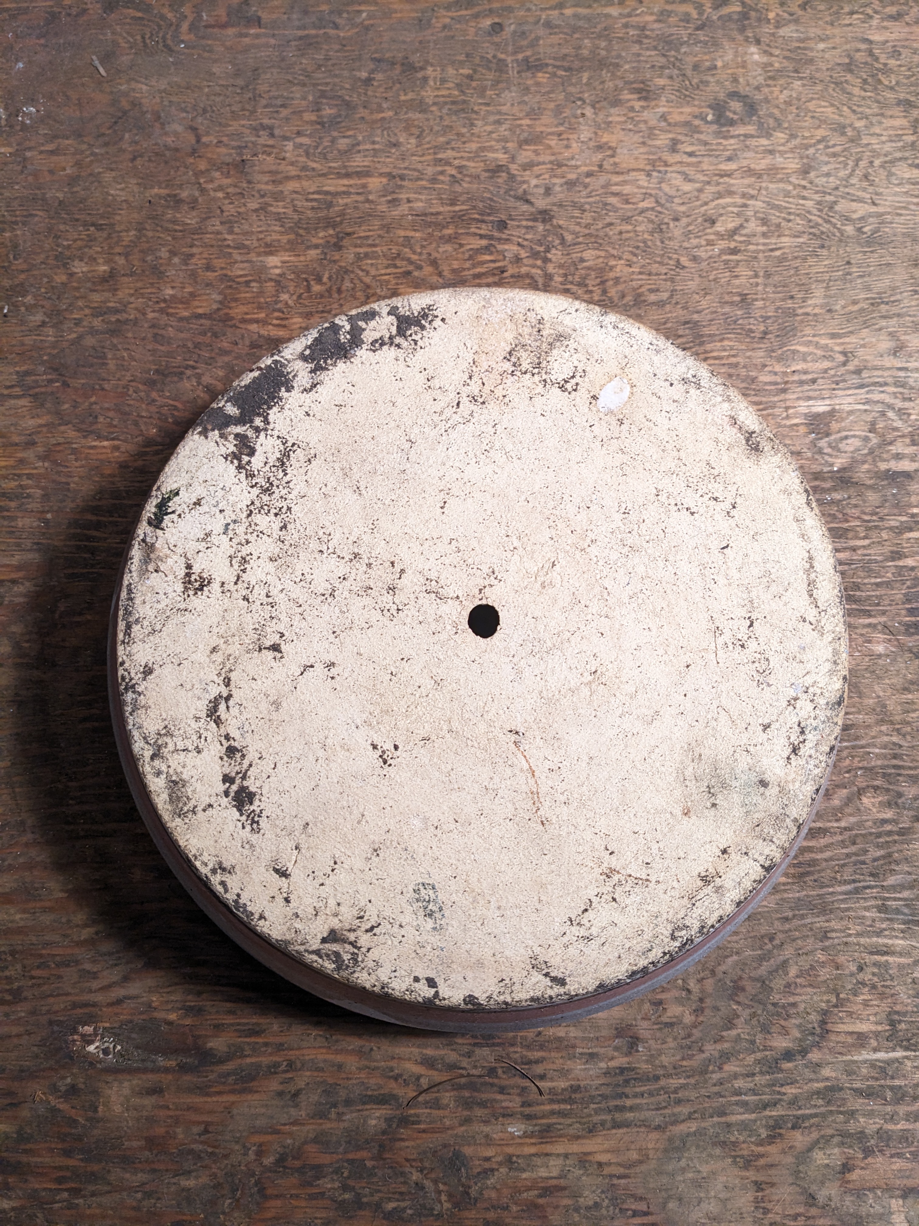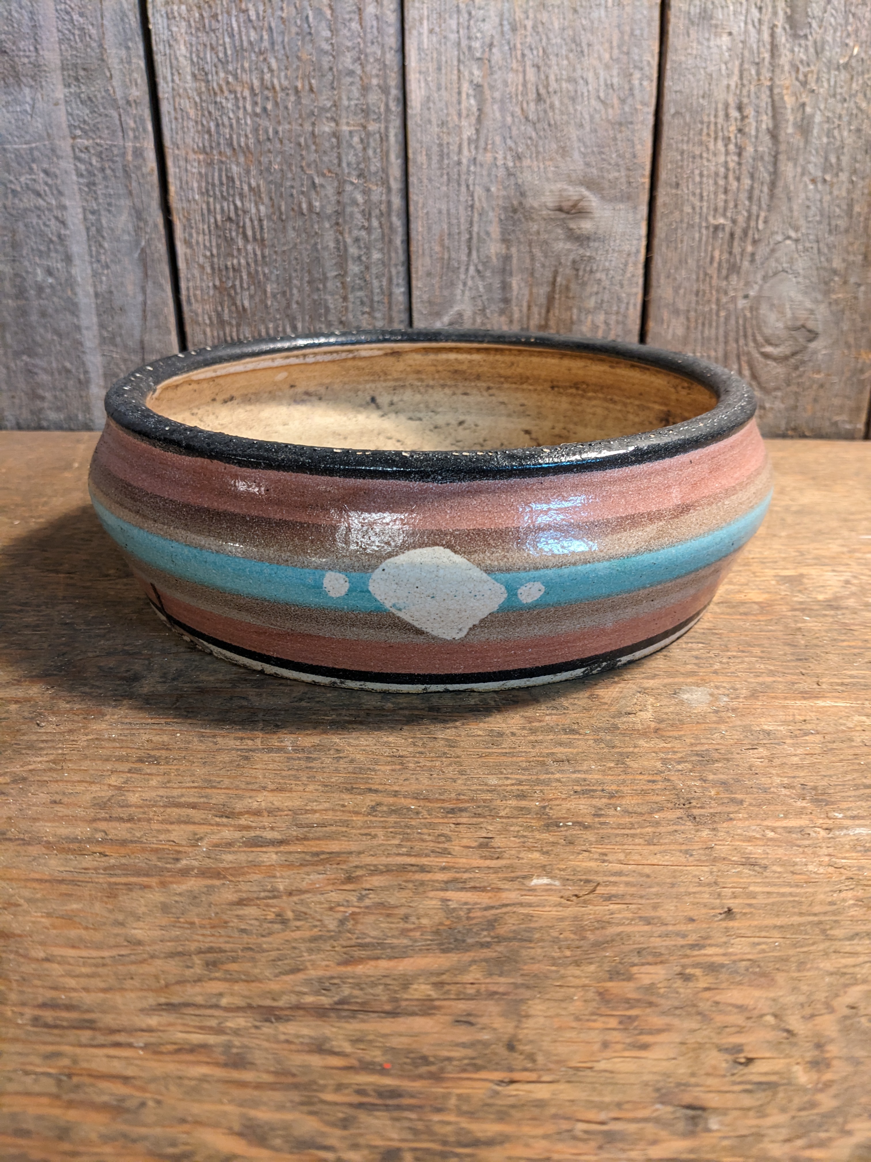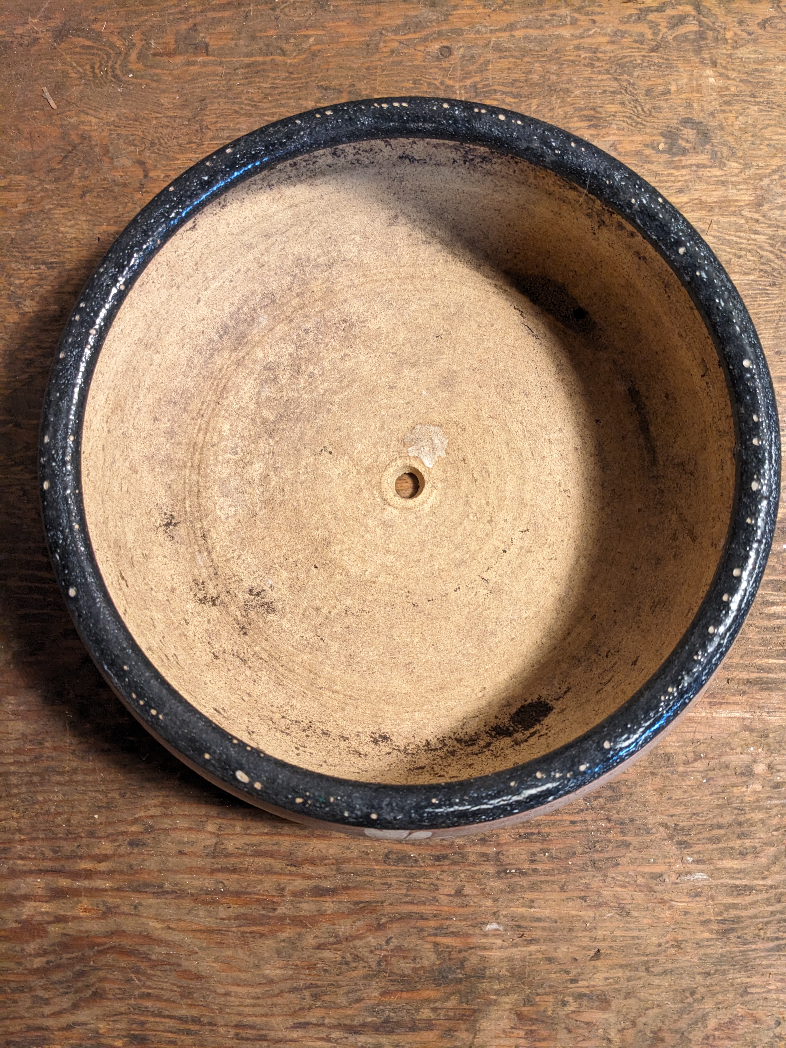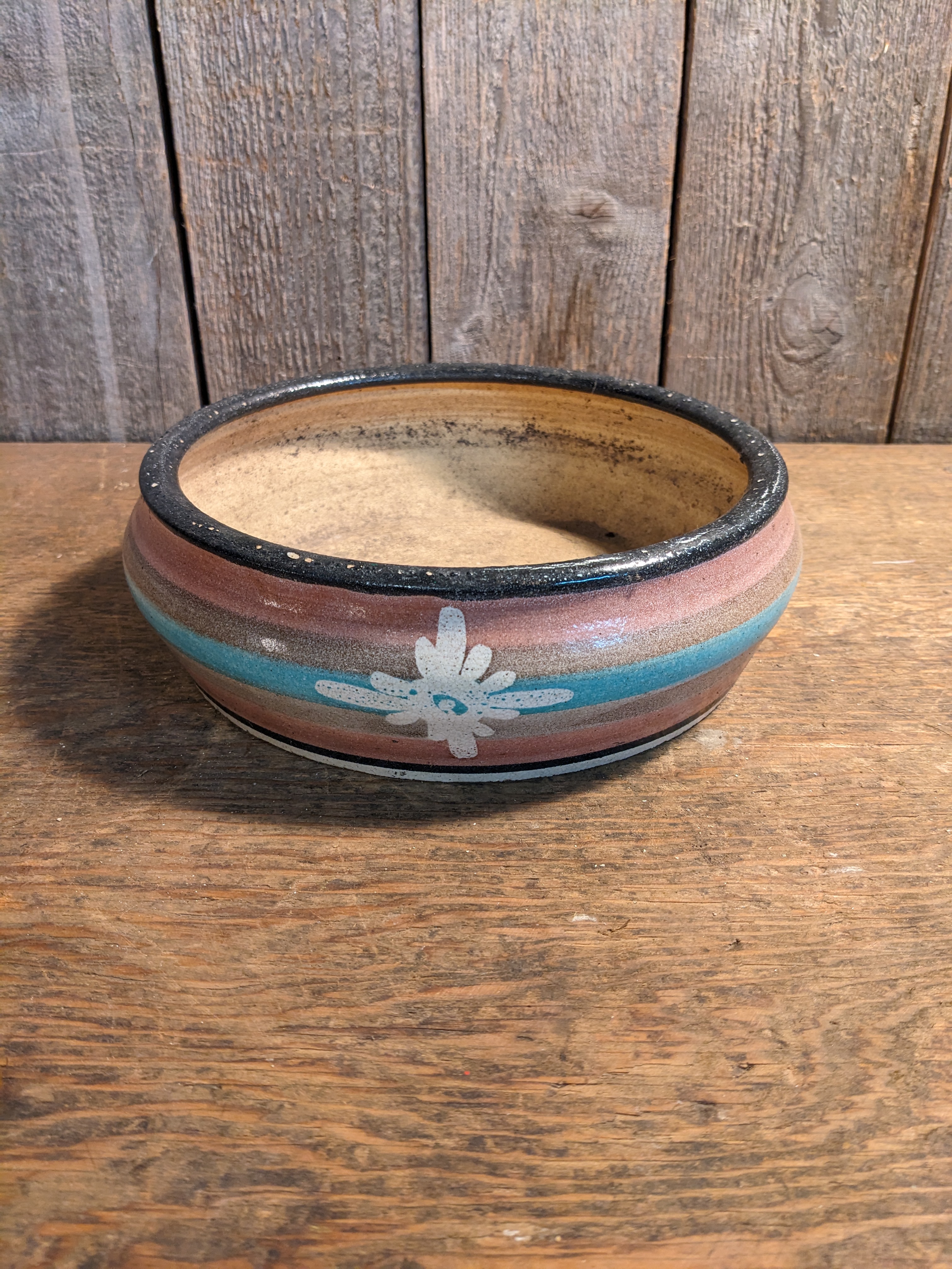 A round ceramic pot that's quite shallow. It would be perfect for succulents or small herbs. It's in good condition with a bit of wear. It measures 9 x 2.625 inches.