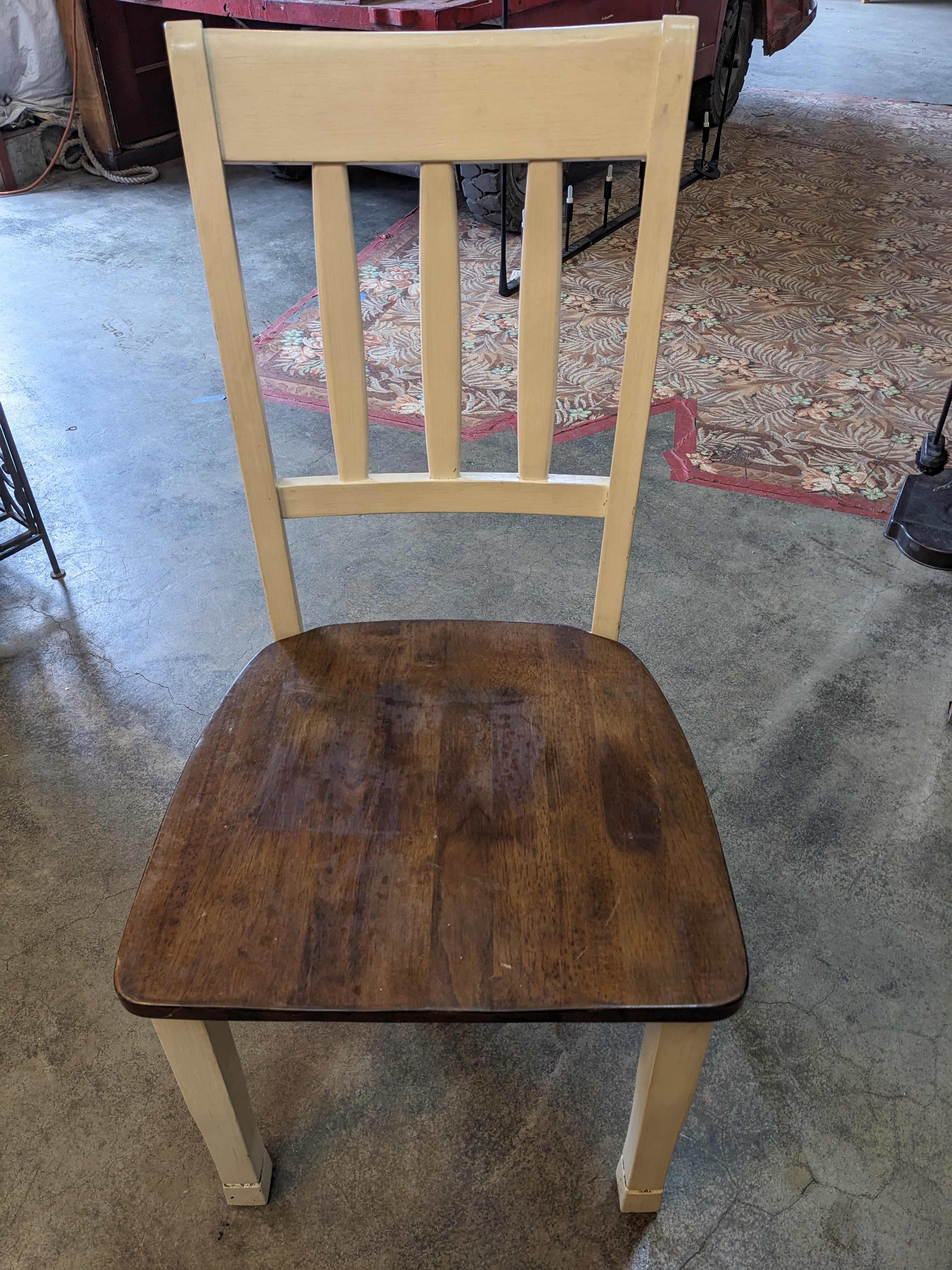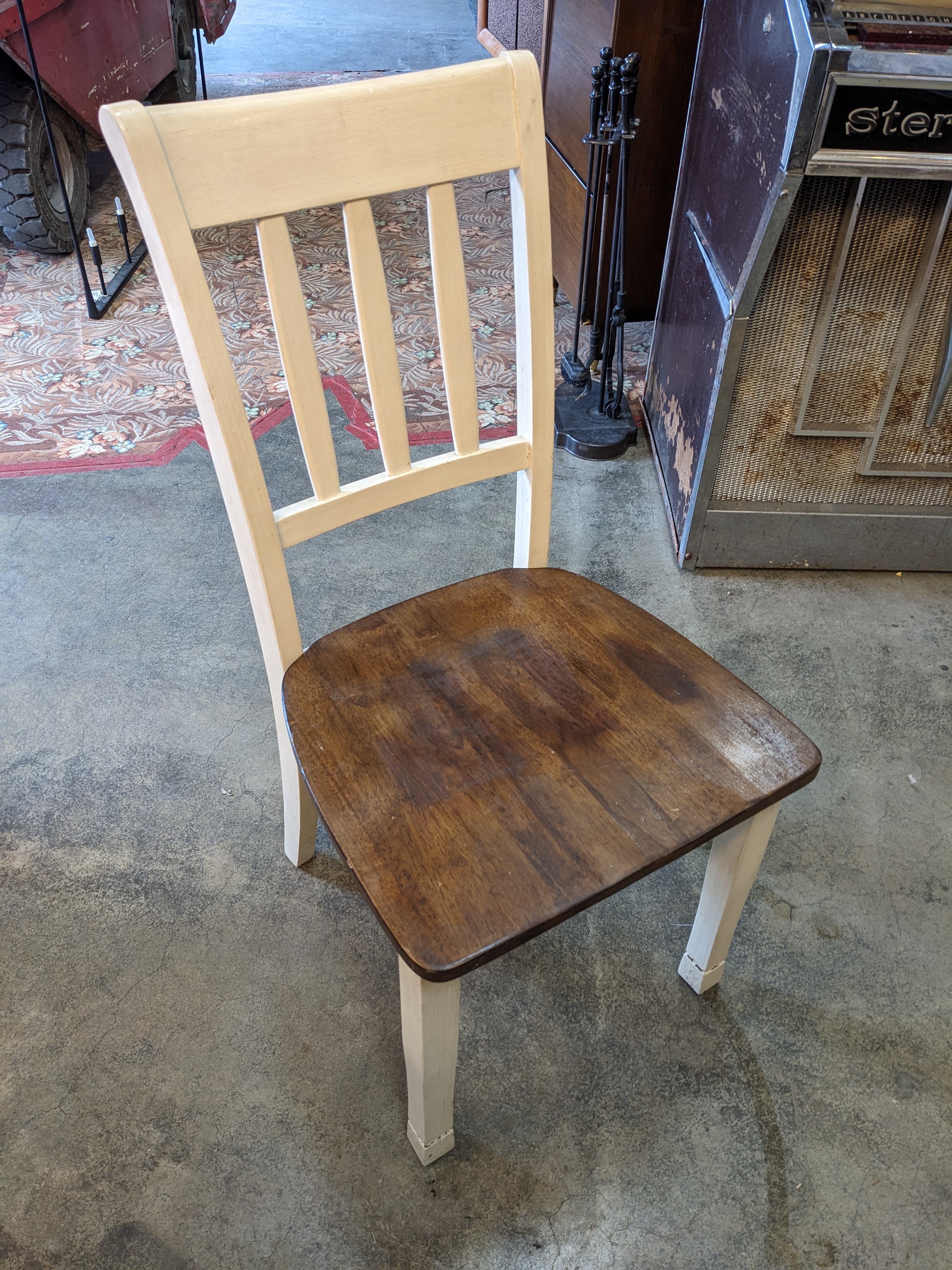 This slick dining room chair has legs and a backing that has been painted white. The seat is a darker wood grain.