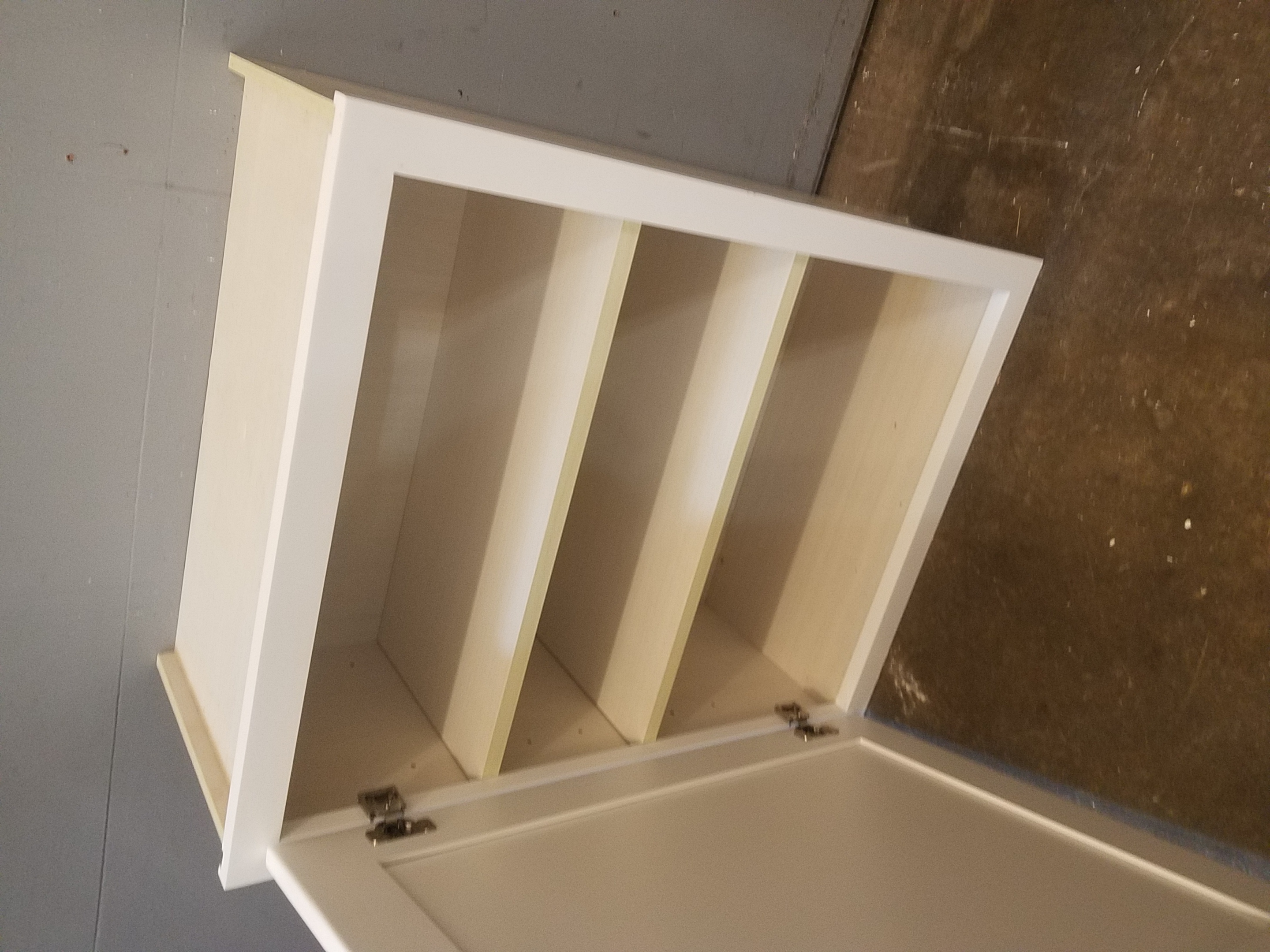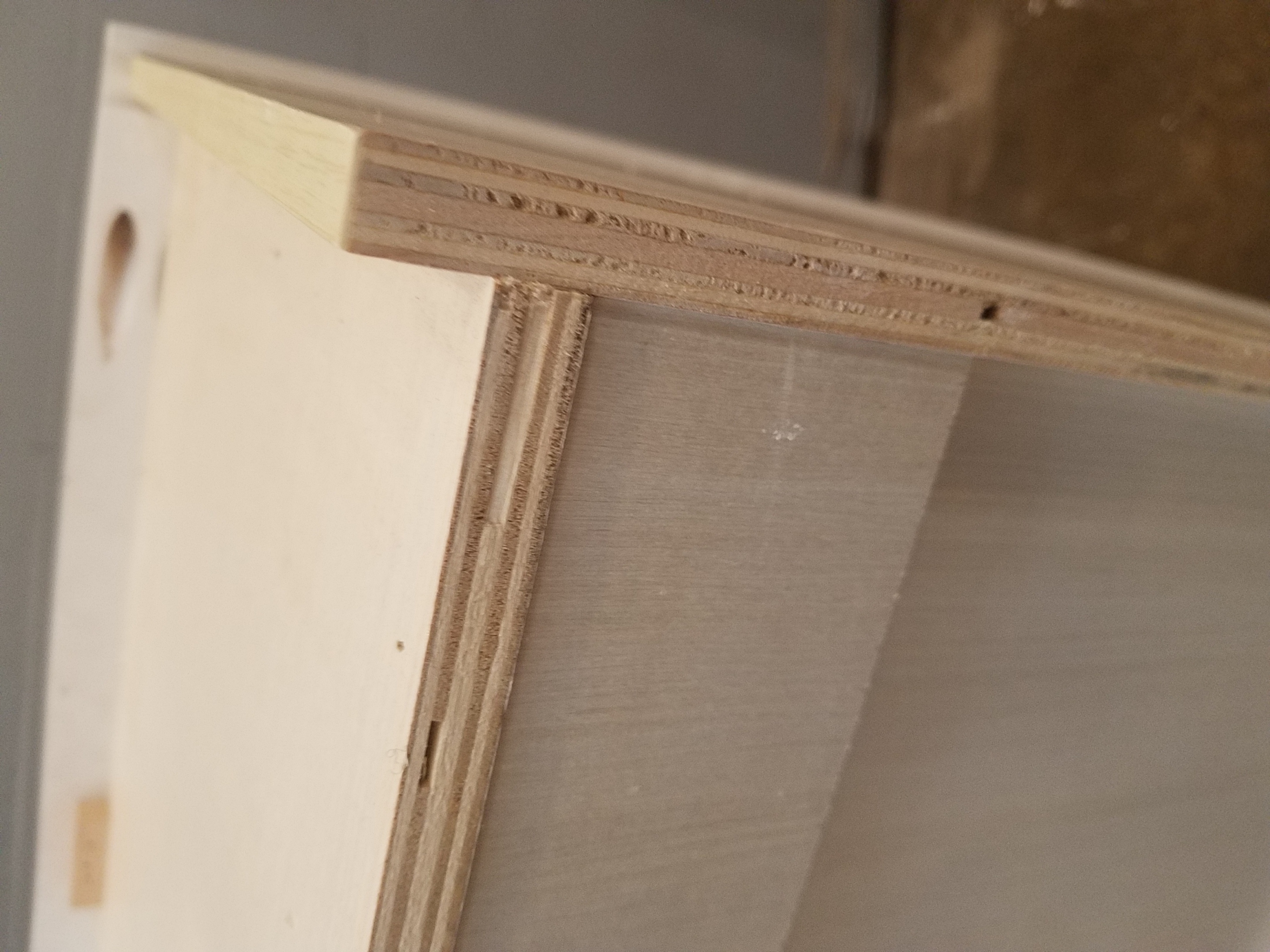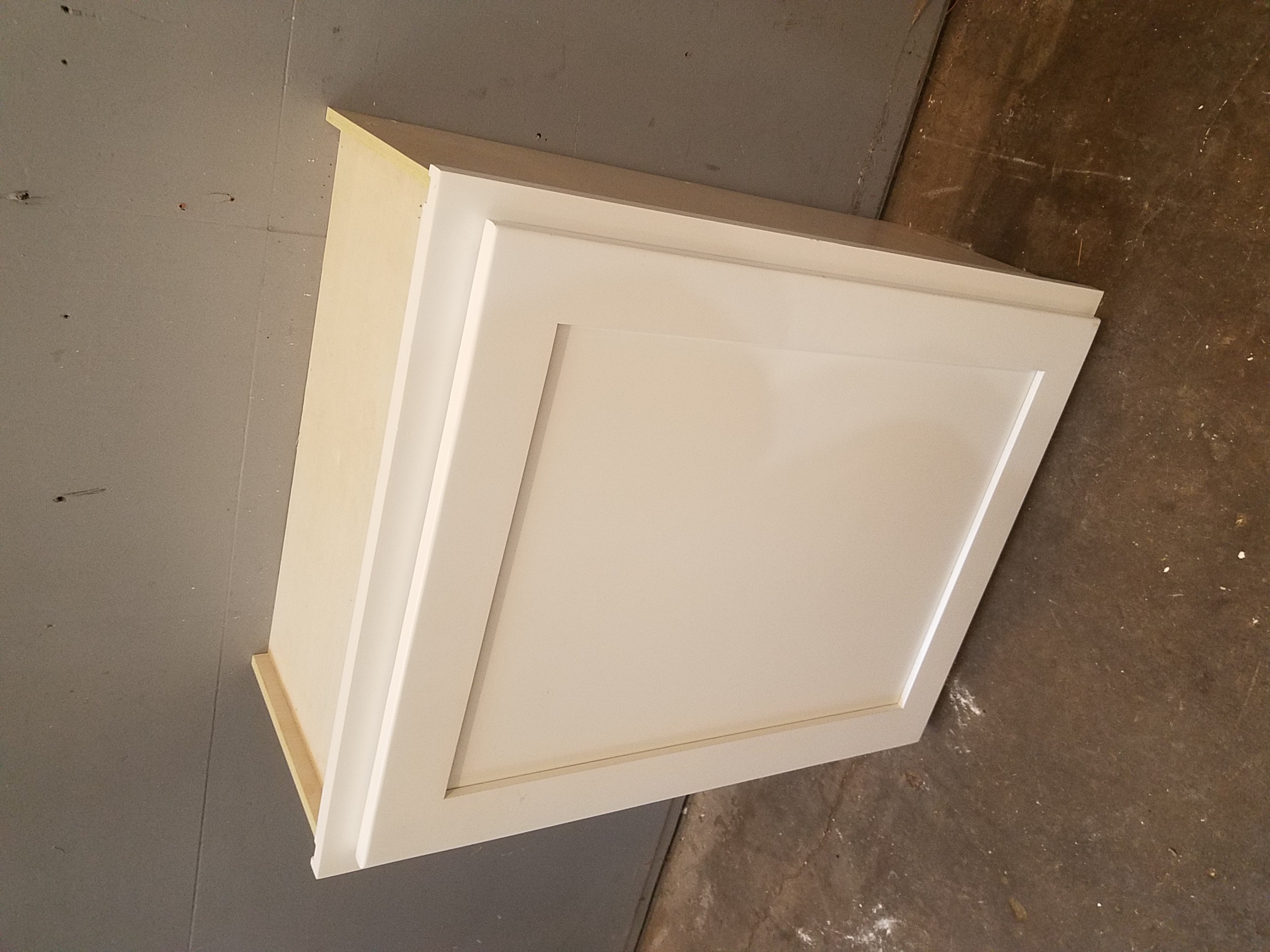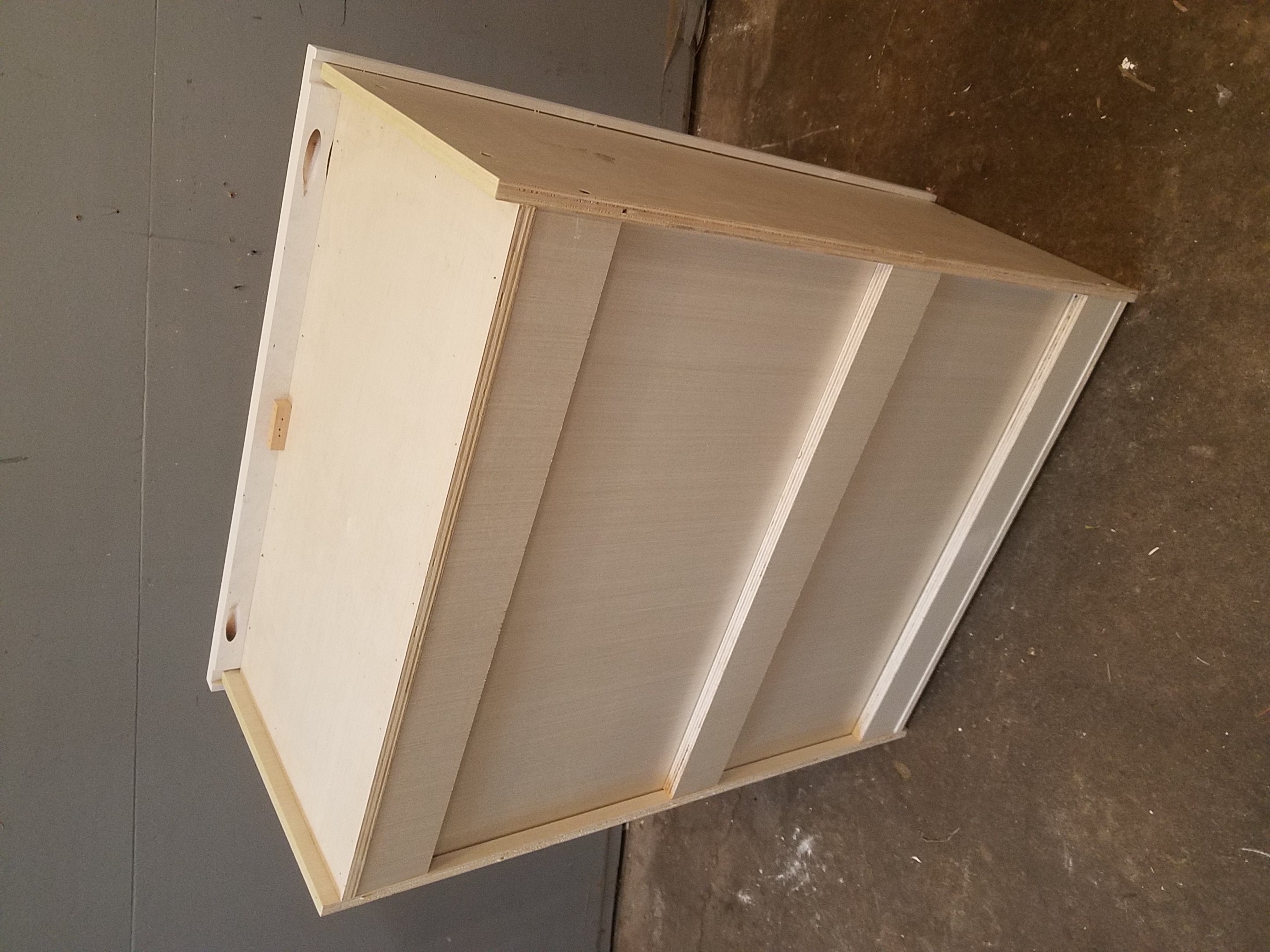 Single door cabinet made of plywood, sturdily built with a couple of shelf boards.