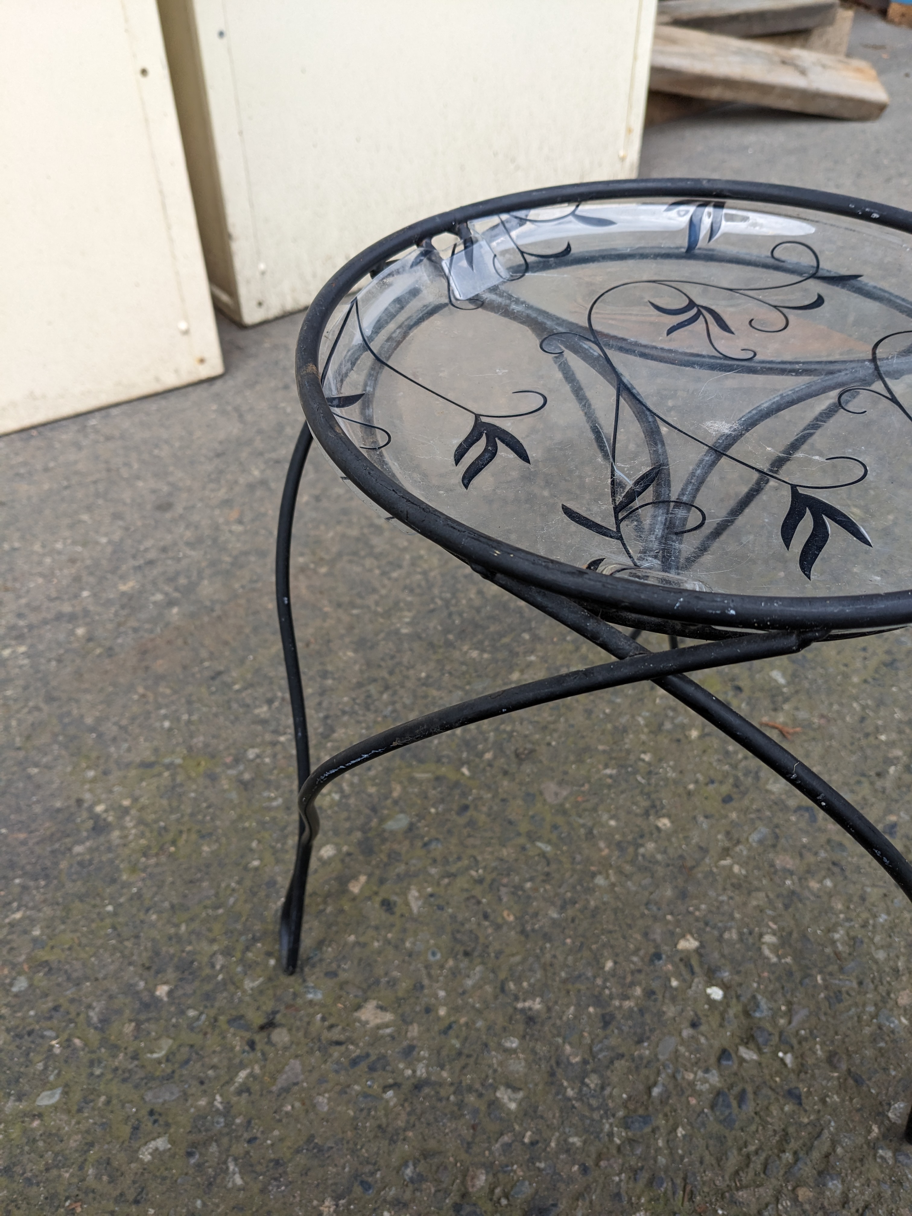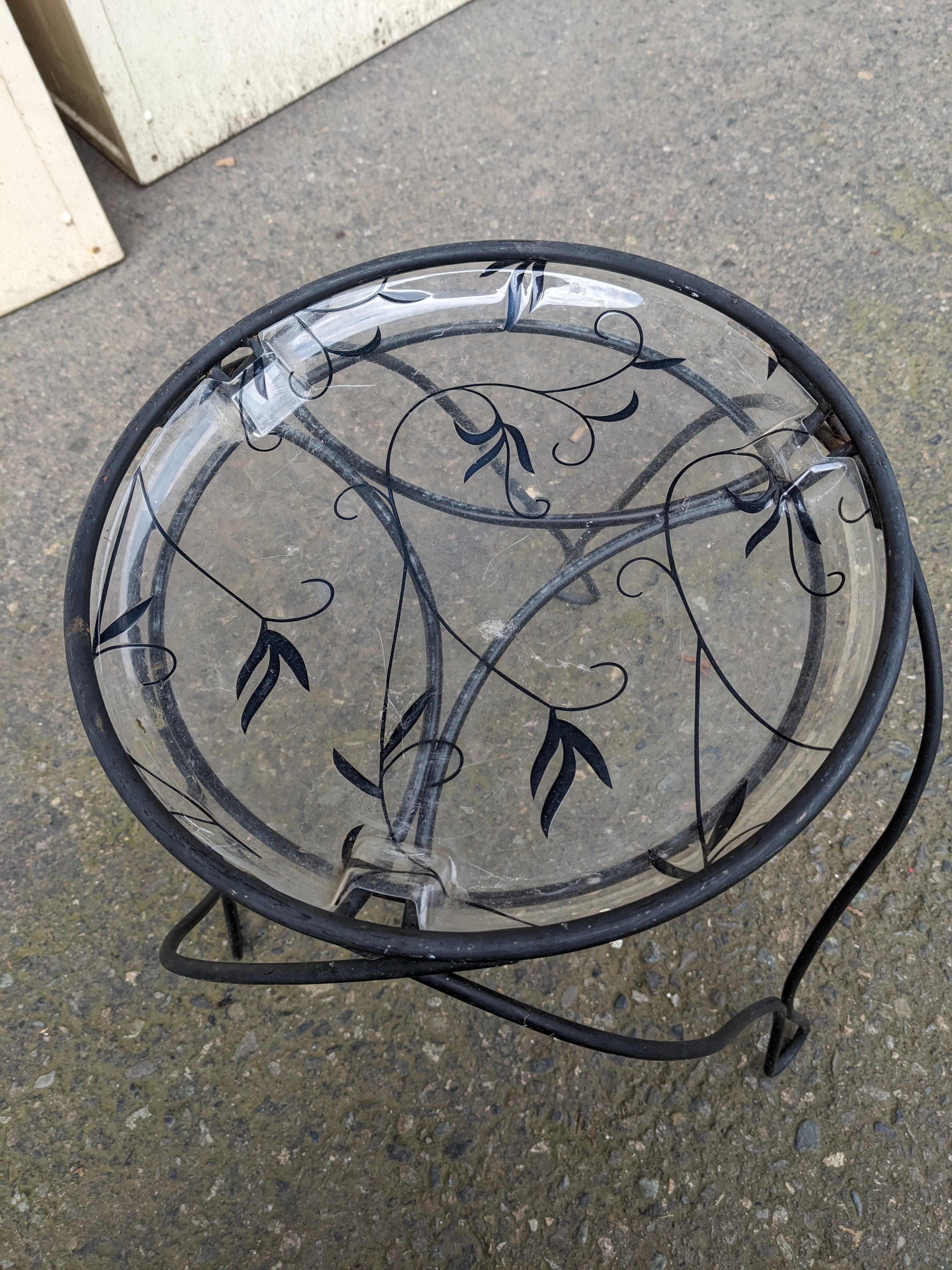 This cute plant stand is good for indoor or outdoor use. It can accommodate up to a 10" plant and the frame measures 11 x 13. It has a plastic base that could be removed.