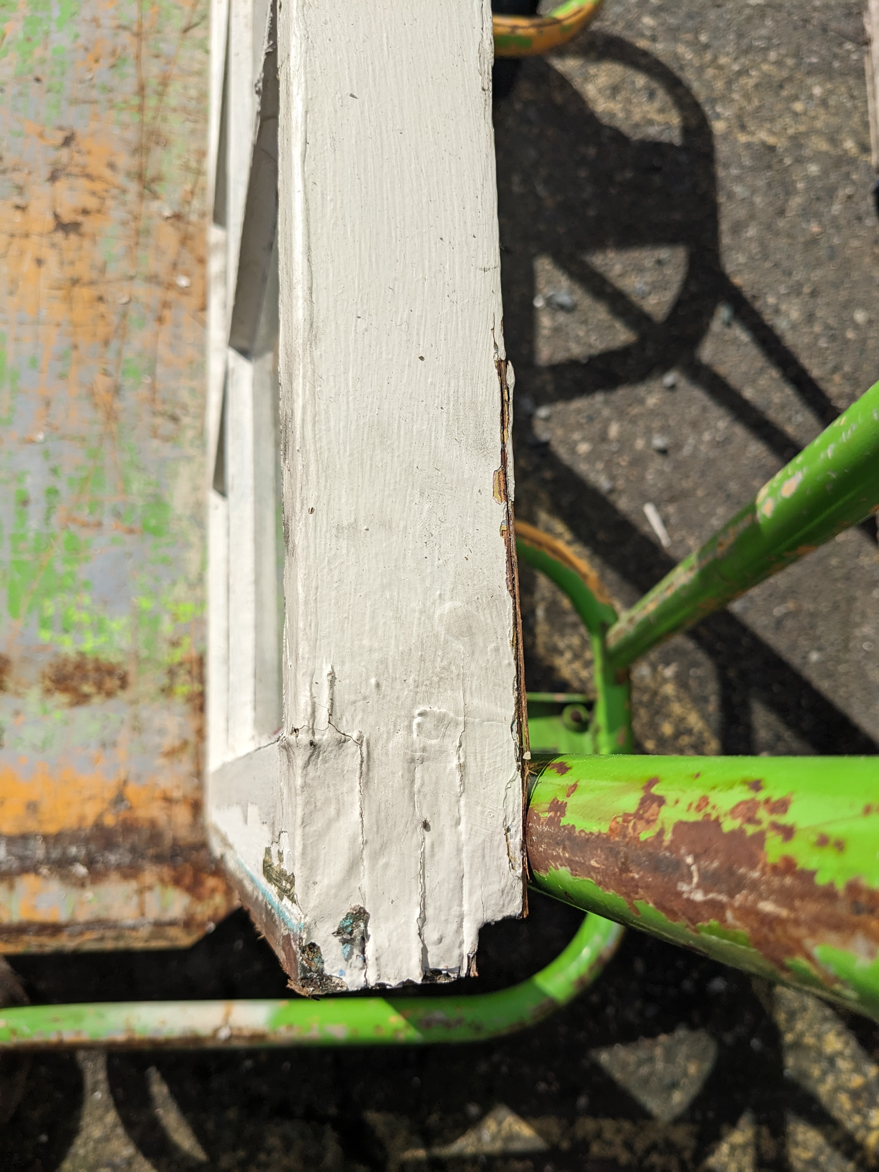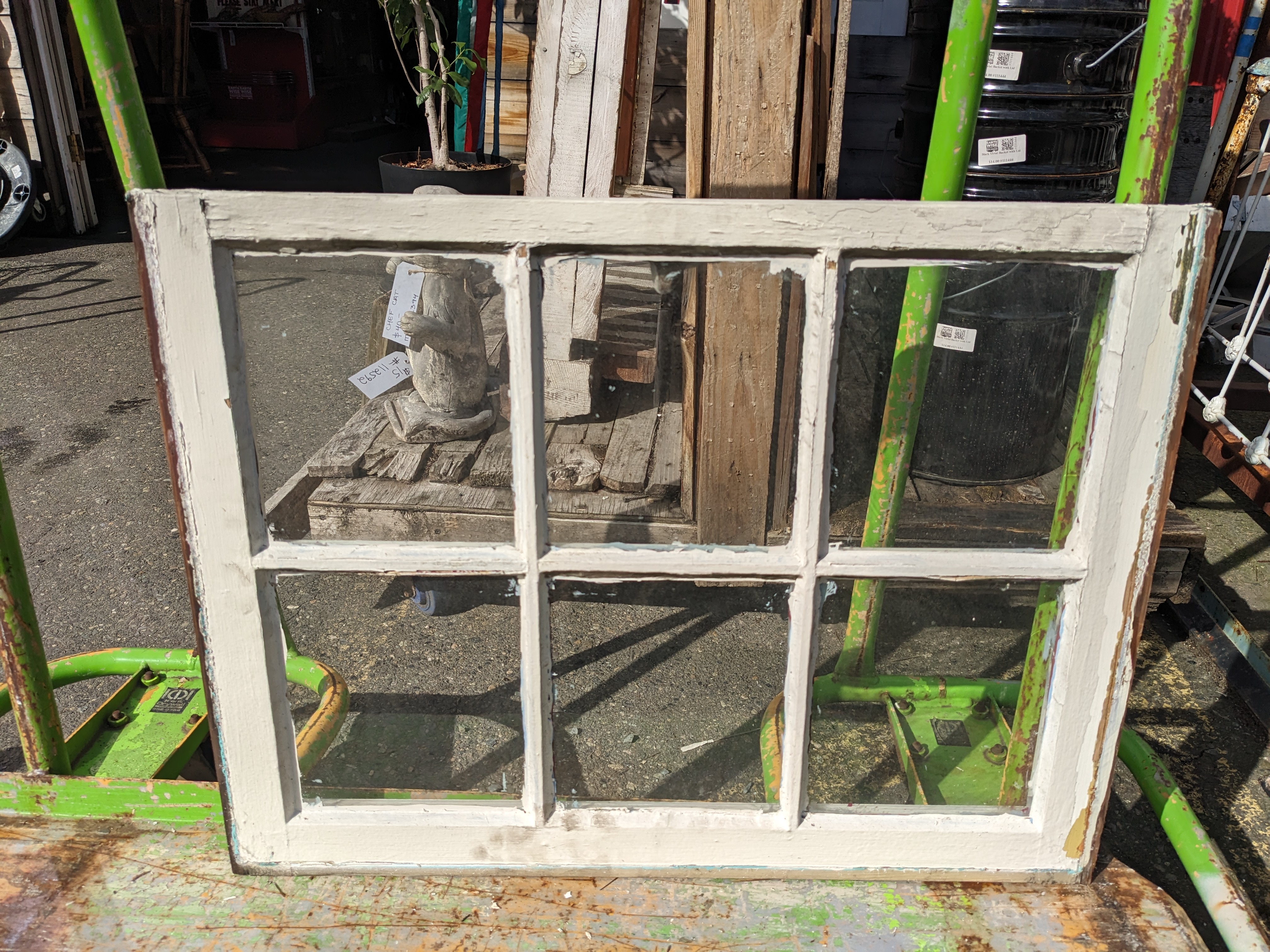 6 pane divided lite wood window. Painted on both sides. No cracks or chips in the glass. Frame is old but sturdy.