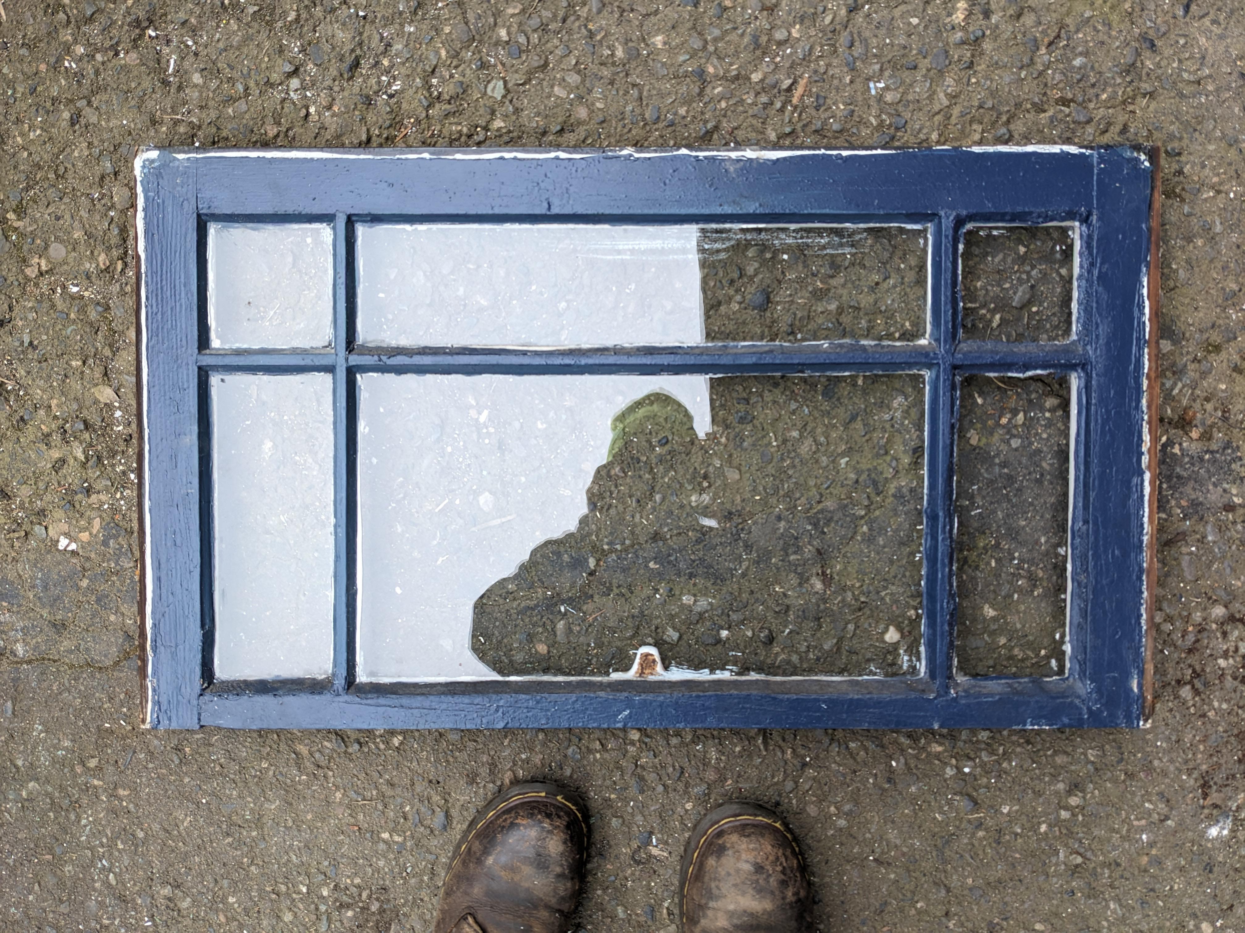This wood divided lite window has 6 in tact panes. In good condition, painted white on one side and blue on the other. Measures 30 x 17.