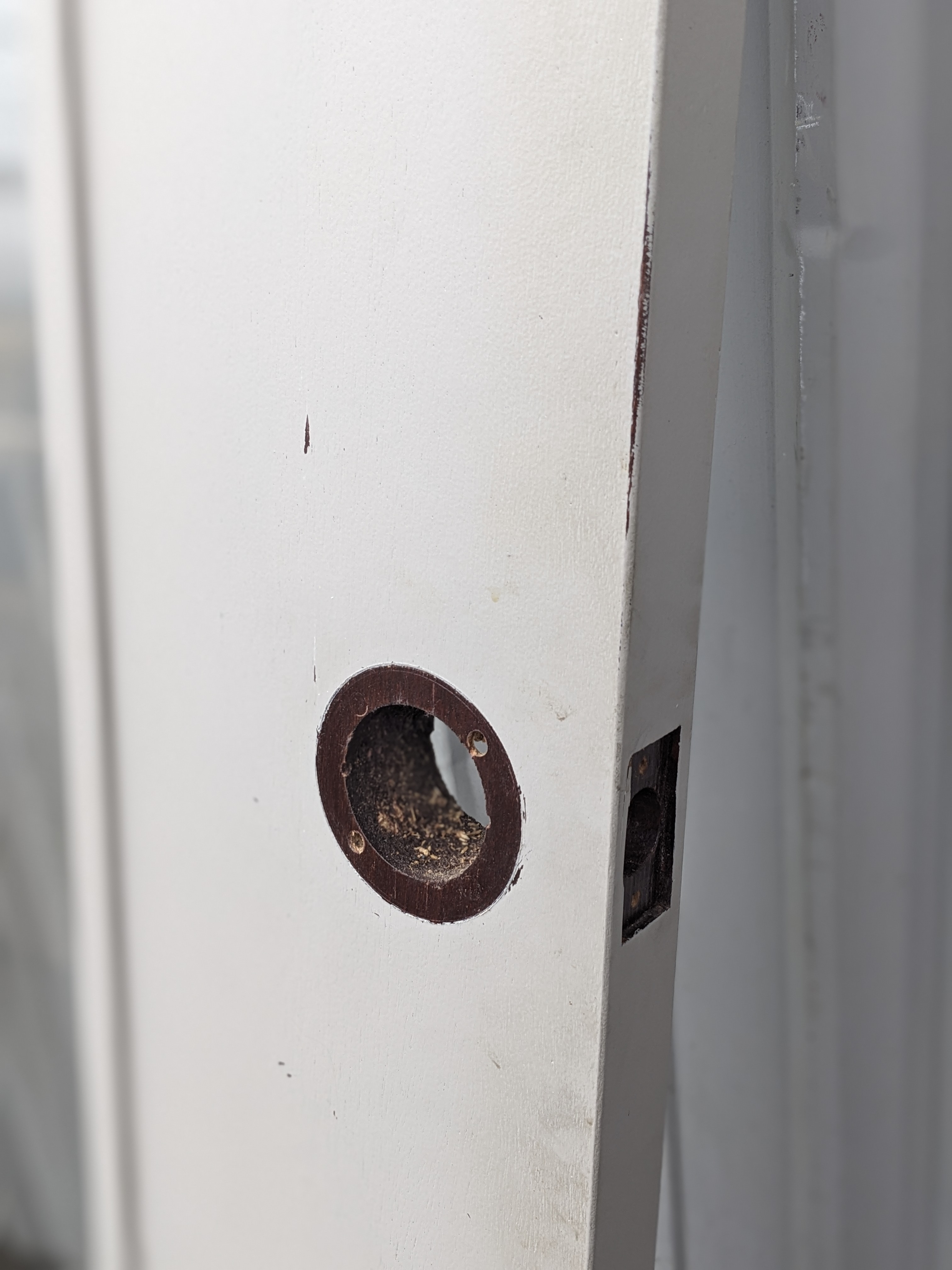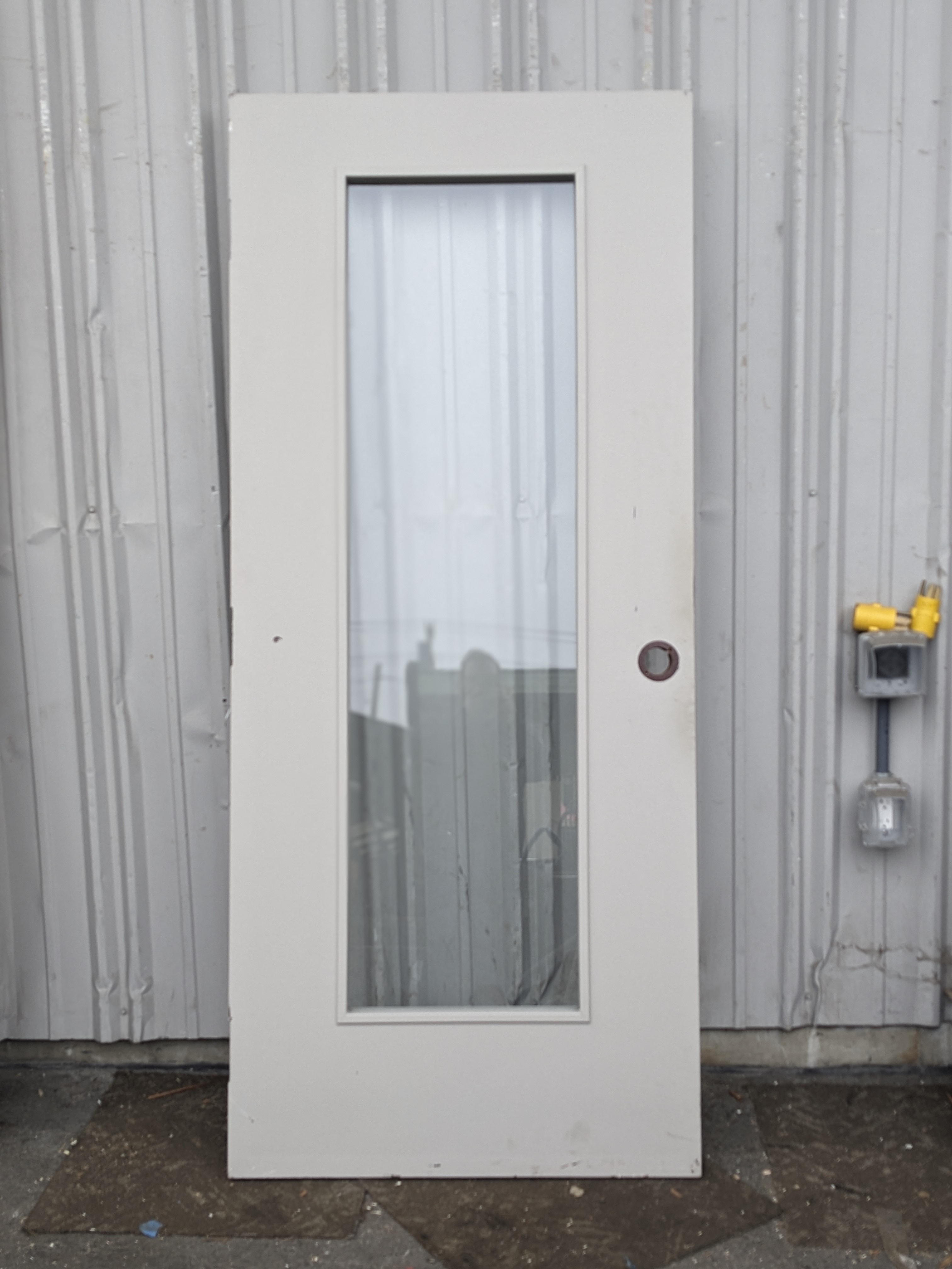 This hefty commercial door has tempered glass and is 1.75 inches thick.