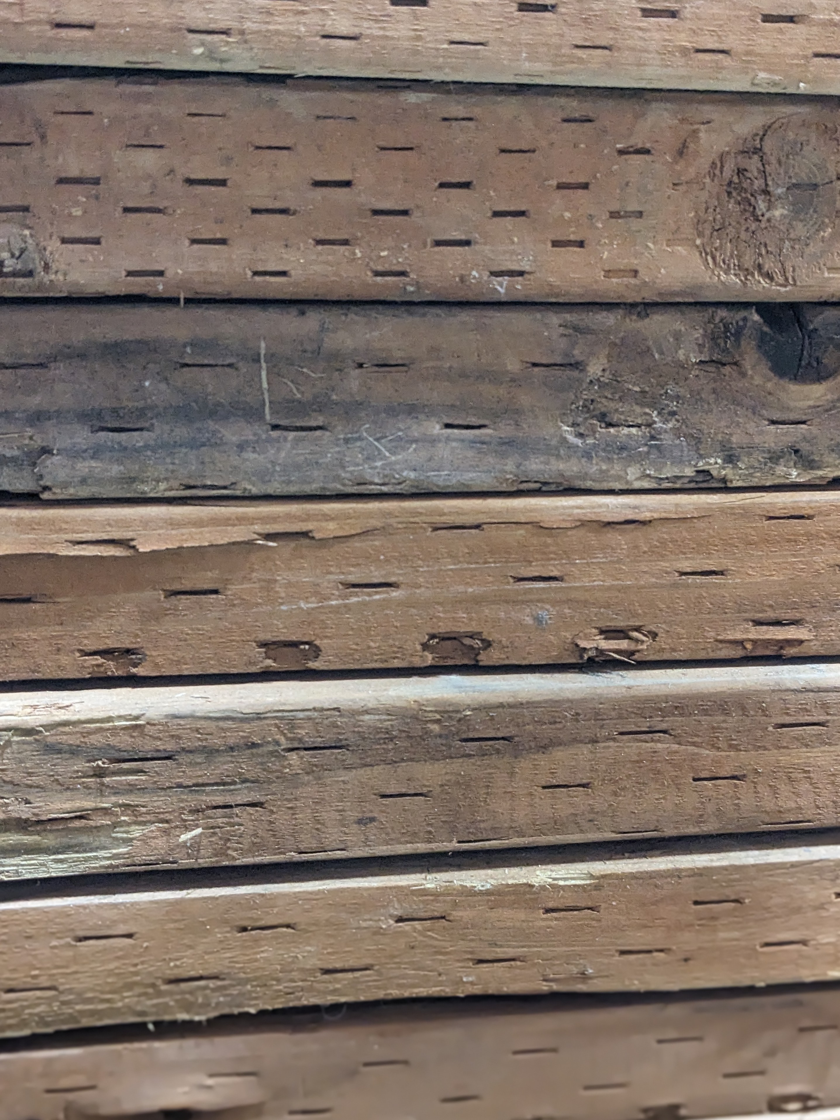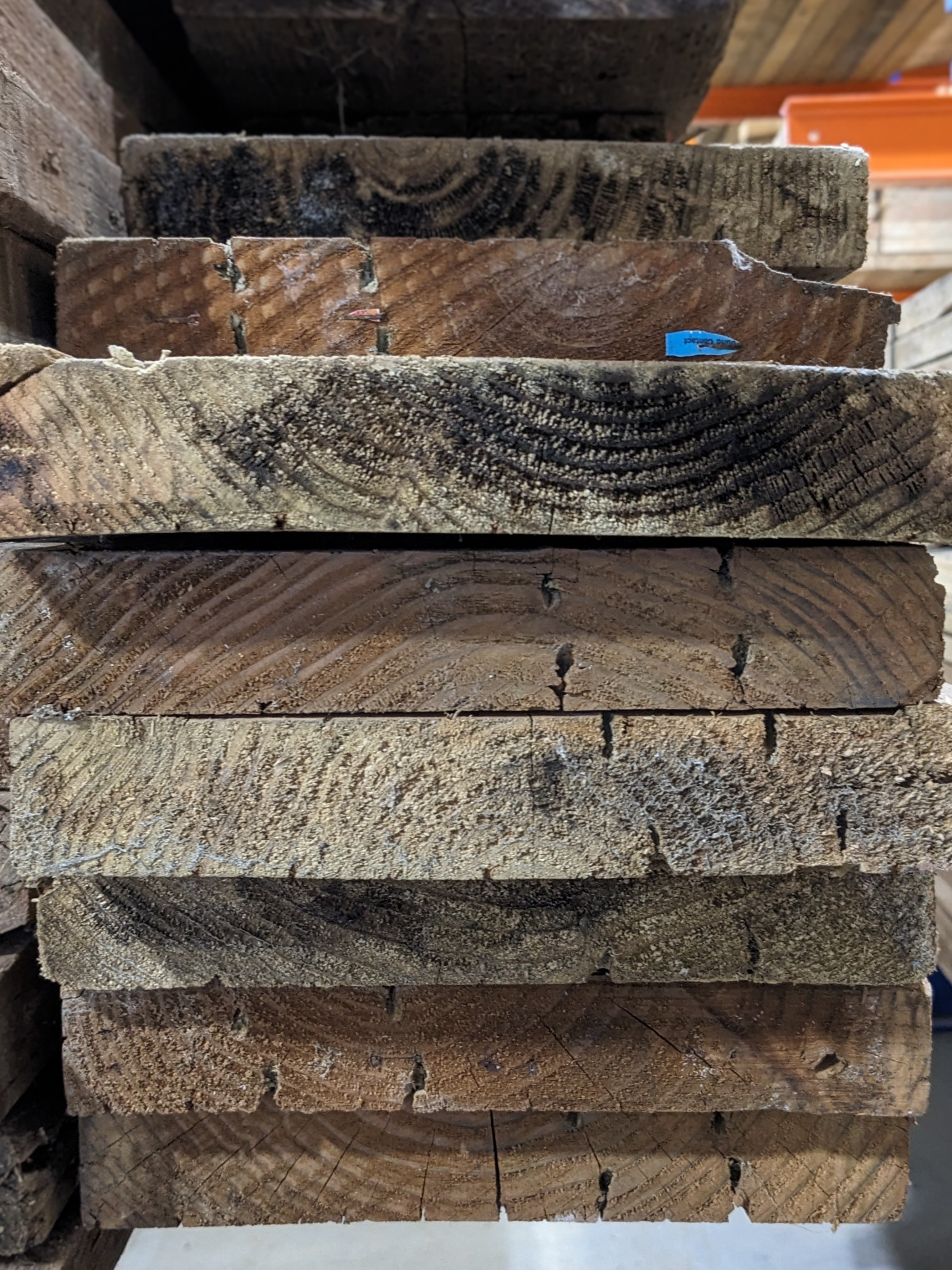 These sturdy pressure treated boards are perfect for your next outdoor project. Pictures are representational. The sides may be chipped. The ends also contain slight cracking. Pieces may contain small pieces of metal. They also might be warped/twisted to various degrees.