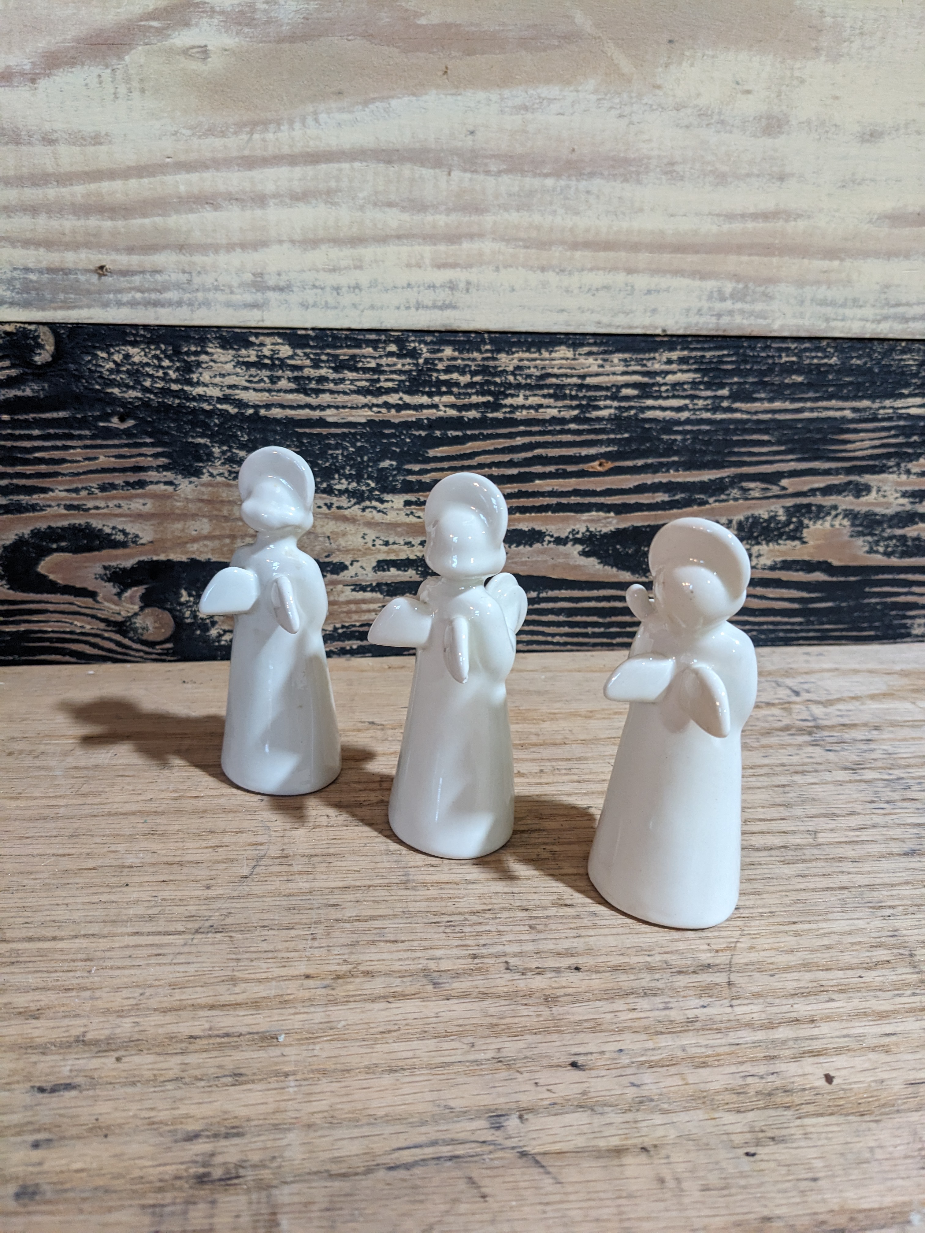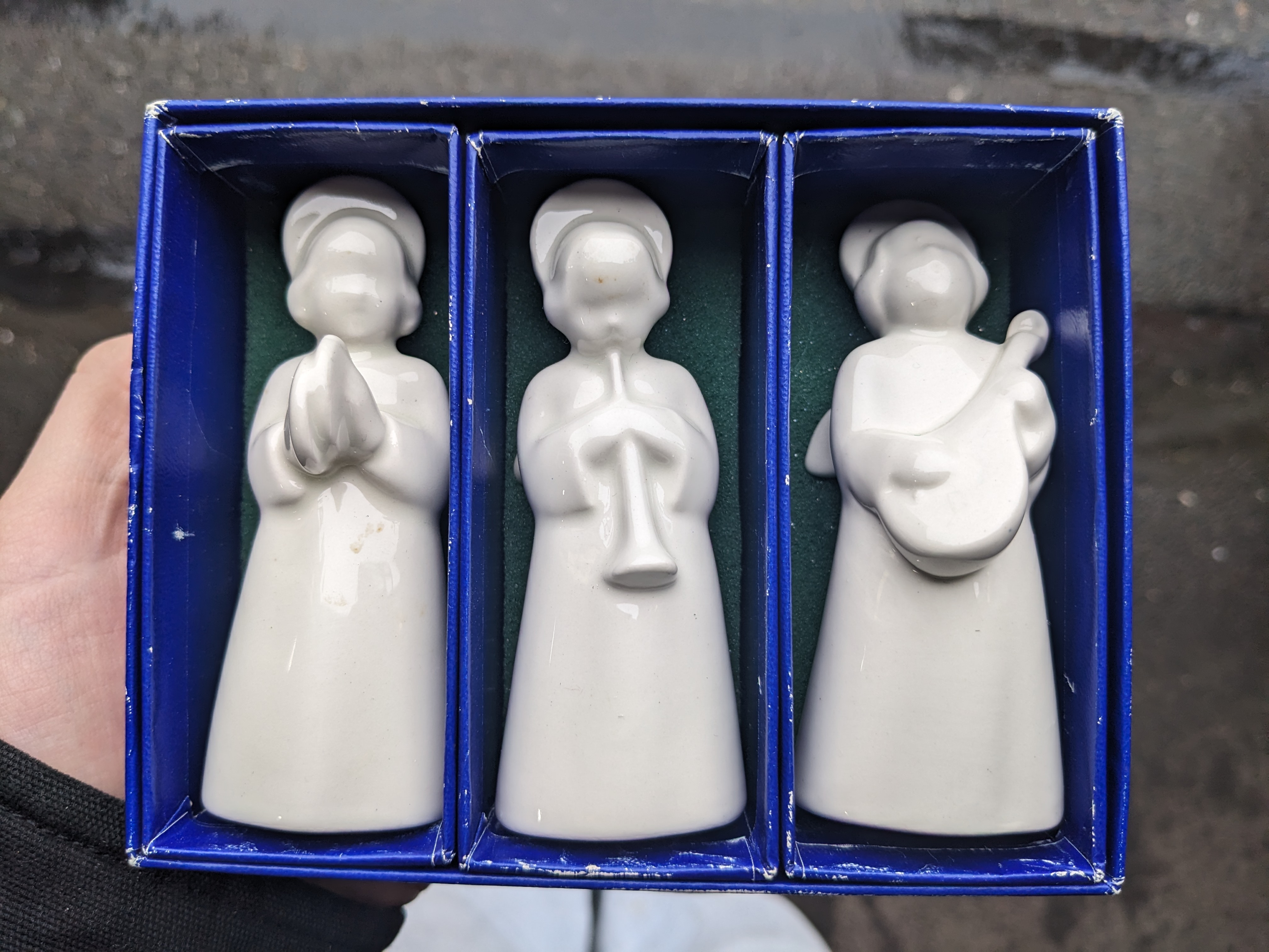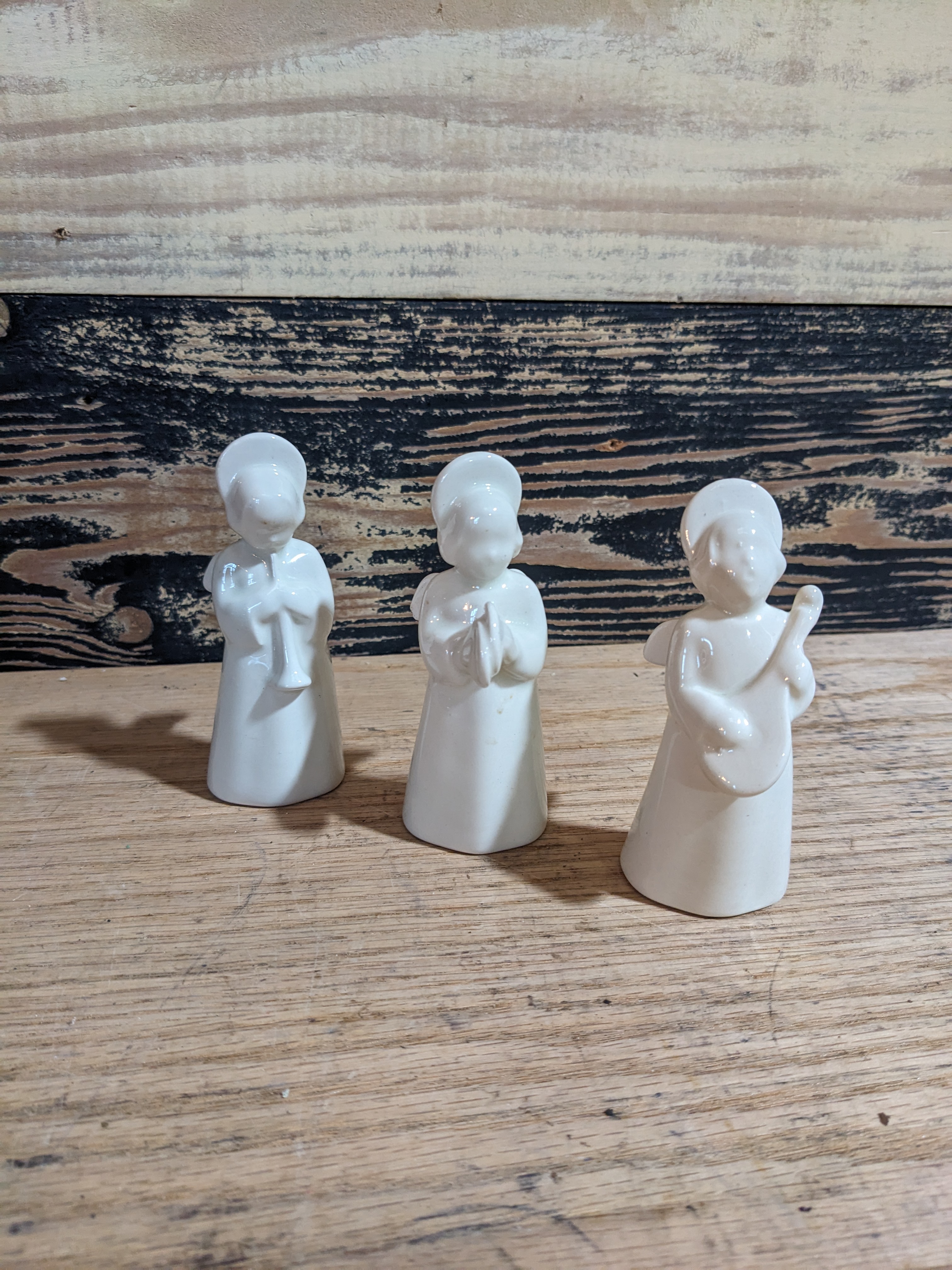 Set of three white porcelain angle figurines manufactured by Royal Copenhagen. Each figure is about 3.75 inches tall and 1.25 inches wide. Encased safely in their original blue box.