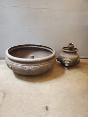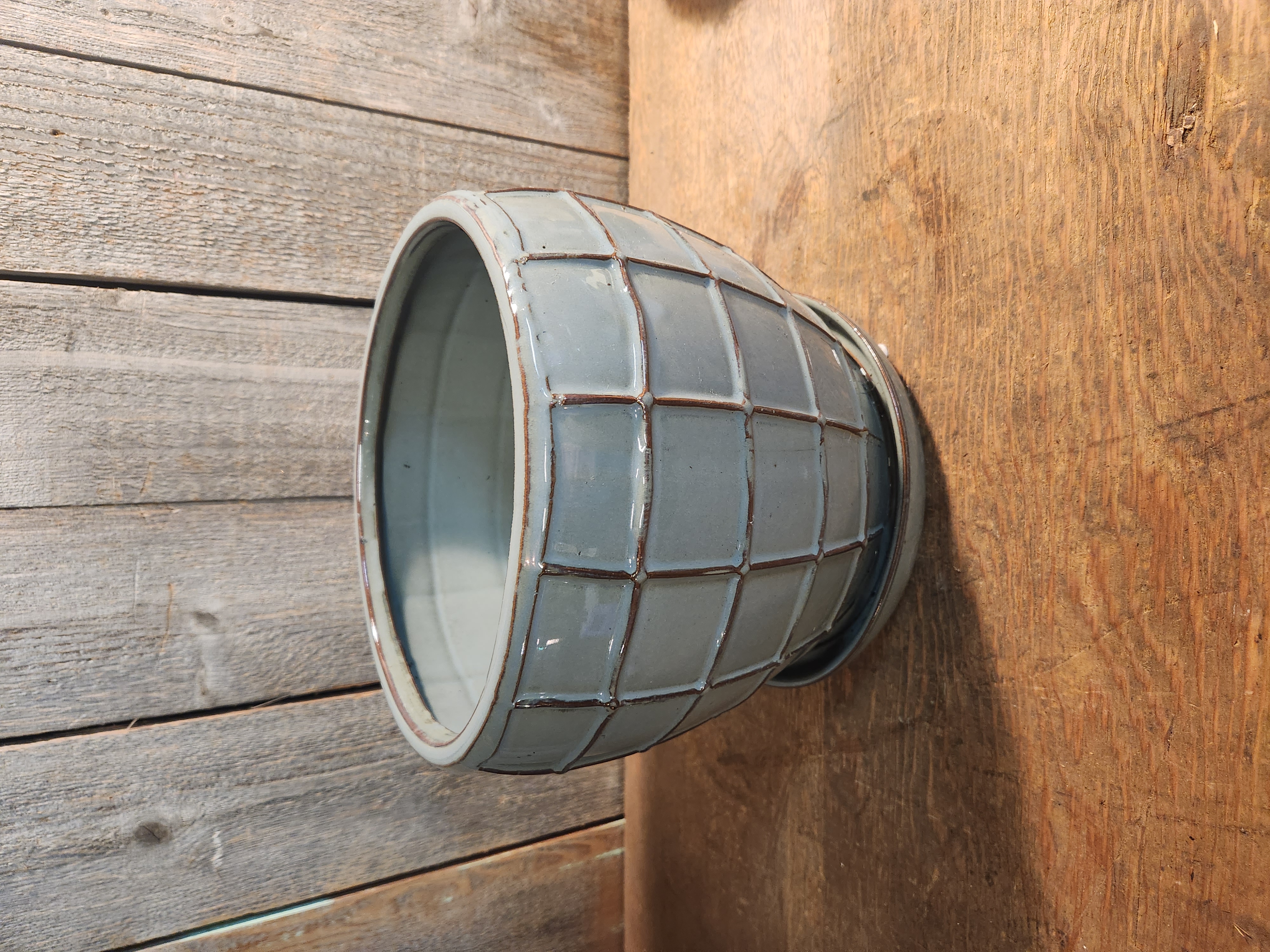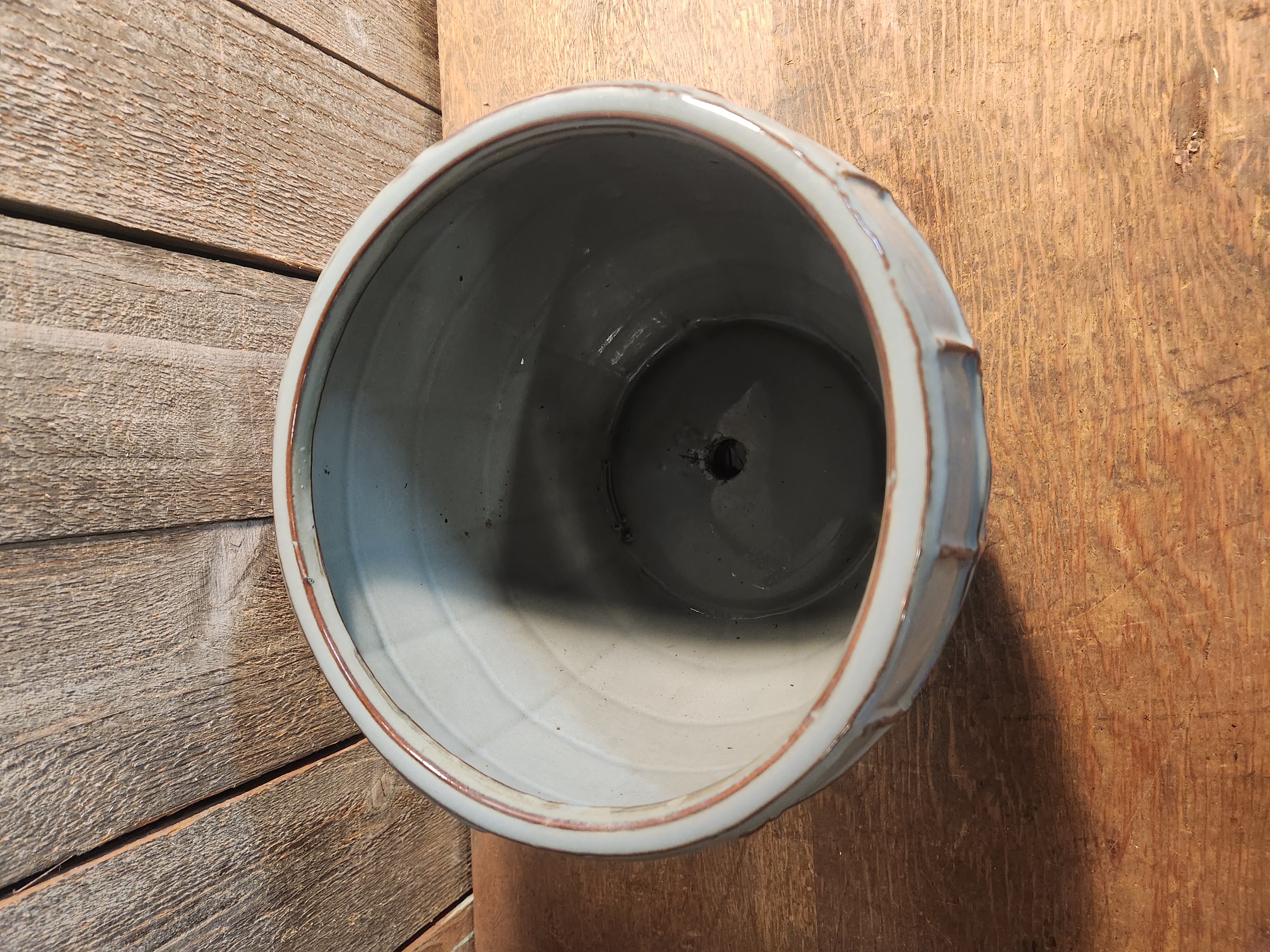 A light blue grey pot with a built in drip tray. Great for indoor plants. In good condition with no chips or cracks. It measures 10 x 8.5 inches.