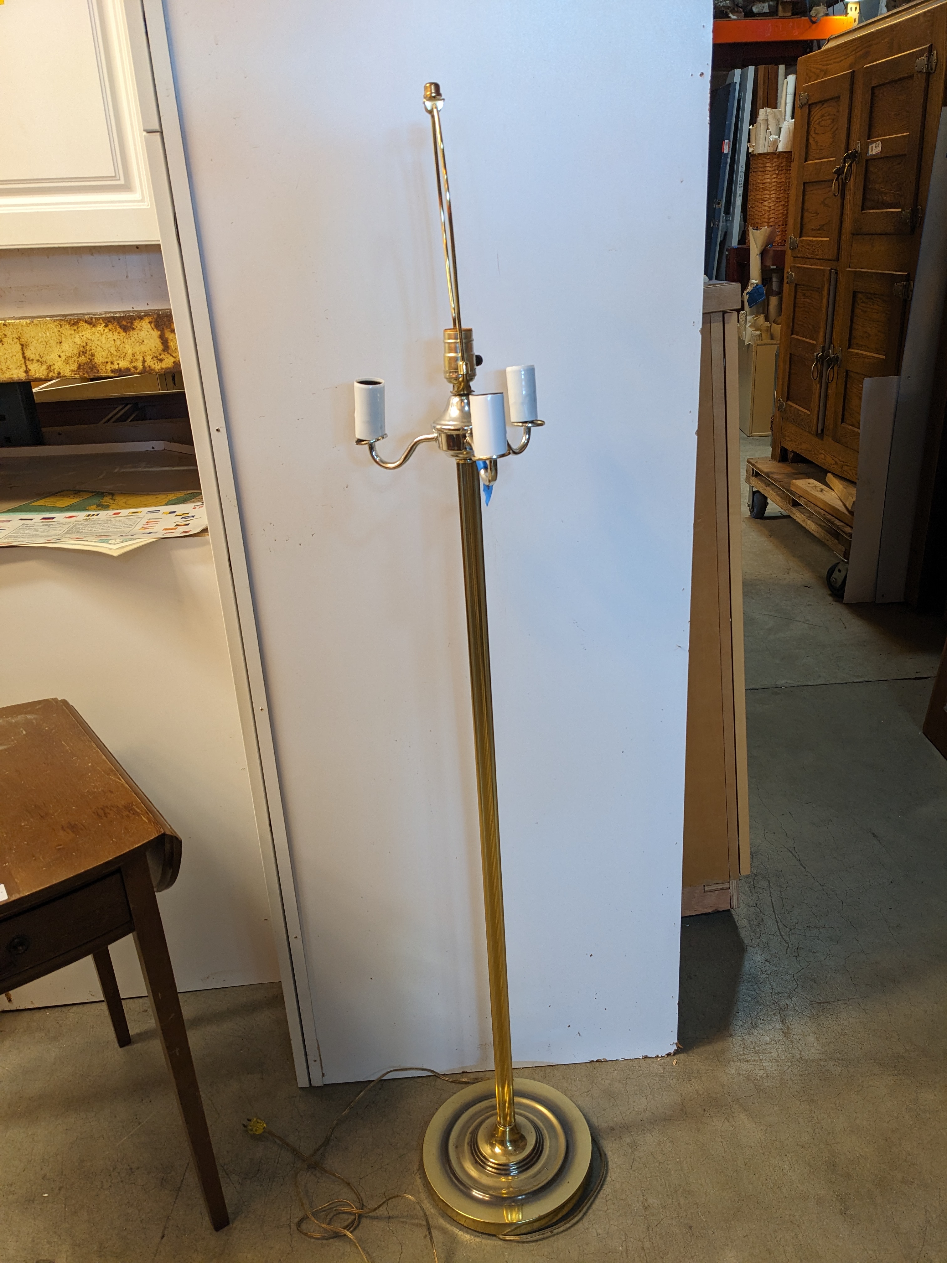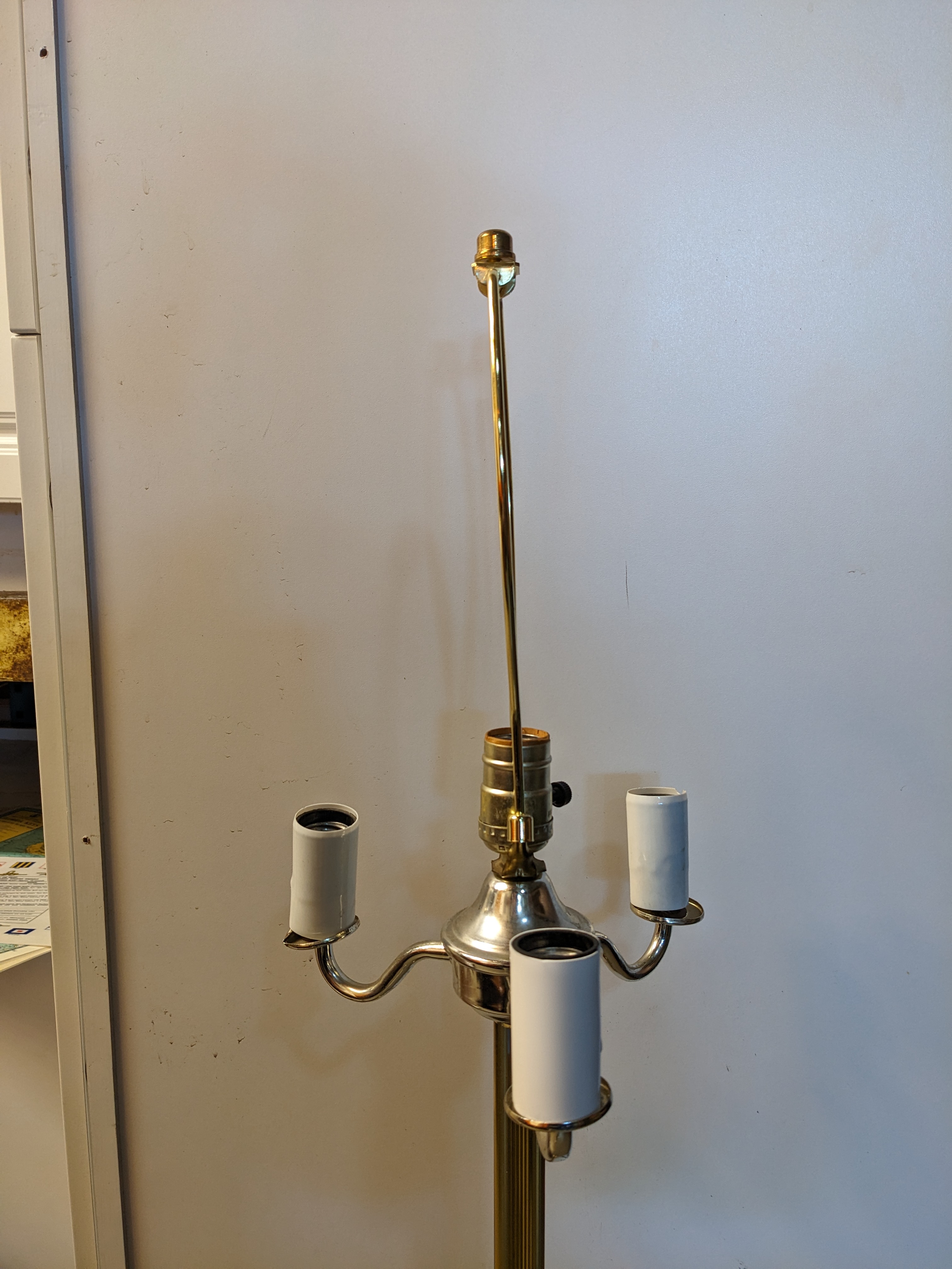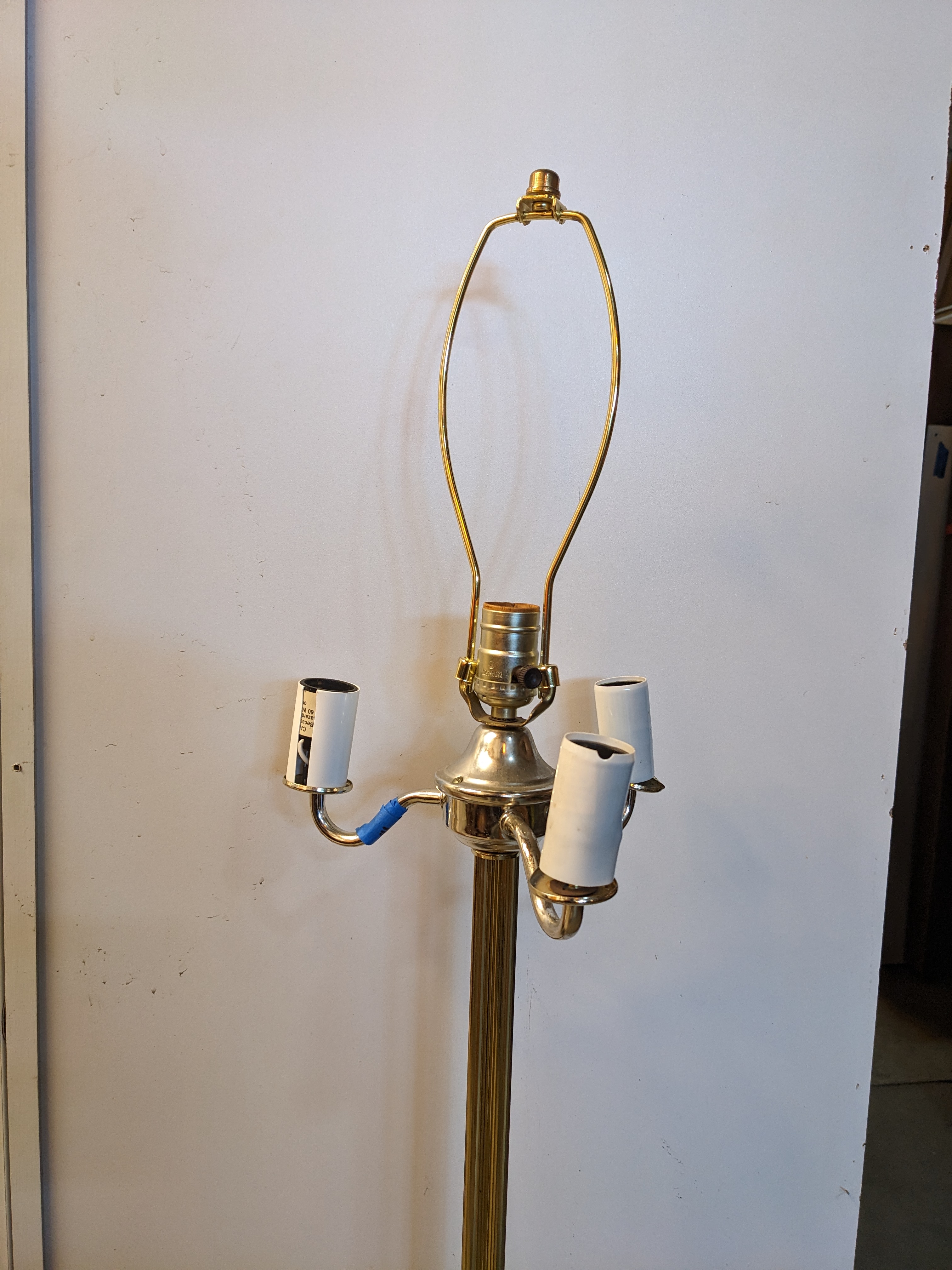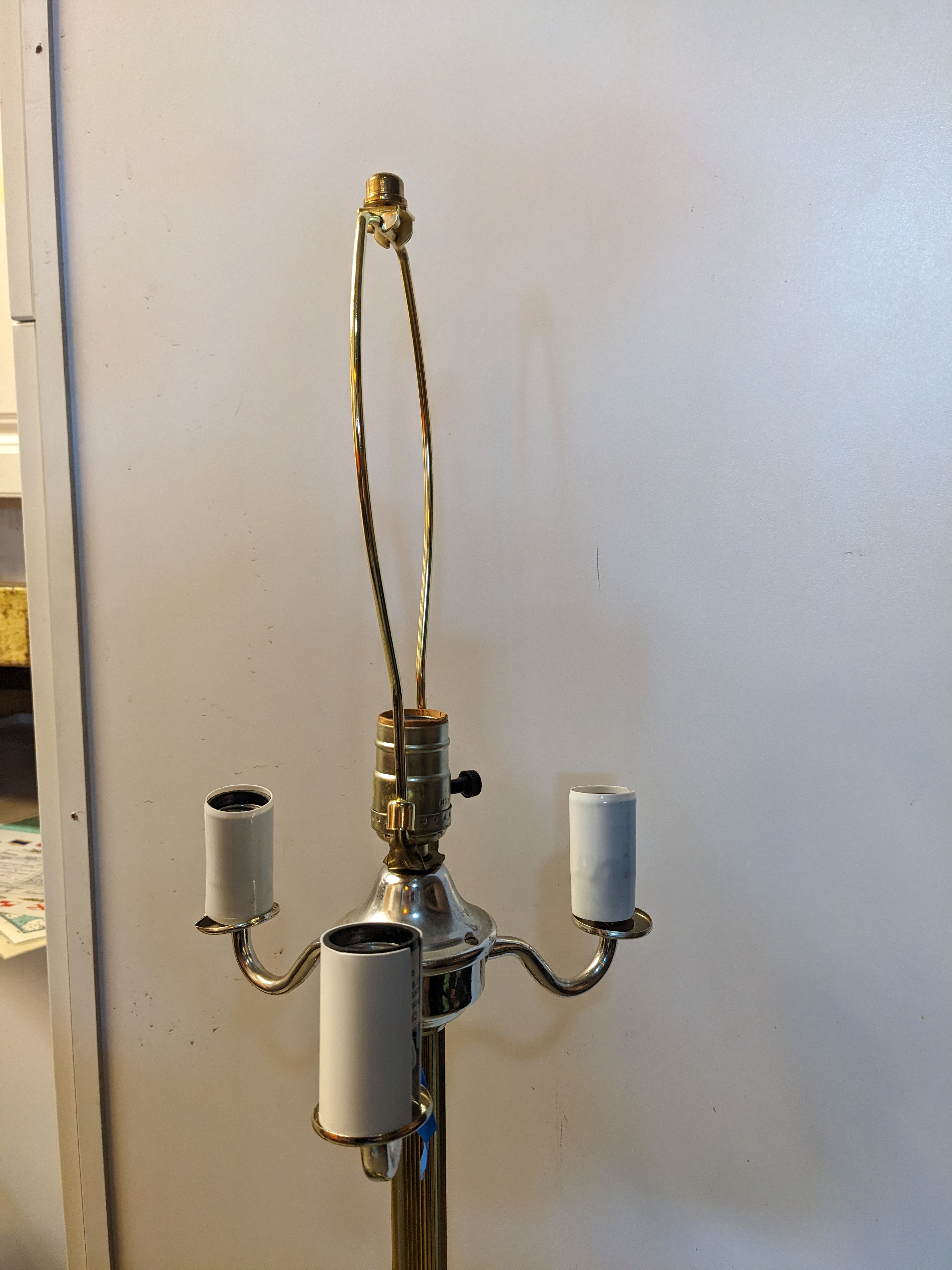 3 bare bulb candles on the outer ring, with a single bulb and harp for a shade of your choice in the center. Different control twists for the two sections of lights for 3 moods altogether!