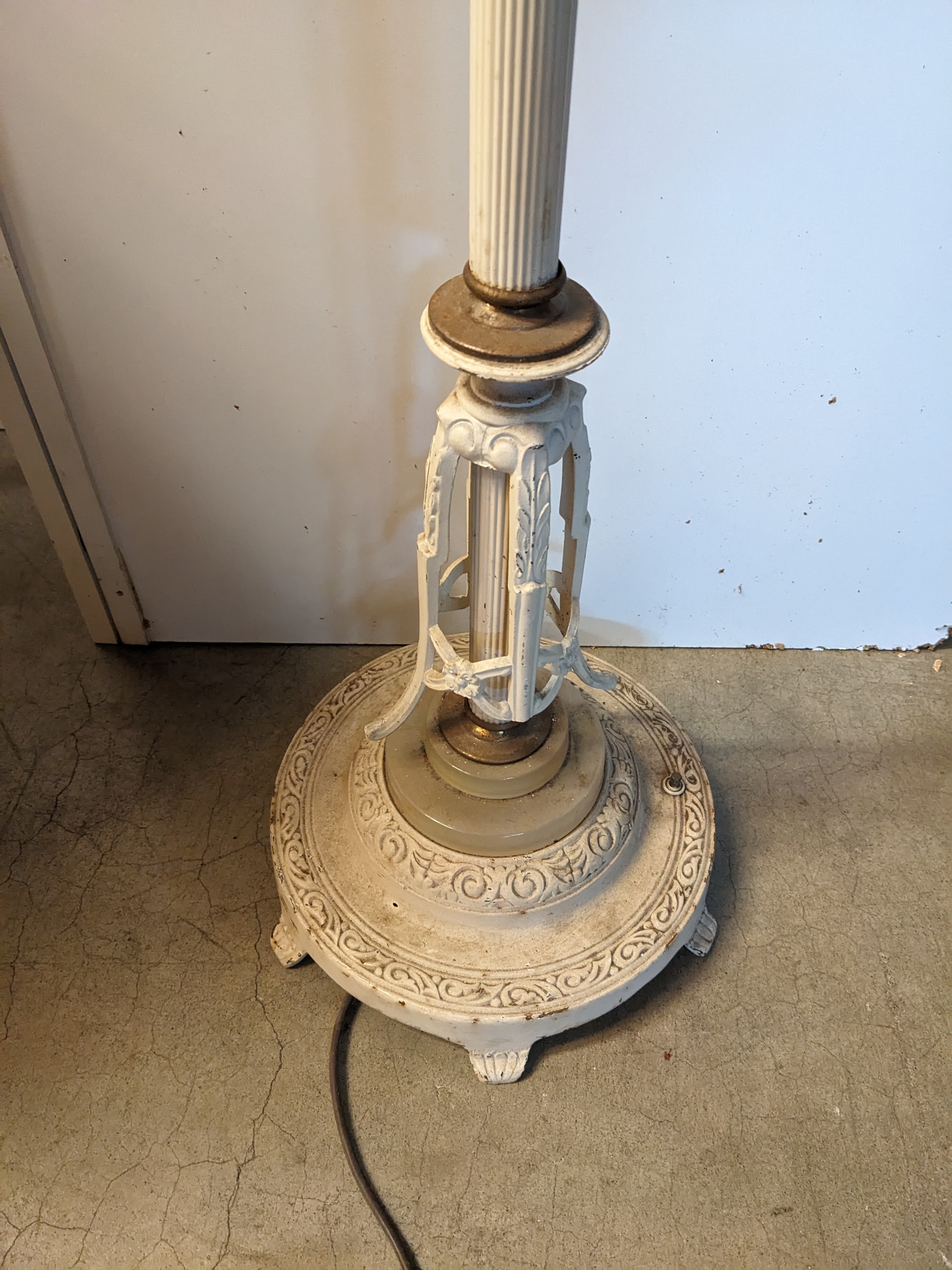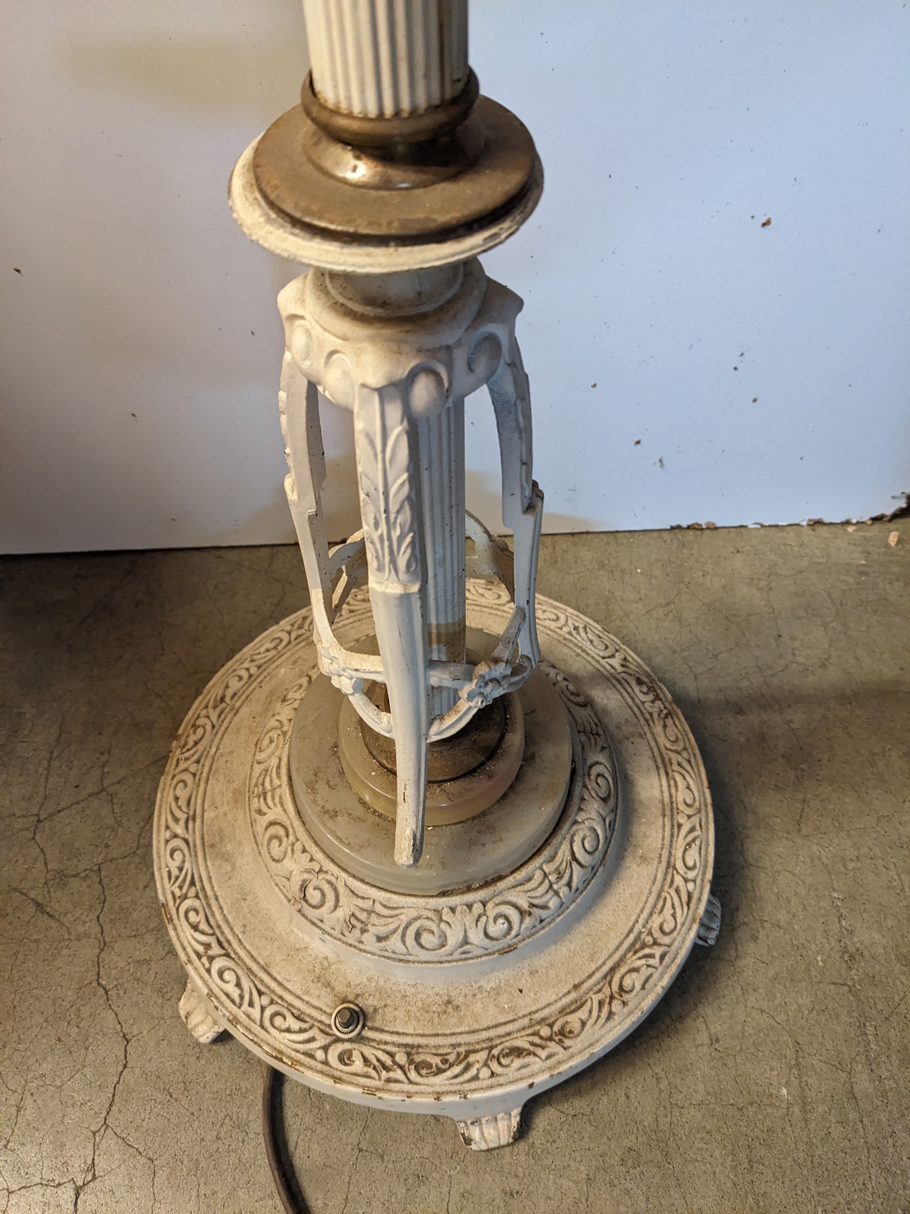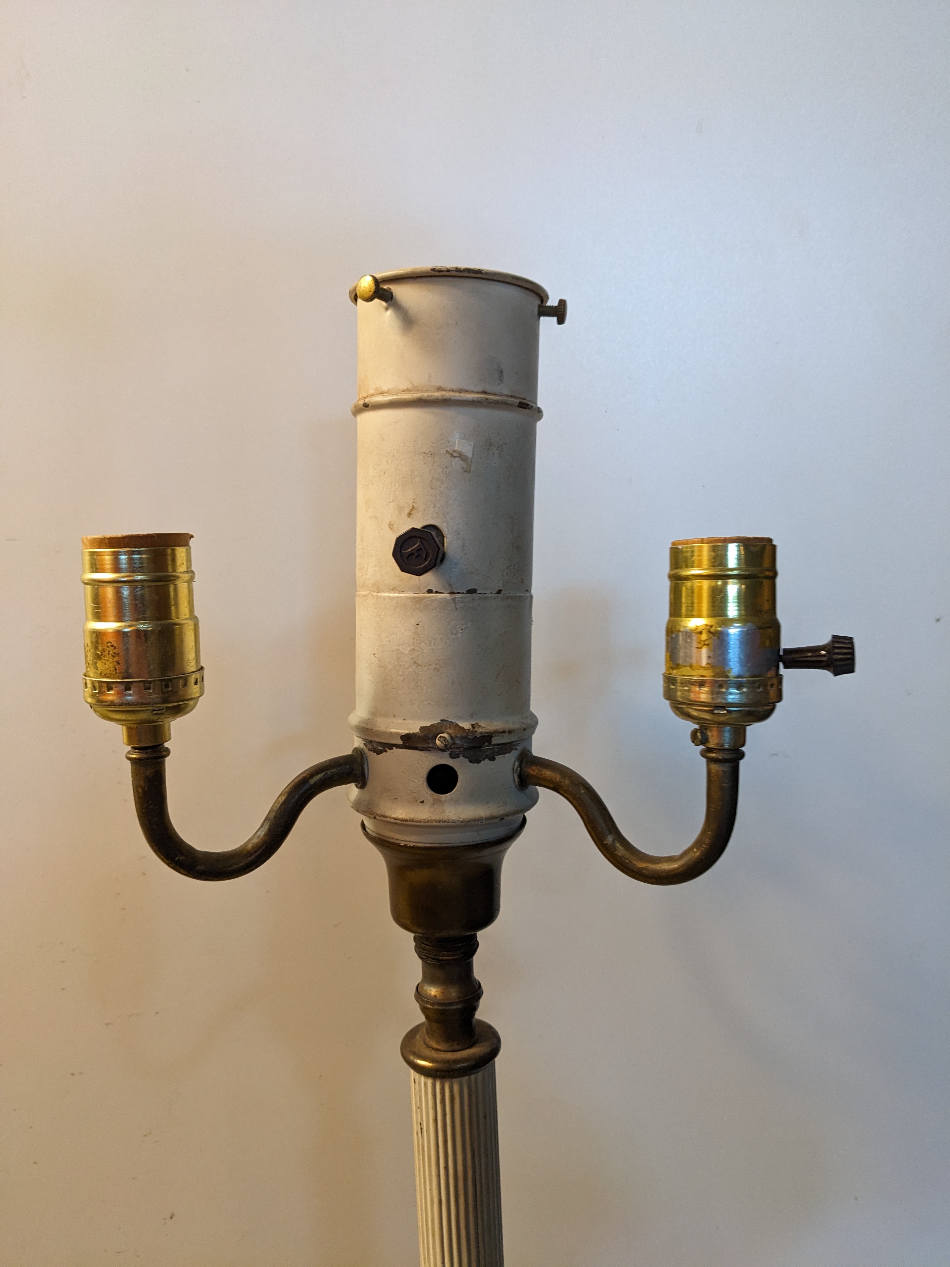 Just a sneeze of patina throughout the piece, particularly at the base. Lamp has white paint all around.