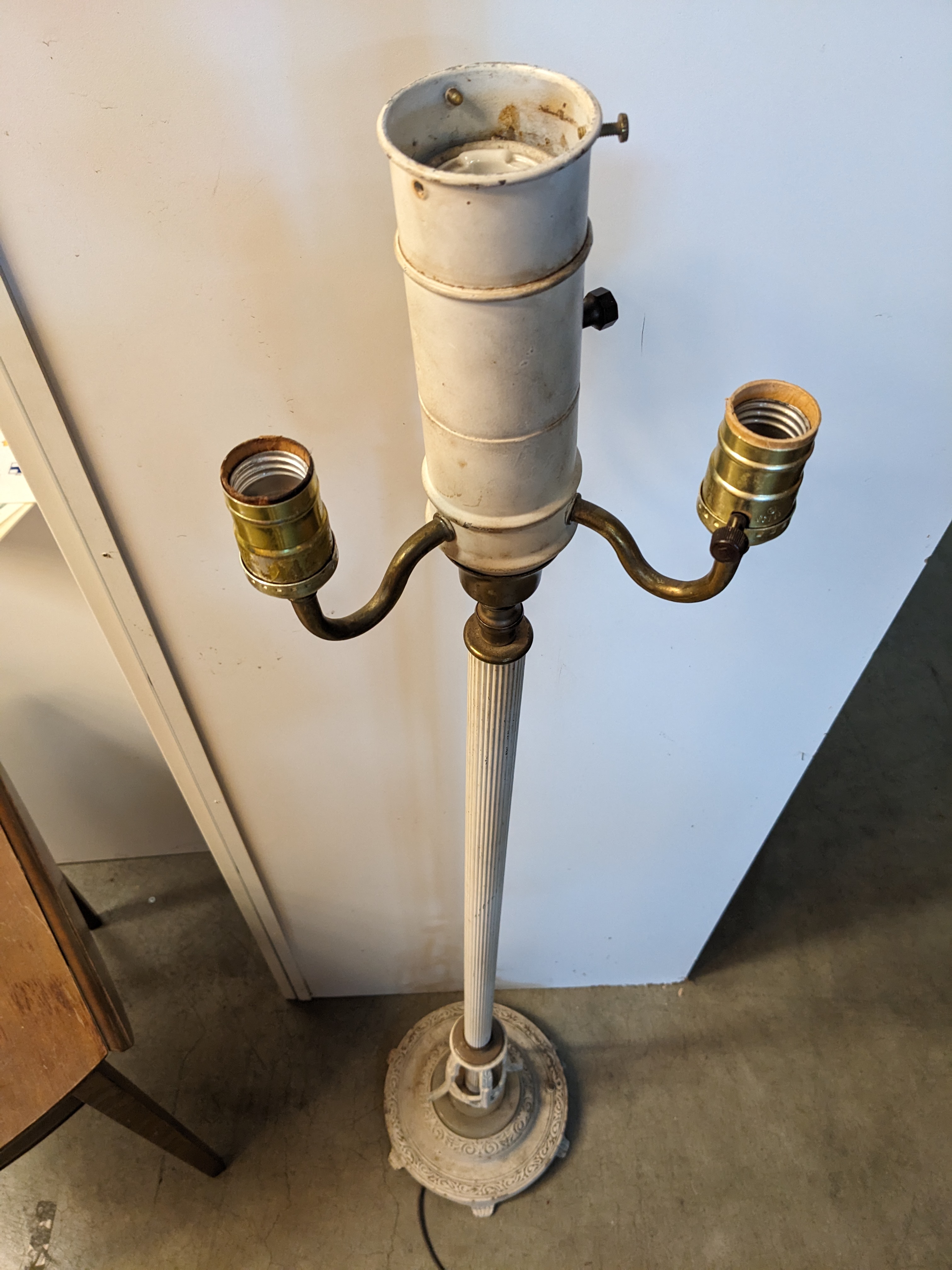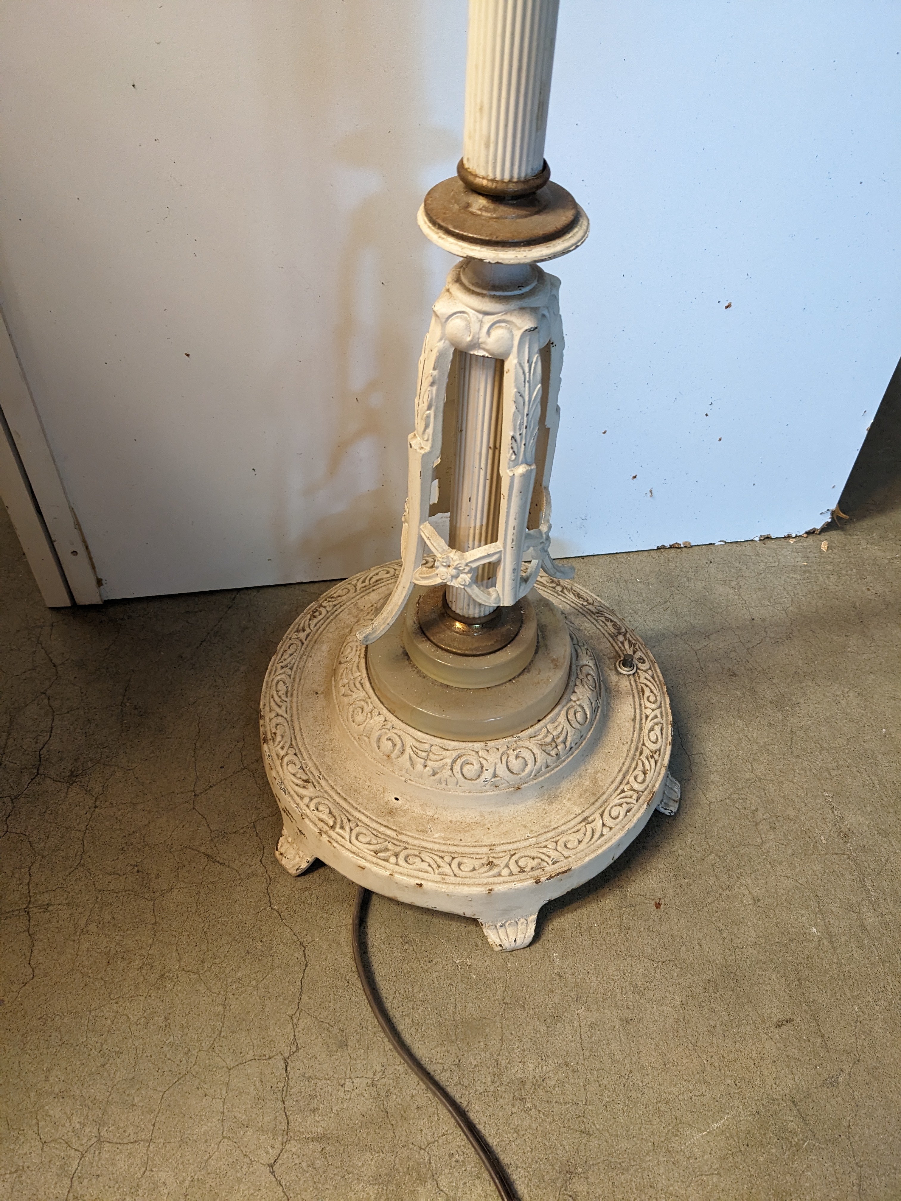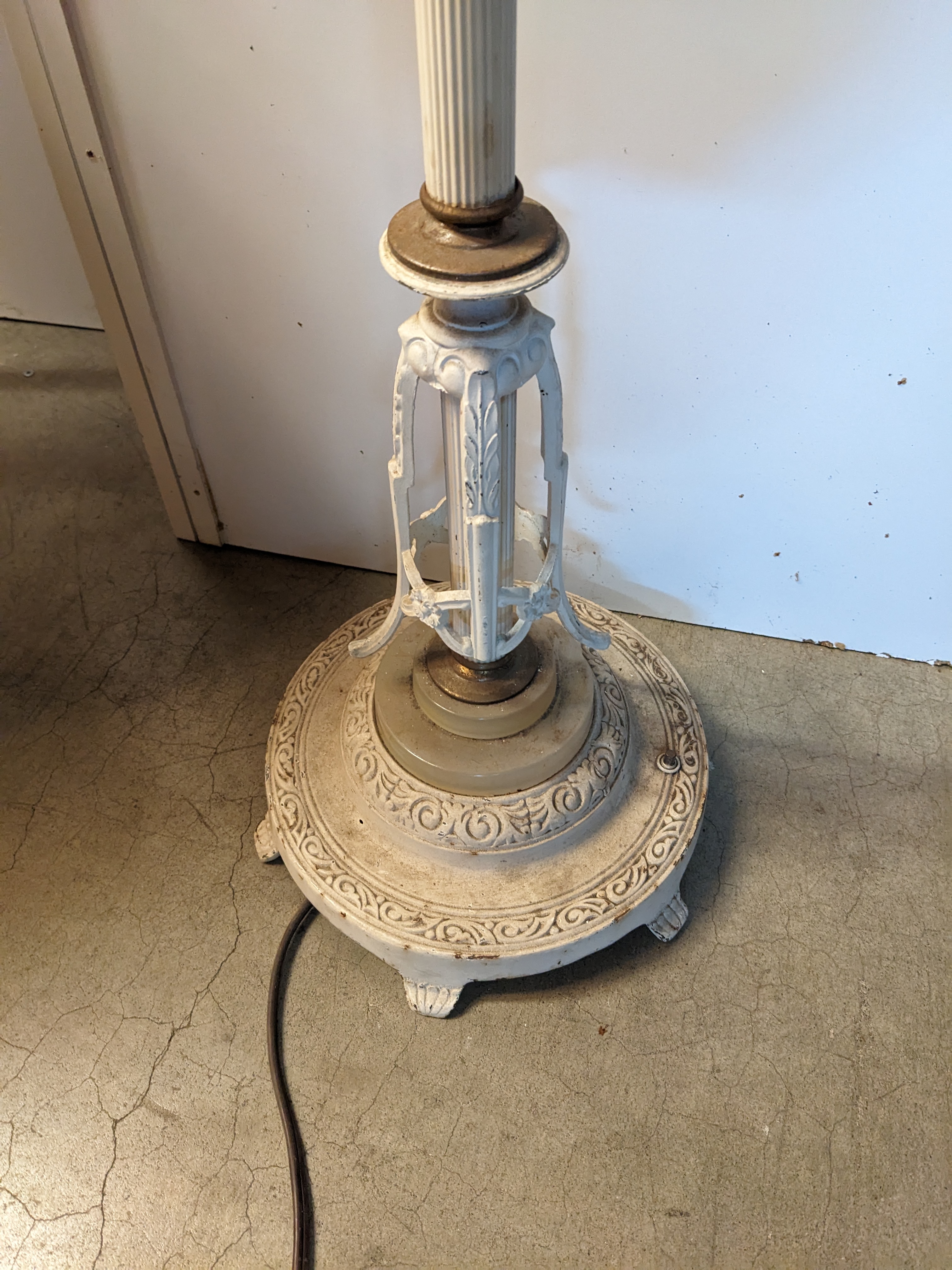 Just a sneeze of patina throughout the piece, particularly at the base. Lamp has white paint all around.