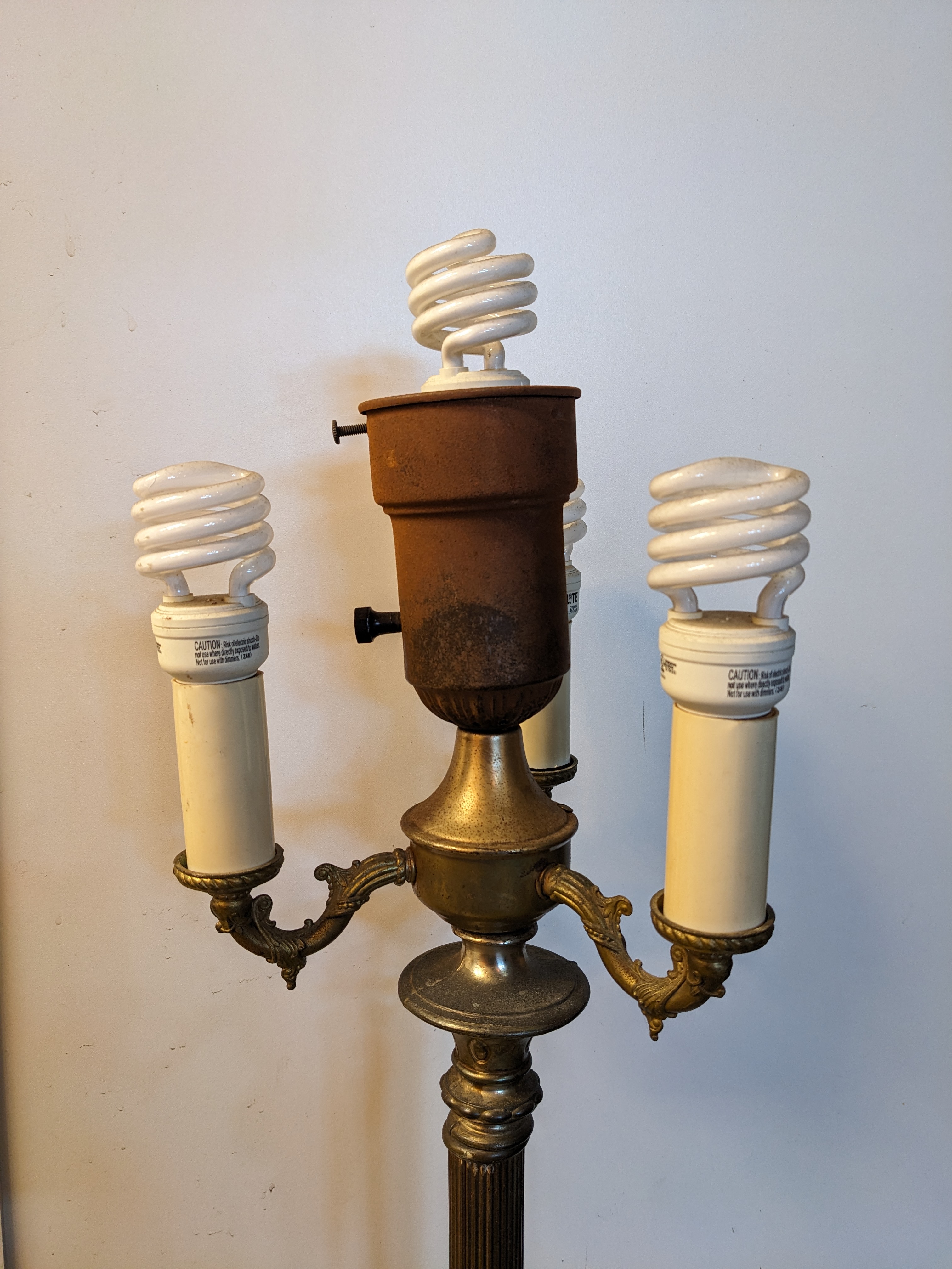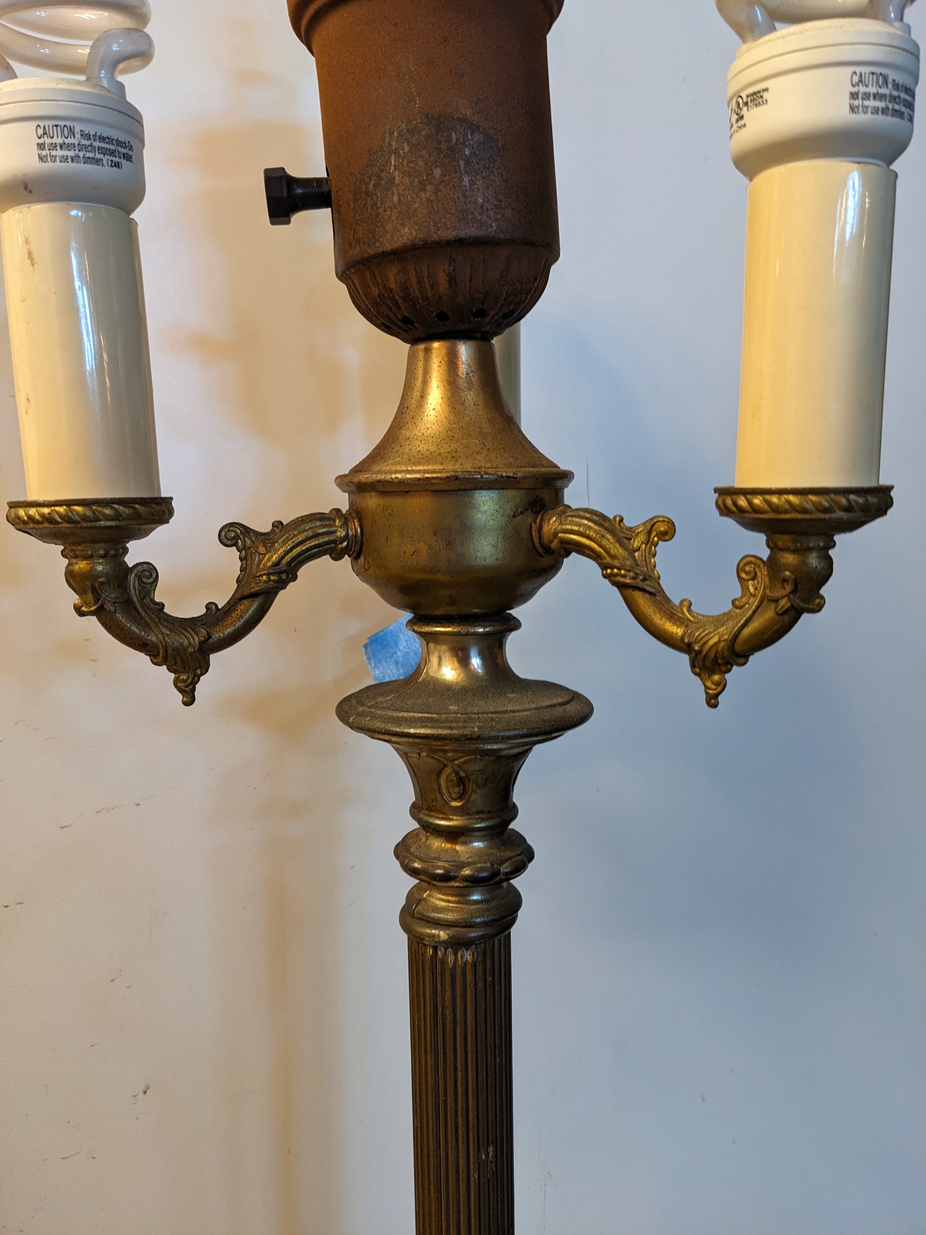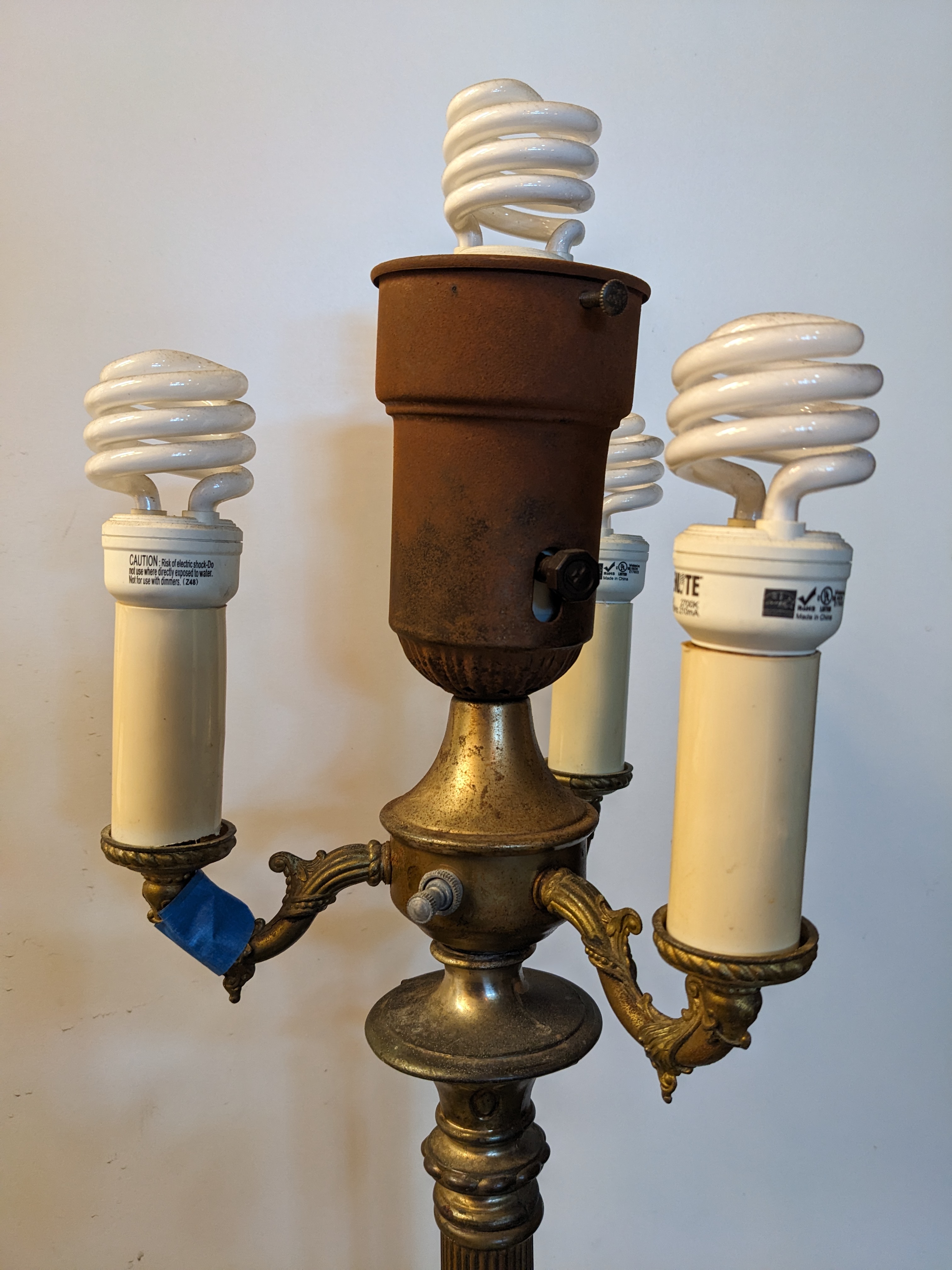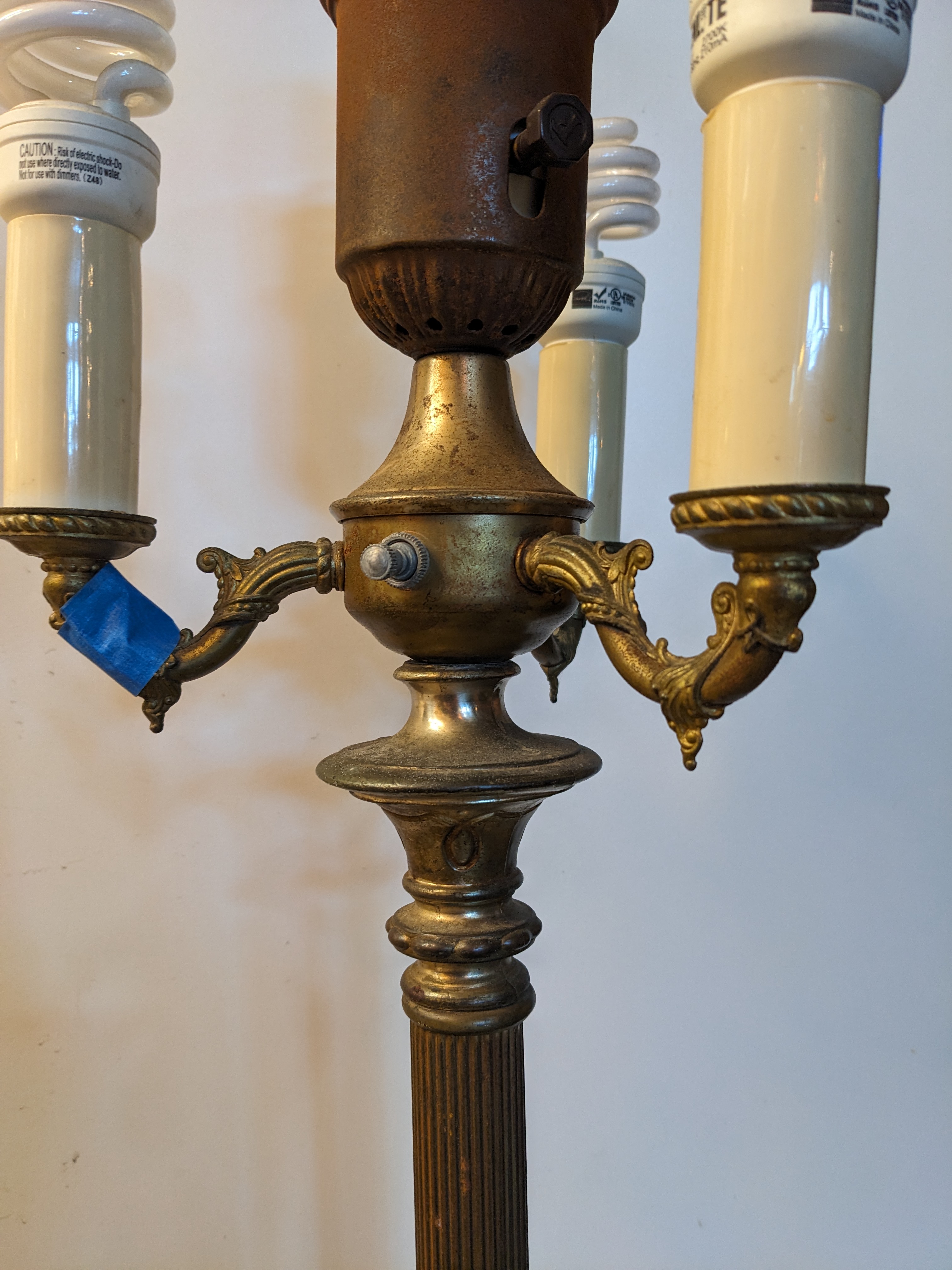 Brass has some patina throughout the piece, particularly heavy at the base and fitter.