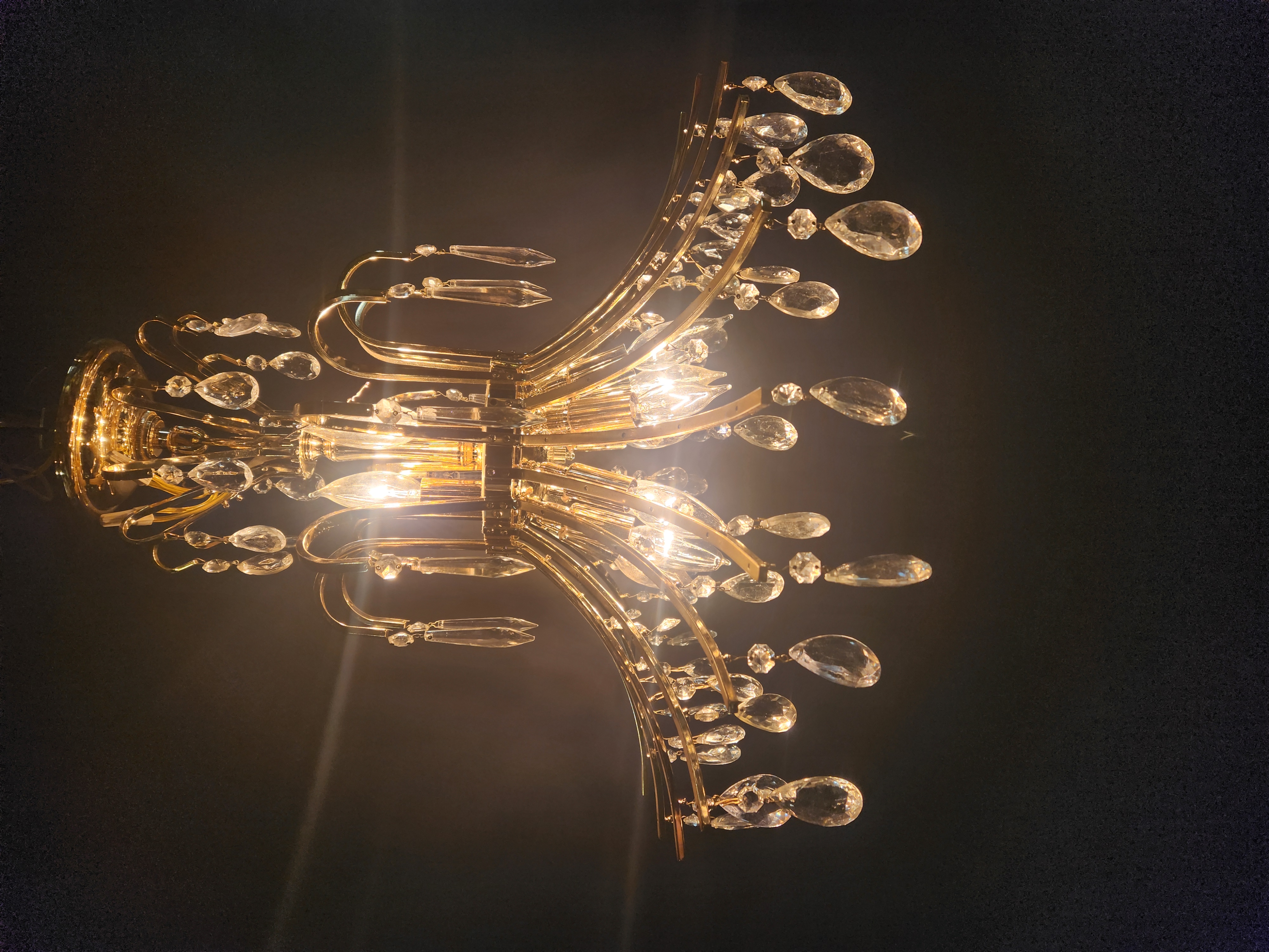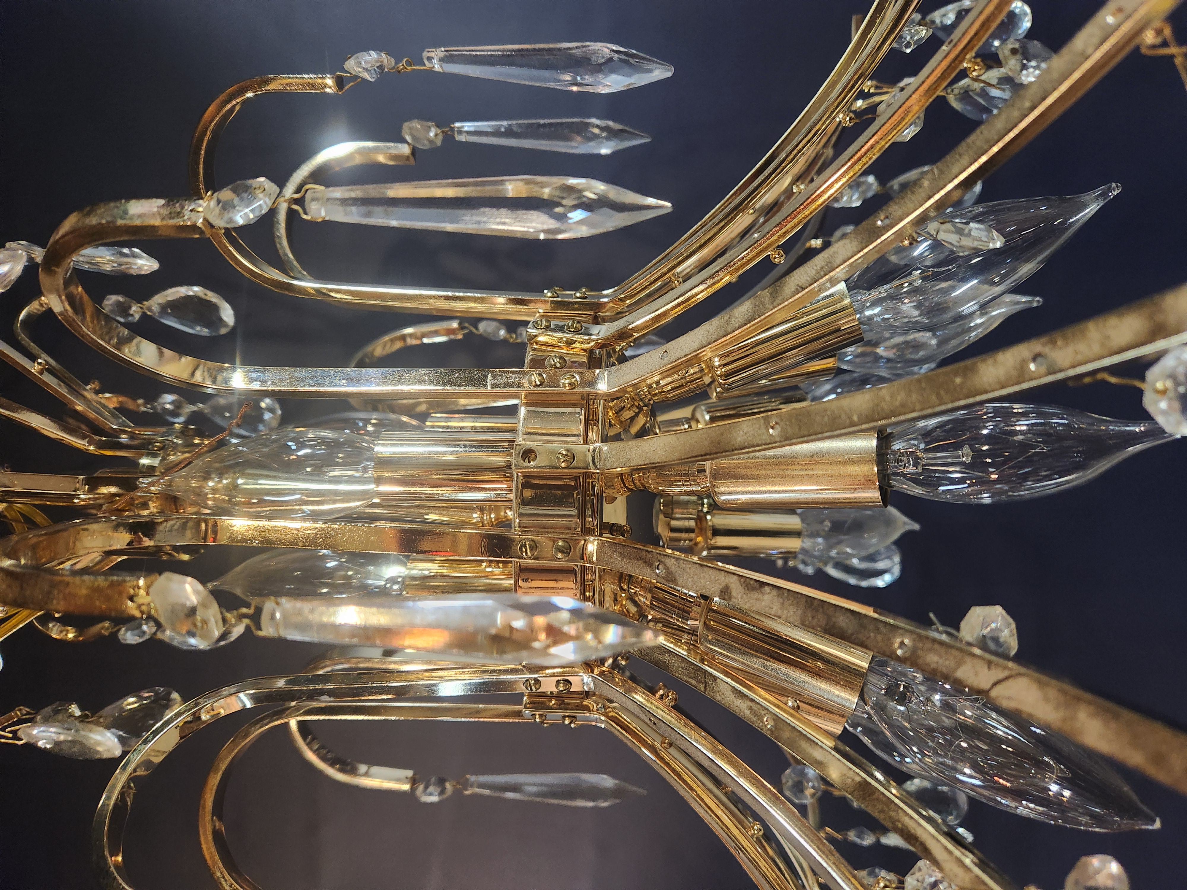 Contemporary crystal chandelier with 11 bulbs. The crystals it has are not original and it is in fair condition. Lights up beautifully with a brassy finish. Measures 21.75 x 20.