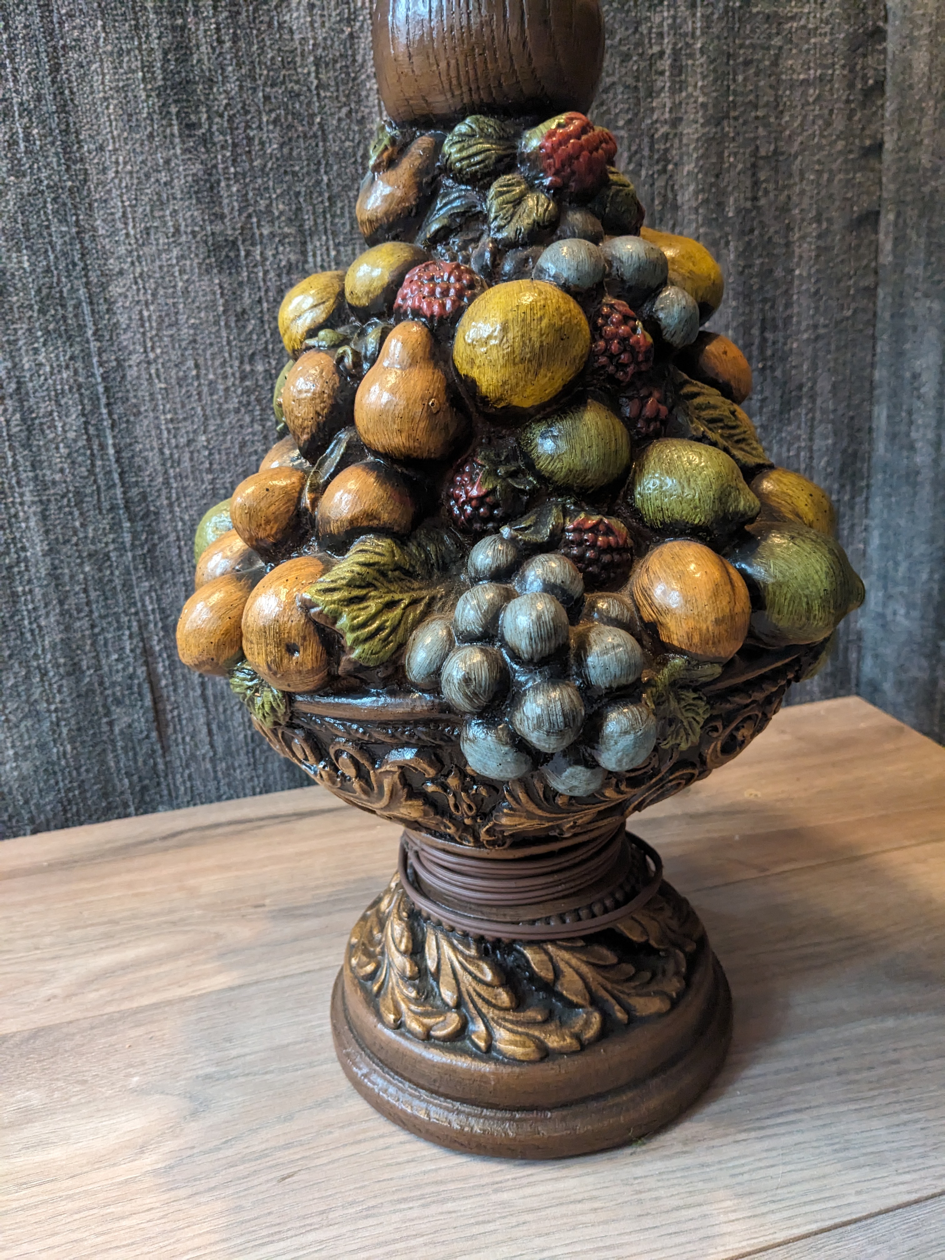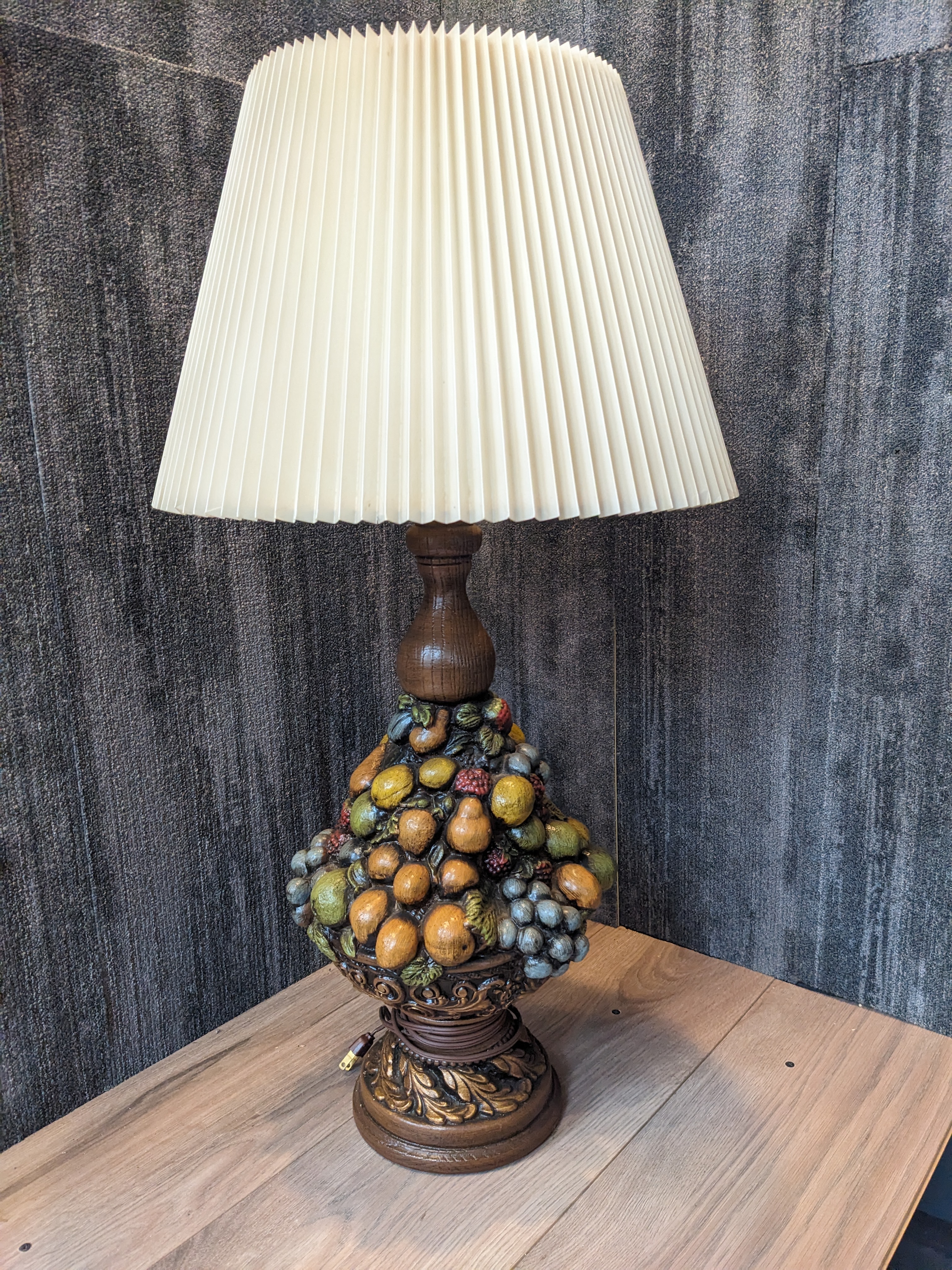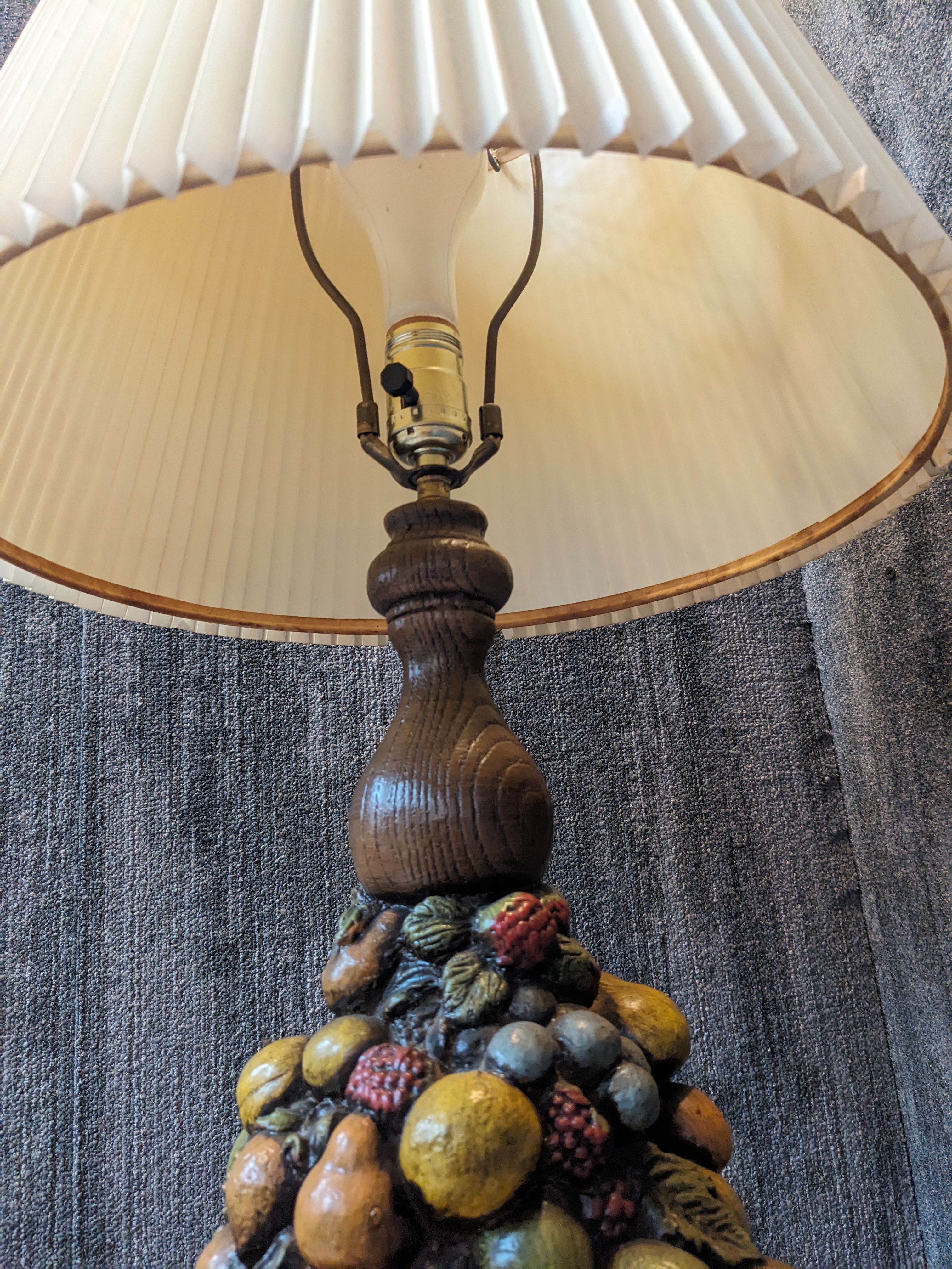 This table lamp is in great condition. It would be perfect for your kitchen counter. It is very intricate and even has a slight metallic finish.