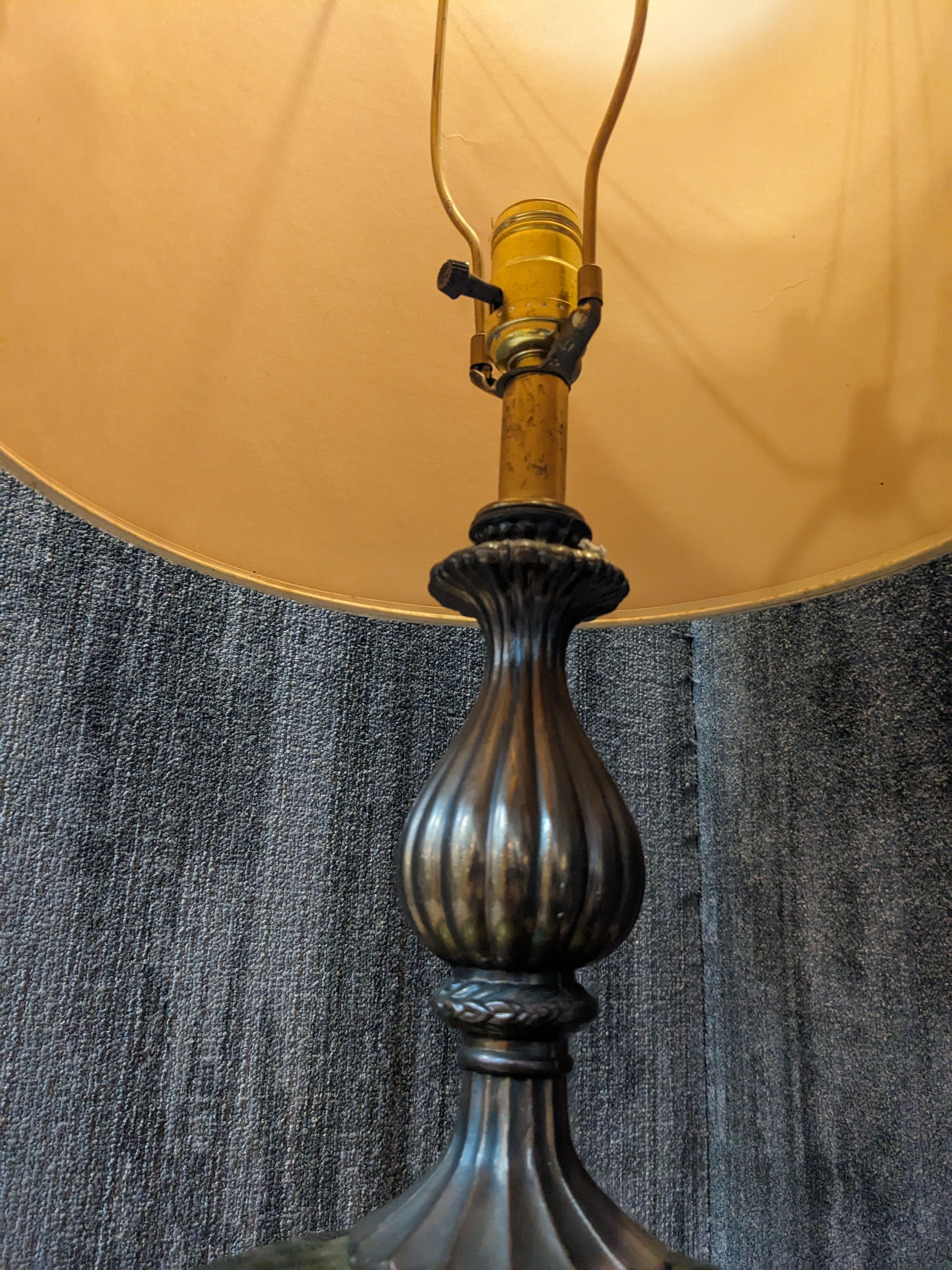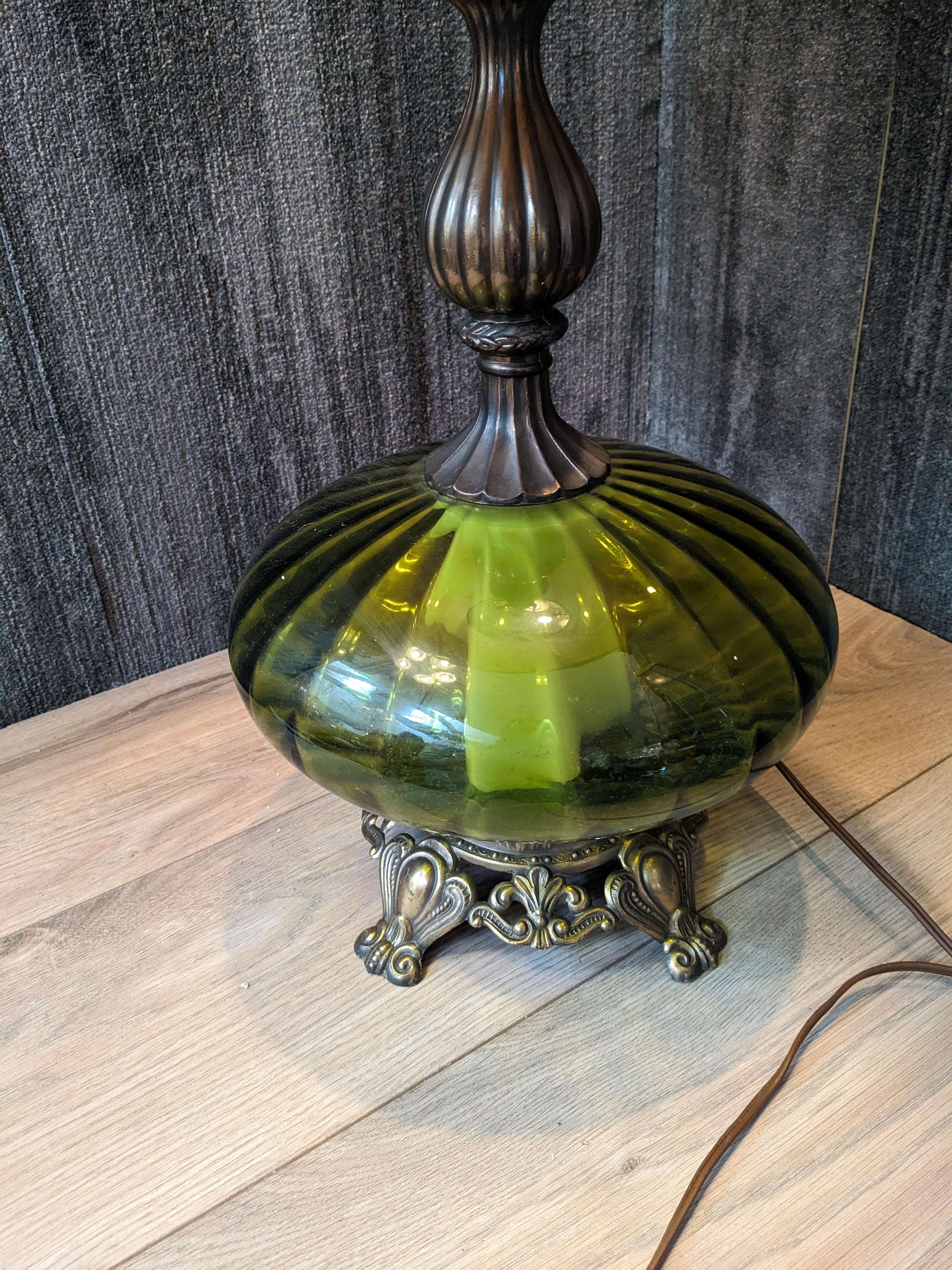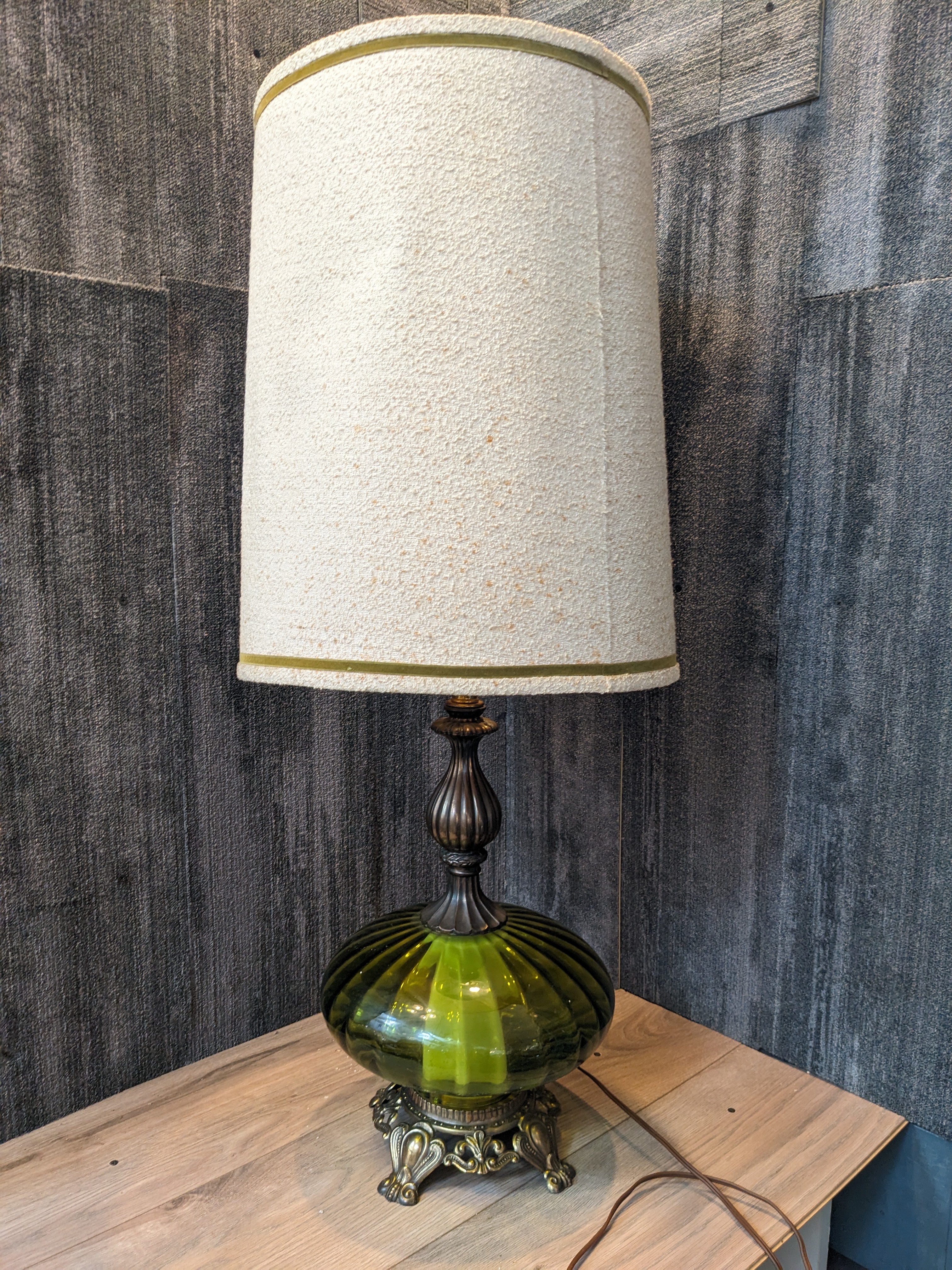 This lamp is in great condition and is just beautiful. The shade does have a small dent in it but gives it the hollywood regency style. This would look fantastic as a statement piece of lighting in any room.