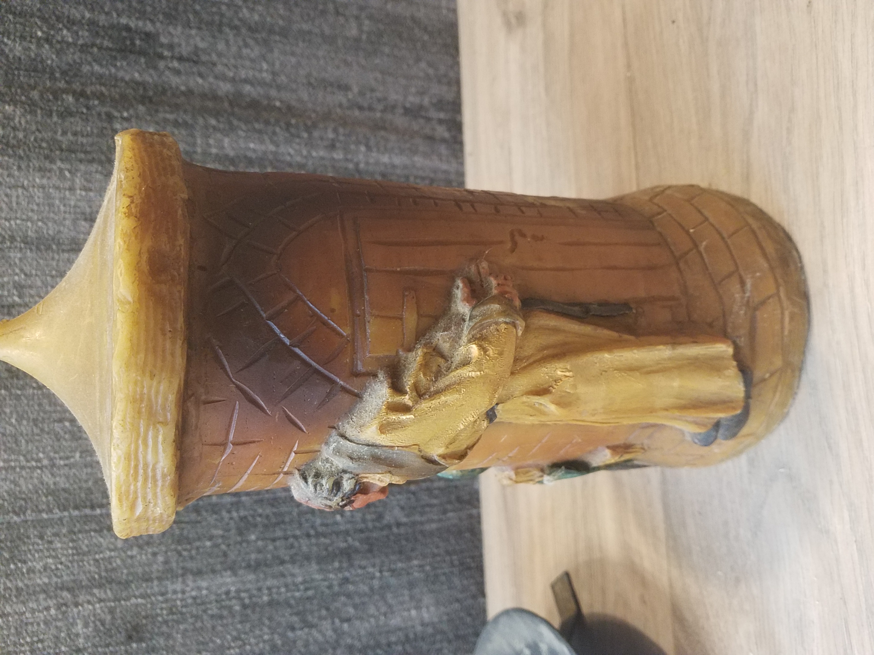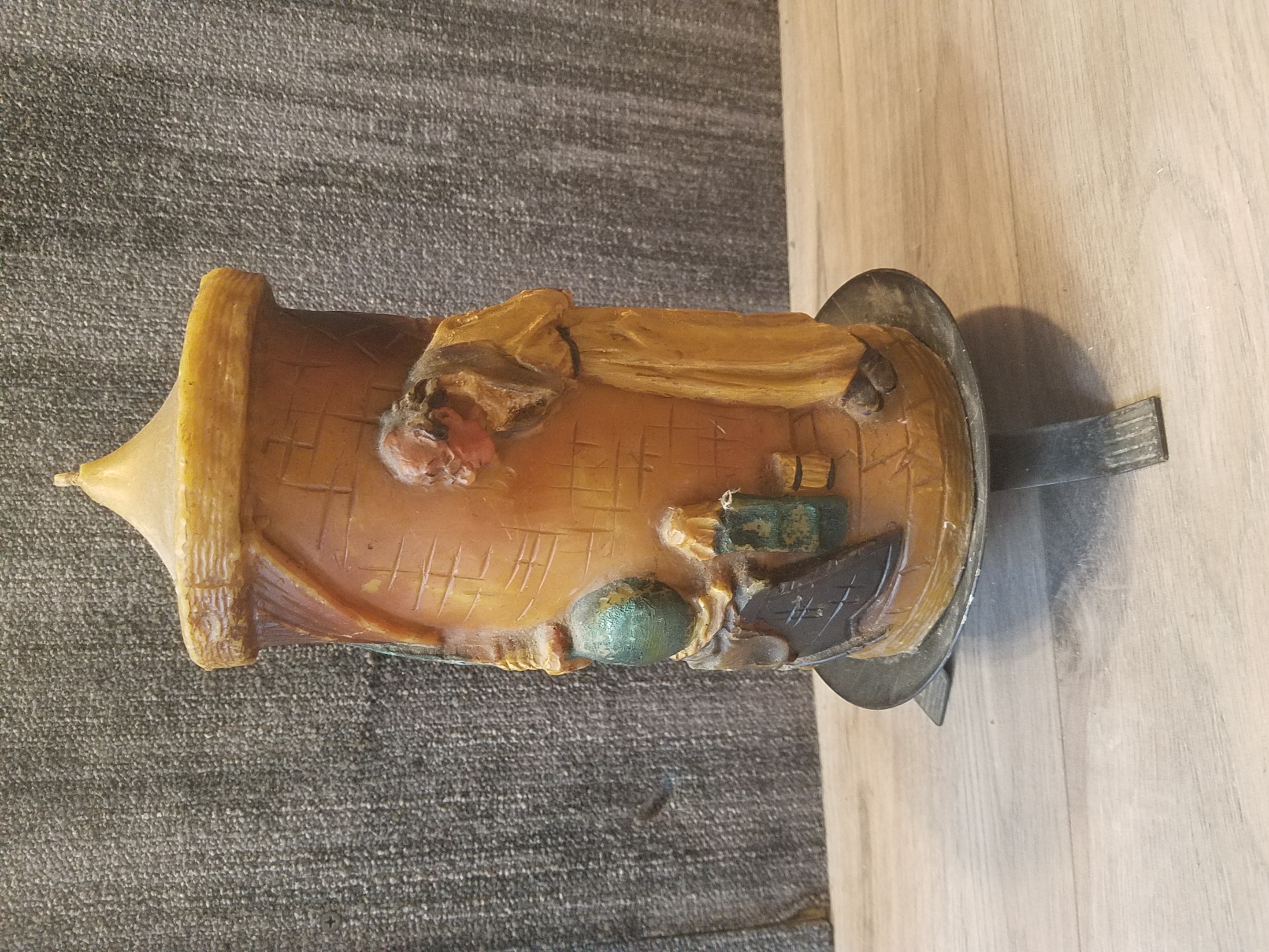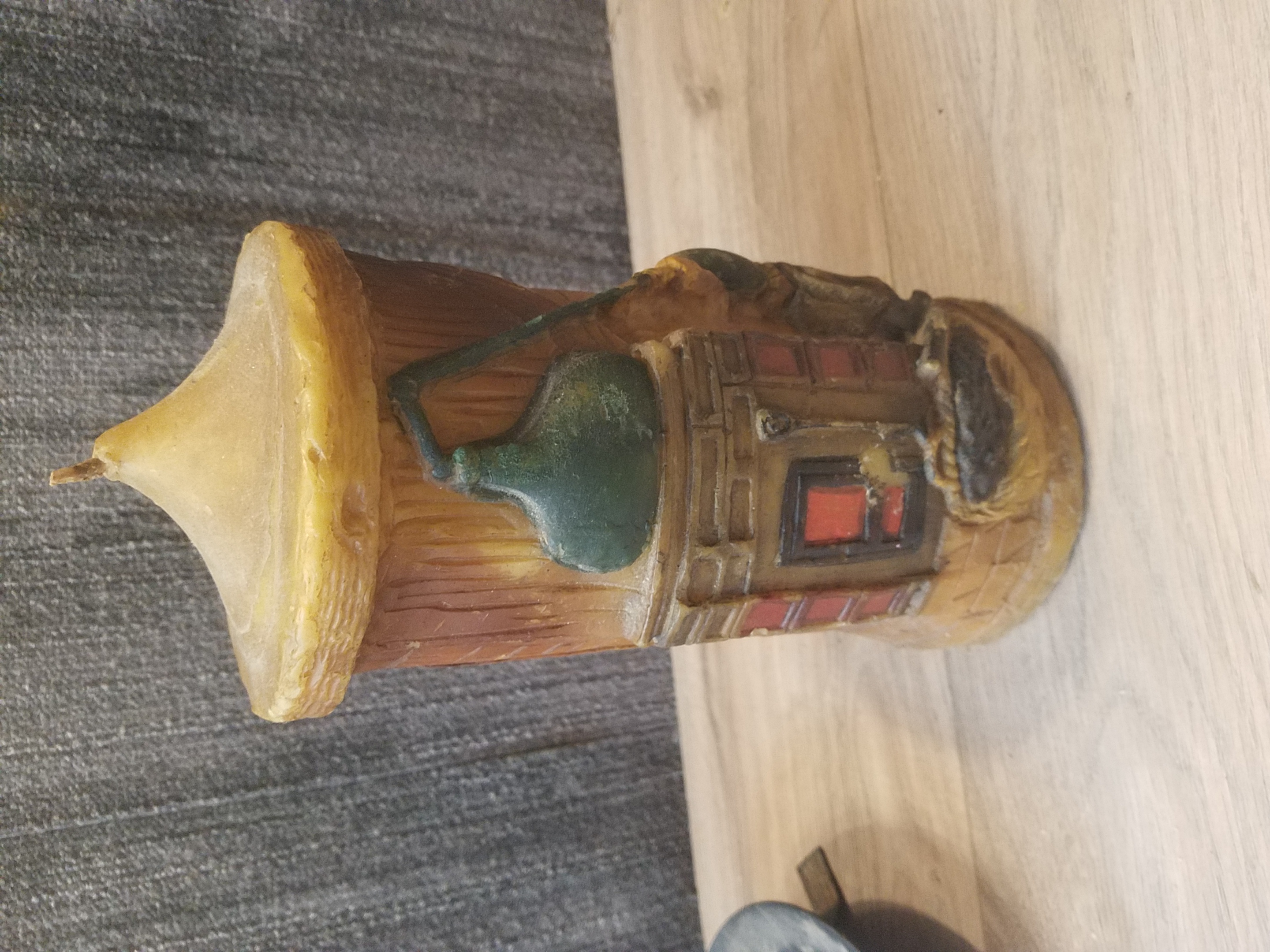 Handmade candle resembling famous painting by Carl Spitzweg "Der Alchemist", which depicts an elderly scholar observing the results of his latest experiments.