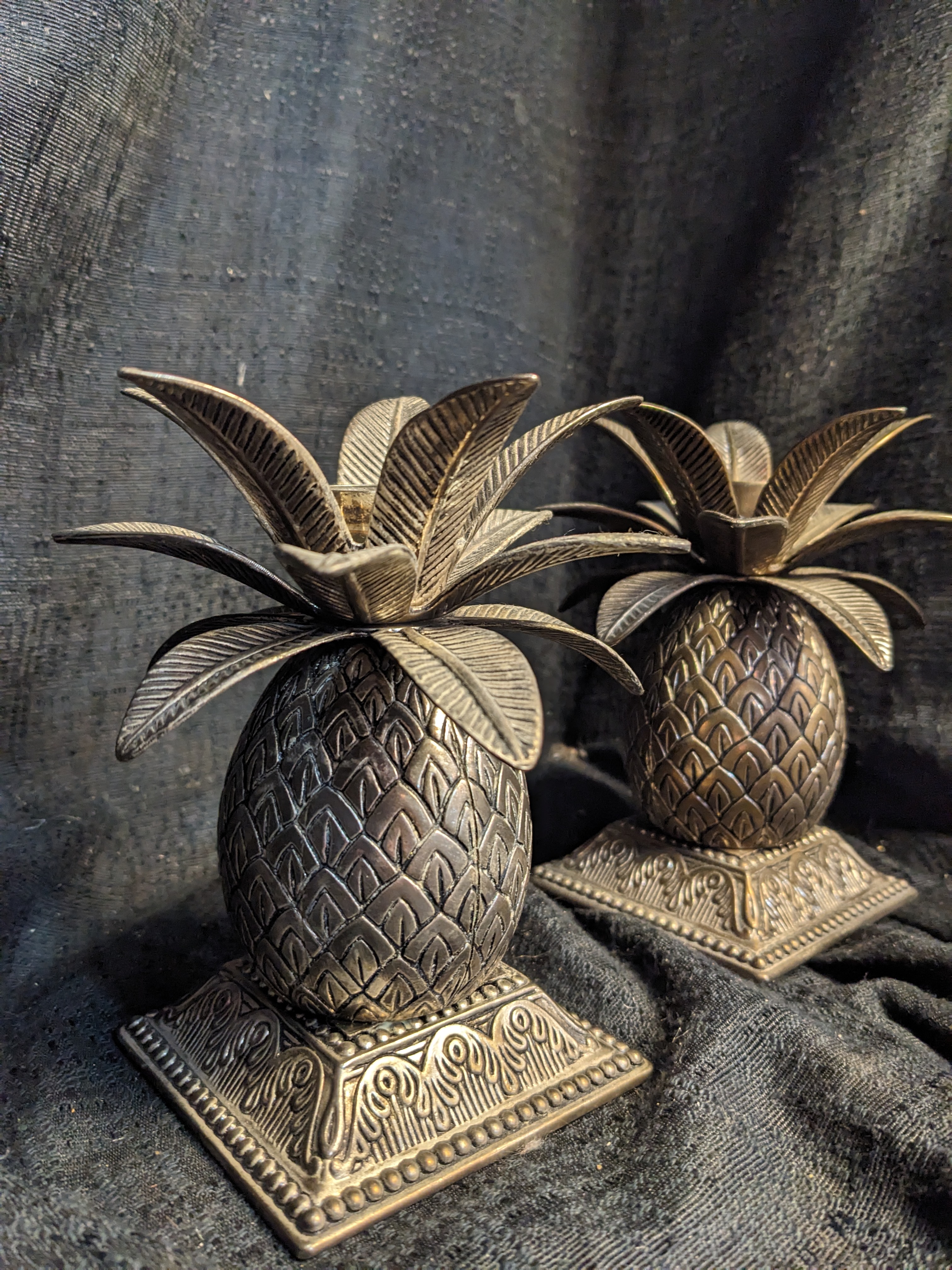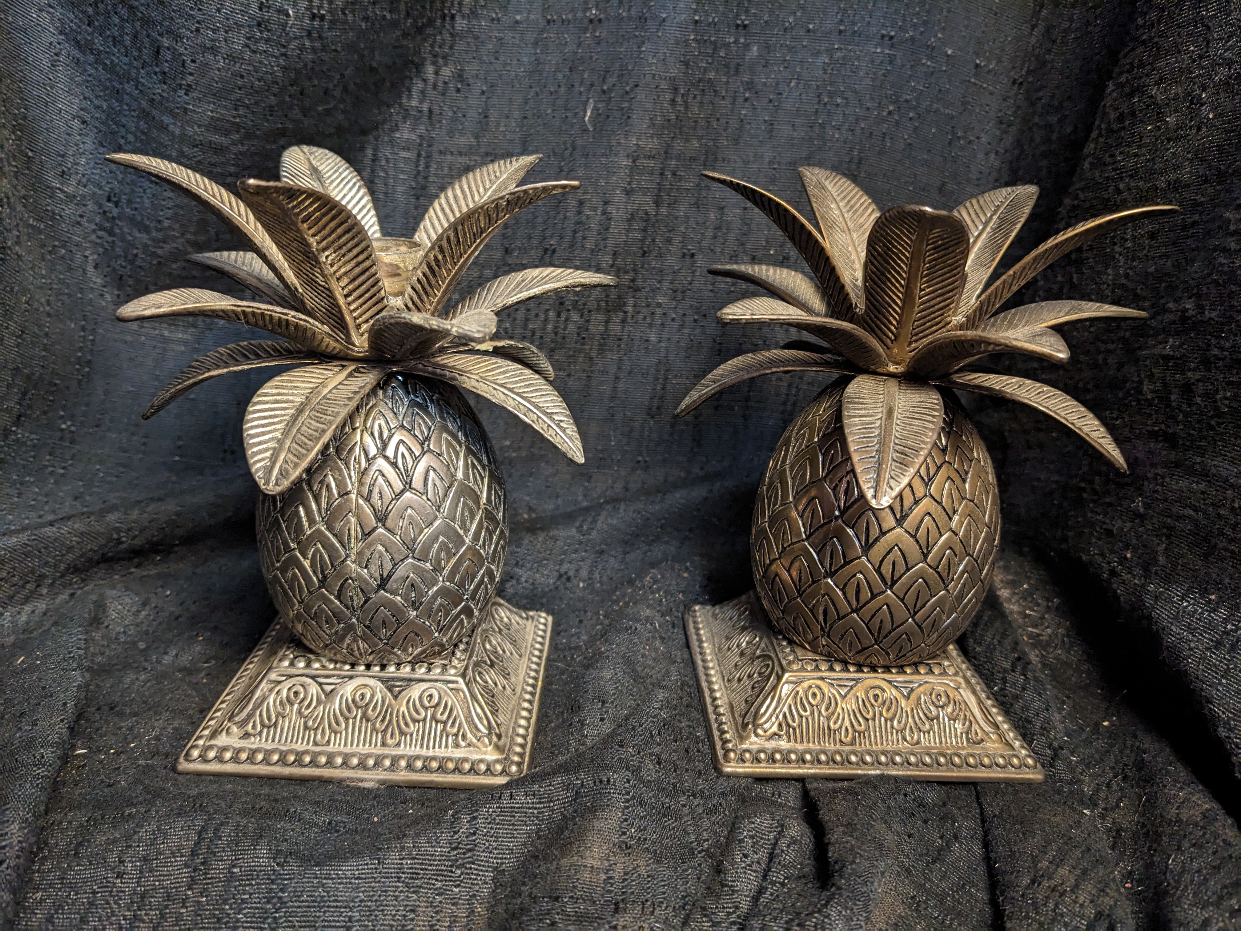 These silver plated Godinger candle holders come in a fun pineapple design. This pair is in good condition and each measures 3 x 3 x 5