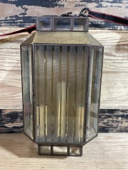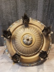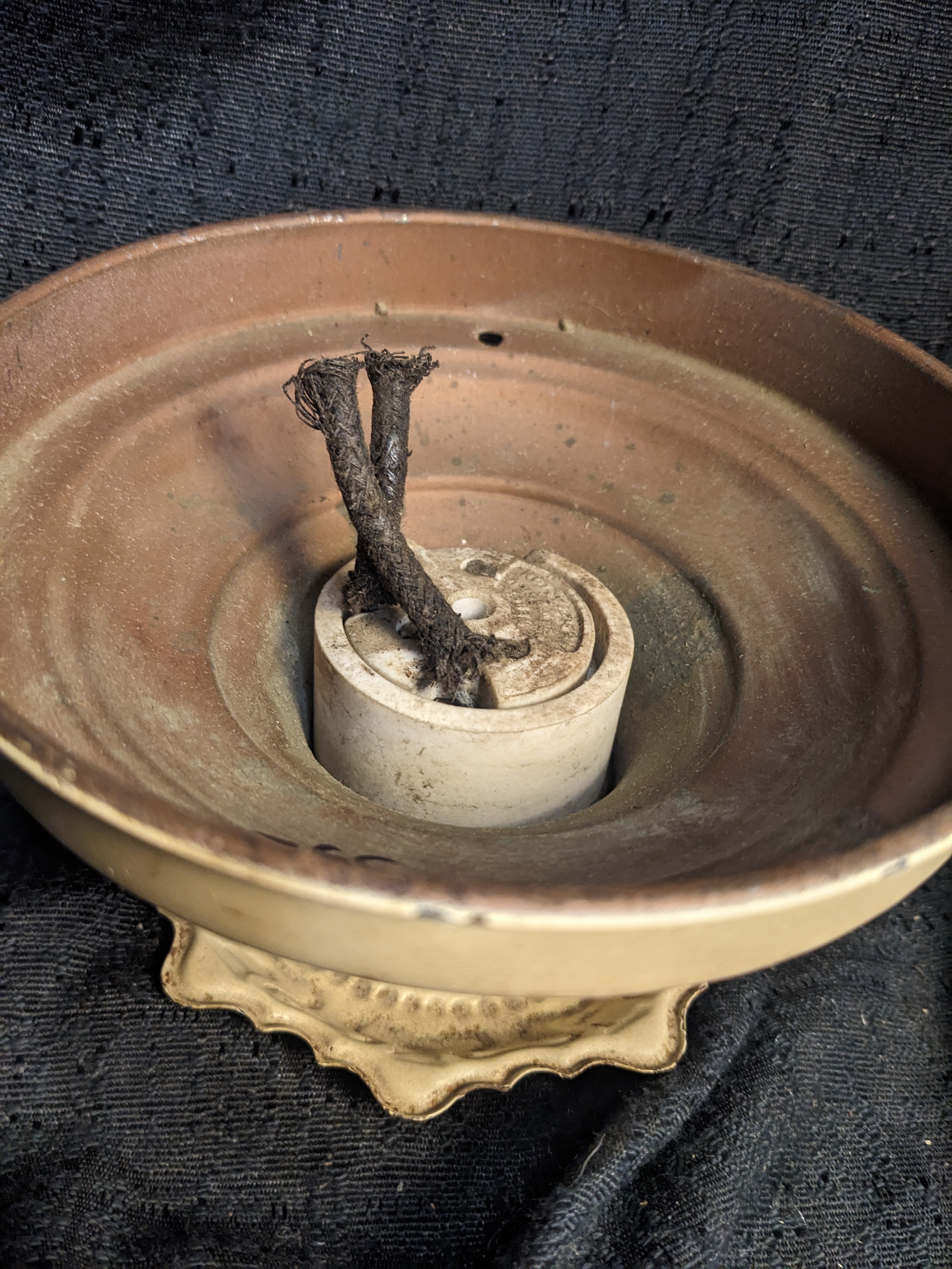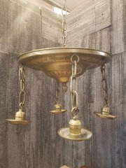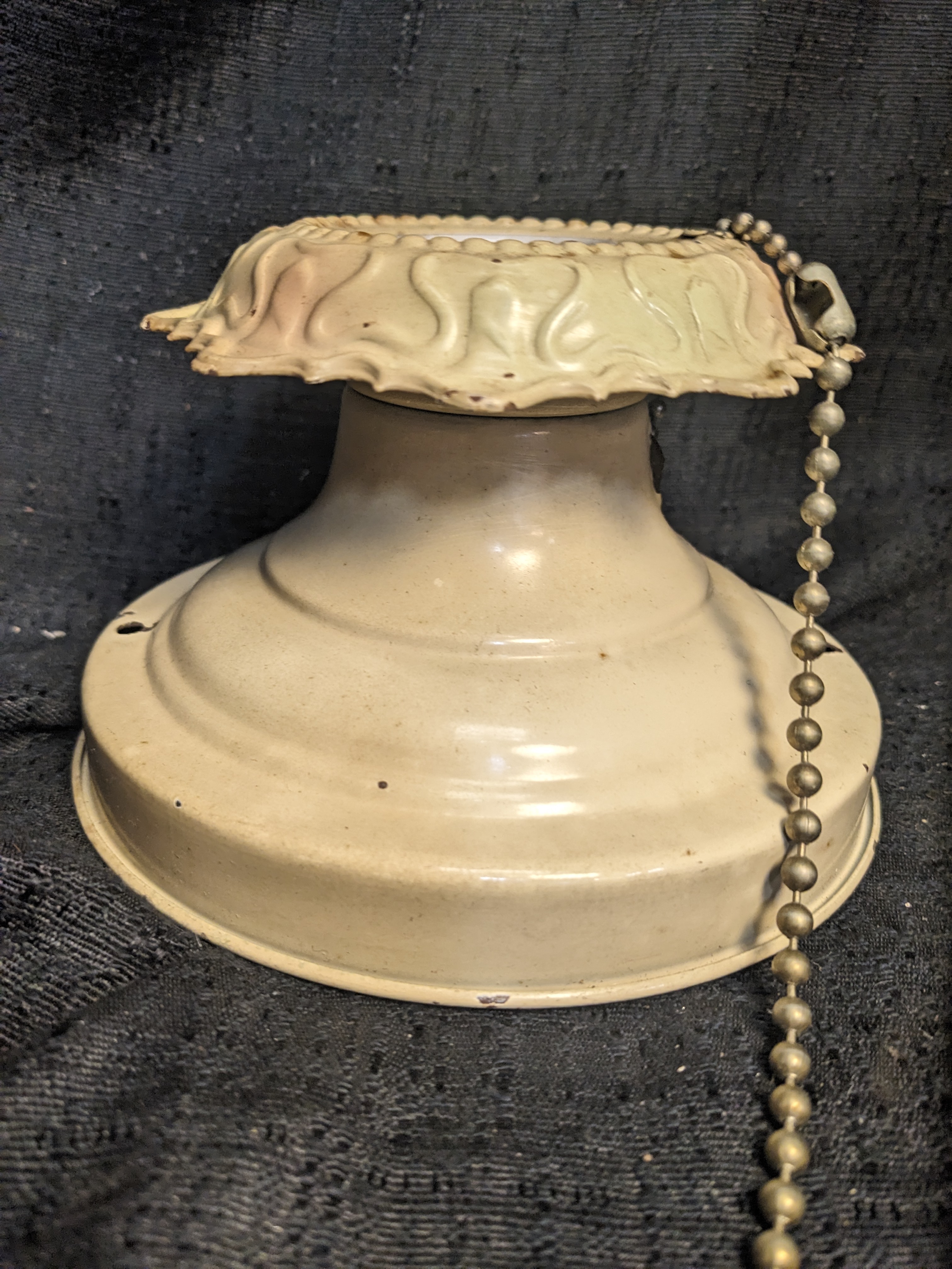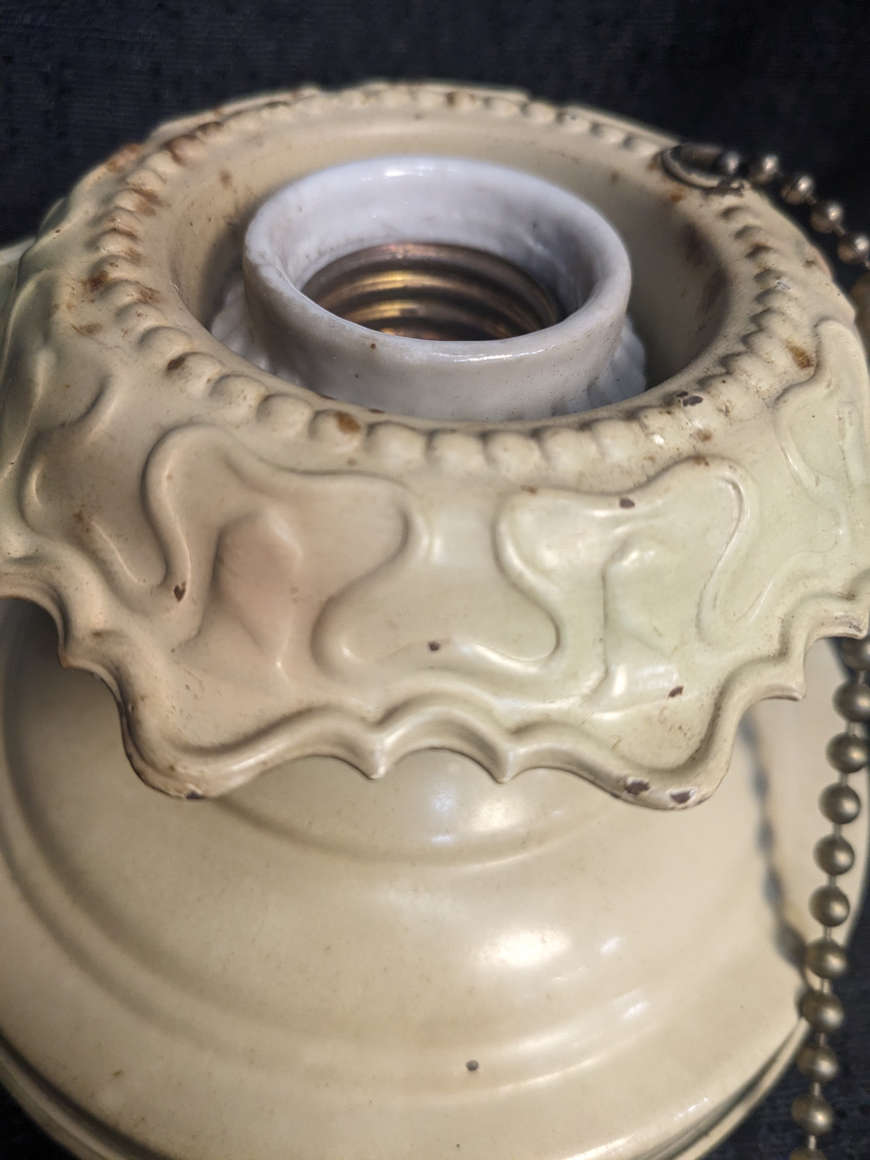 Made of steel with it's original vory finish and some very pale pink and green accents. This bare bulb fixture also has a pull chain switch. Perfect for a closet, pantry or basement.
