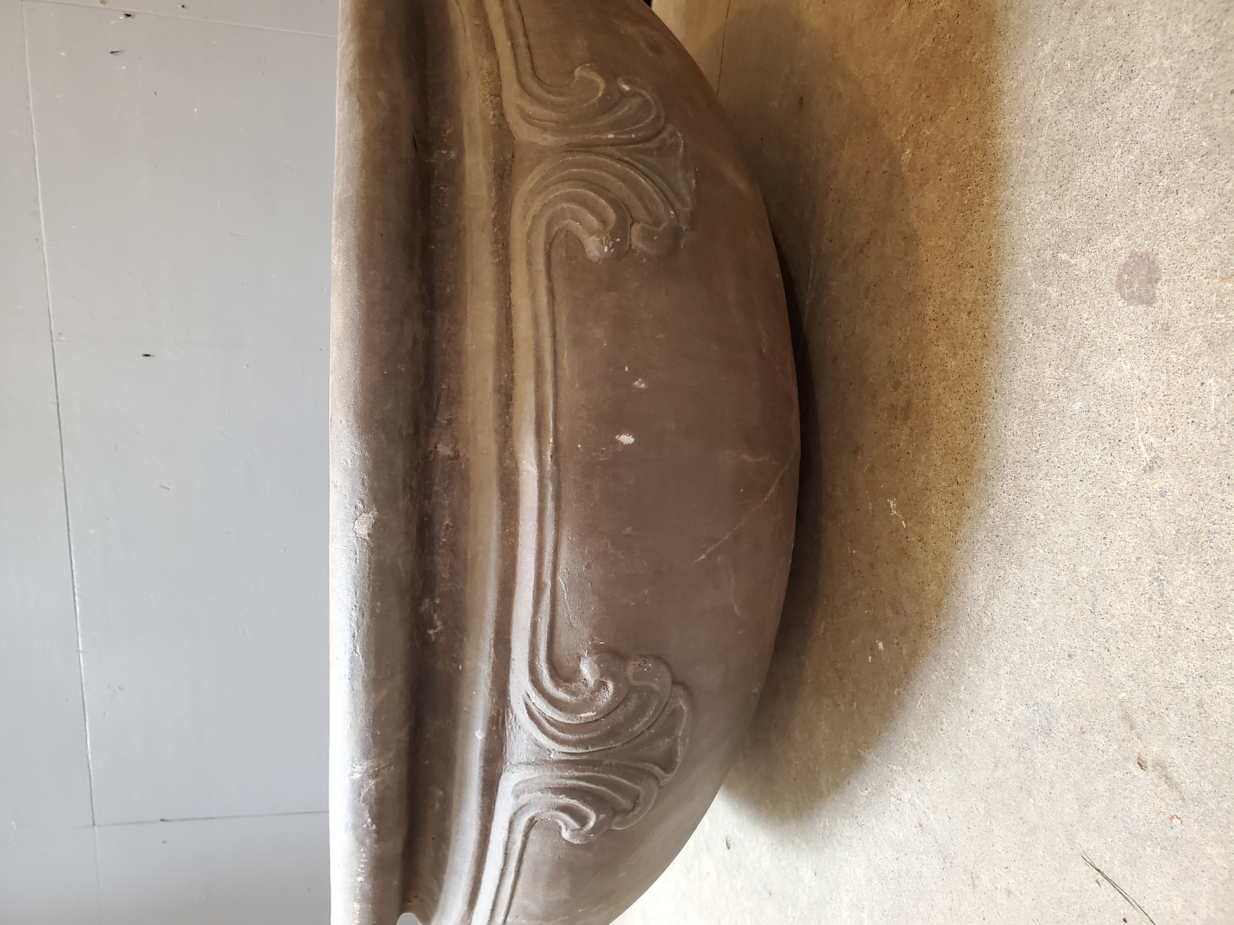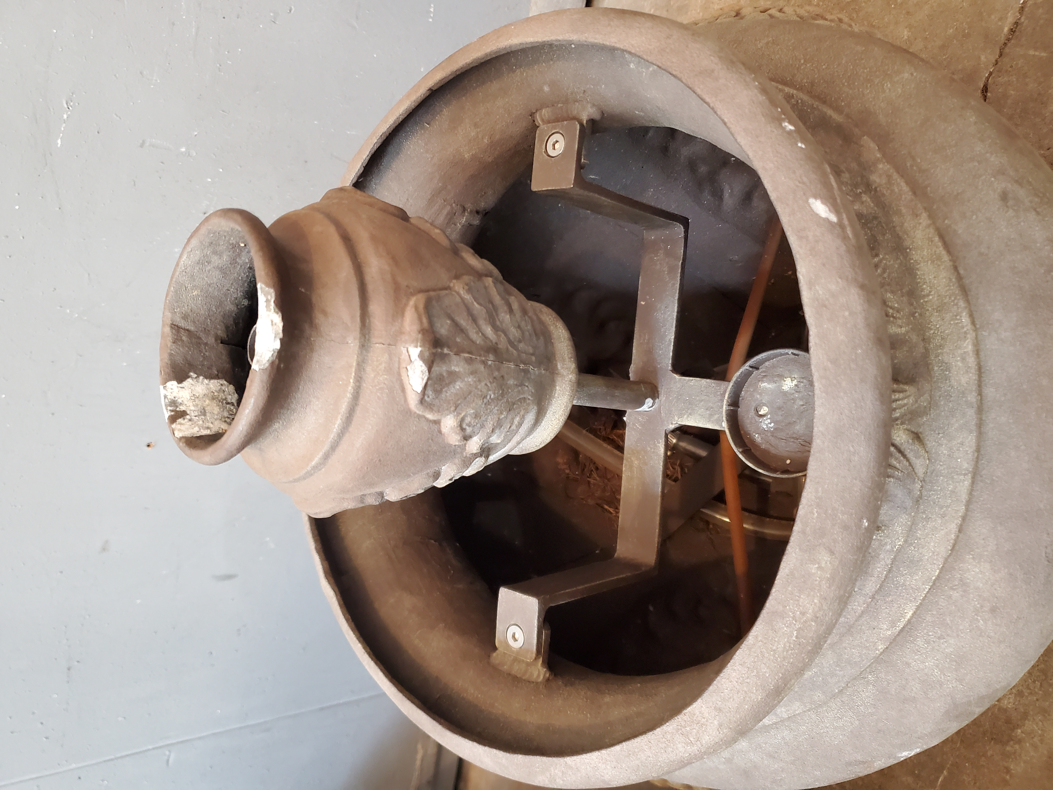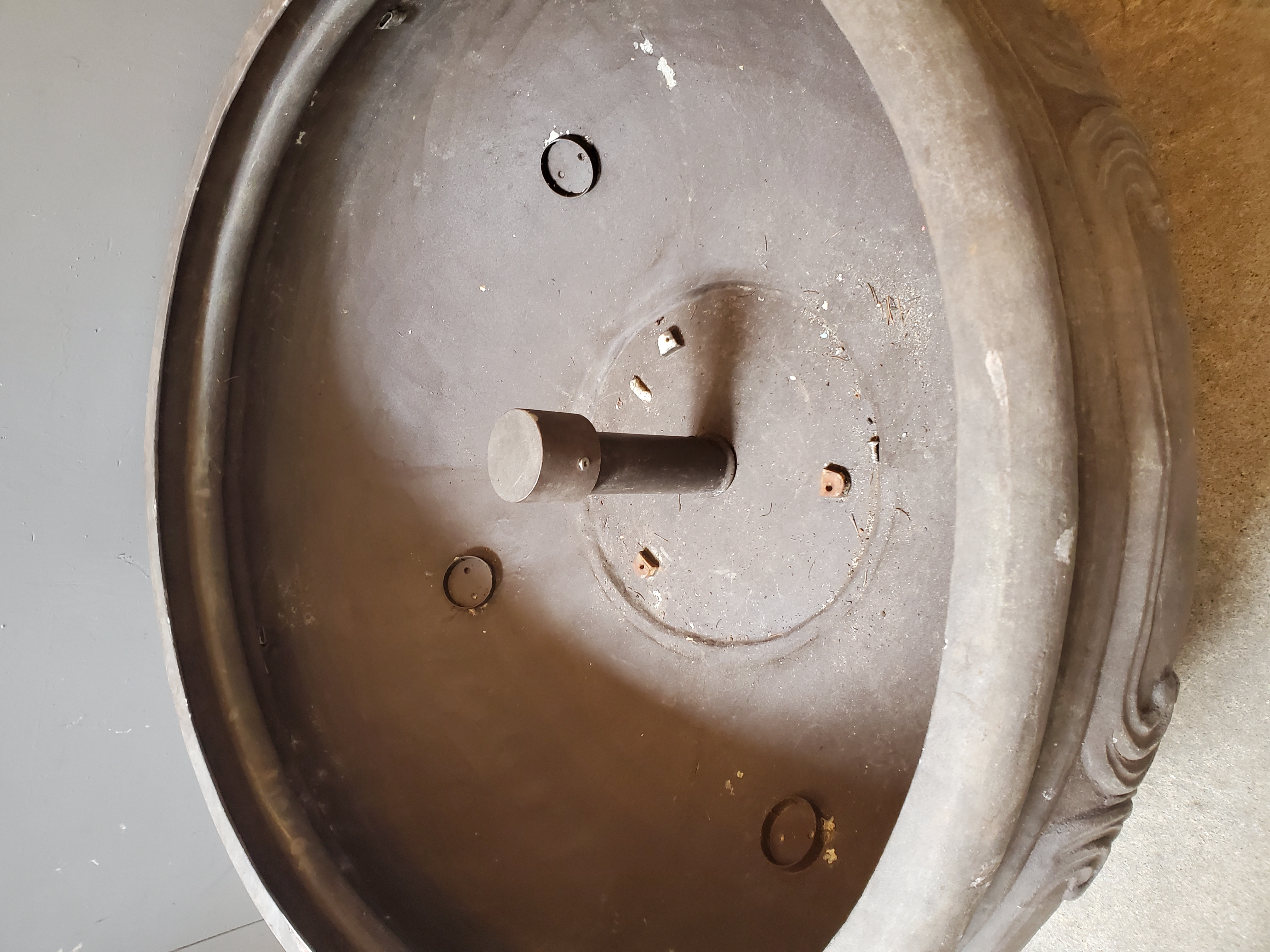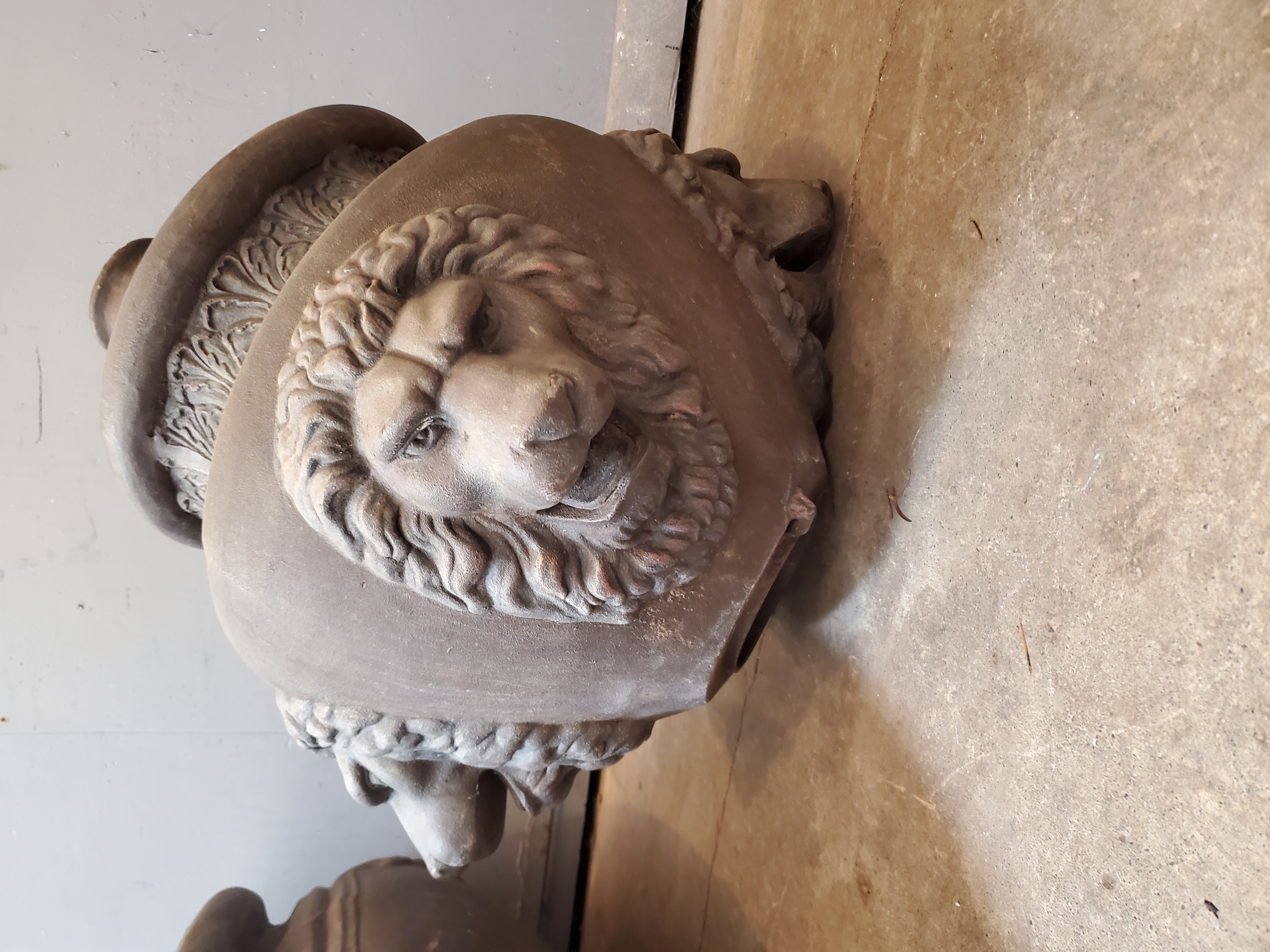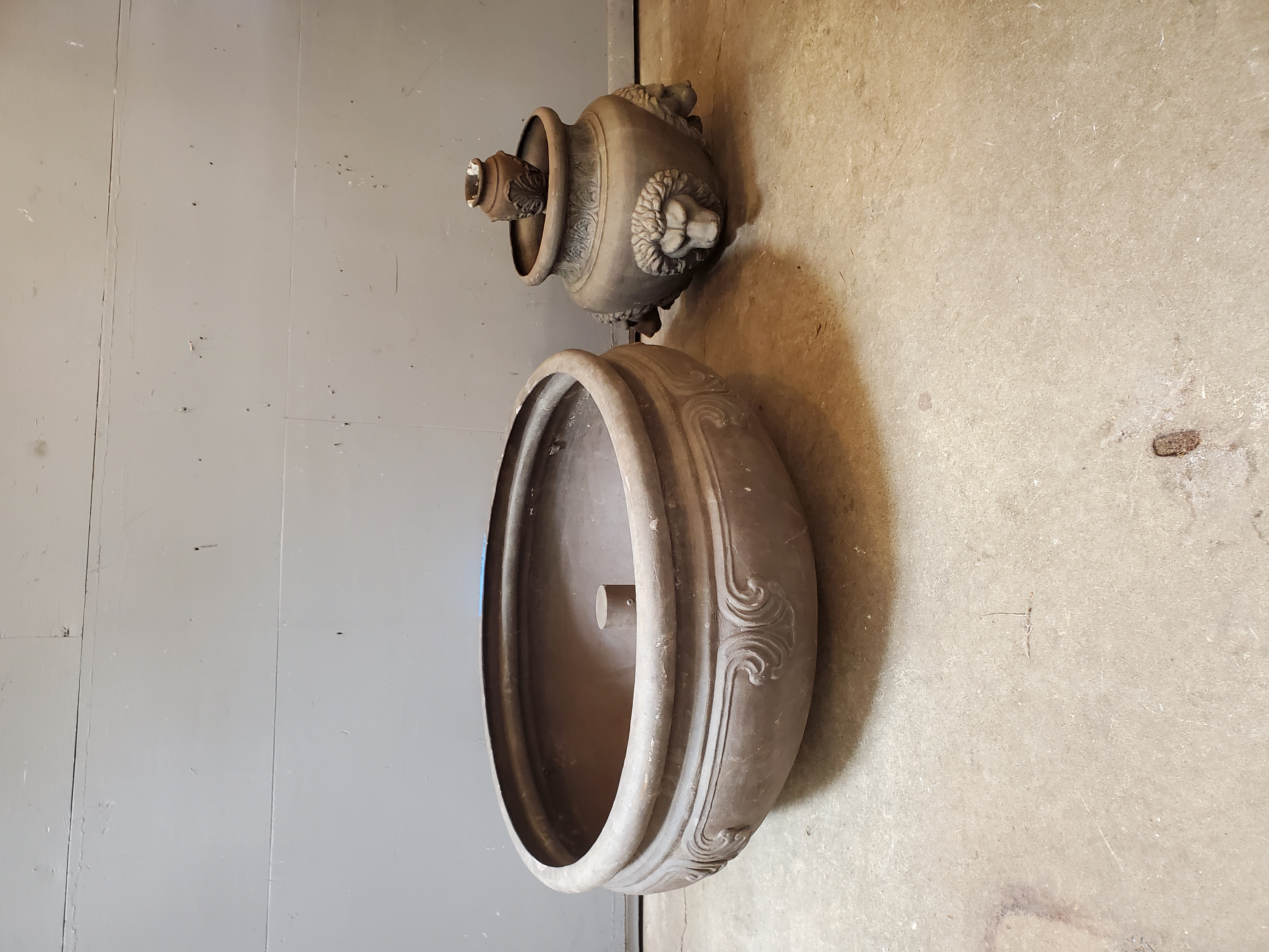 Huge parts of a fountain system with decorative lion accents on the upper section.