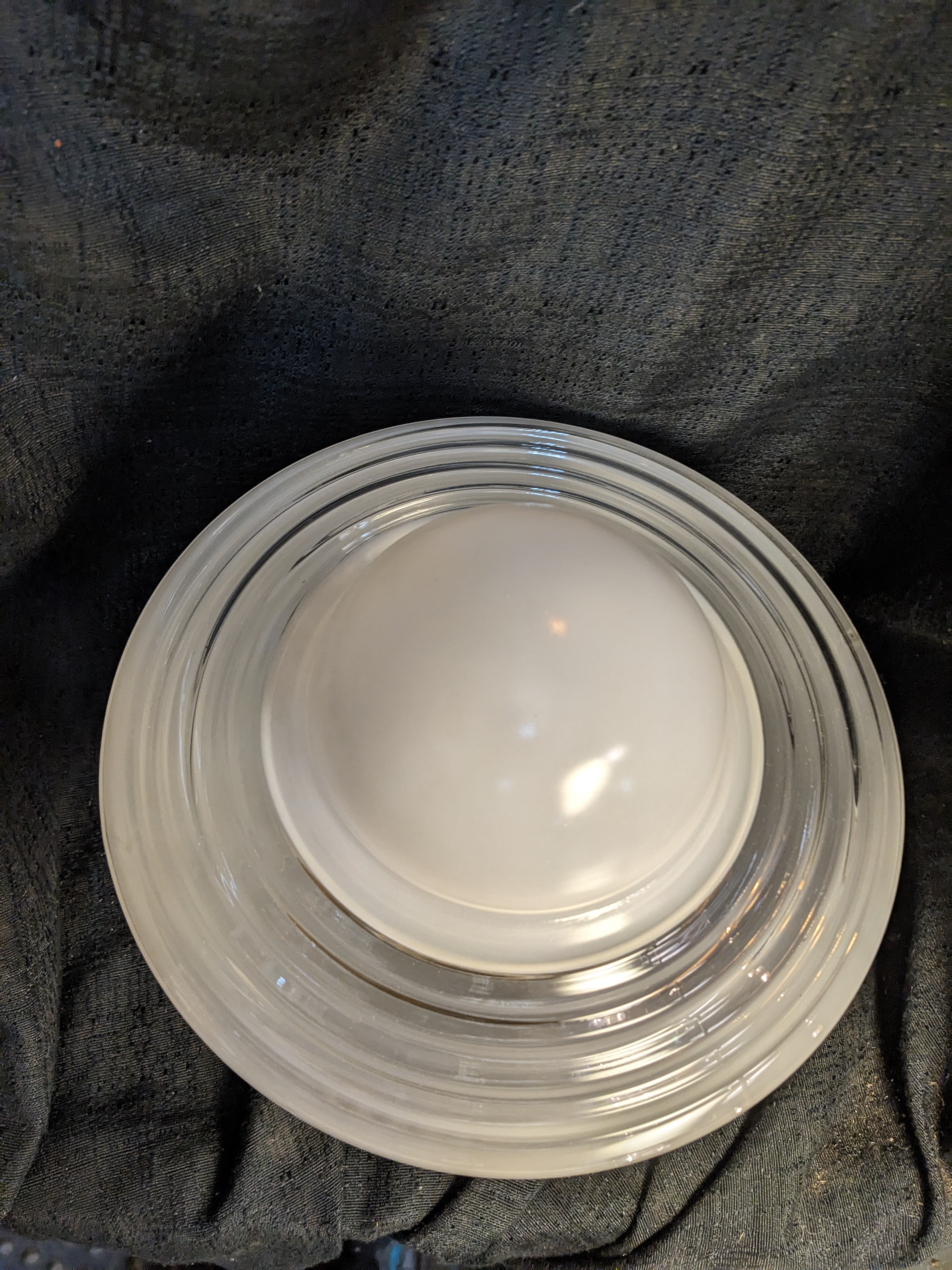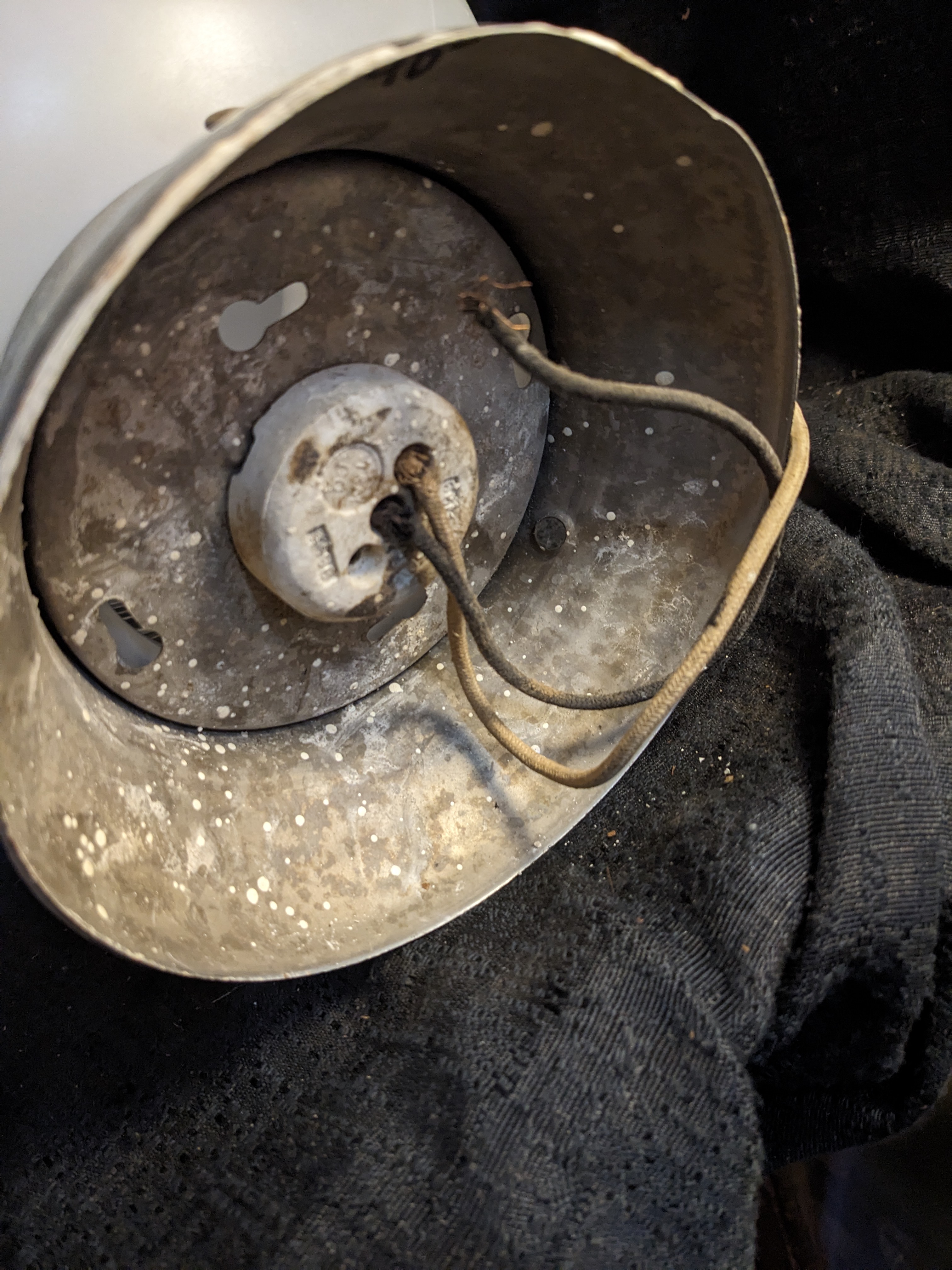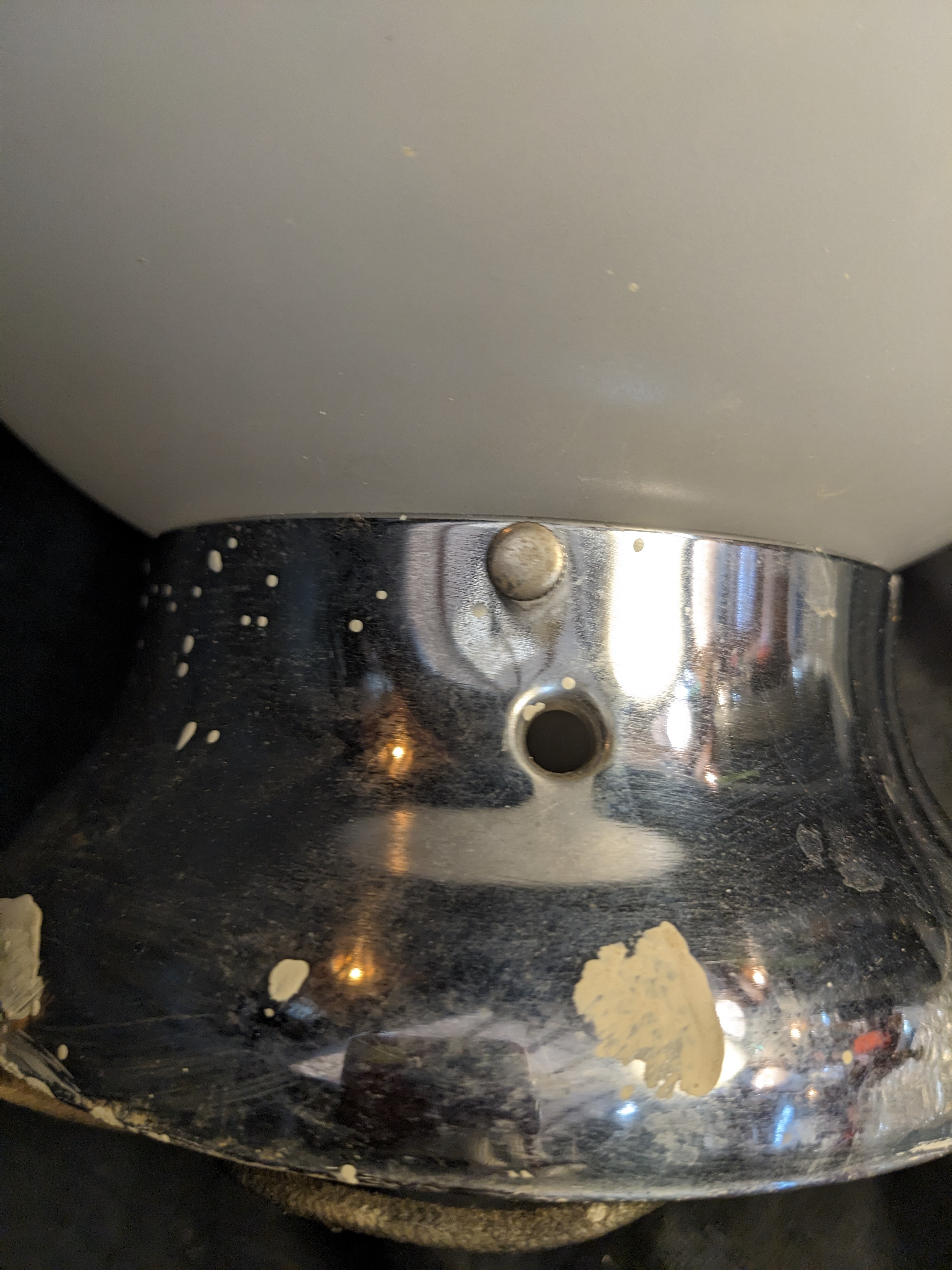 A cute 1950s single bulb light fixture that is shaped like a UFO. The chrome fitter has some paint on it and some scratches. The hole you see in the photos is for a pull chain switch, which it does not have. The shade is in good condition. The wiring is original and fixed to the 2 piece porcelain socket.