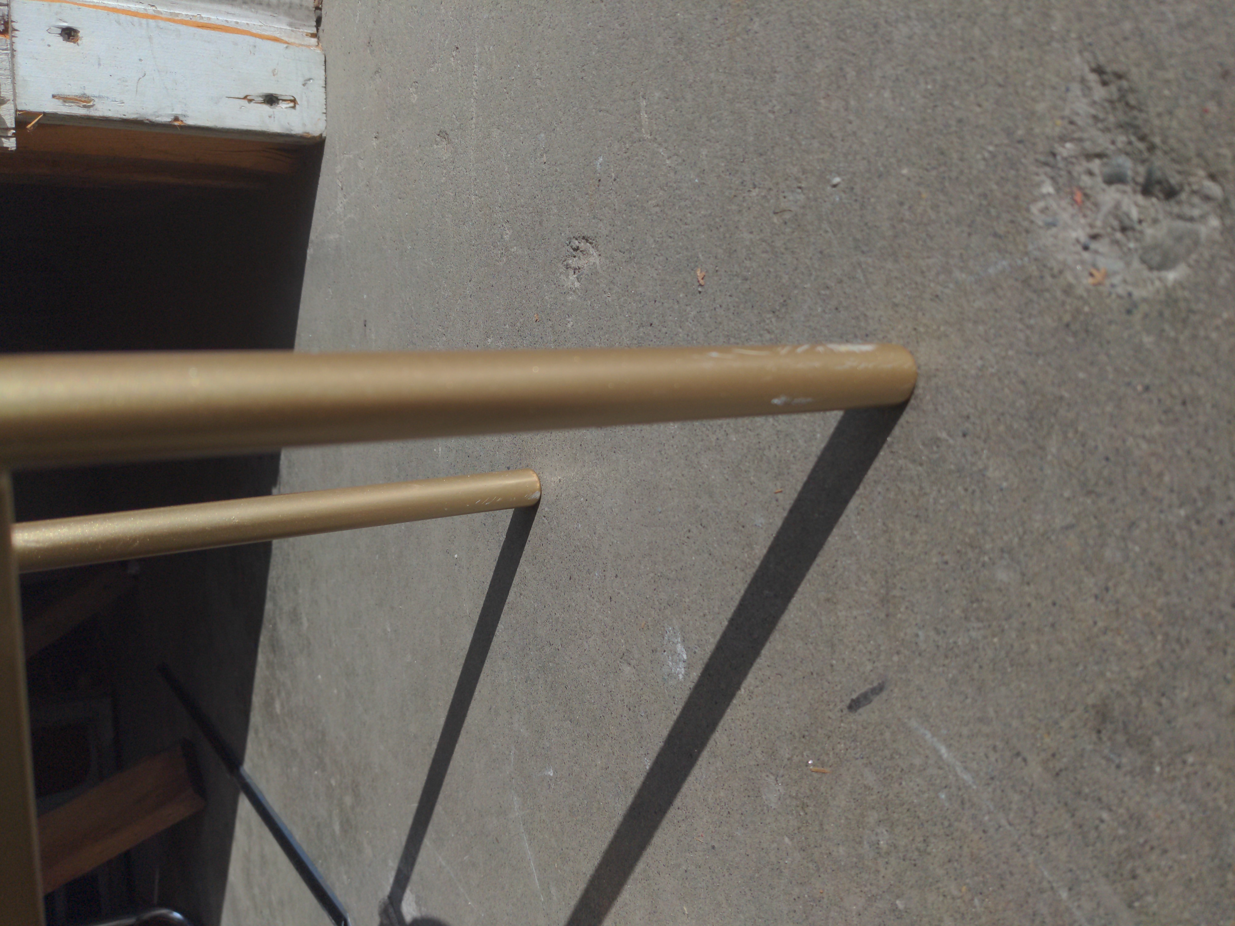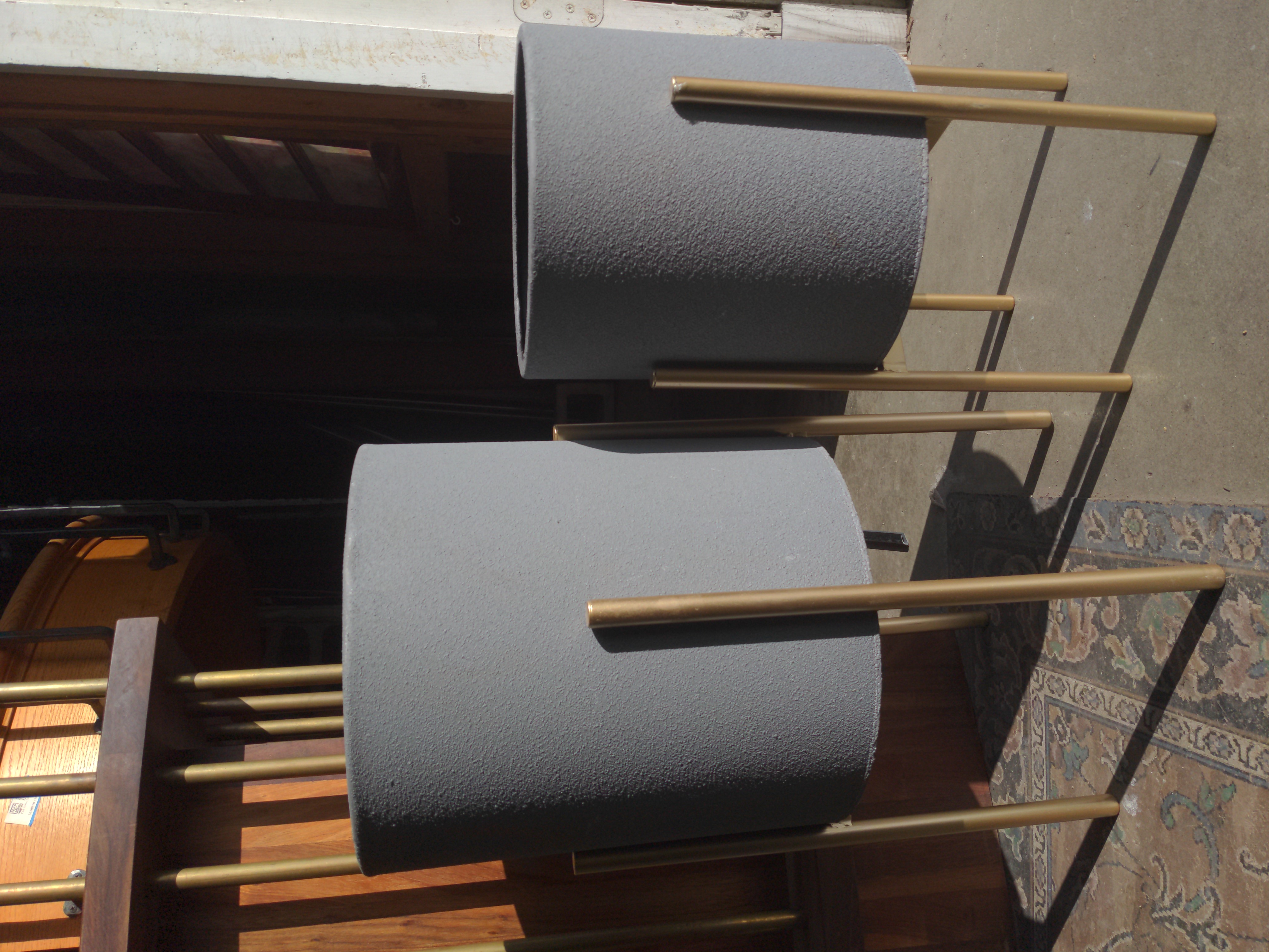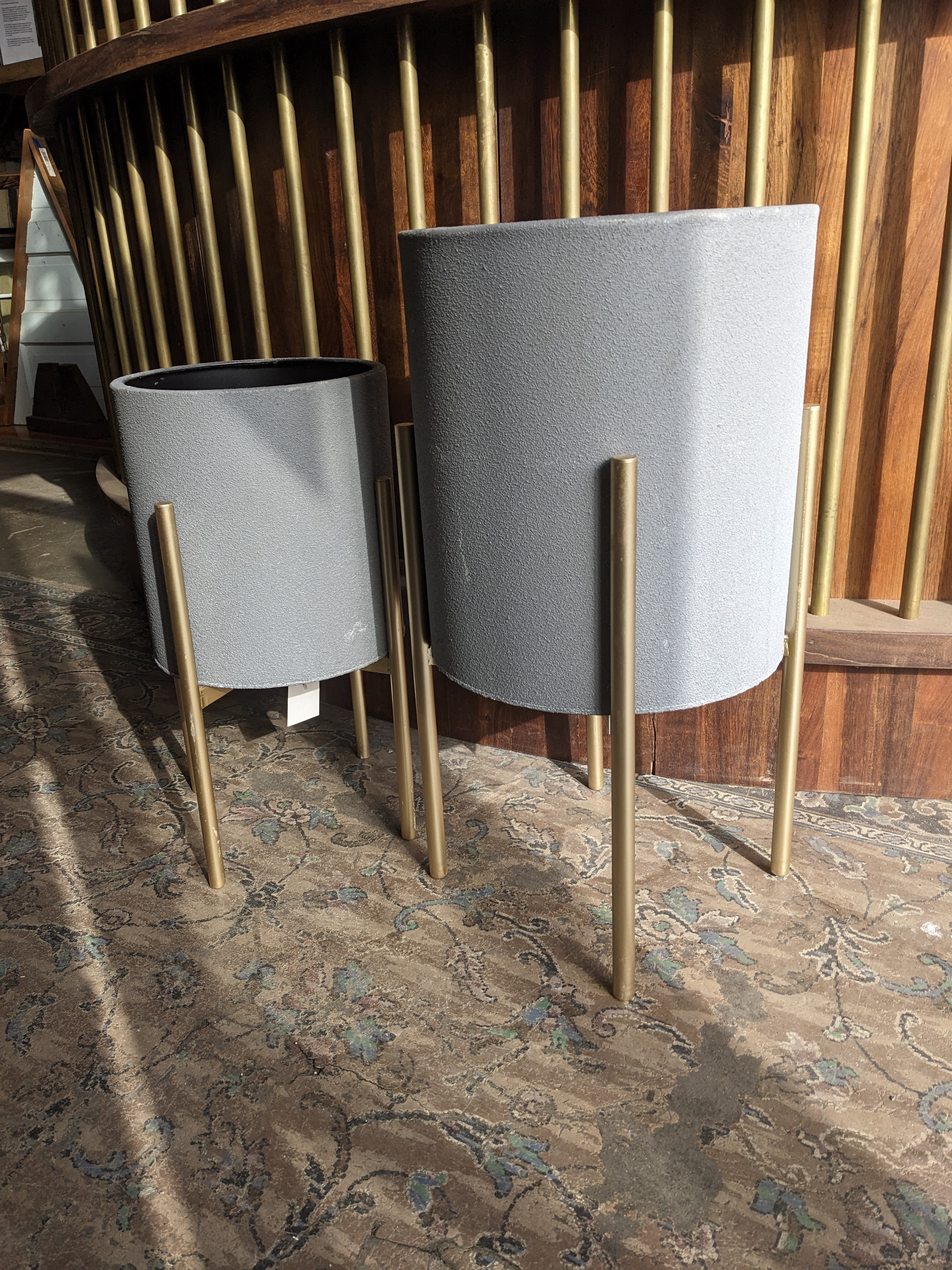 This set of dark gray metal planters on gold-colored stands are in good condition. There are some minor scratches on the legs as shown in the photo.