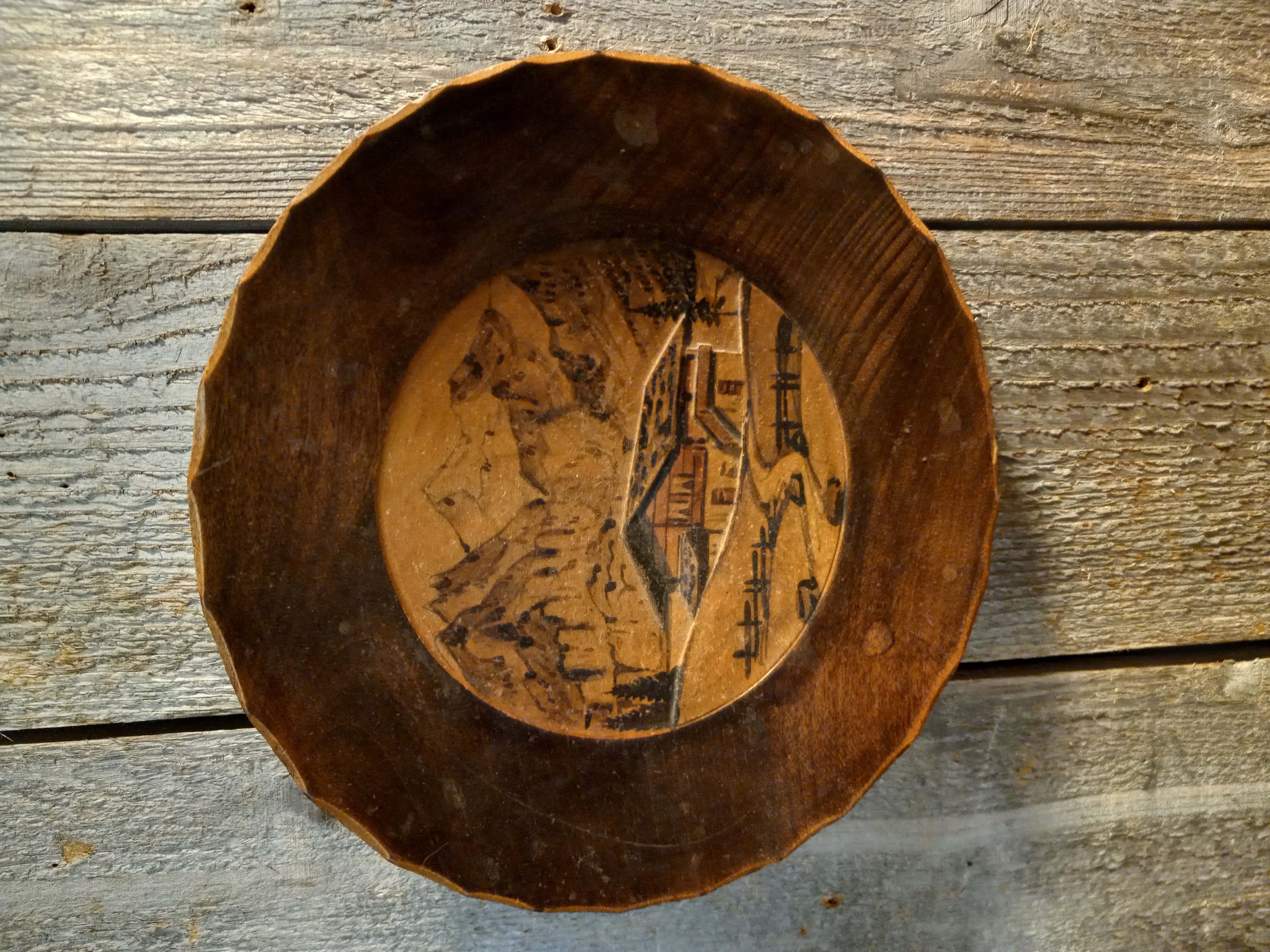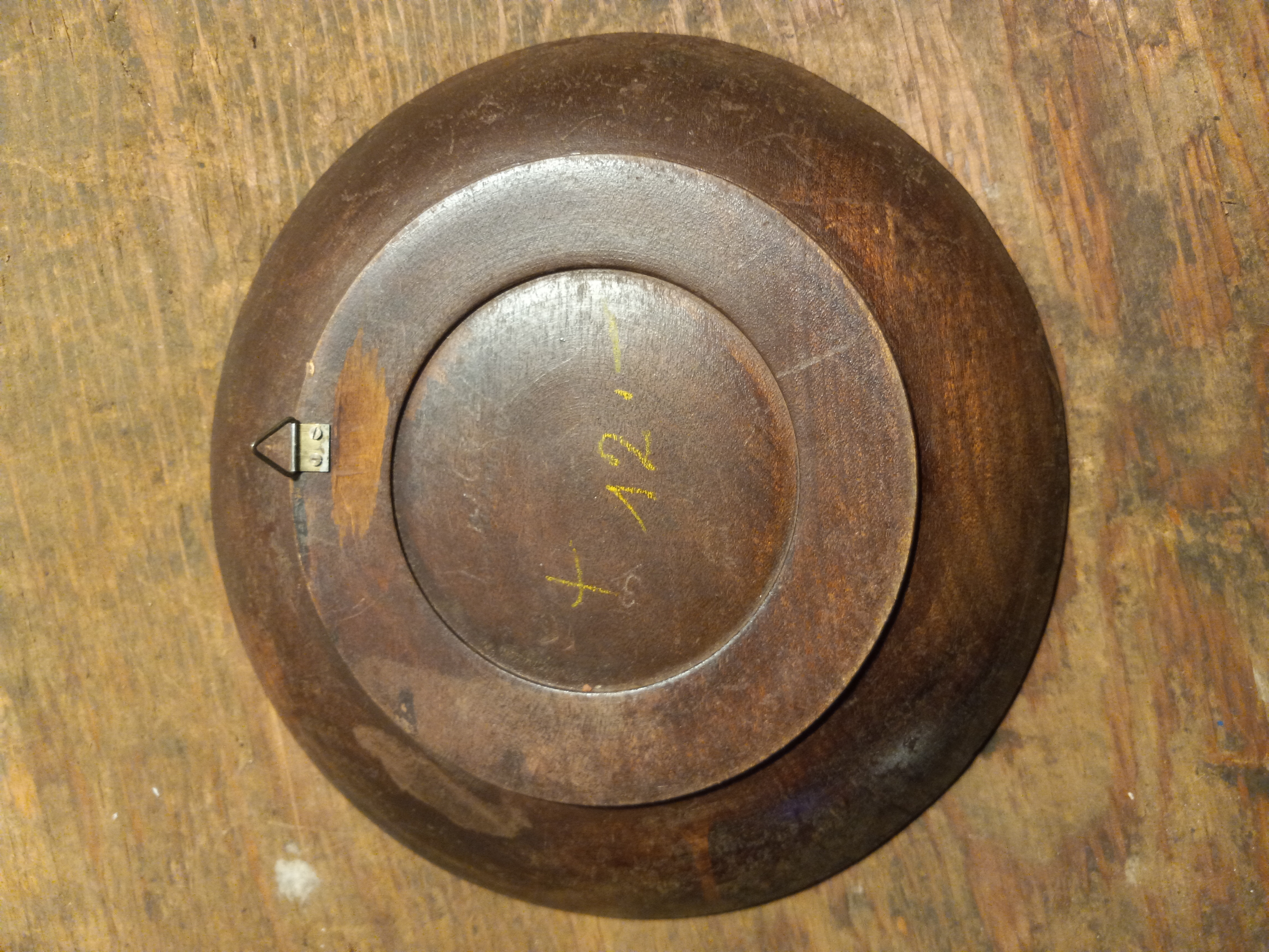 This vintage wooden plate is 8 inches around and has a hanger on the back.
