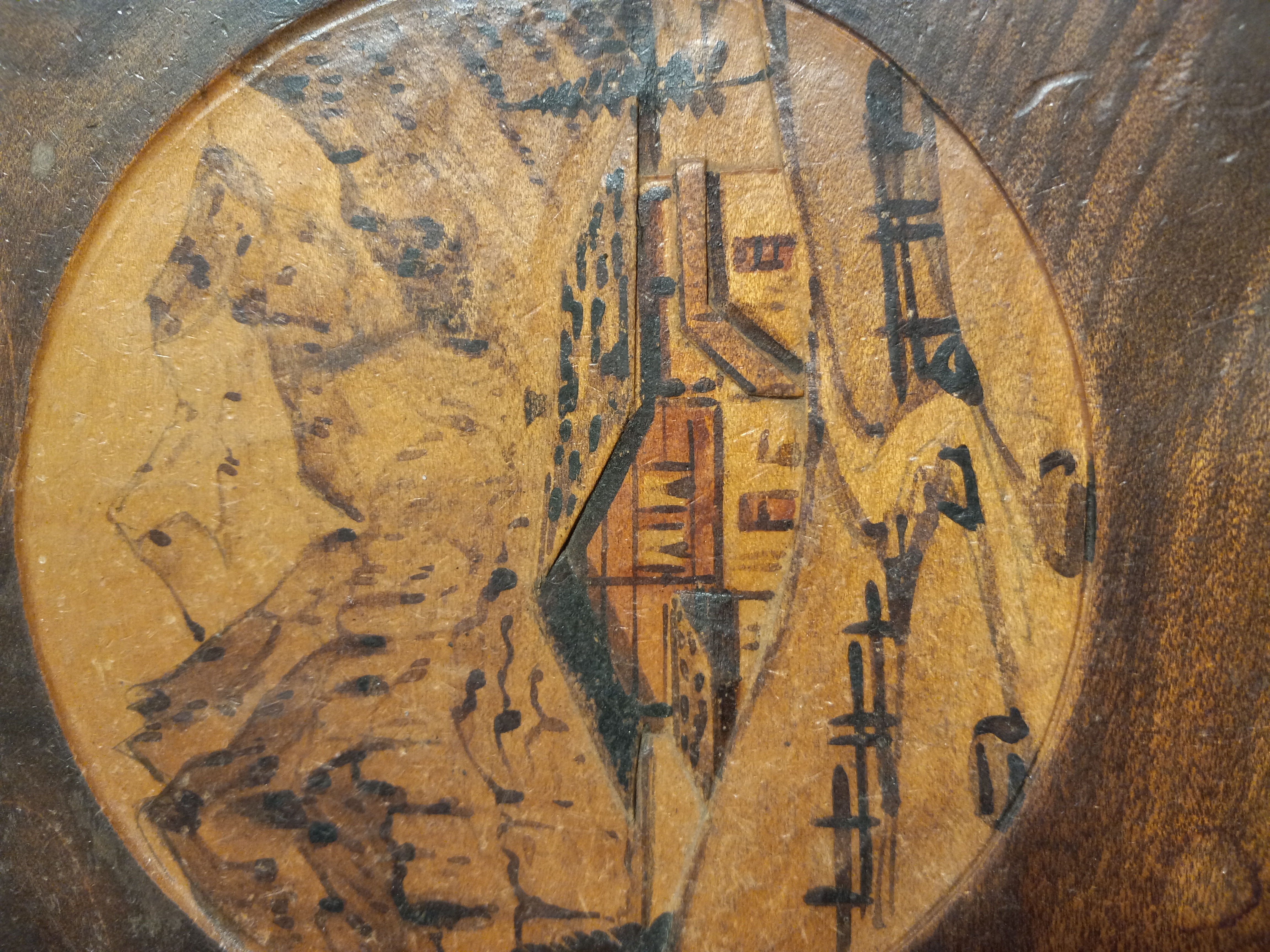 It features a painting of a cozy lodge in the mountains. The wood appears to be Mahogany but is unknown.
