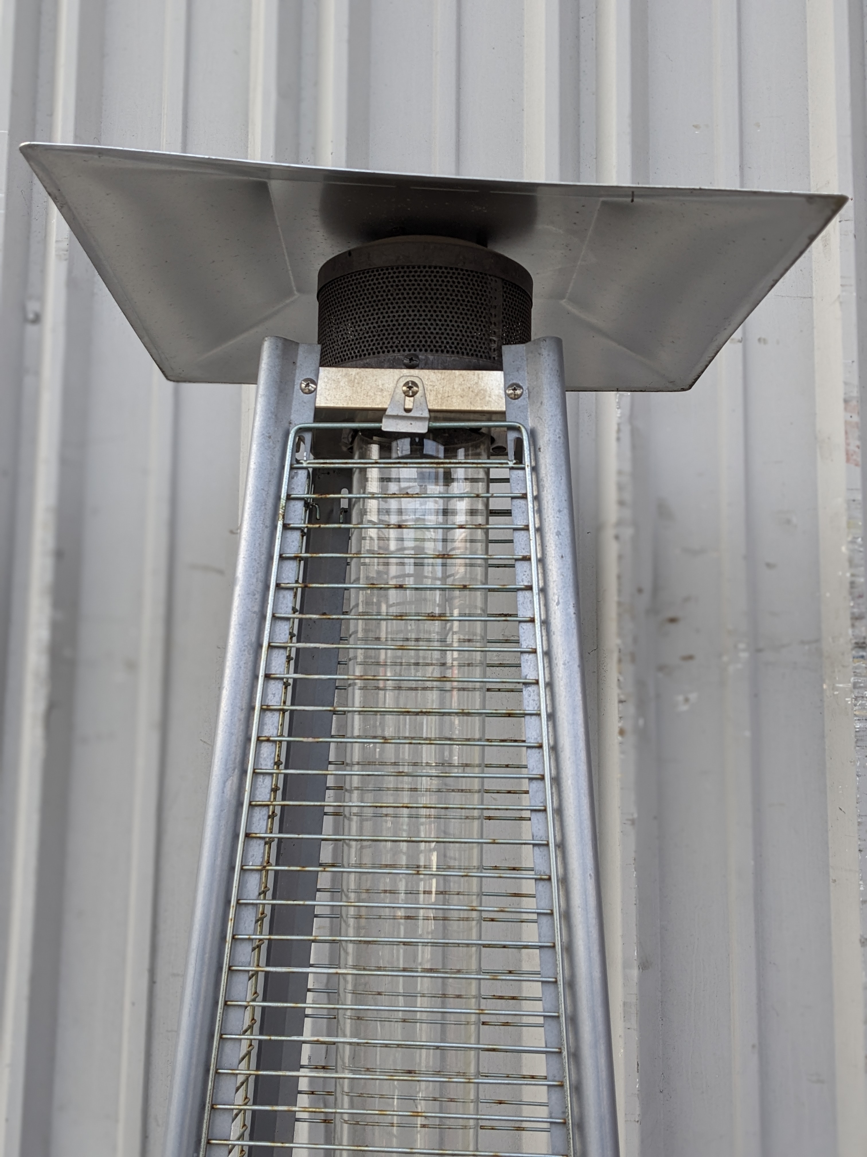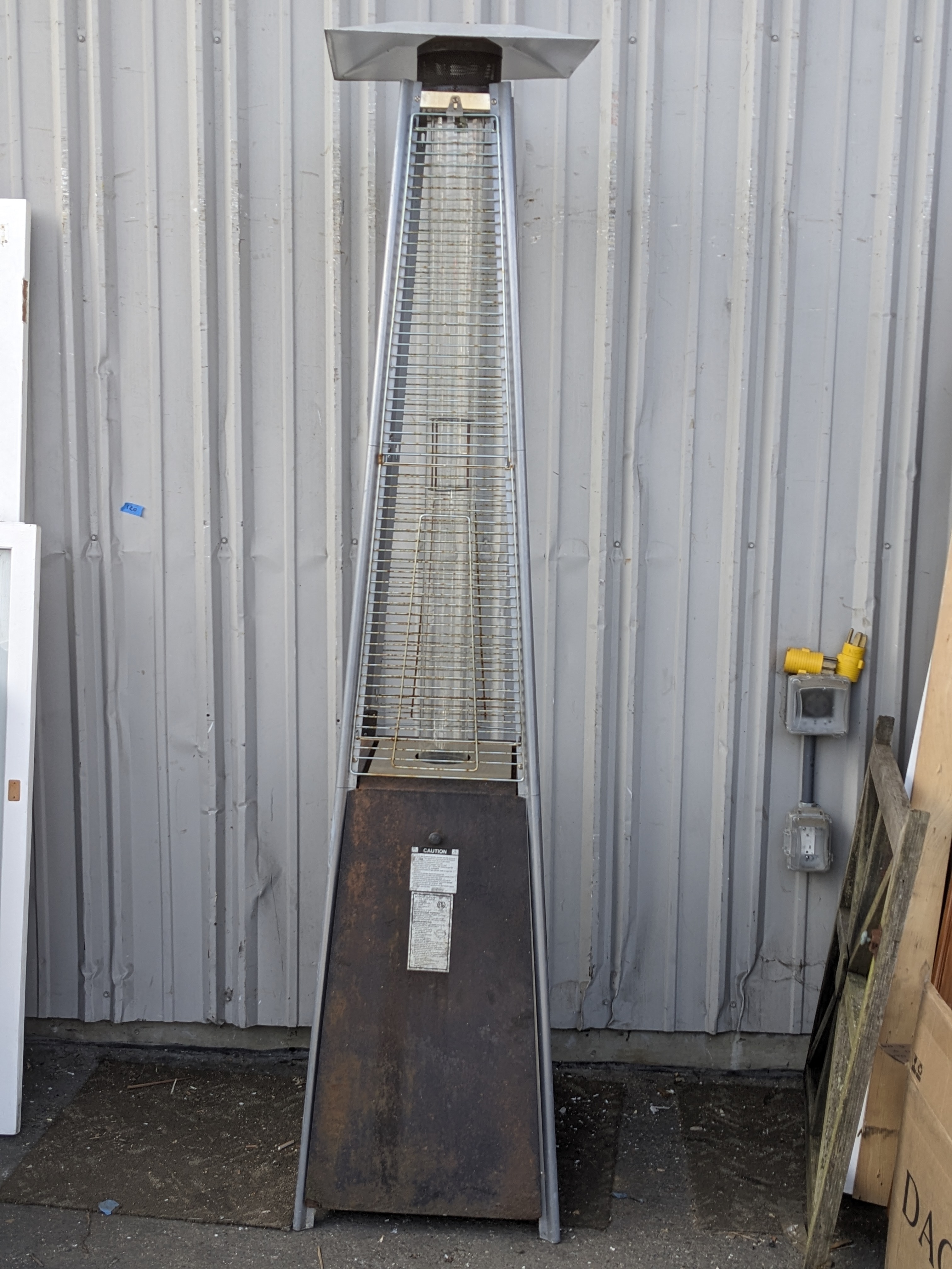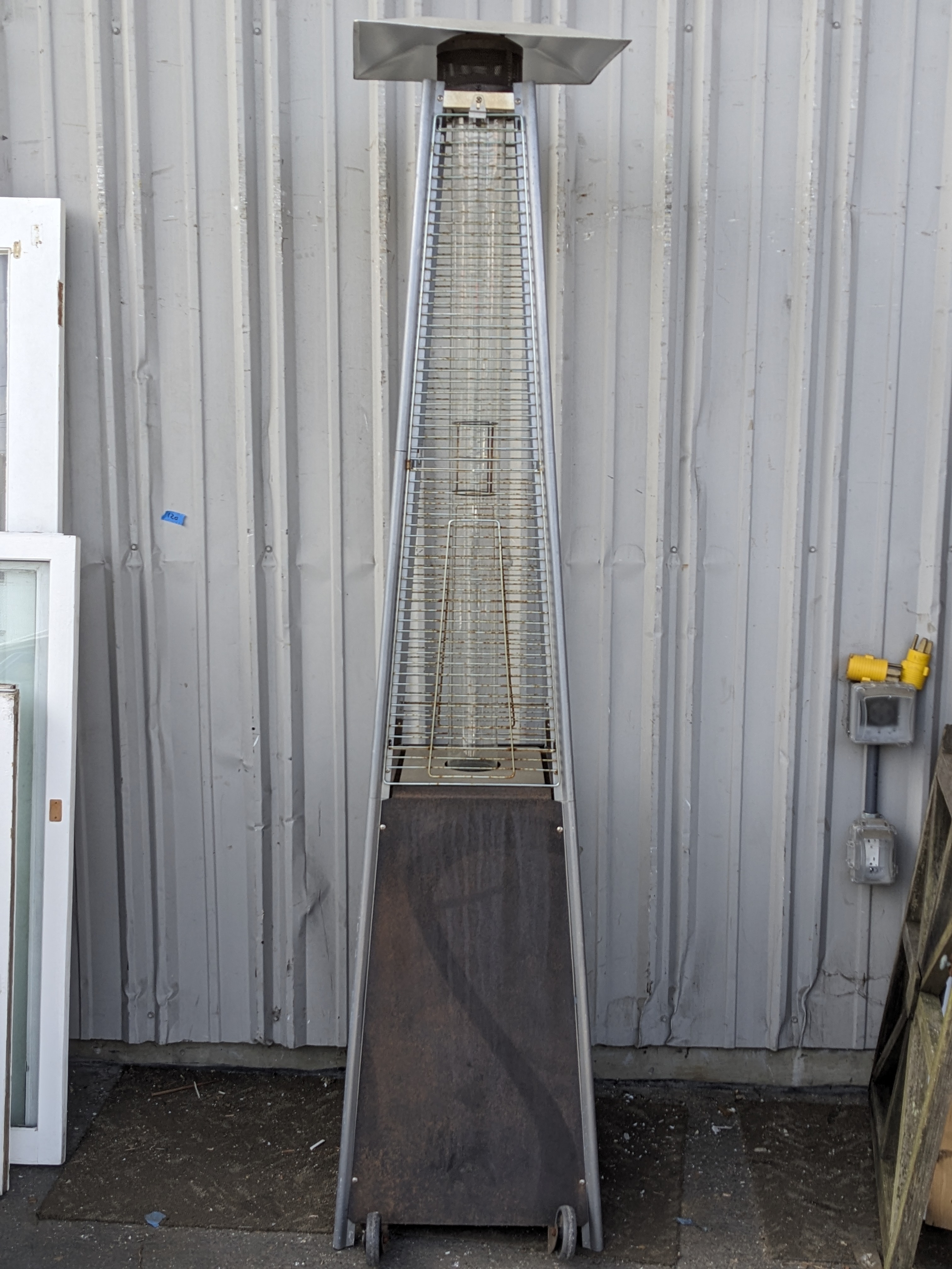 This propane patio heater would be a great way to heat up a porch area or an outdoor seating commercial setting. This piece does have some surface rust but is otherwise very solid.