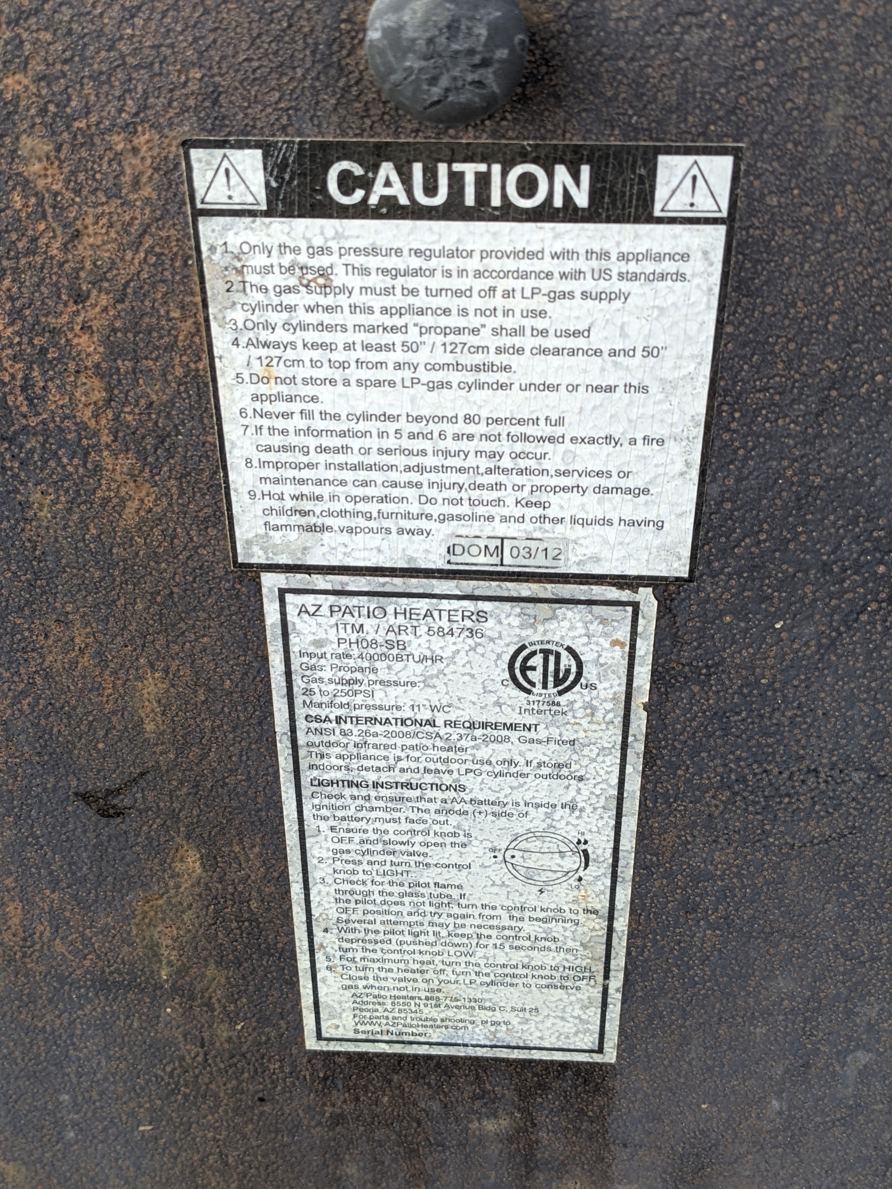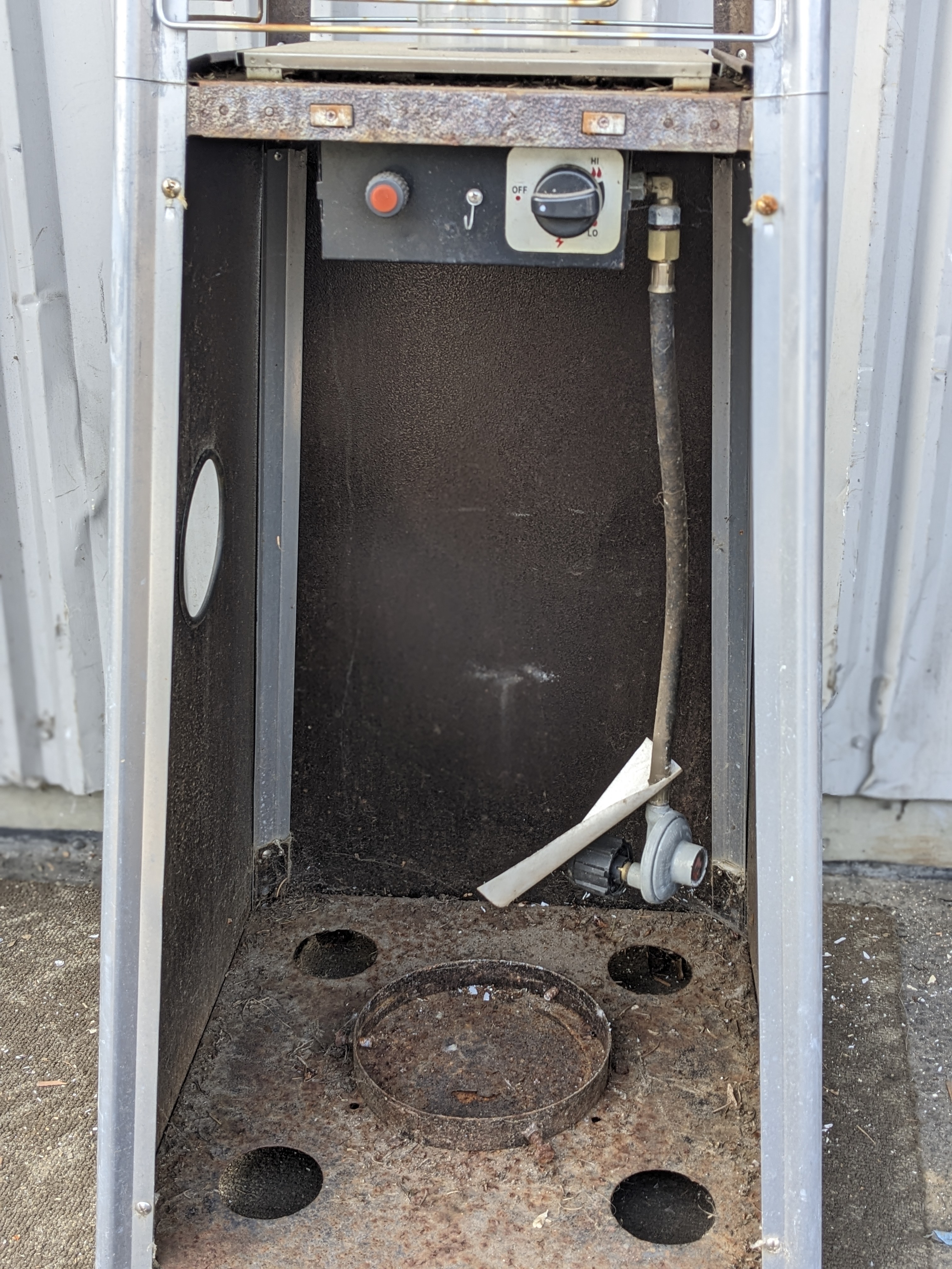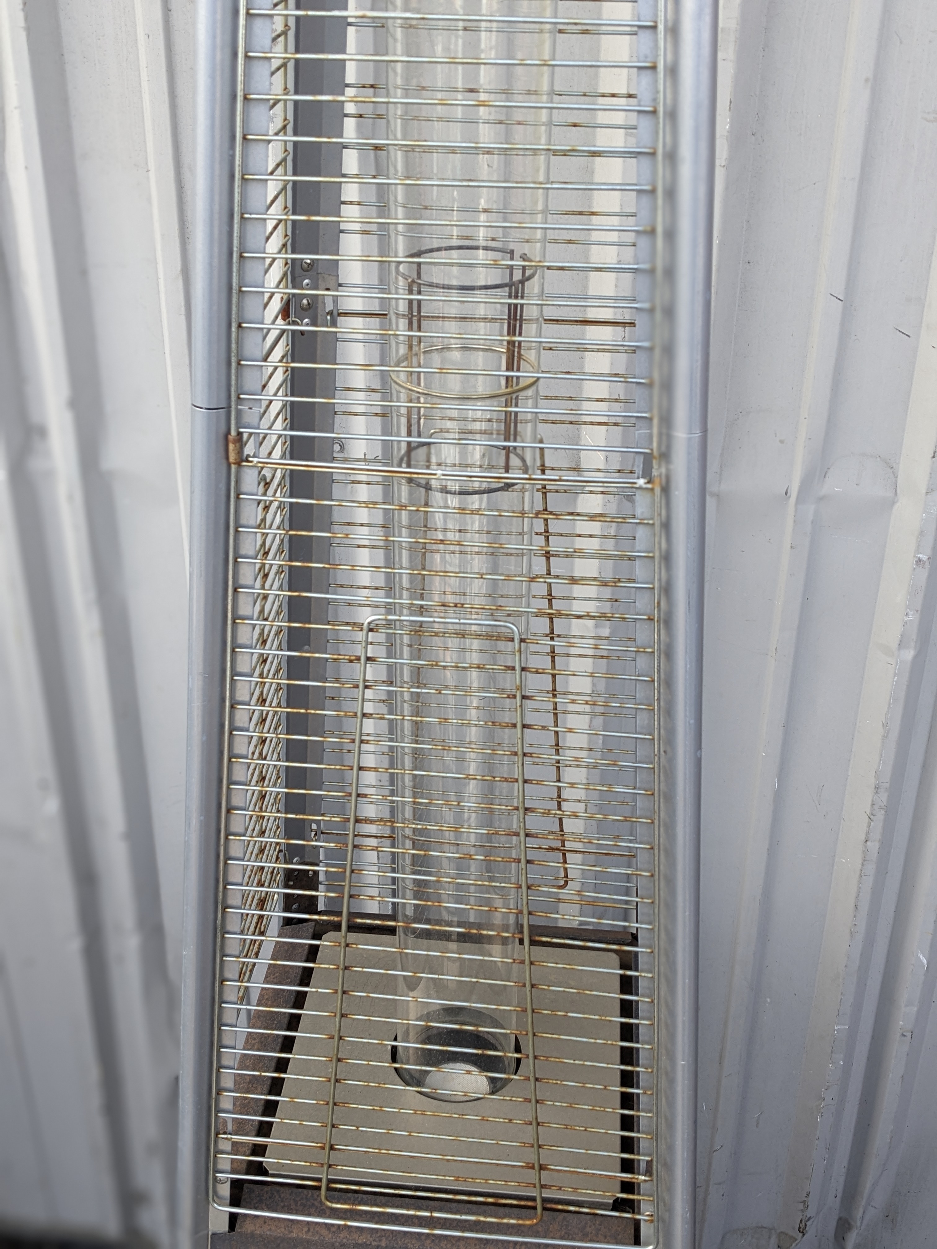 This propane patio heater would be a great way to heat up a porch area or an outdoor seating commercial setting. This piece does have some surface rust but is otherwise very solid.