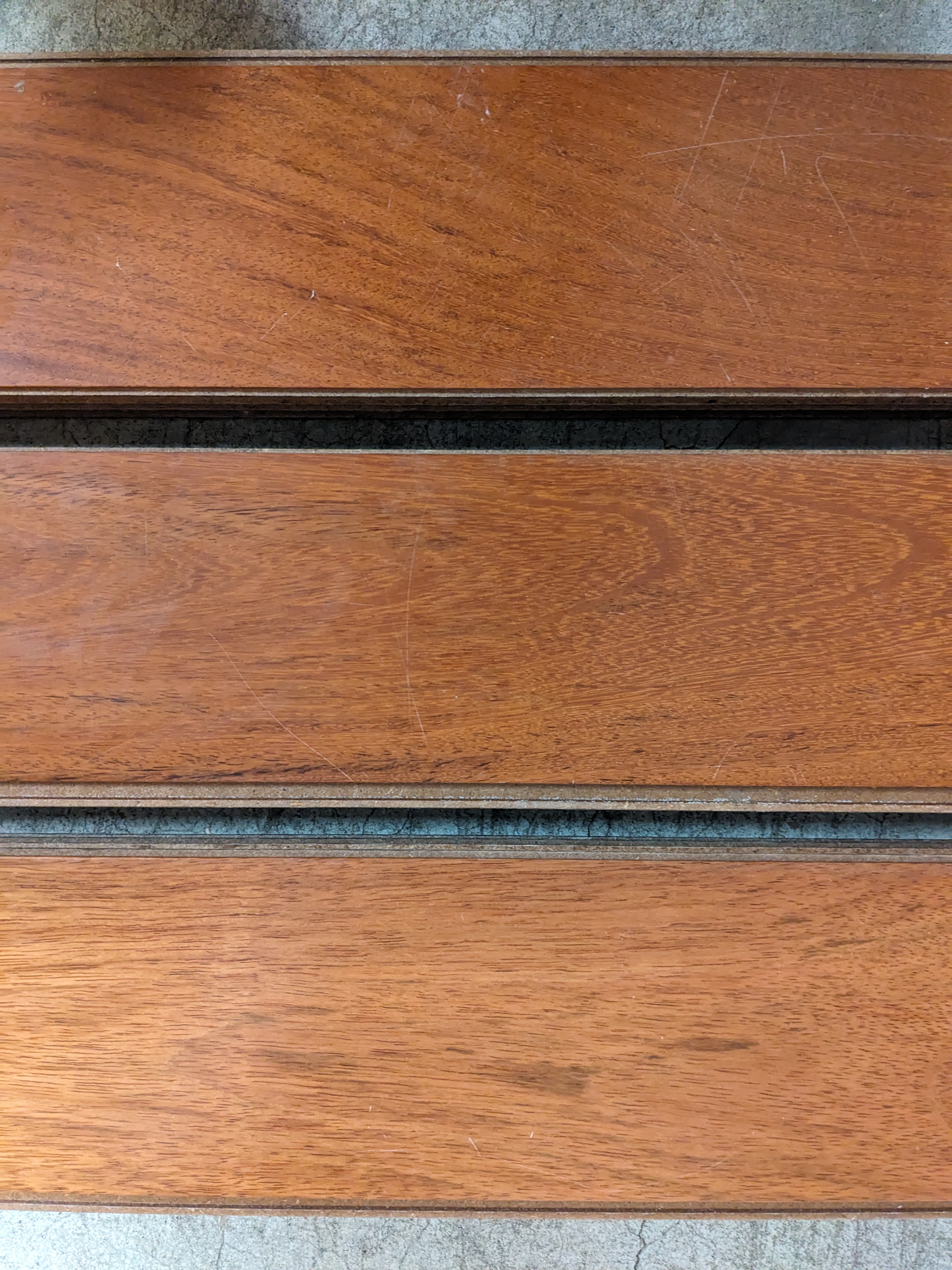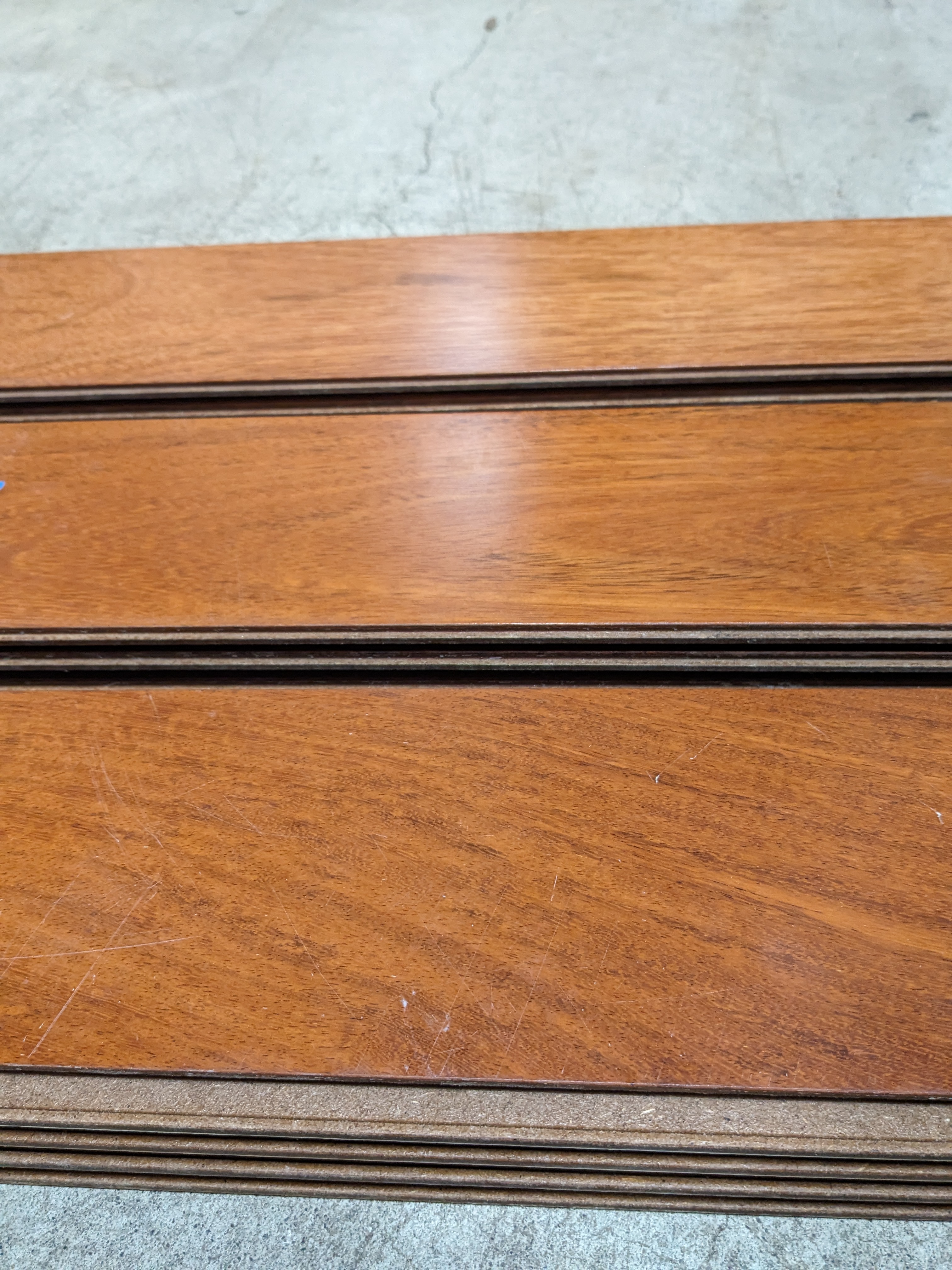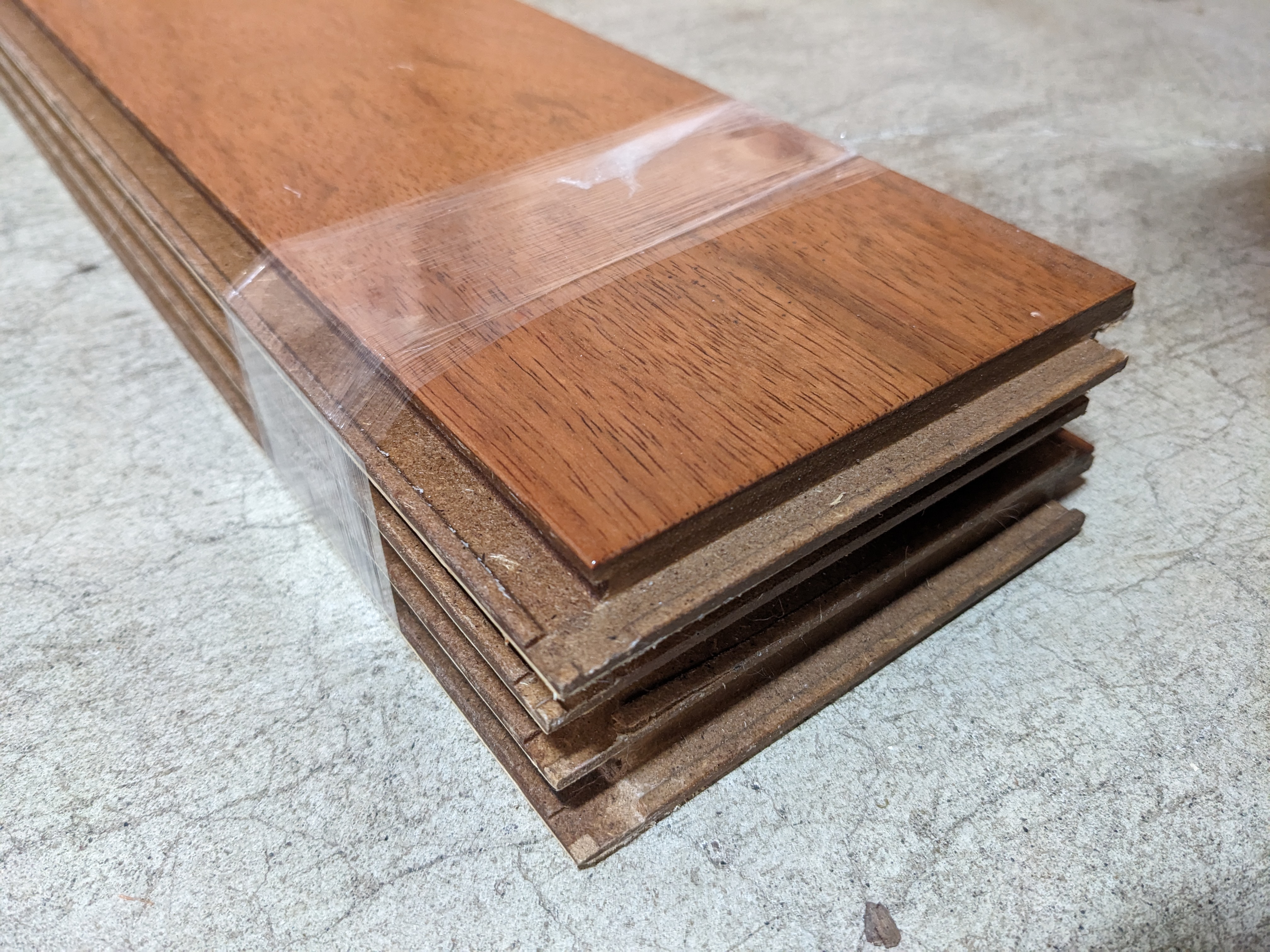This lot of engineered flooring is neatly packaged in bundles of 4 boards. Altogether, there is about 95 square feet of material. The boards measure 4.75 inches across, and the lengths vary between 17 and 47 inches. The species of wood appears similar to mahogany, and is a darker reddish color.