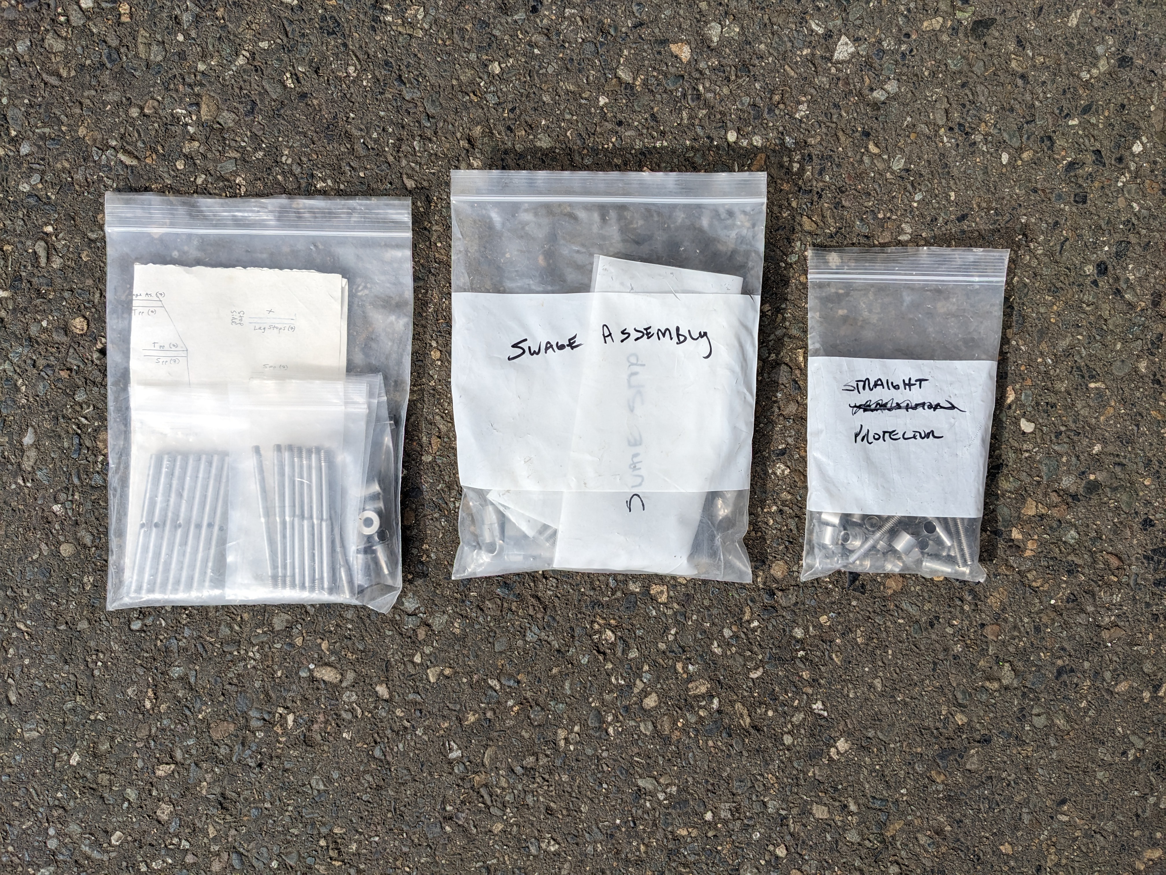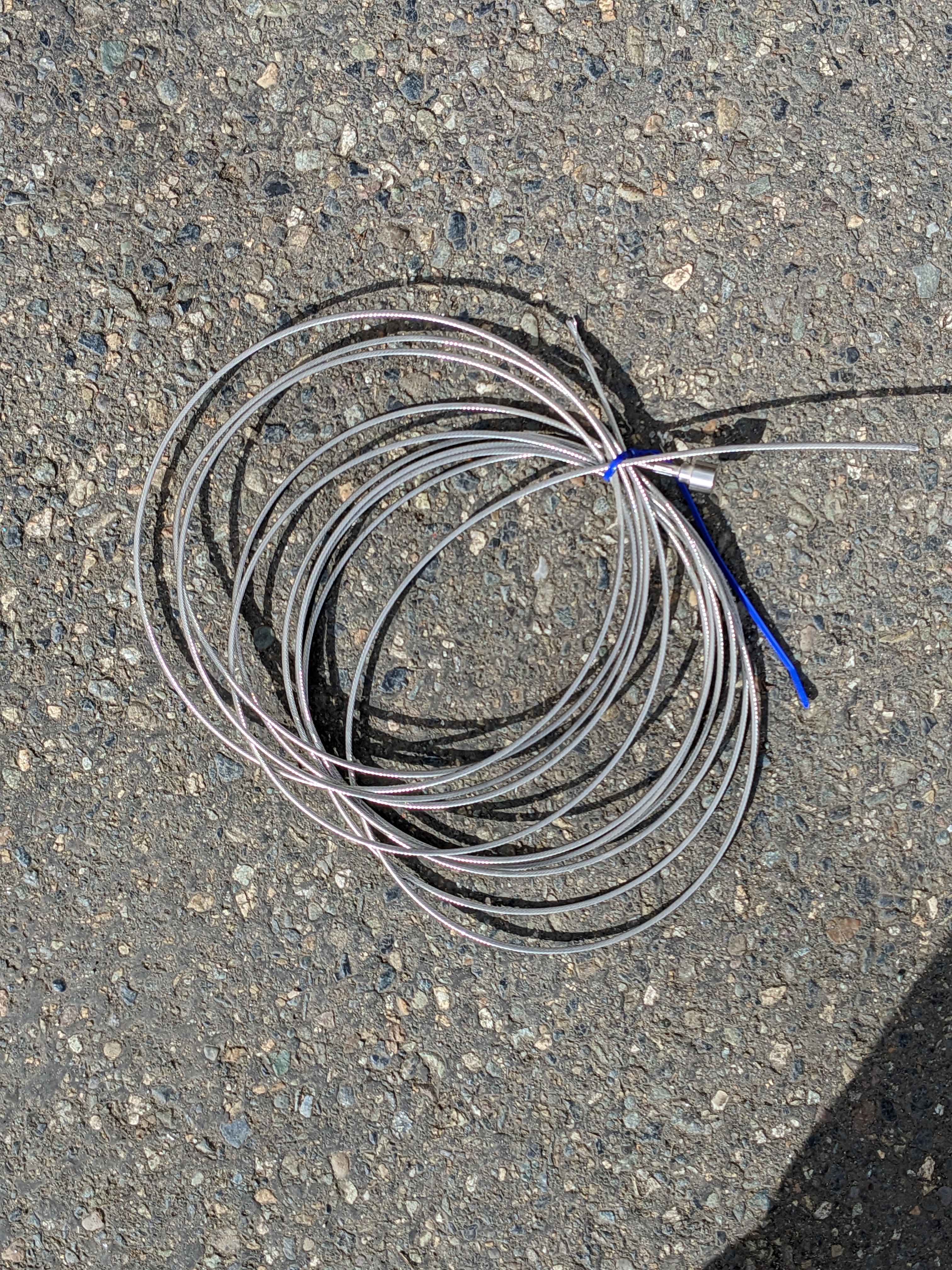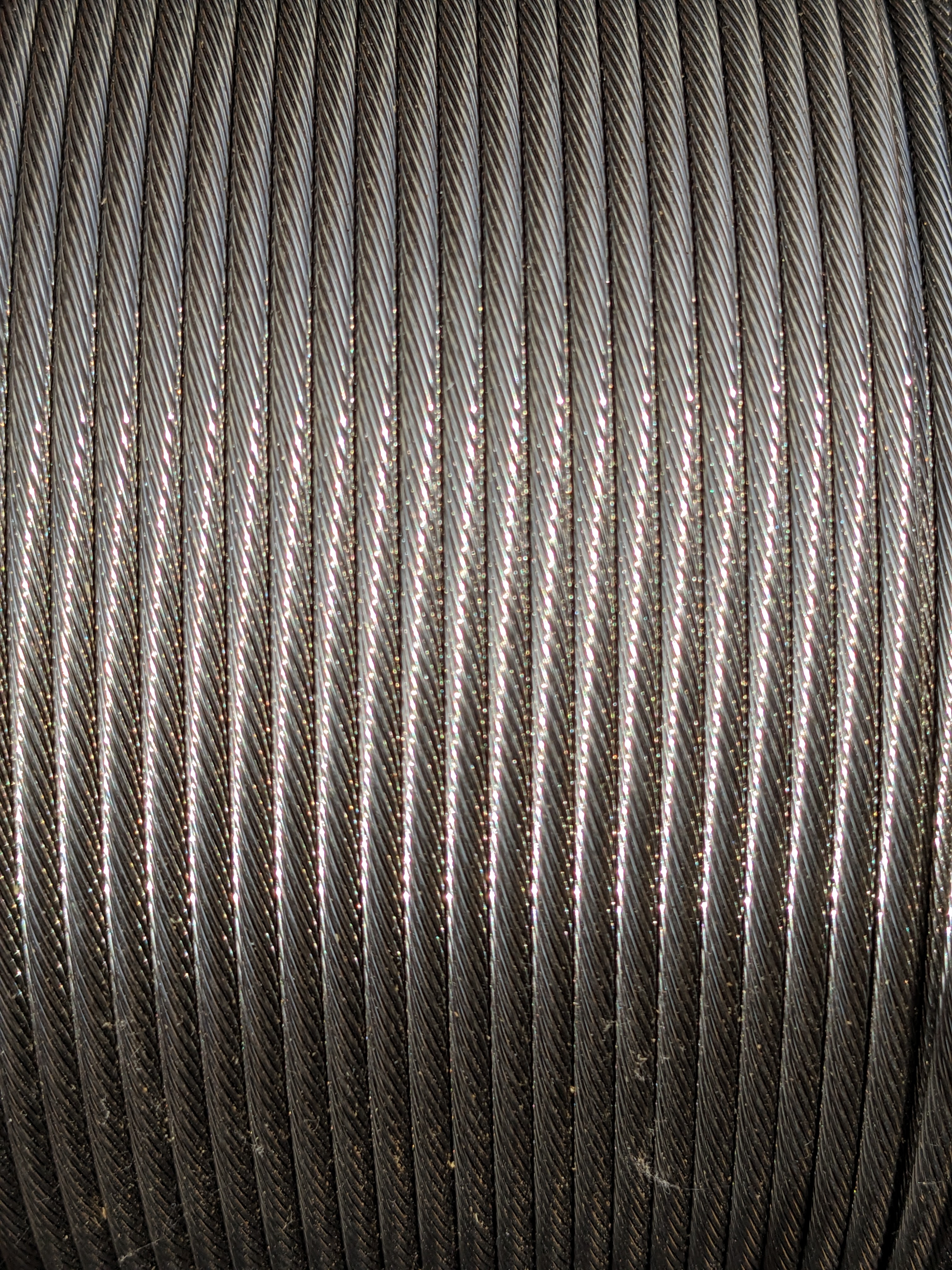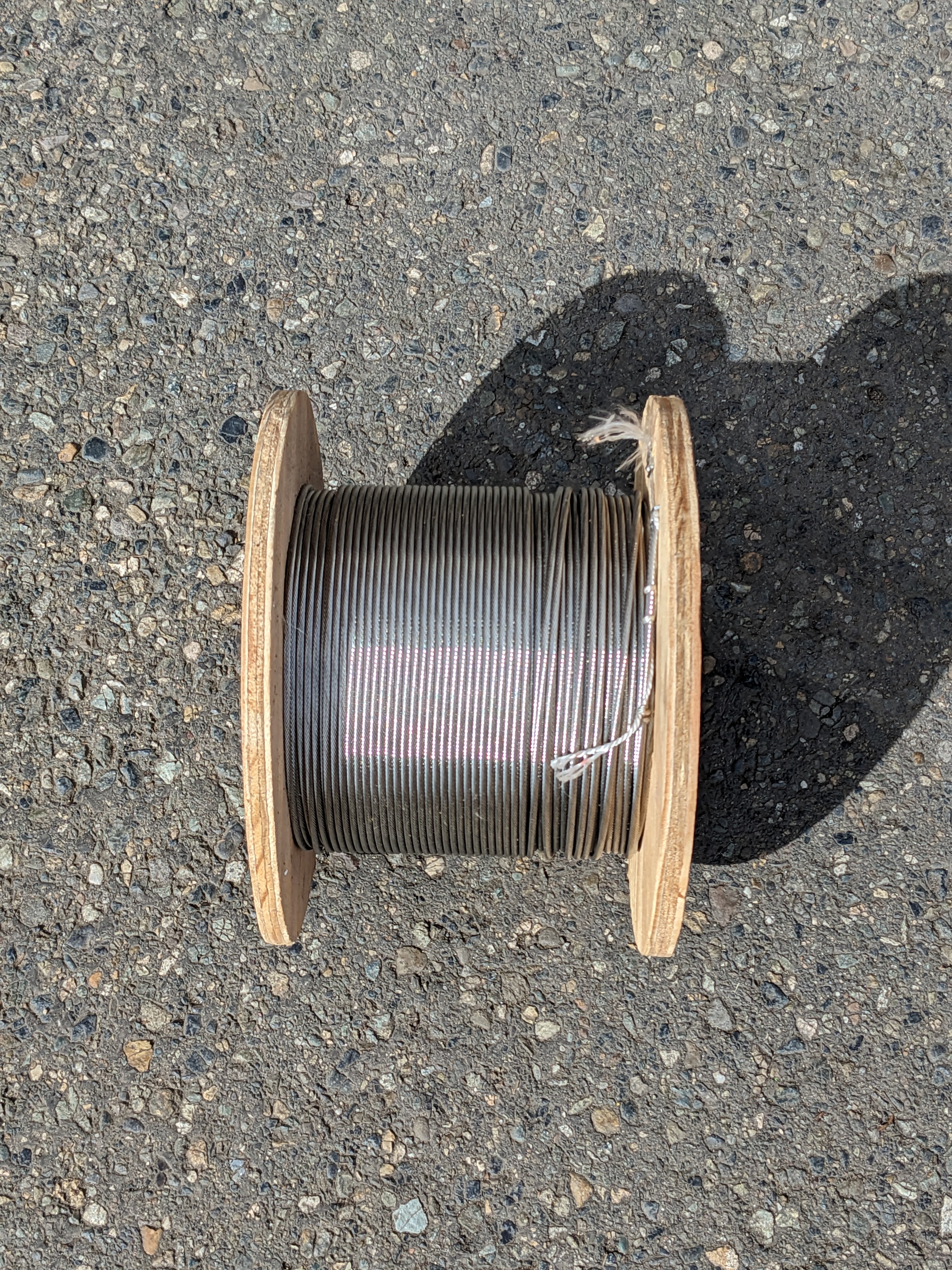 Spool of steel cable cord. Looking sleek and shiny at.125 inch thickness at an unspecified length, we would have to unspool all of it to find out. Comes with swage assembly hardware and lag stops. Would make quite the stylish railing.