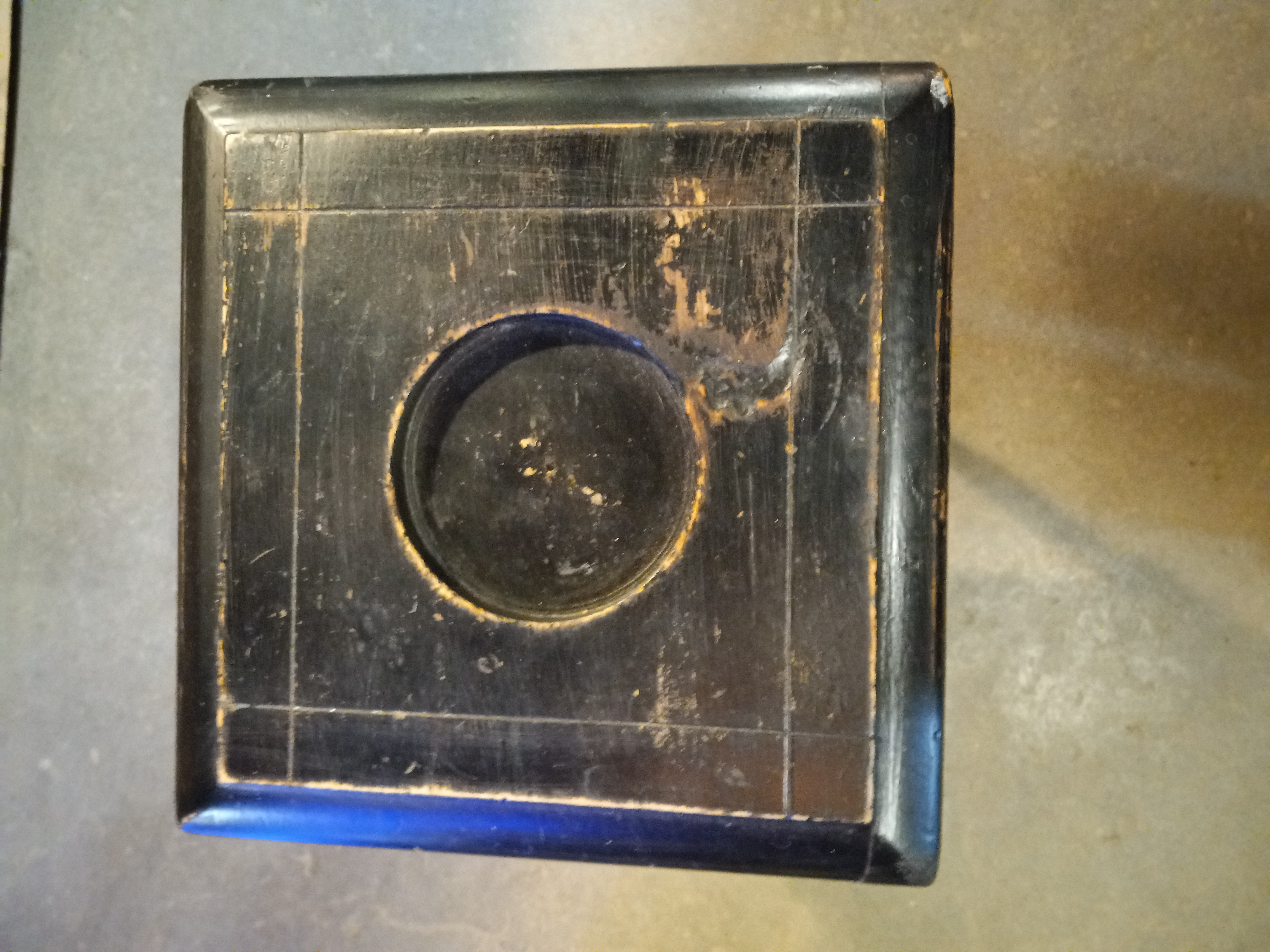 Interesting small side table with a round area area cut out on the top possibly for an ashtray or for it would work well for car keys and change.