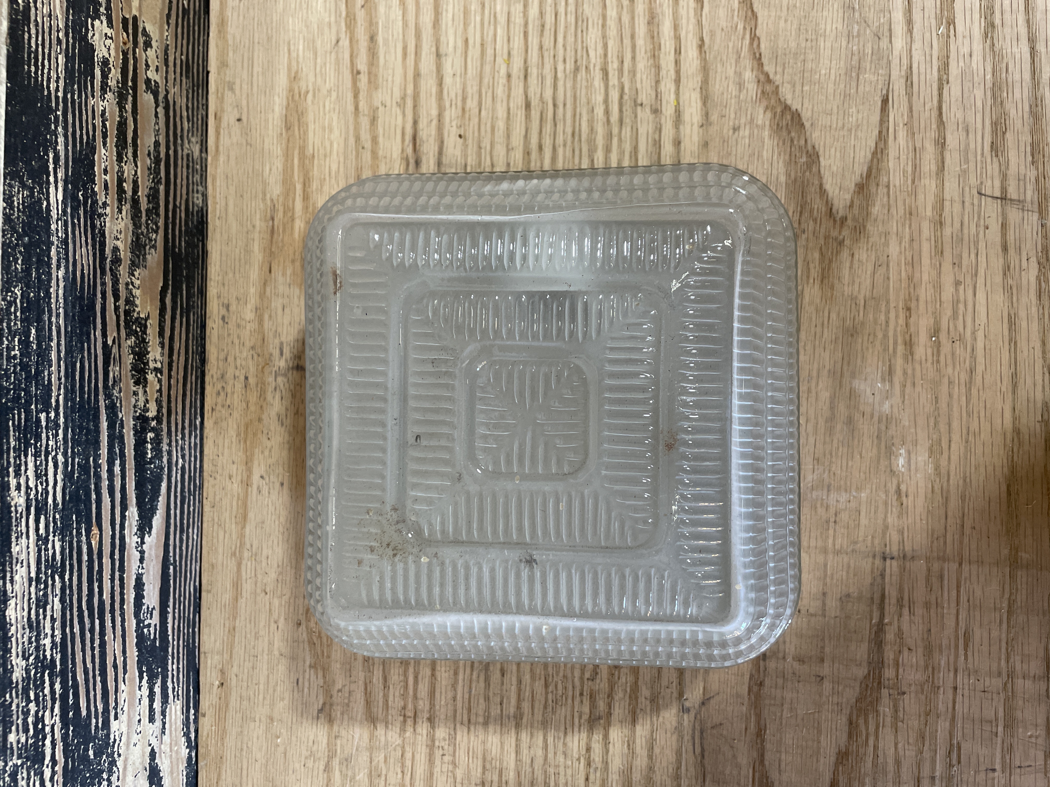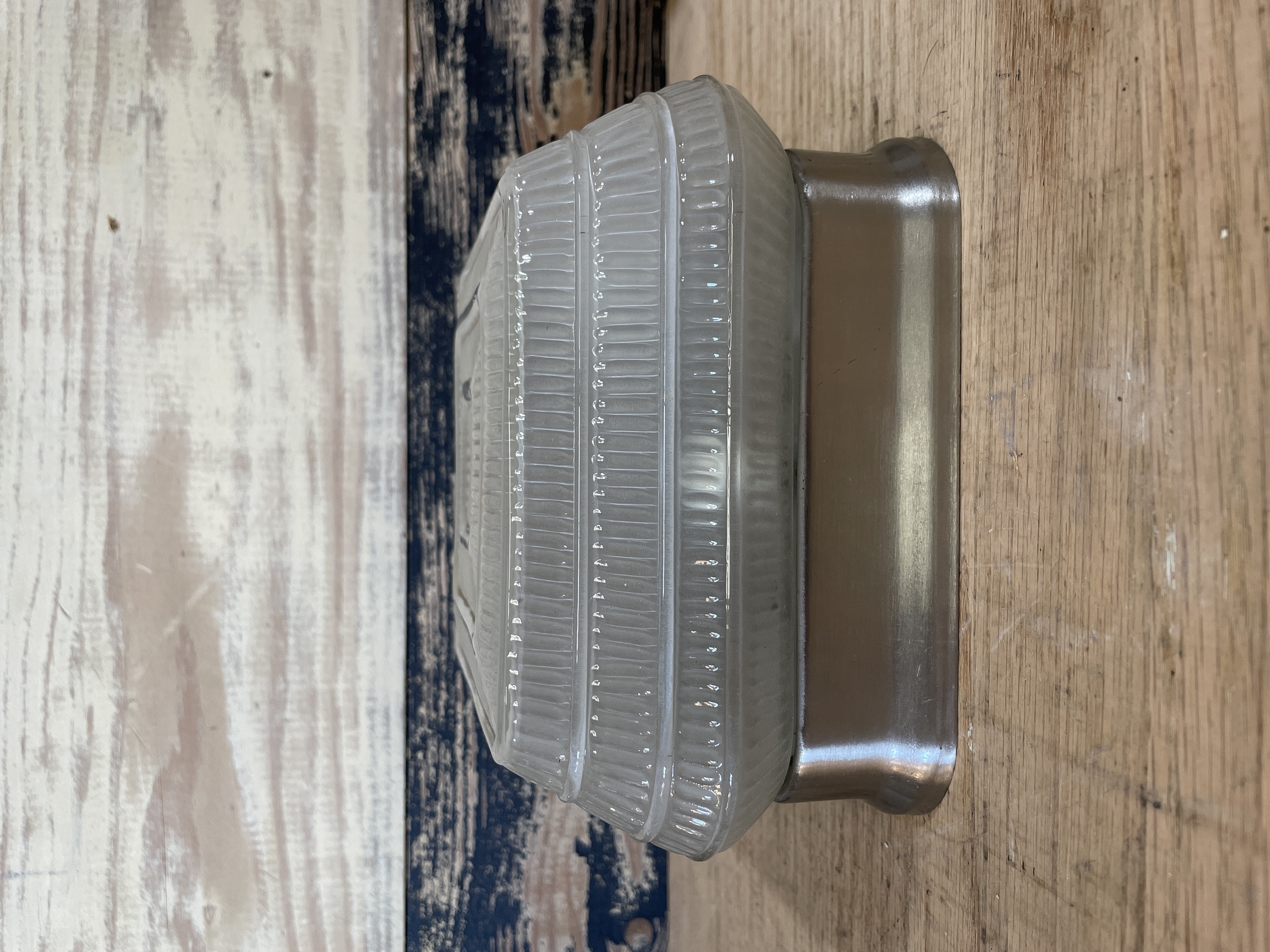 Heavy frosted and ribbed glass shade with a brushed silver base. No chips or scratches.