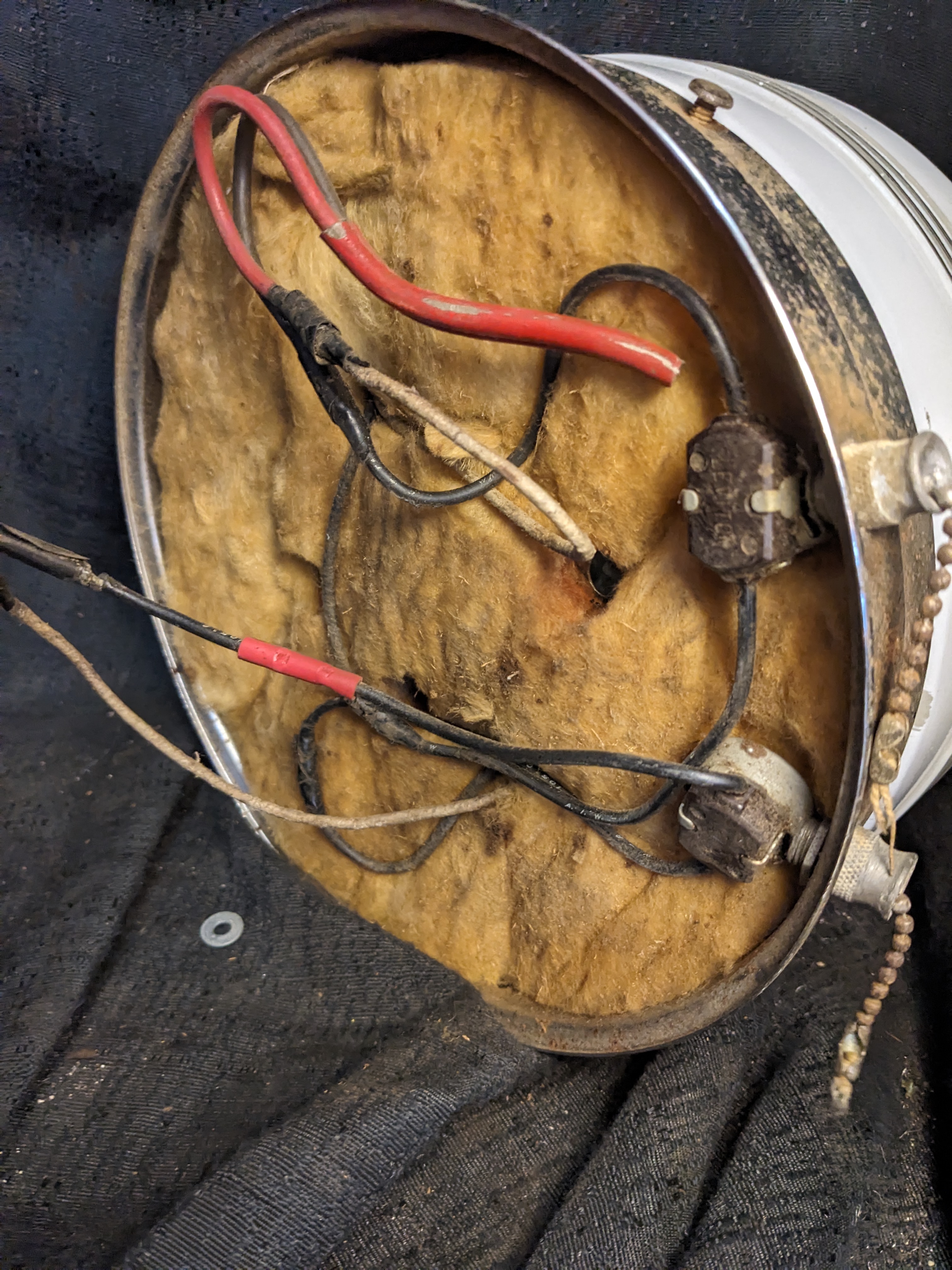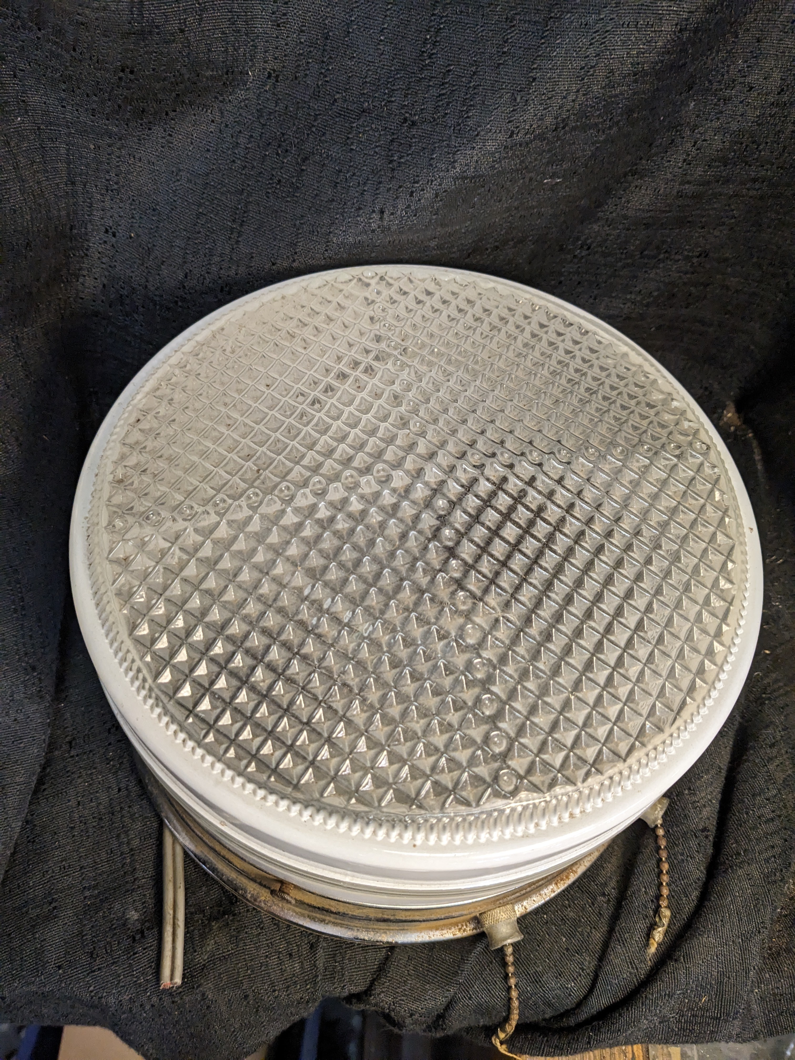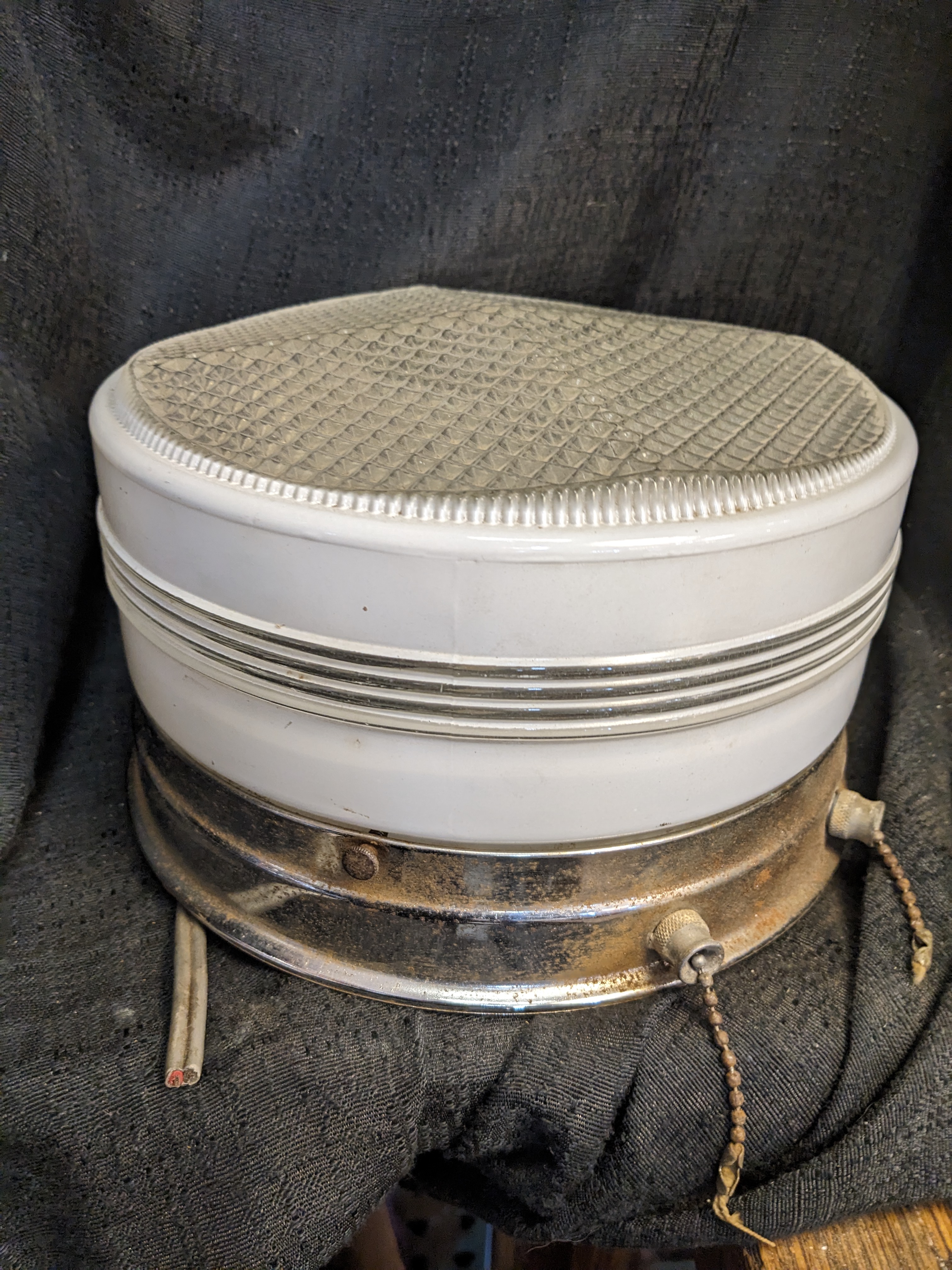 Round shade of clear and painted white glass. Chrome fitter is getting pitted but it cleans up with a fine steel wool, it ho)$s 2 bulbs and has 2 pull chain switches.