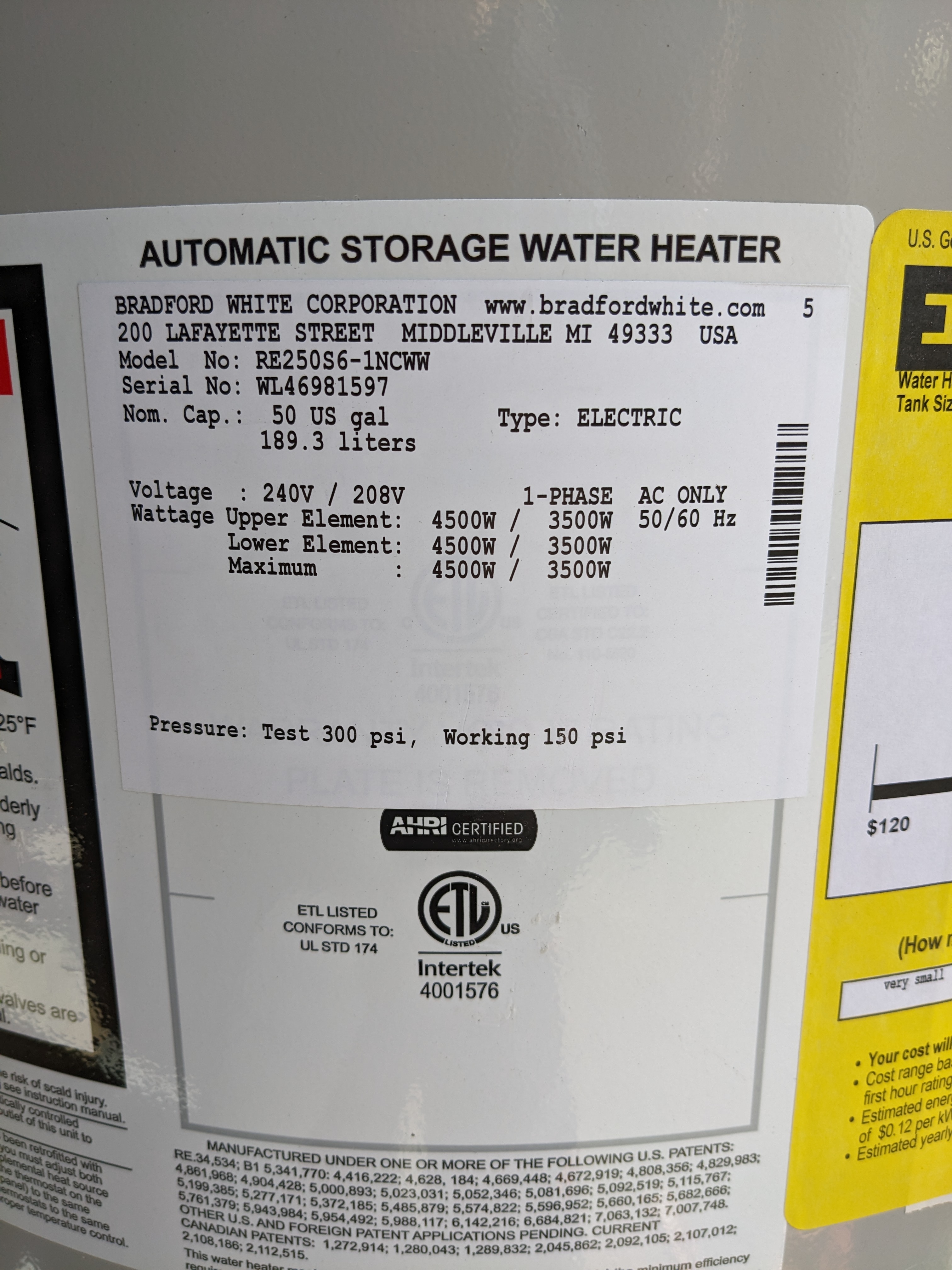Bradford White corp. Branded 50 gal water heater !