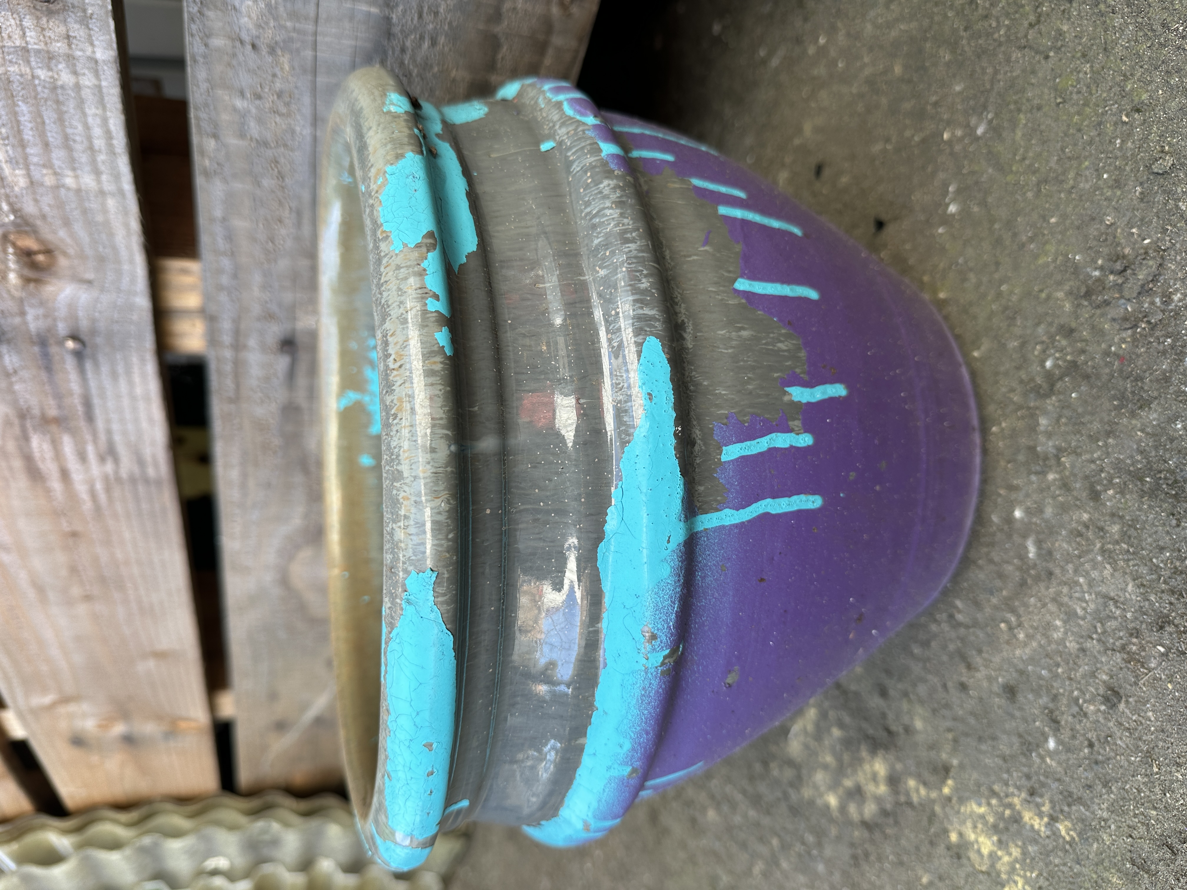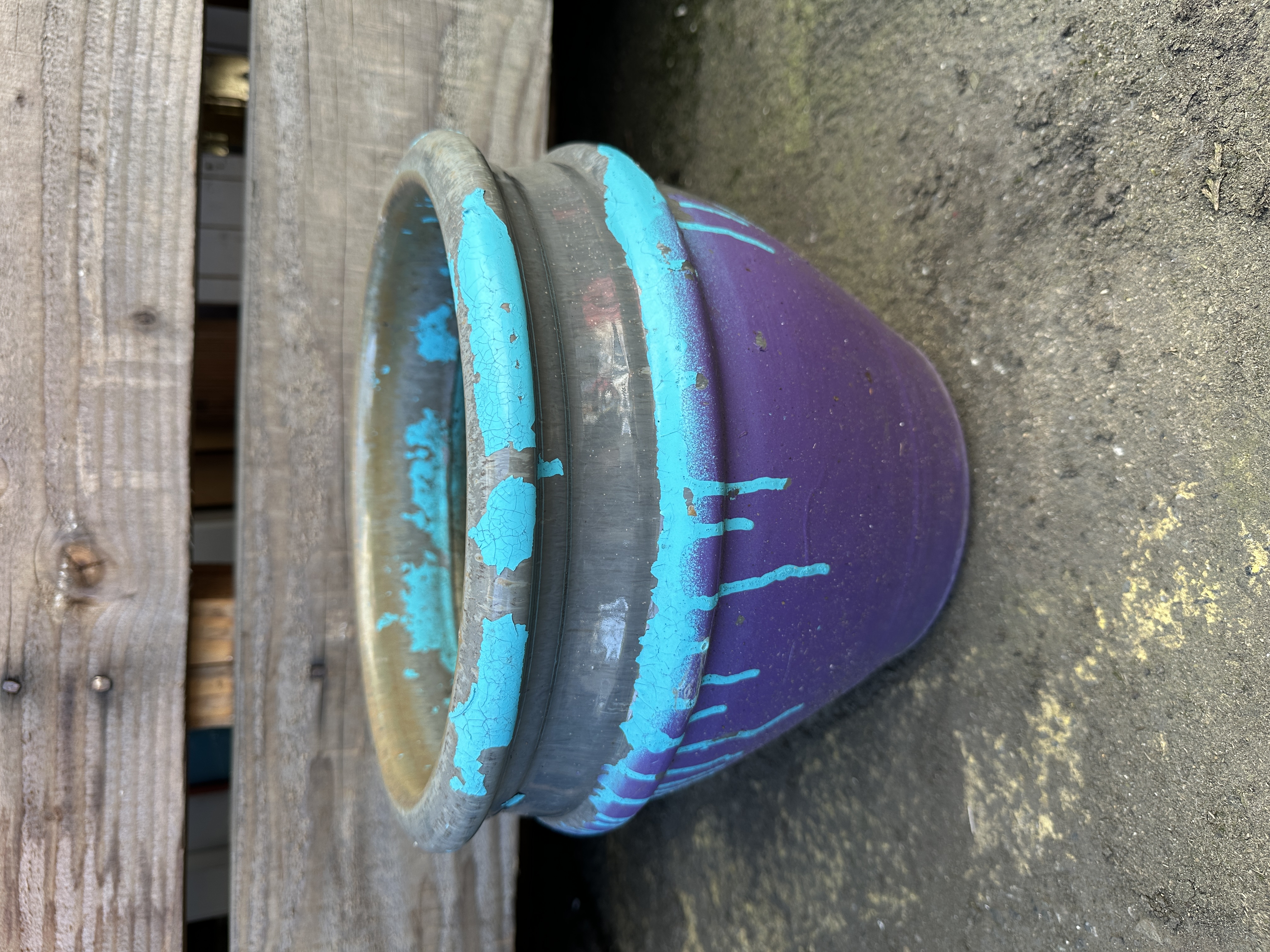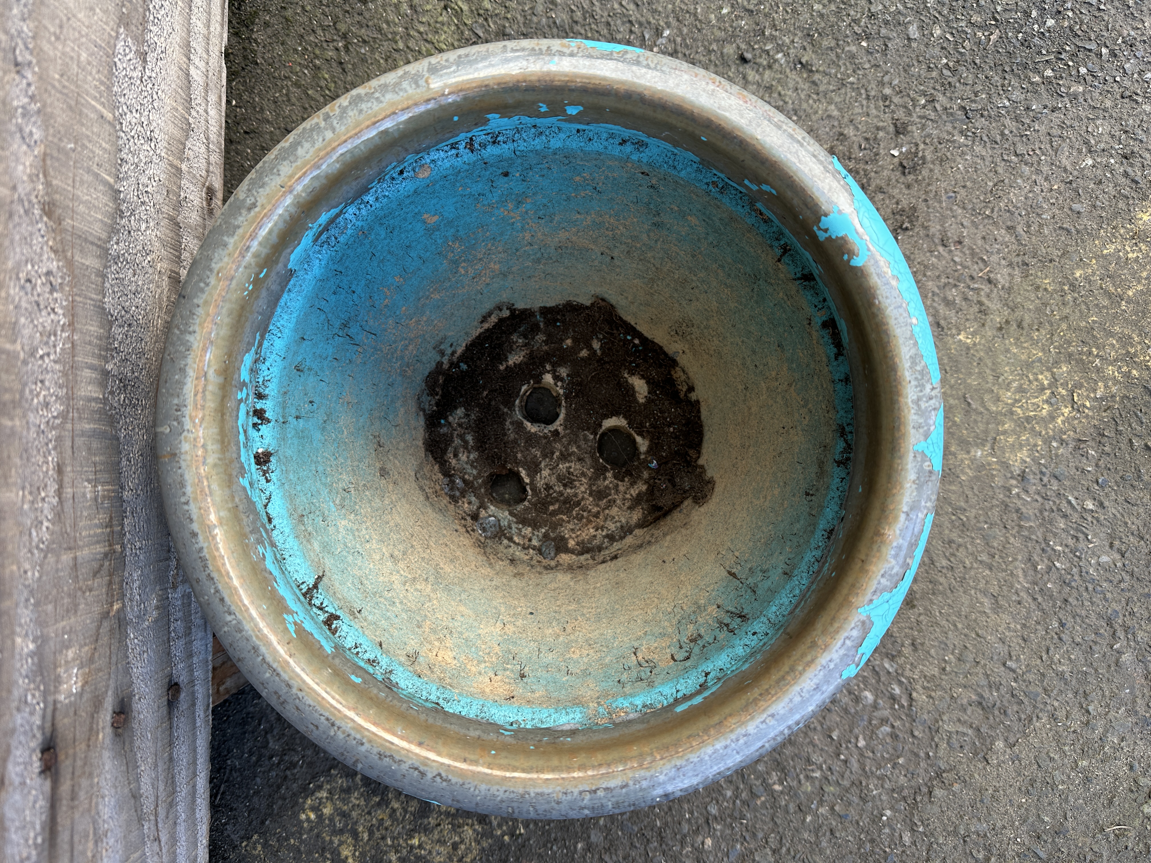 Nice small glazed planter that someone unfortunately painted over with latex paint. Spend an afternoon peeling it off and enjoy the original glazed gray. Has three drainage holes on the bottom and it’s in good shape.