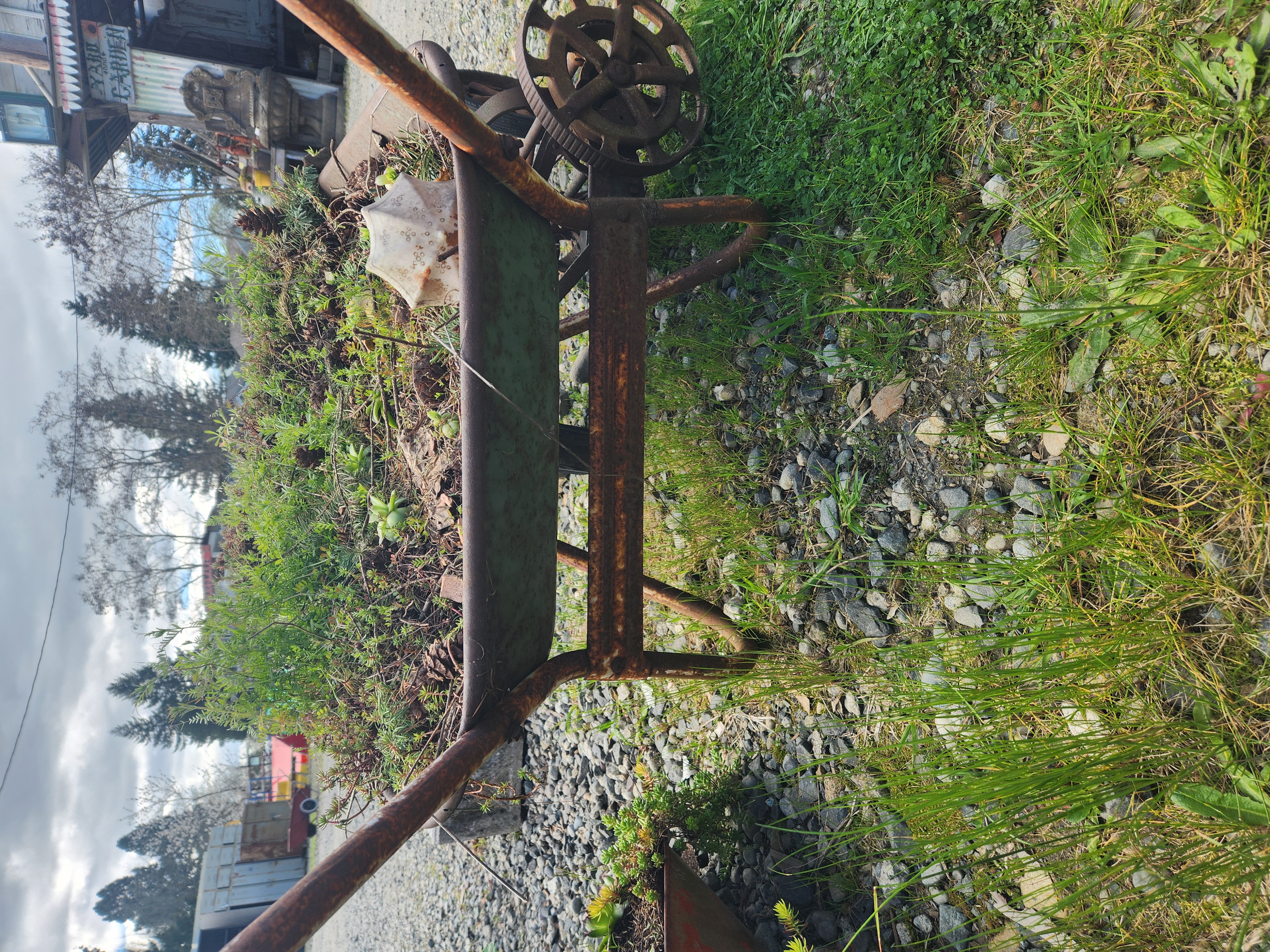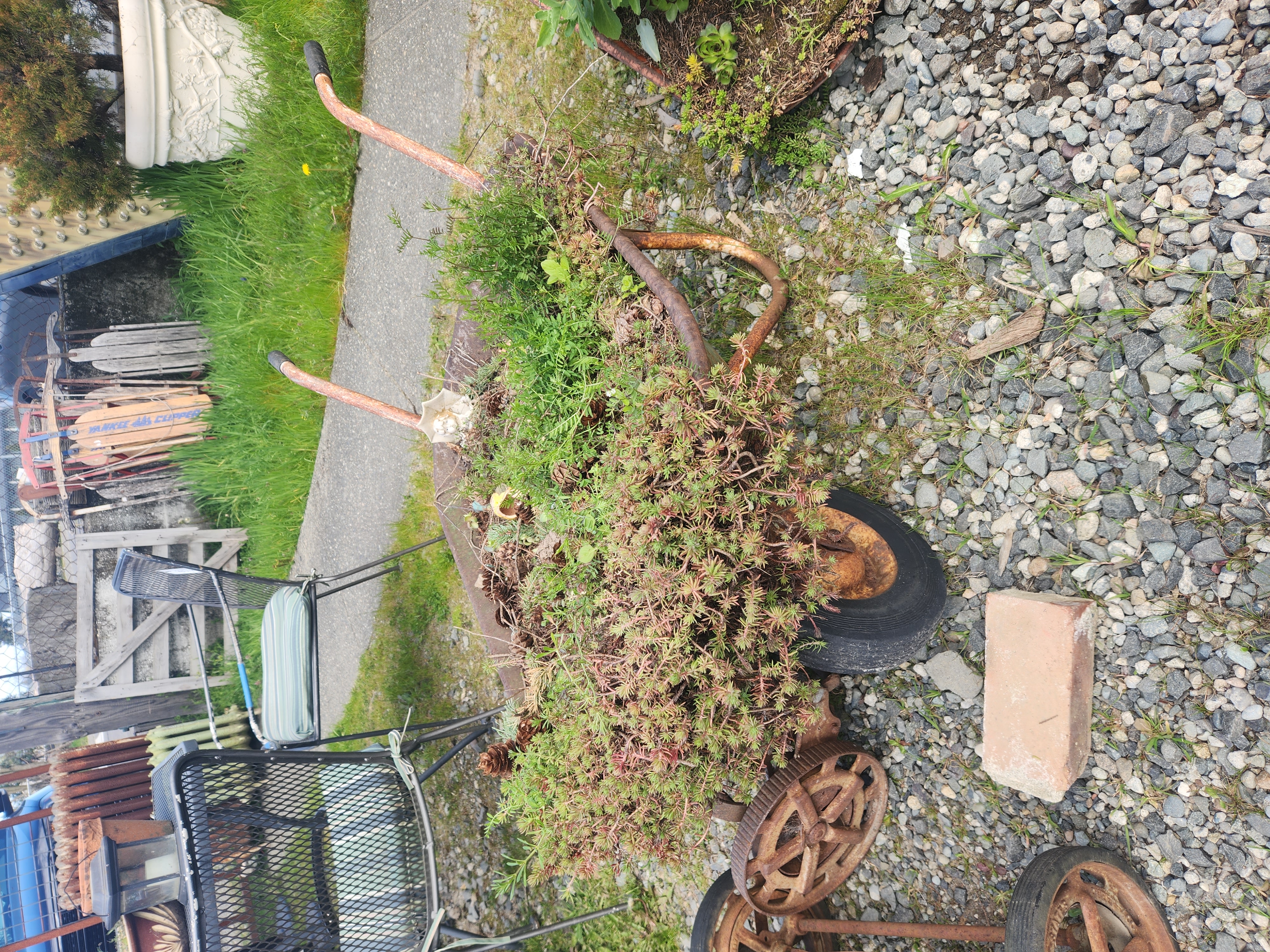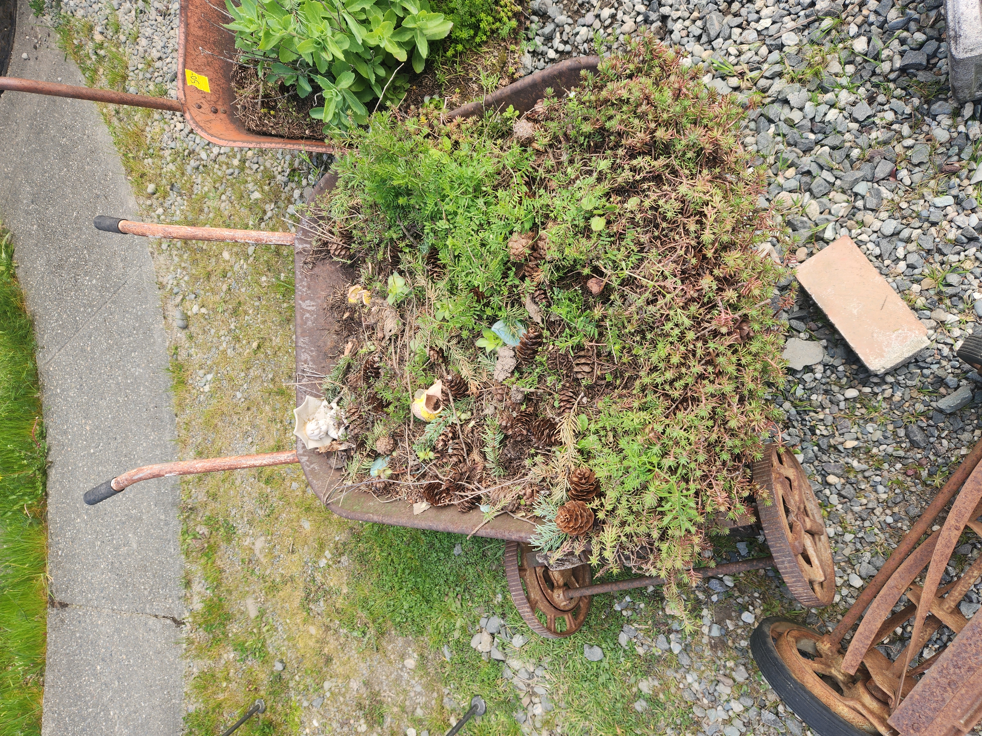 A rusty old wheelbarrow full of life. A variety of succulents spill over the side, making for a nice and rustic garden addition! Measures roughly 26 x 22 x 50.
