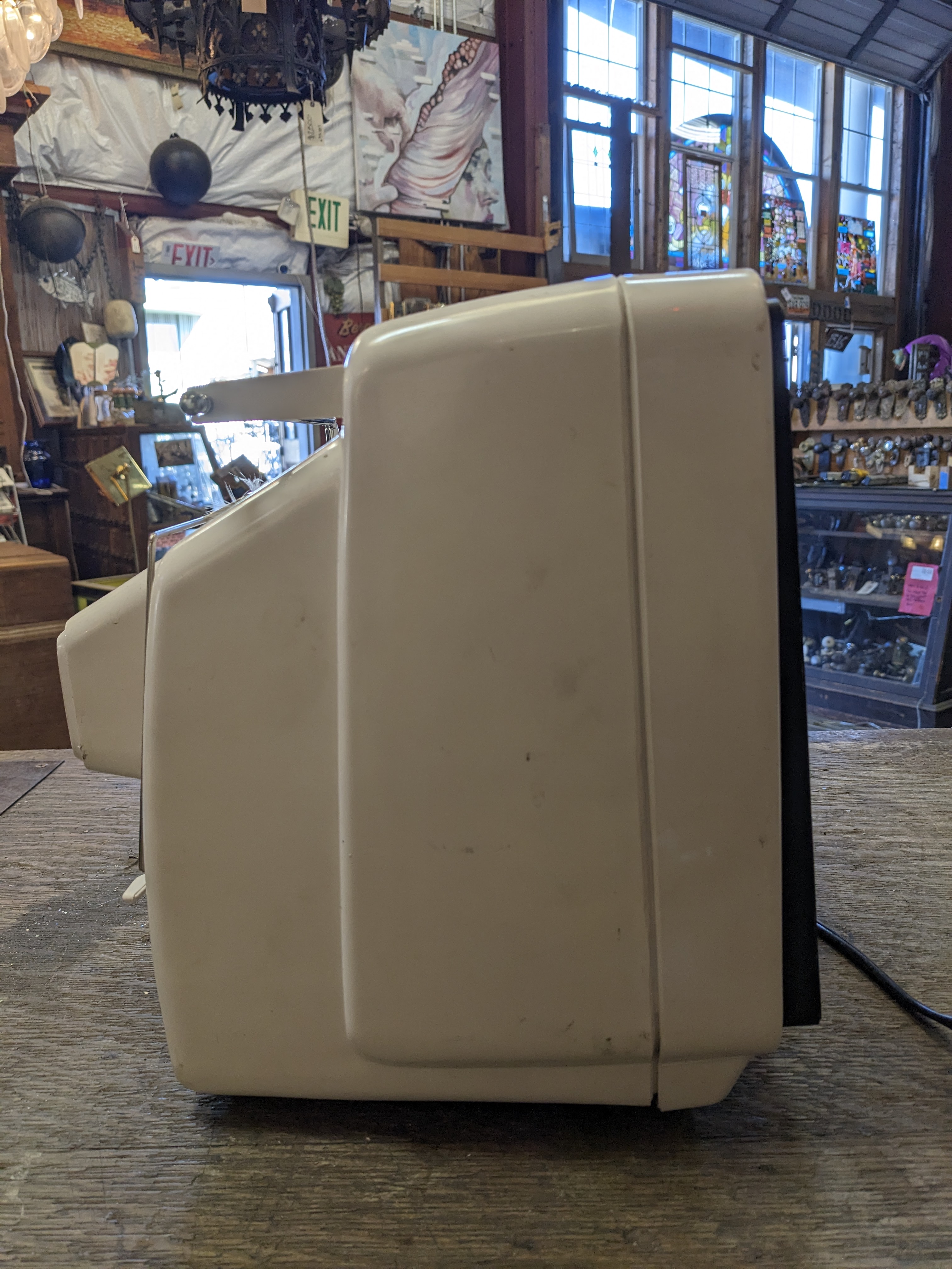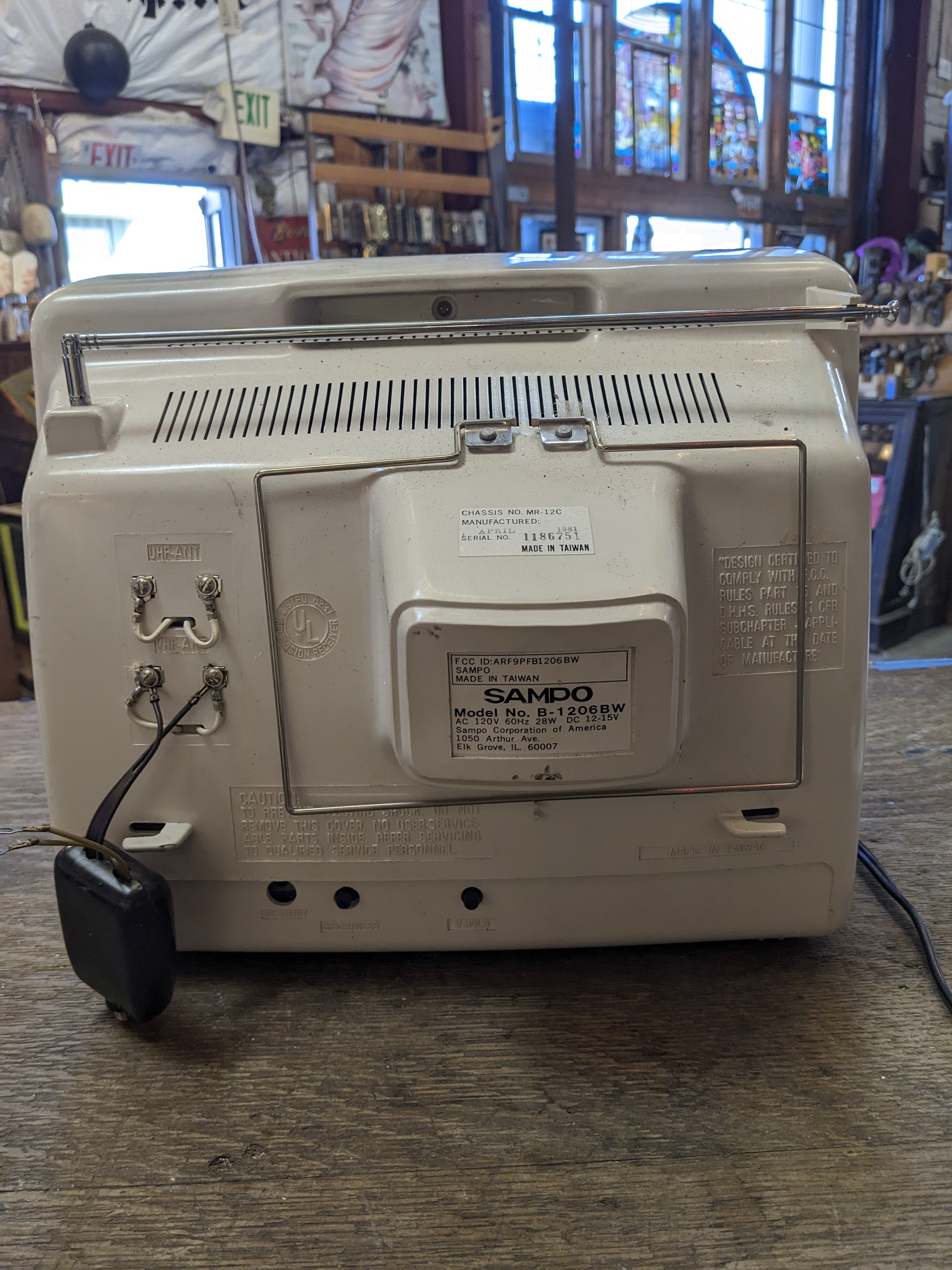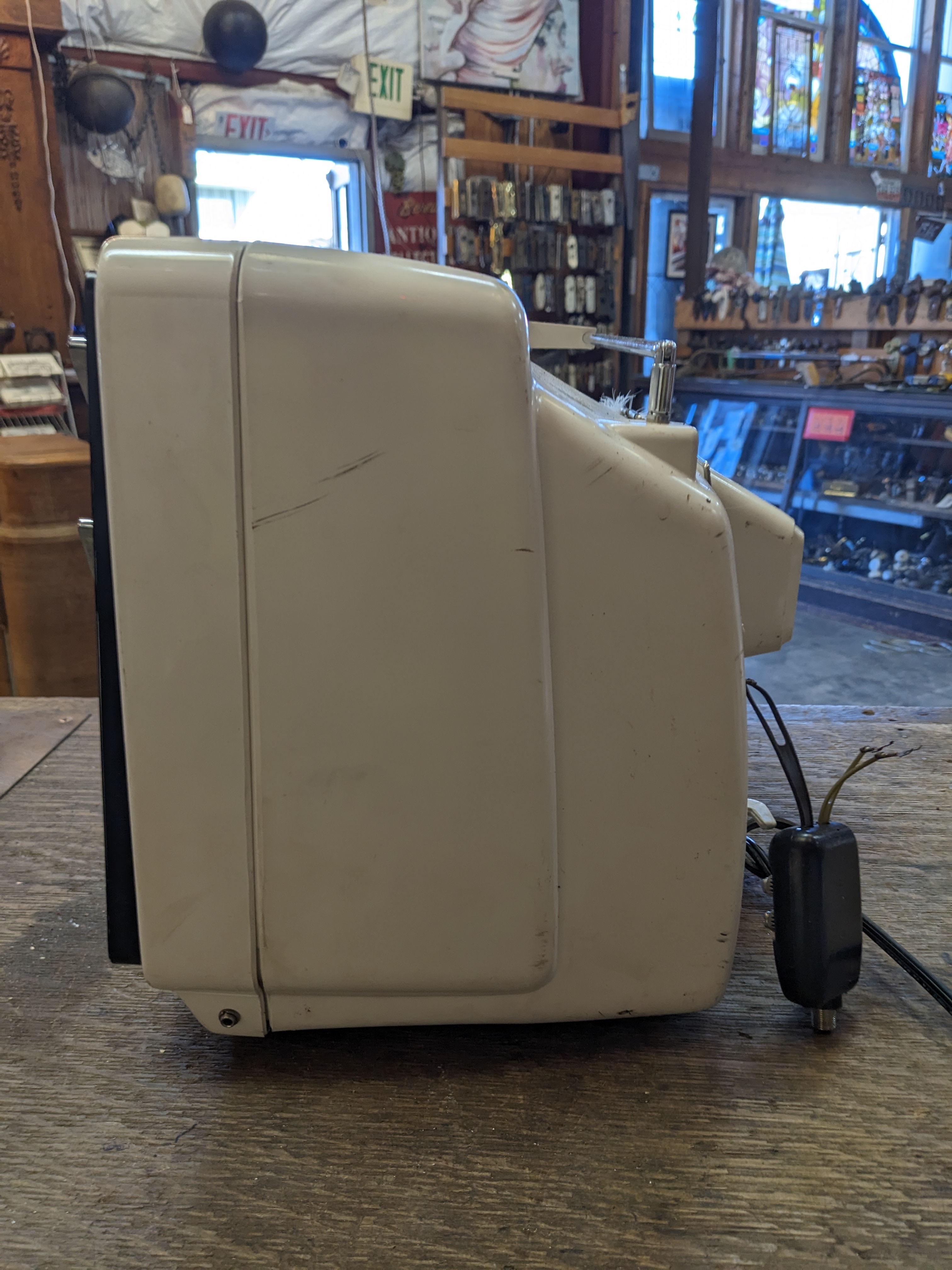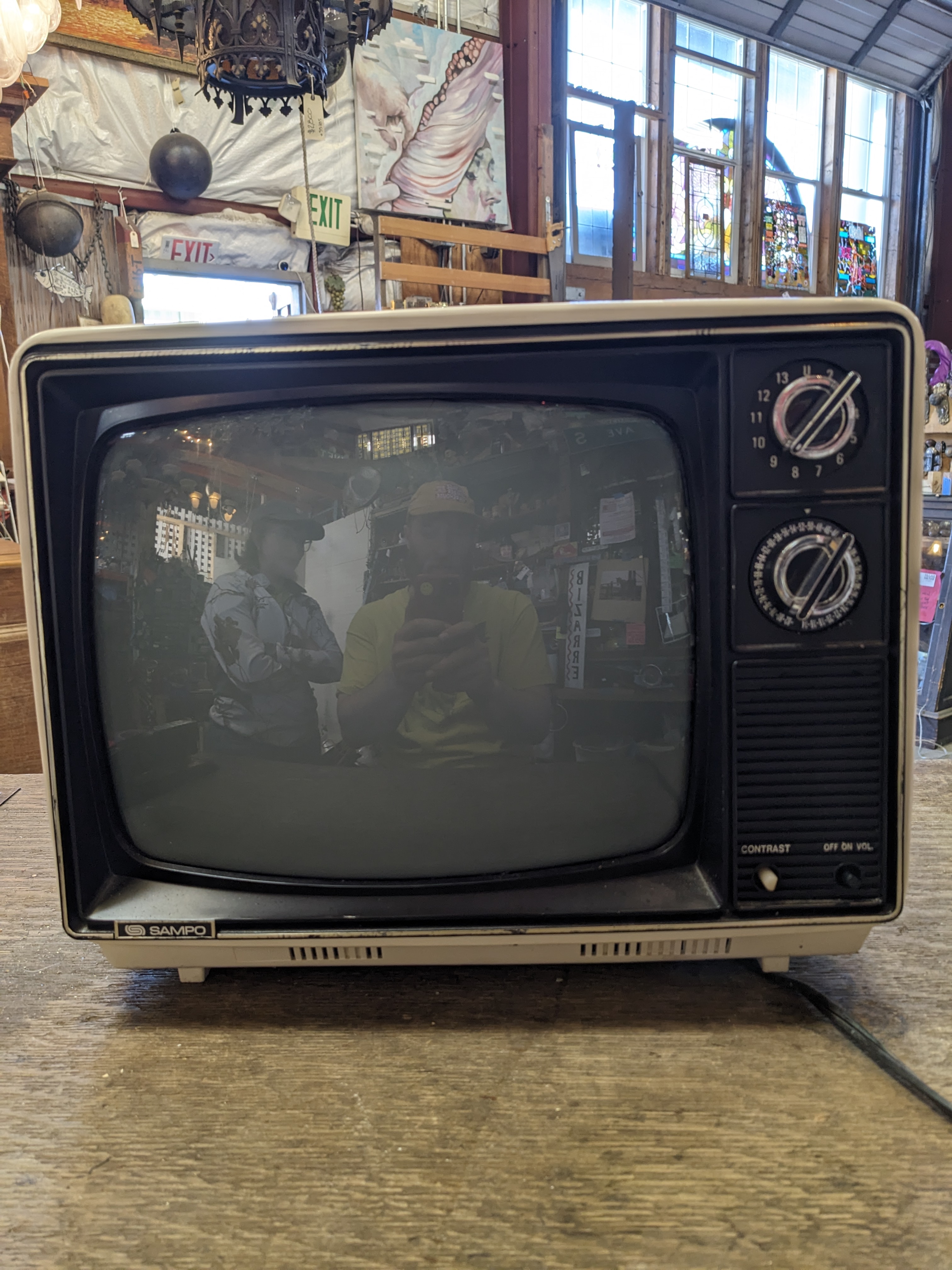 A super cool retro tv! It's portable, it works, and has fun dials and knobs. It's in black and white and a fun piece for an art piece or a project.