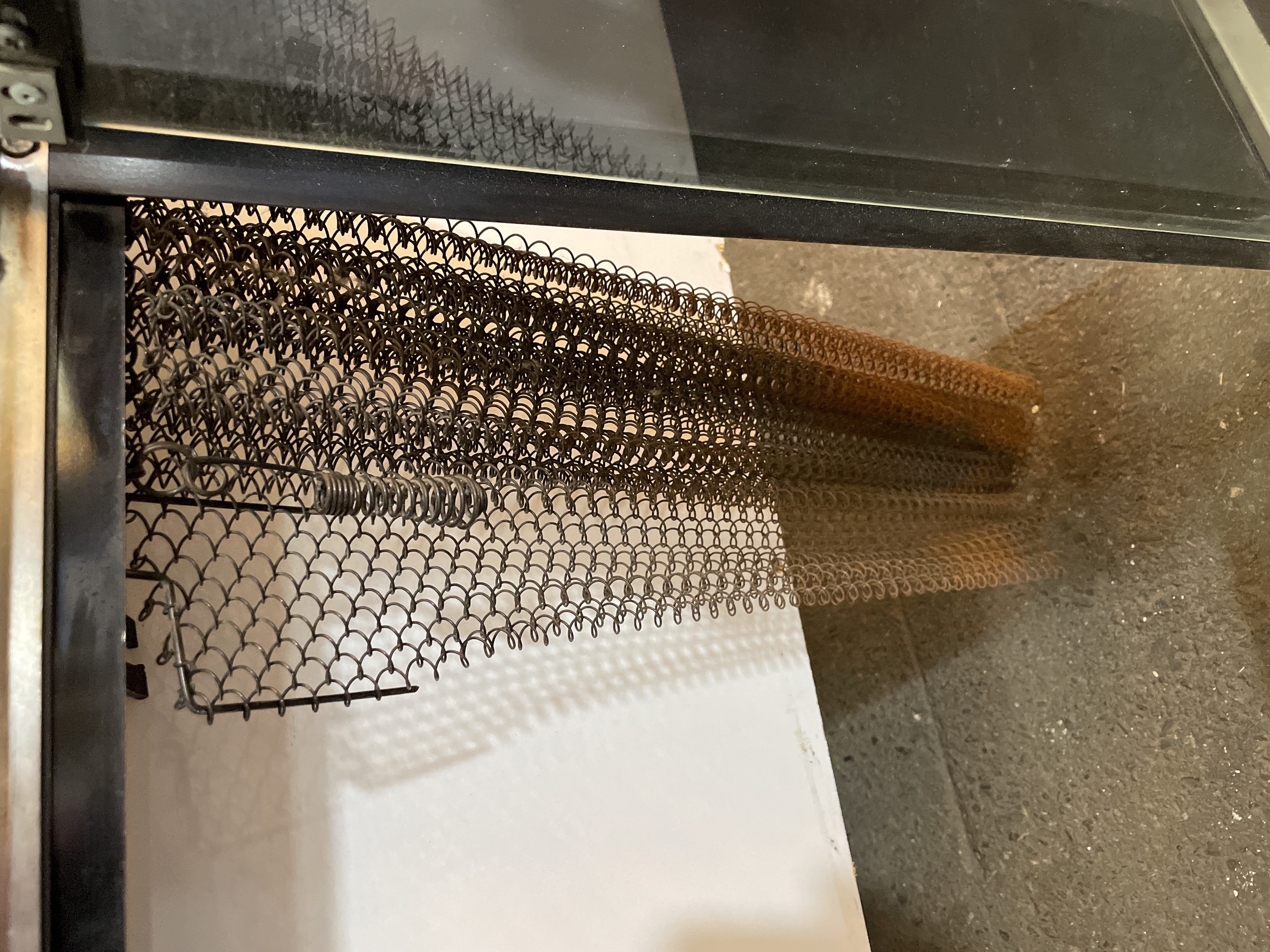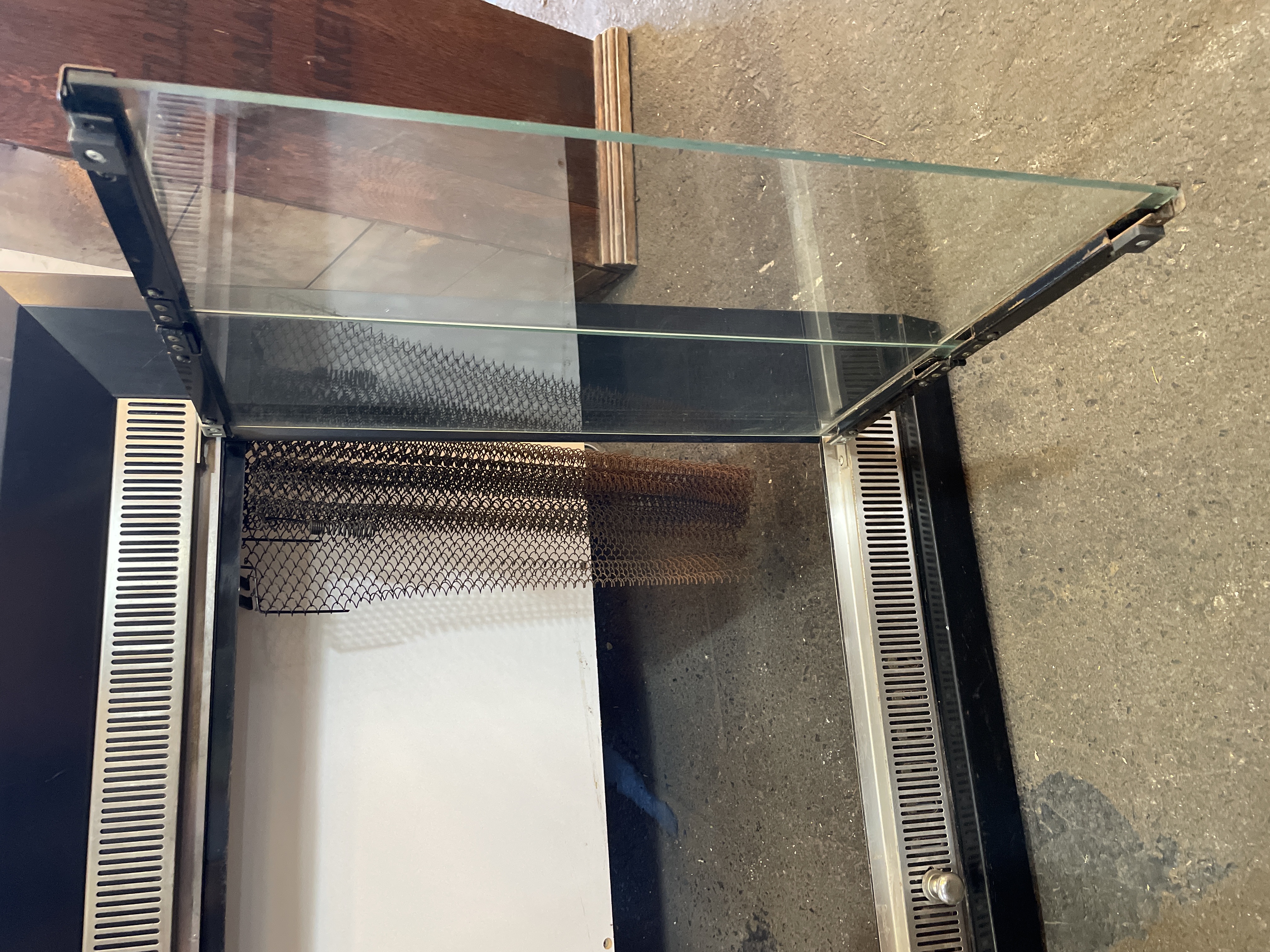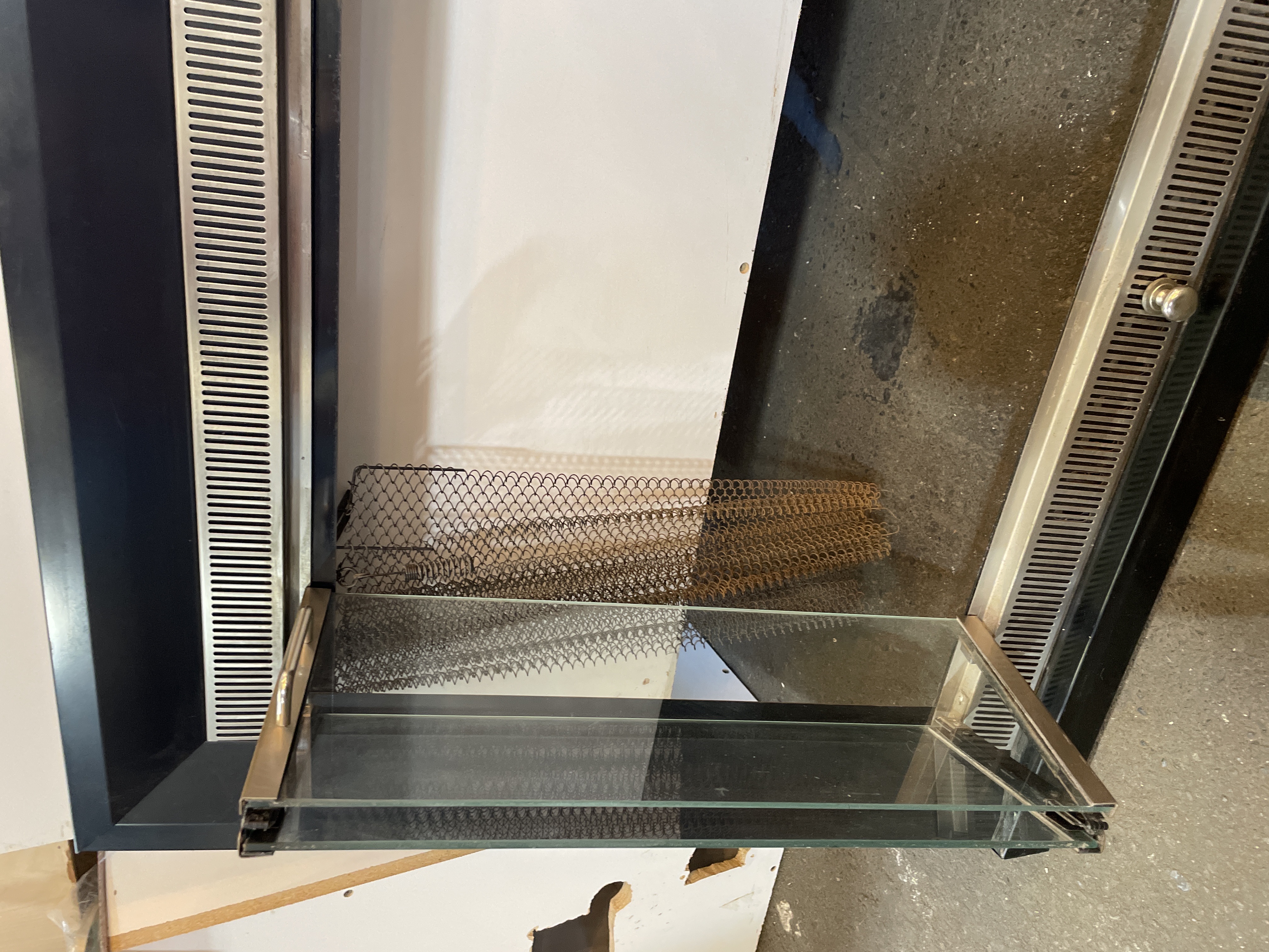 Black and silver surround glass bifold doors with an integrated mesh screen. Slotted vents on top and bottom for airflow.