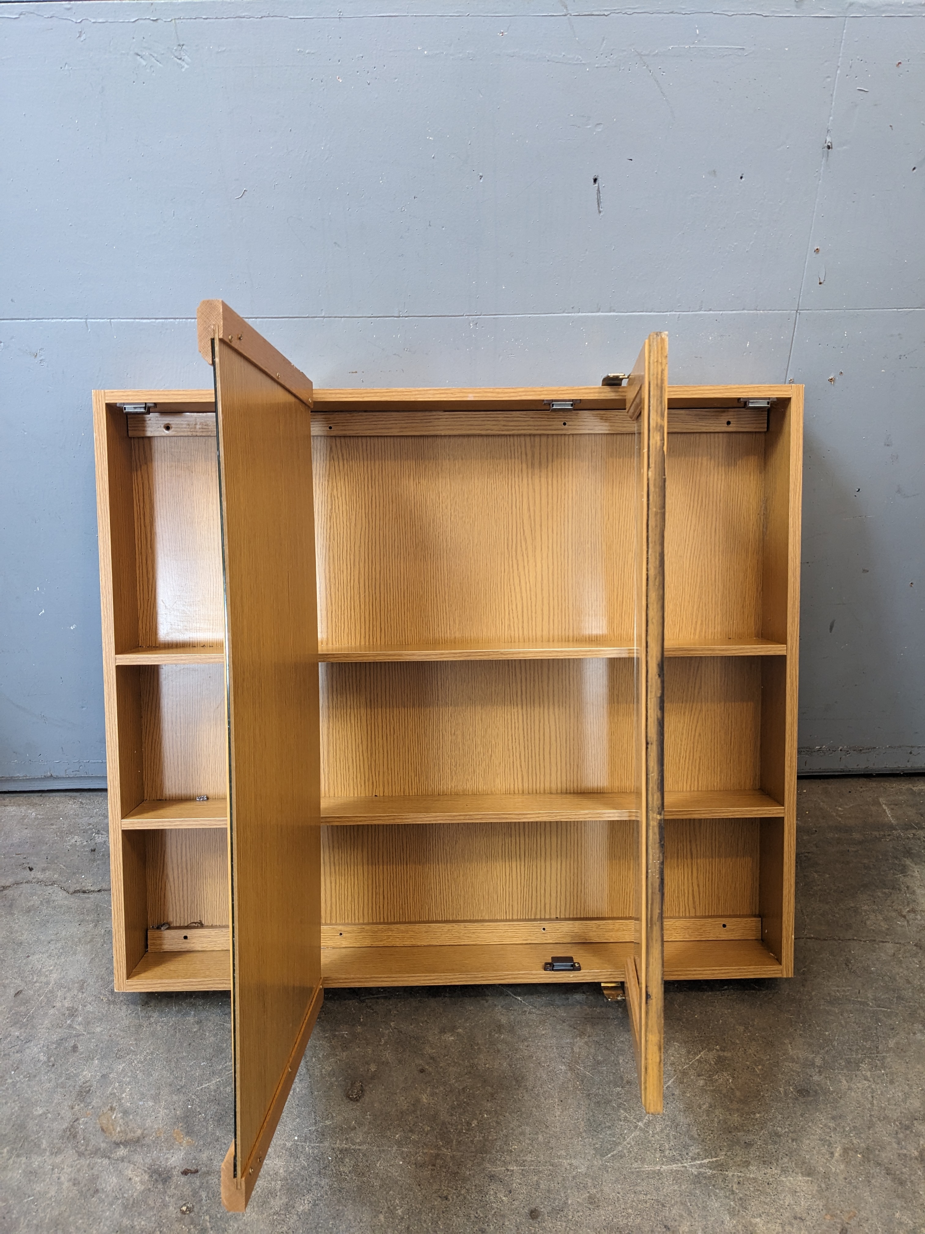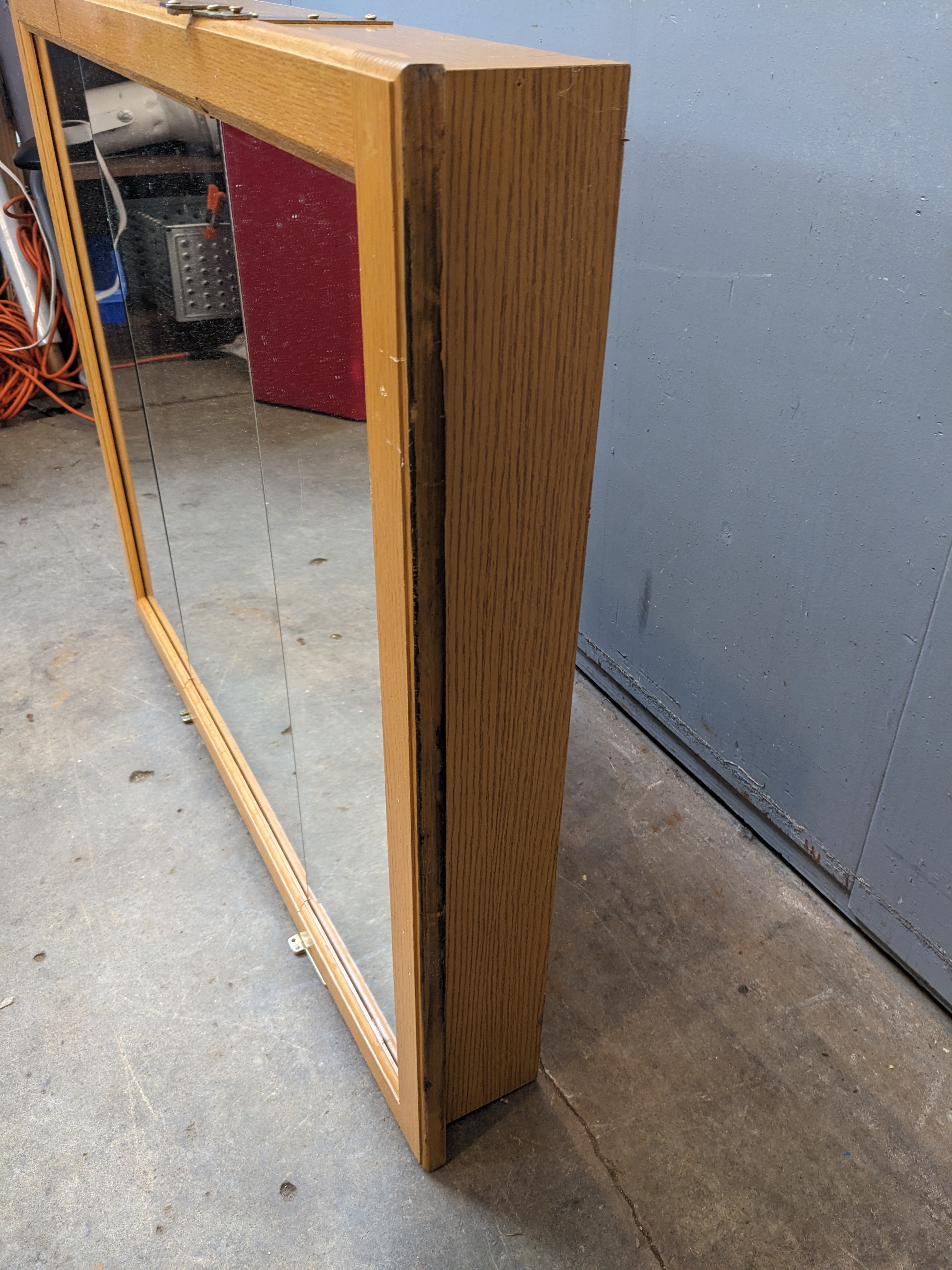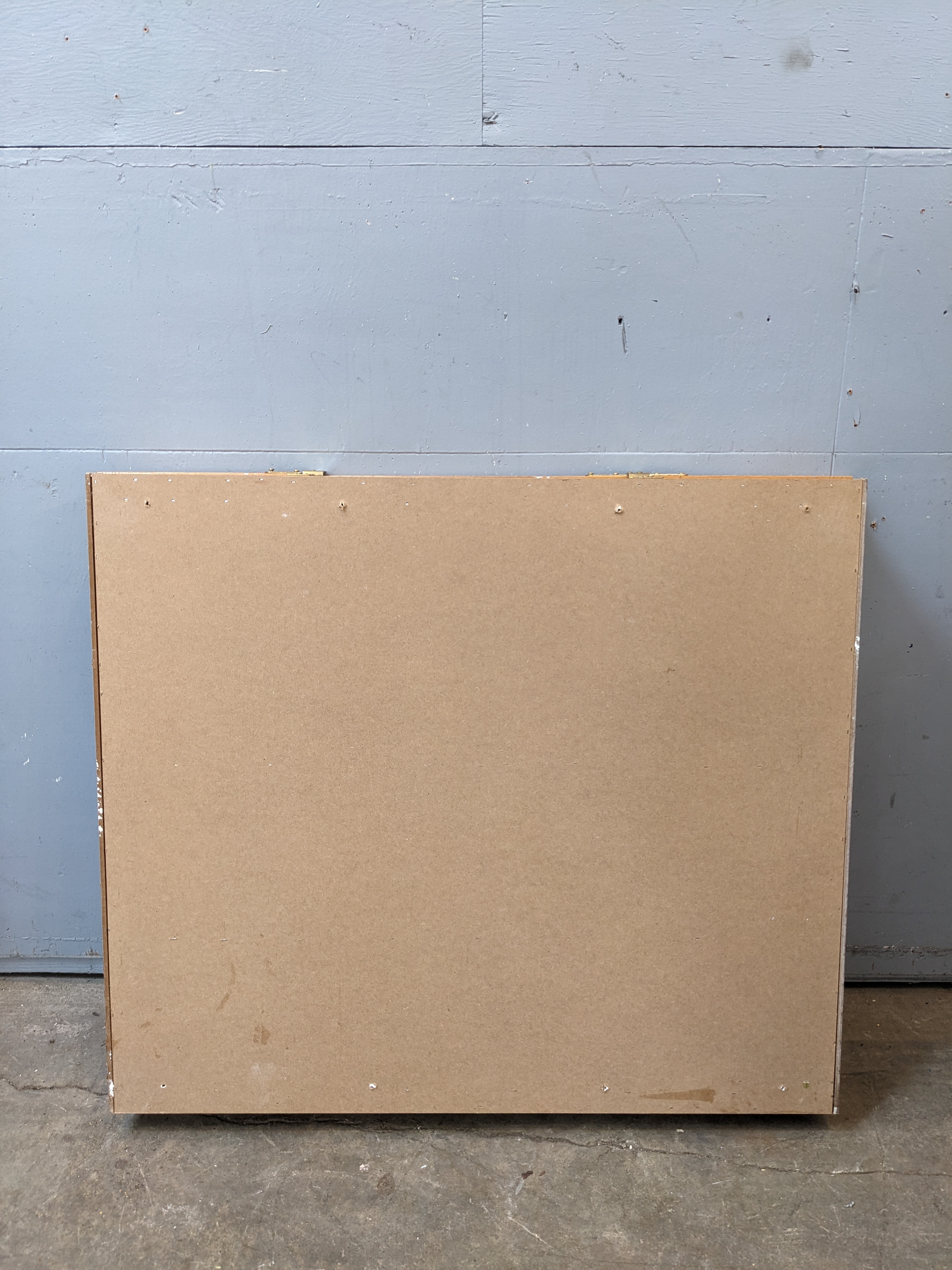 This vanity cabinet is in really great condition. There is a bit of soot on the side of one of the cabinet doors, as well as some dents and scratches throughout the piece.