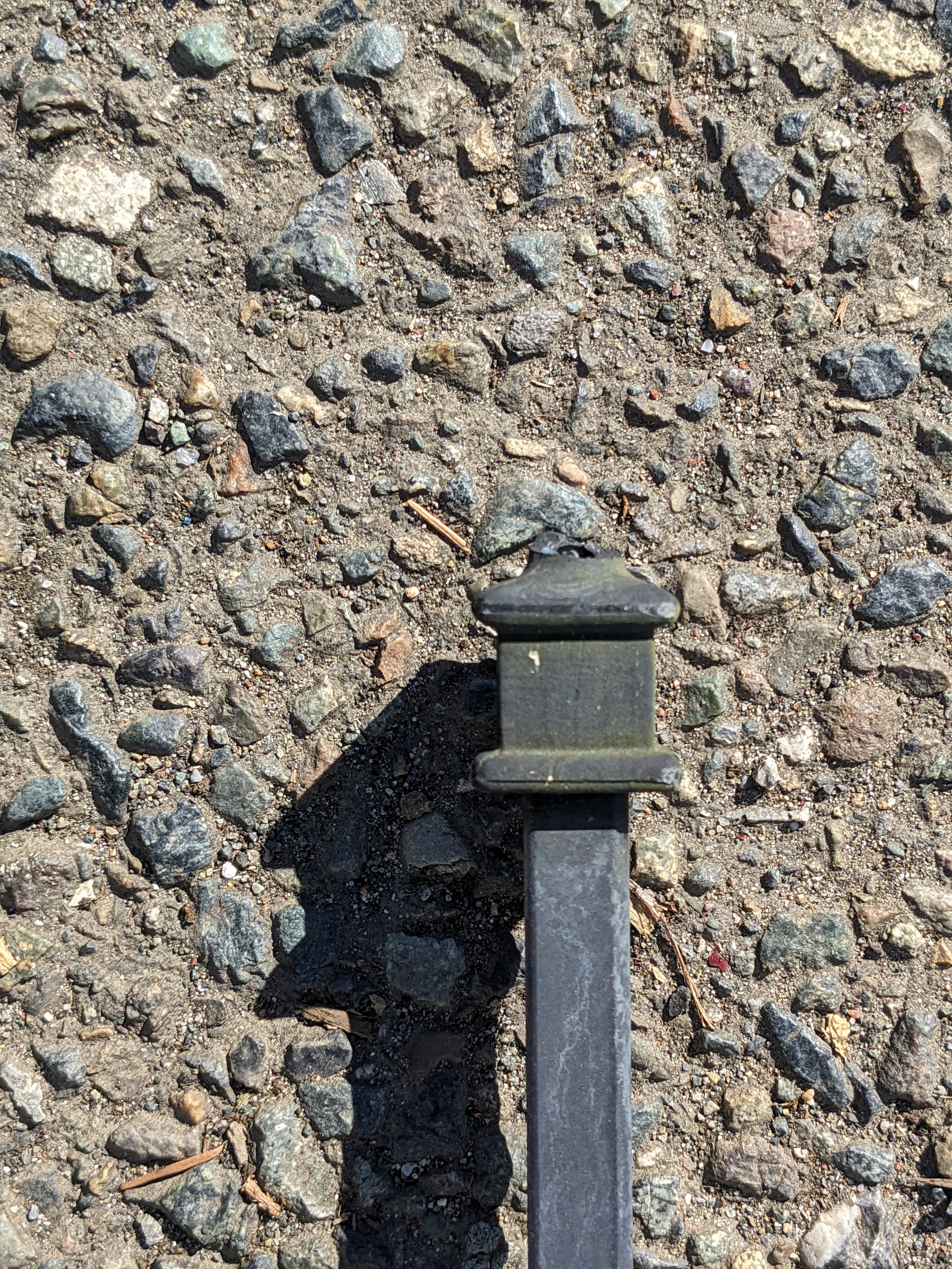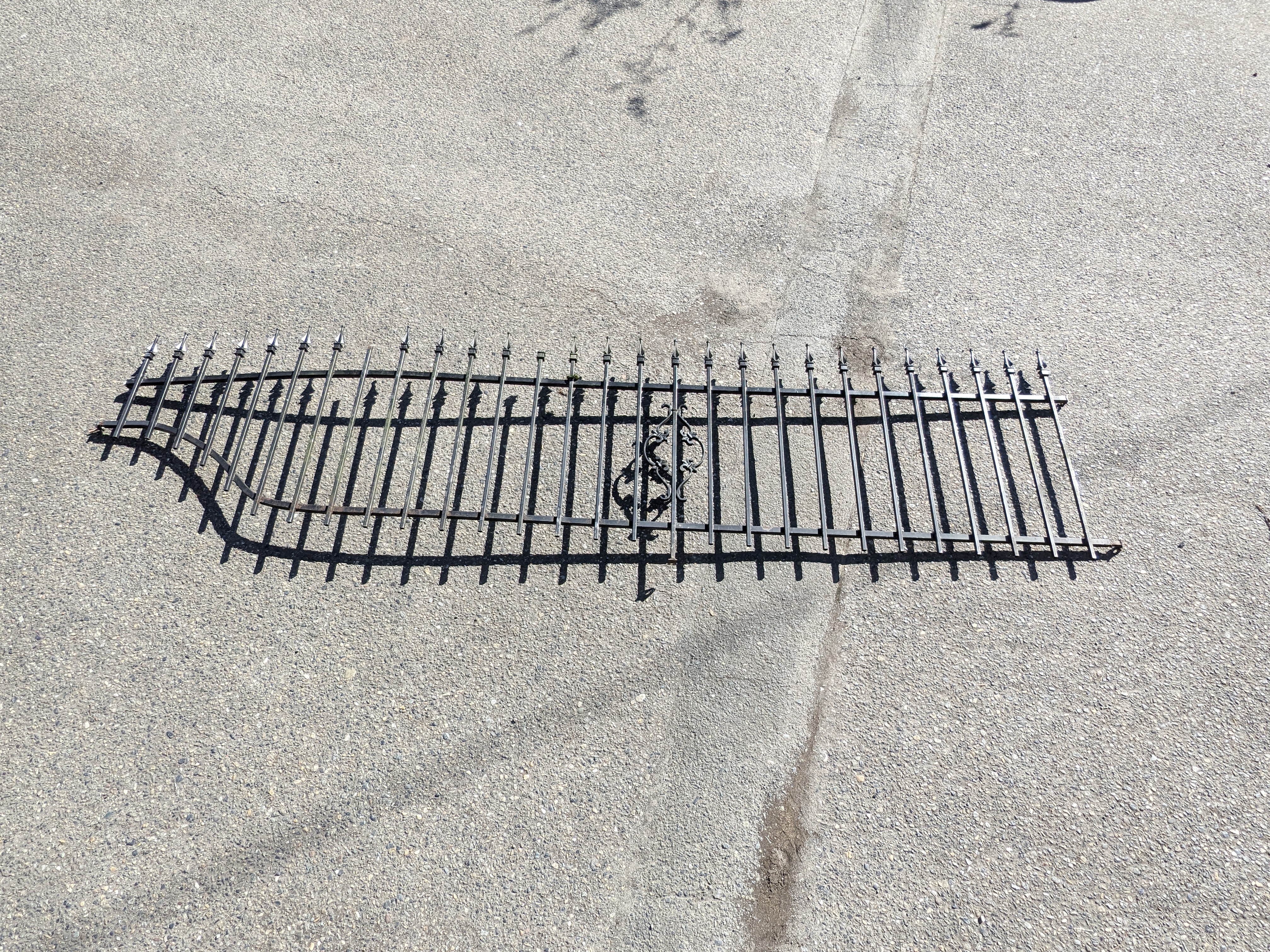 Colonial style black coated aluminium steel fencing curved section. Plastic finials have broken or fallen off atop some of the pickets and could be replaced. Black coating has chipped here and there but it is still mostly intact. Curved inward at the end. Dimensions: 129 x 40. Images may be representational
