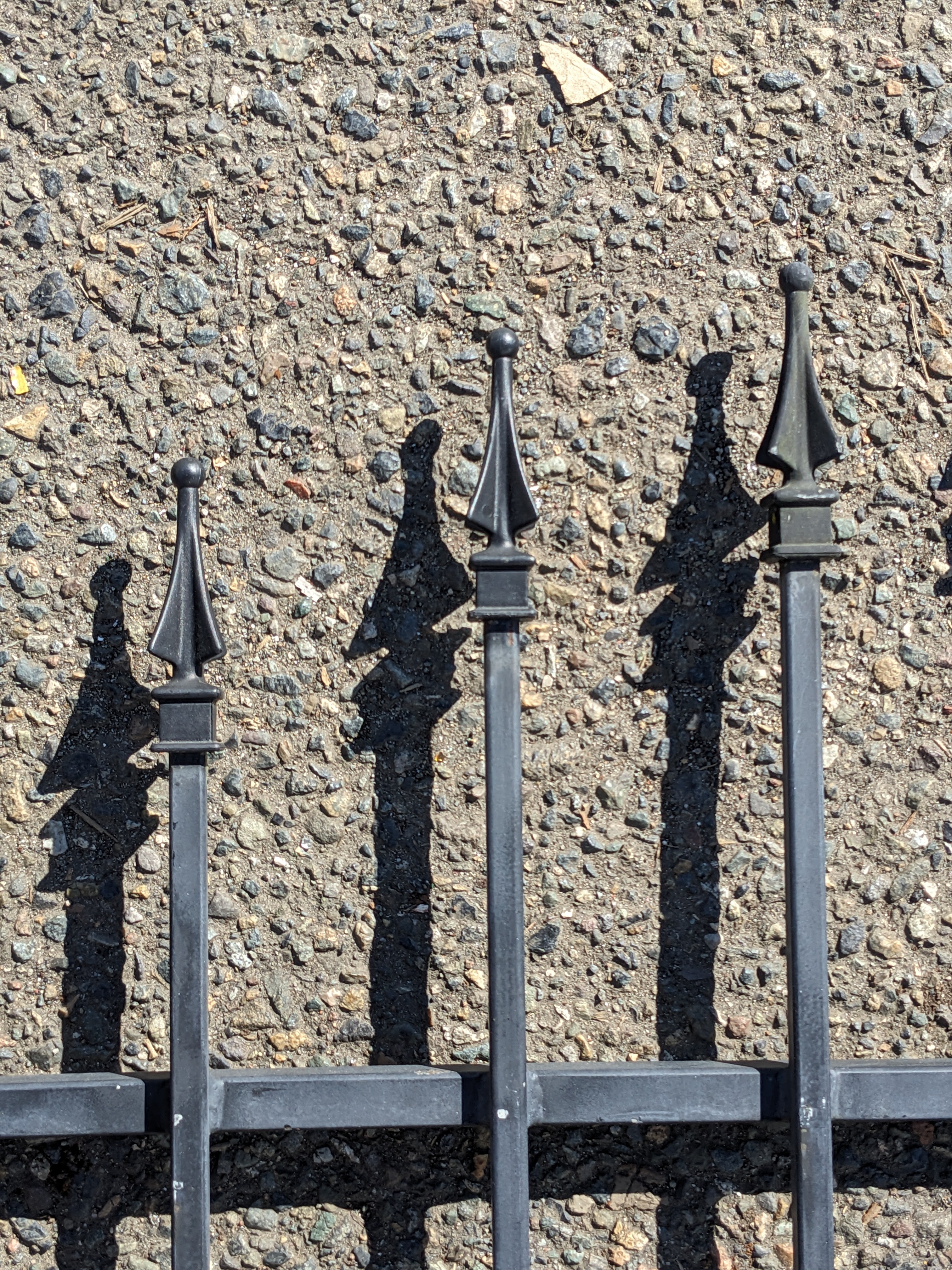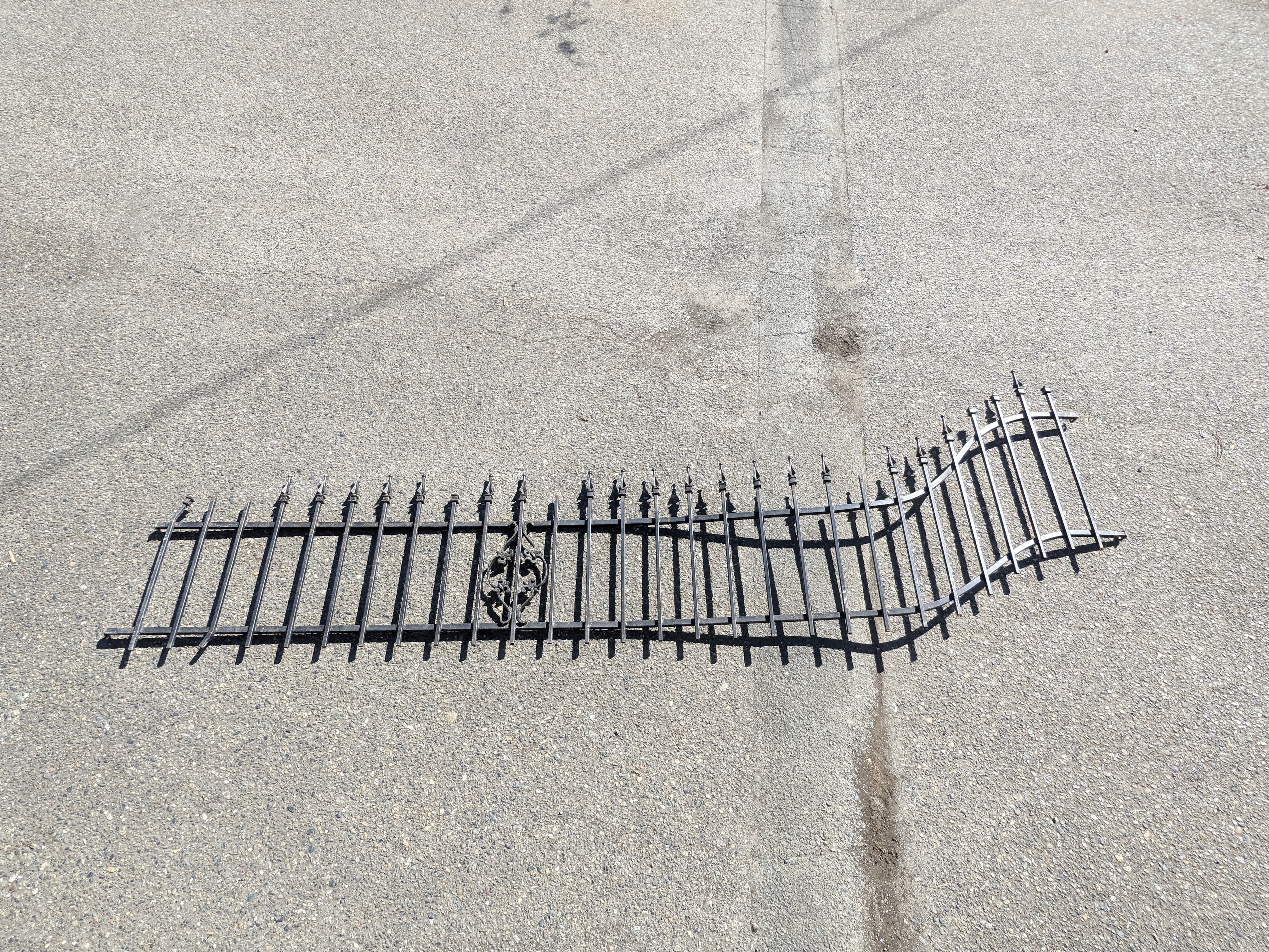 Colonial style black coated aluminium steel fencing curved section. Plastic finials have broken or fallen off atop some of the pickets and could be replaced. Black coating has chipped here and there but it is still mostly intact. Curved inward and upward on one end. Dimensions: 123.75 x 32. Images may be representational