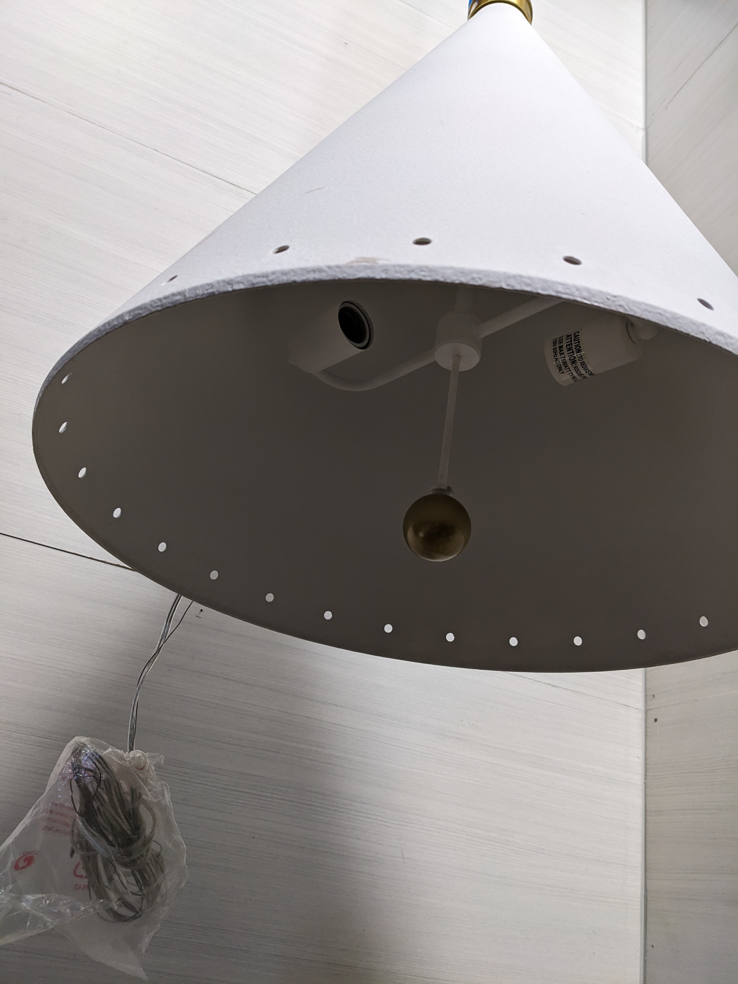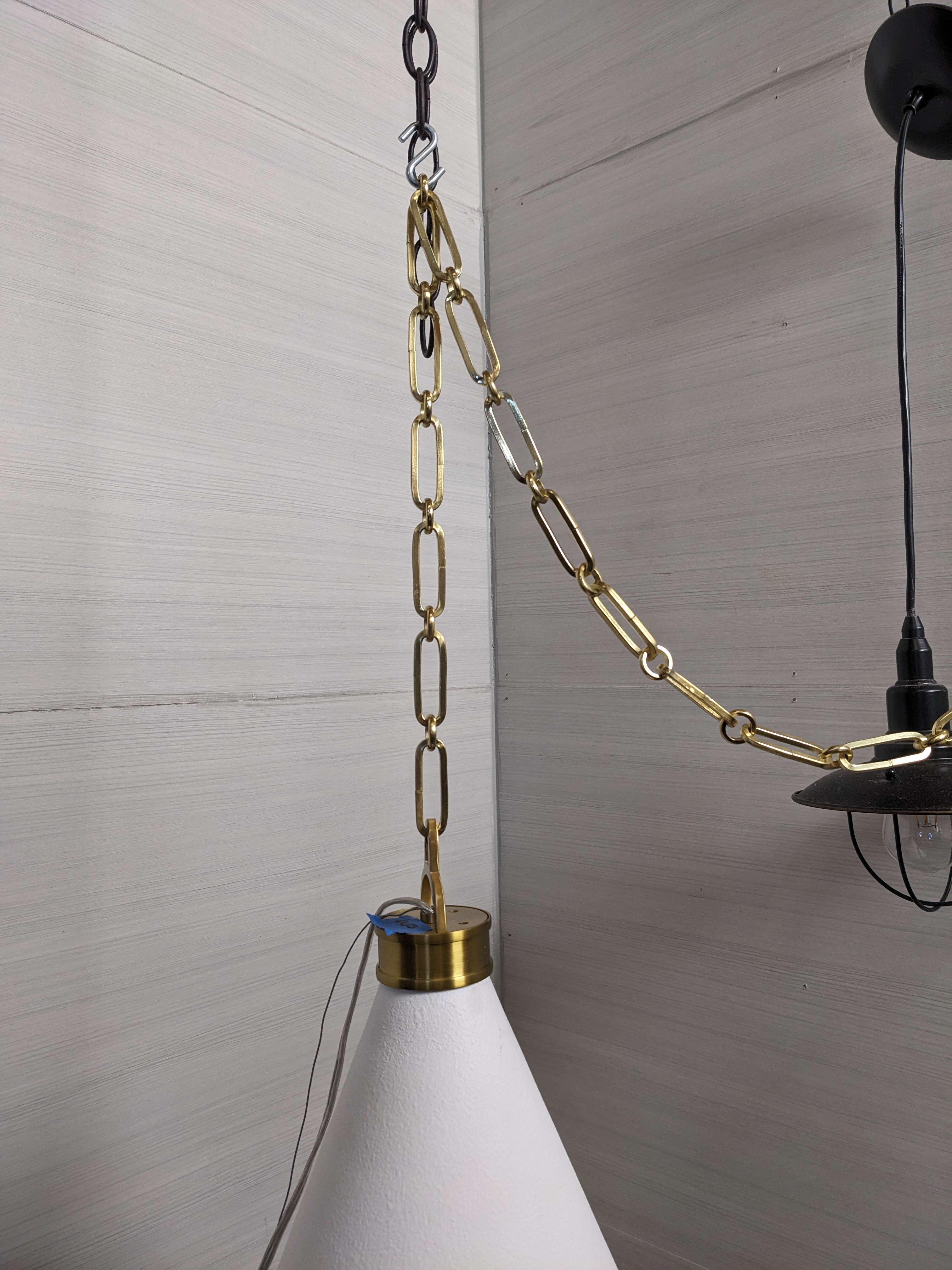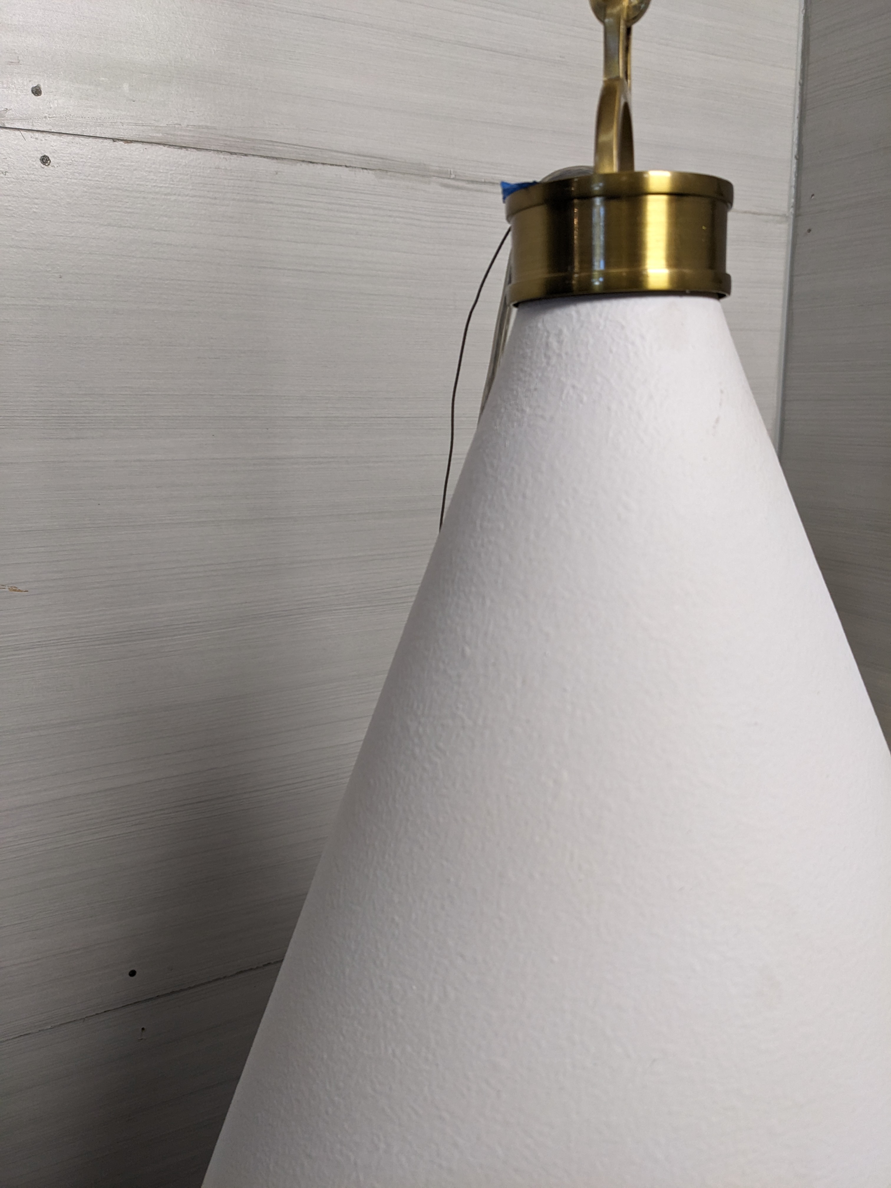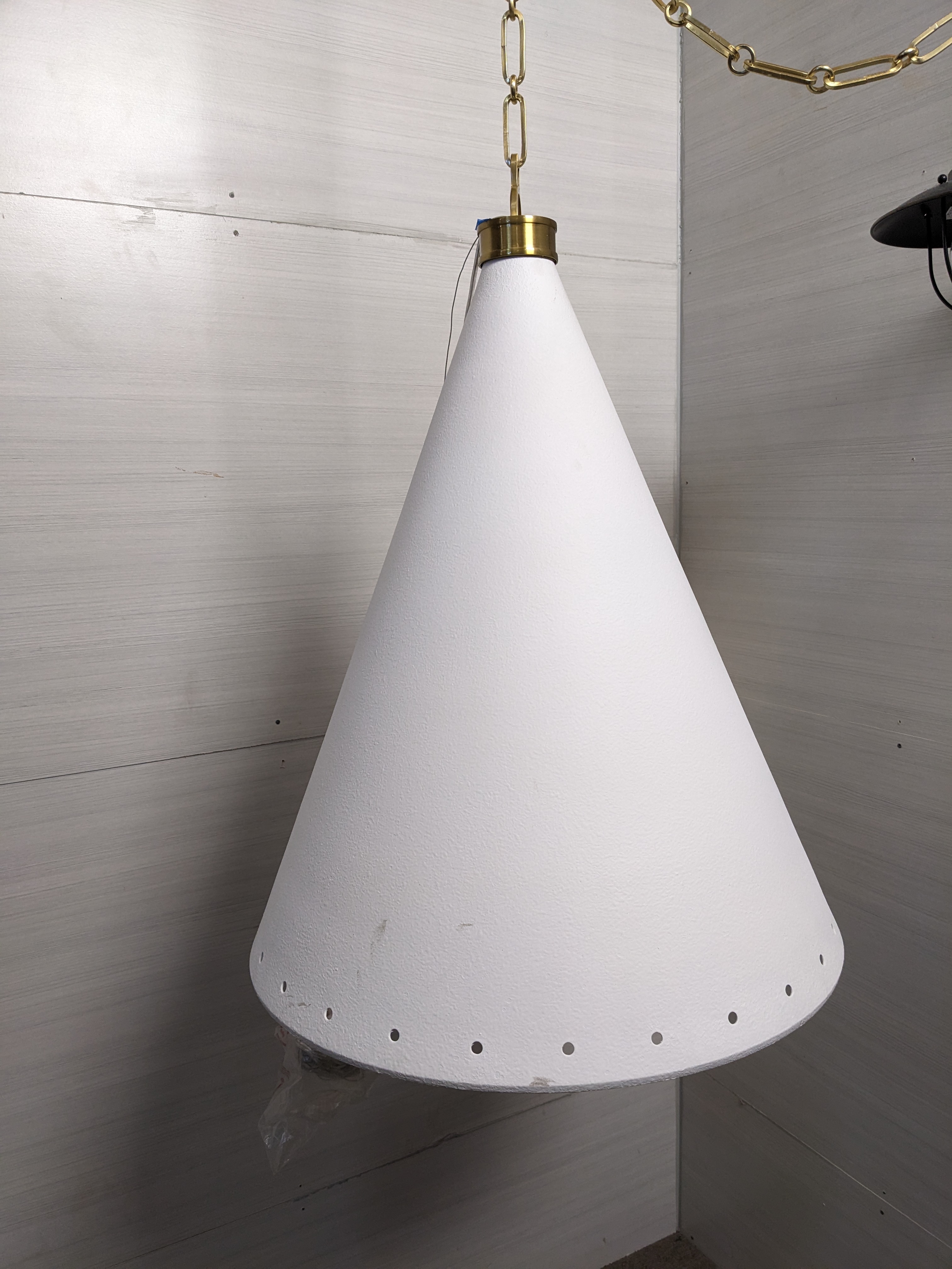 This Hudson Valley cone shaped pendant light is perfect for a modern space. The white shade measures 20 x 25 and the fittings and chain are gold. This minimalist lighting addition is understated and sophisticated and is ready to be installed in your space!